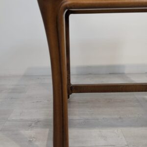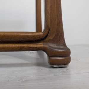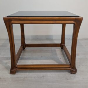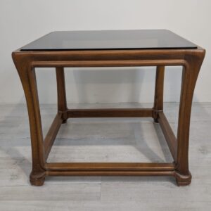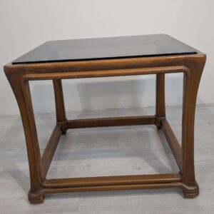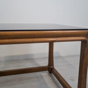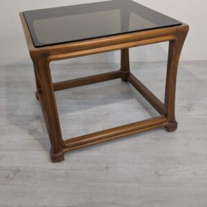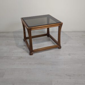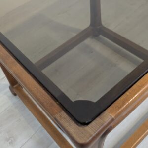 Stylowy stolik kawowy z litego drewna tekowego z dymioną szklana blatem, pochodzący z lat 60. lub 70. XX wieku. Solidna konstrukcja i elegancki design nadają temu mebla ponadczasowy charakter.