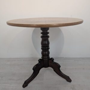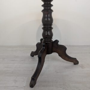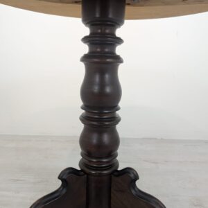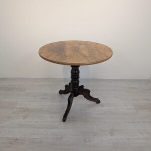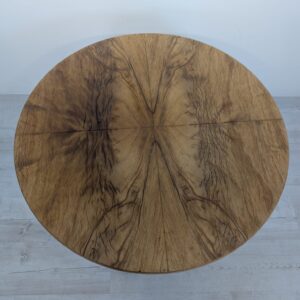 Stylowy, okrągły stolik kawowy z litego drewna orzechowego. Blat stołu posiada charakterystyczny, promieniowy wzór słojów, nadający mu niepowtarzalny, vintage’owy wygląd. Podstawa stołu wykonana jest z ciemnego, rzeźbionego drewna. Stolik jest w dobrym stanie i będzie piękną dekoracją każdego salonu.