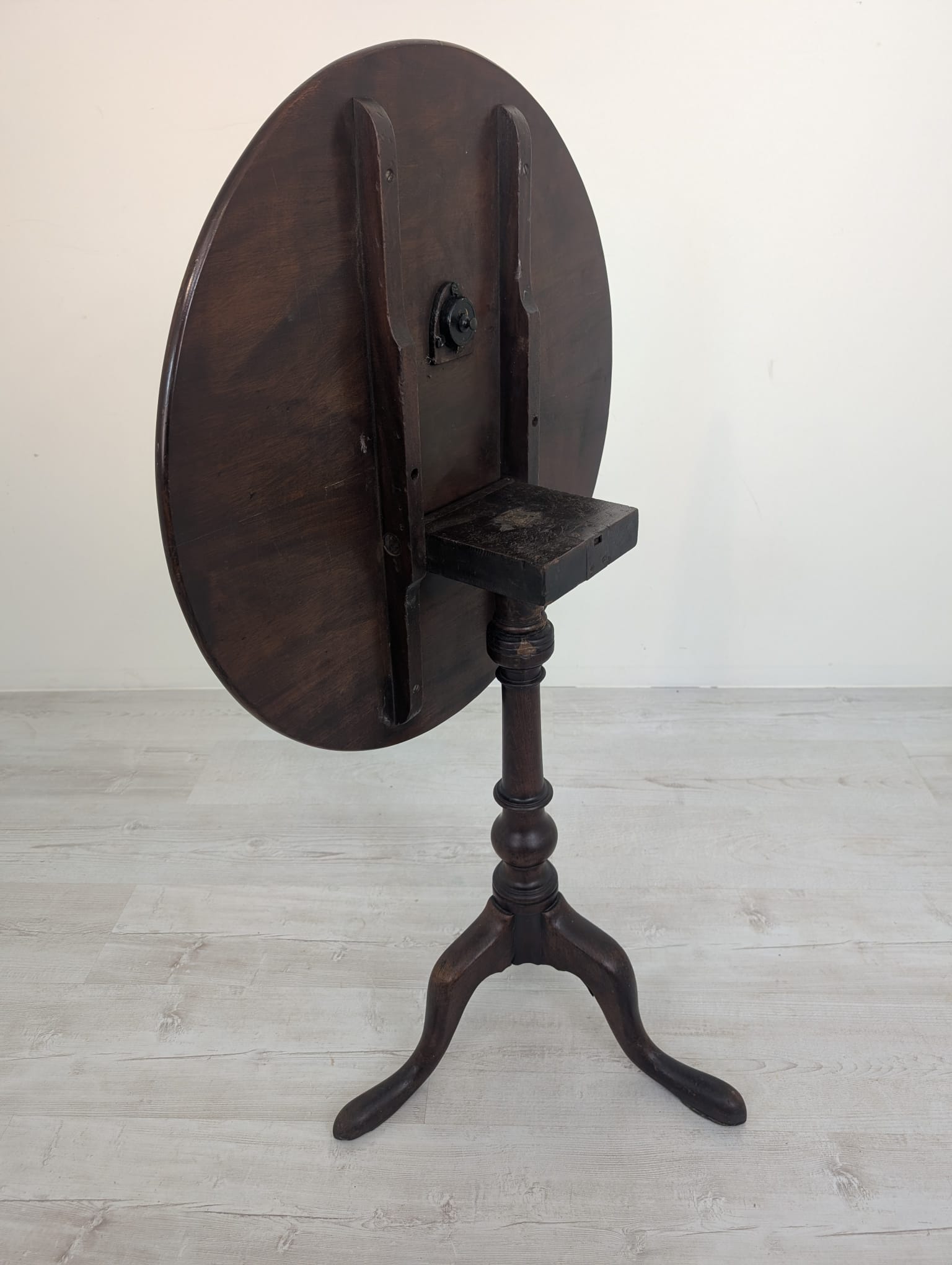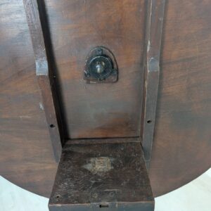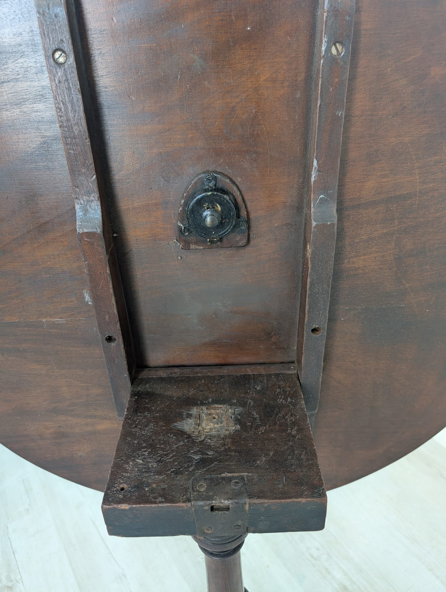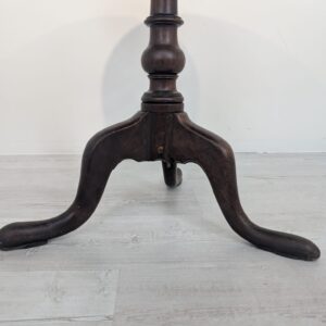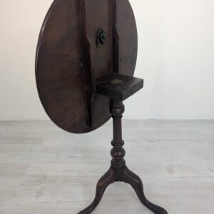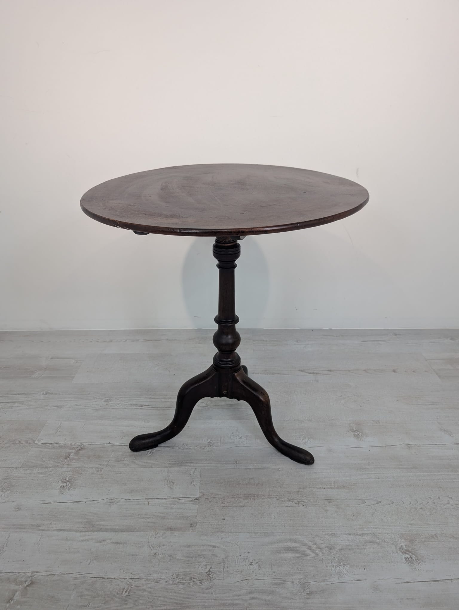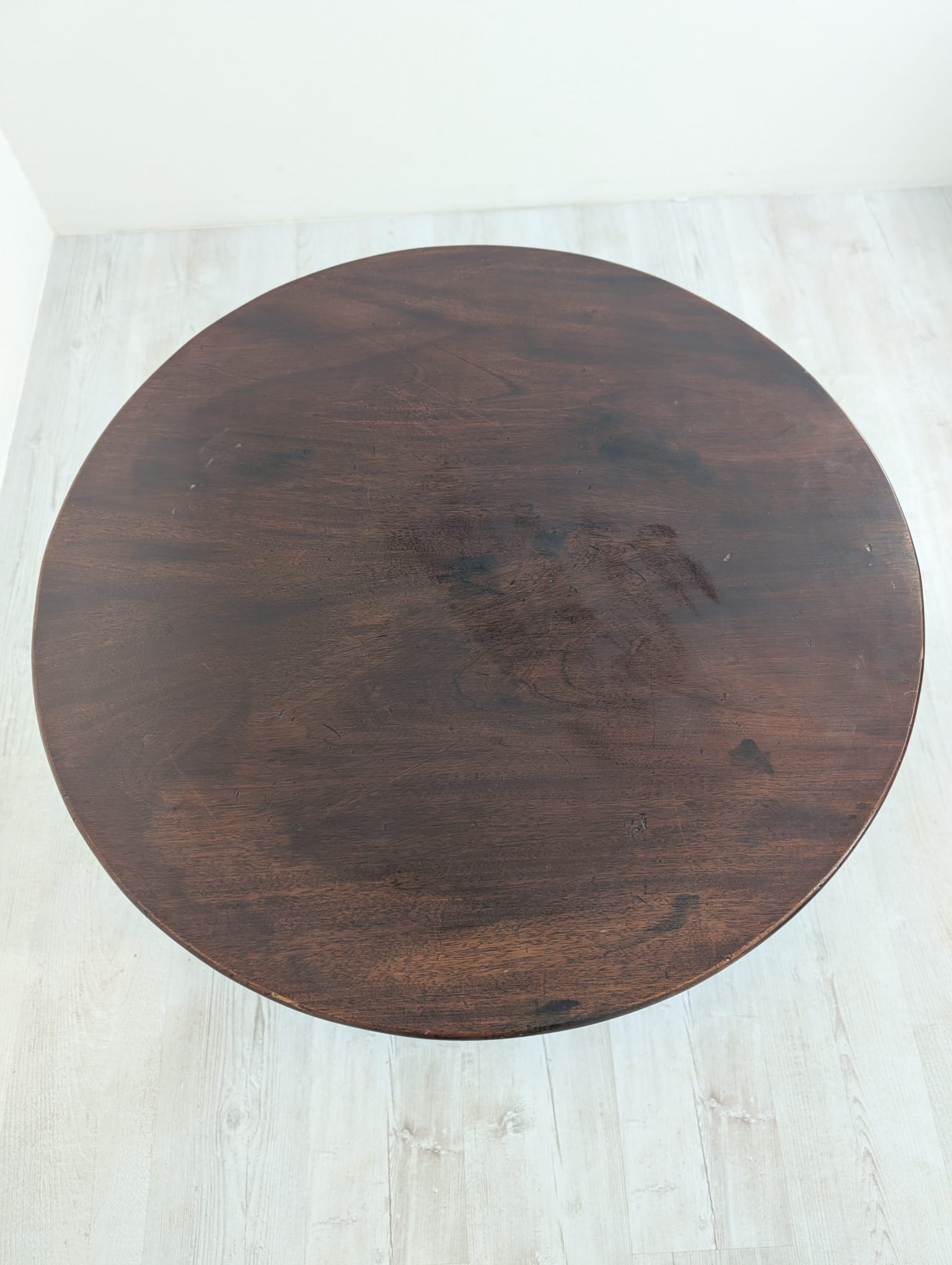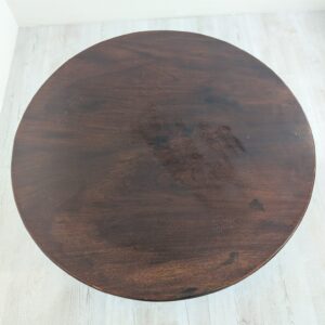 Okrągły drewniany stolik kawowy w kolorze mahoniowym z lat 40. XX wieku. Mebel jest w stanie używanym, ale nadal prezentuje się elegancko i pasuje do wielu aranżacji wnętrz.