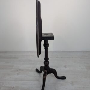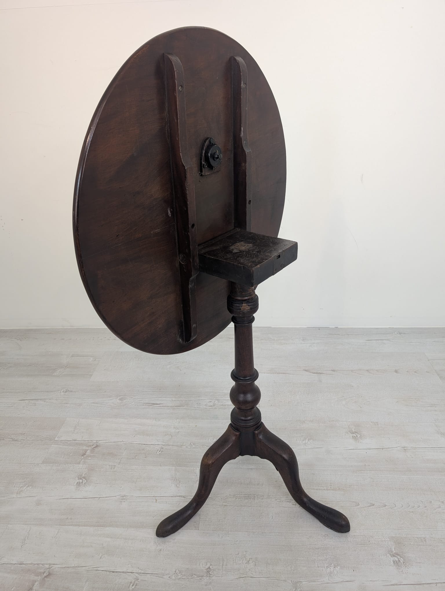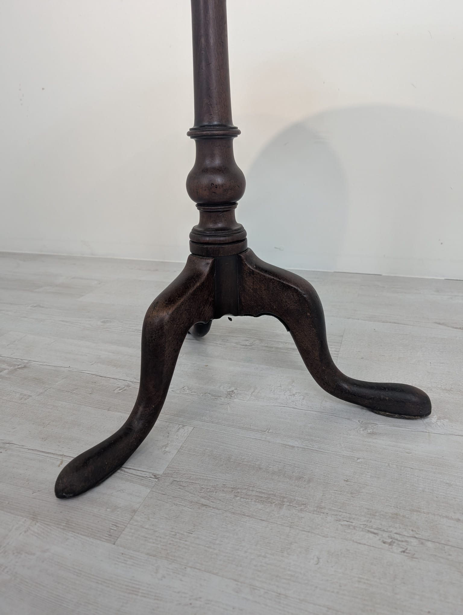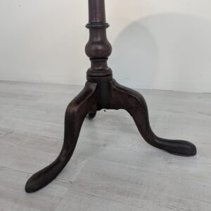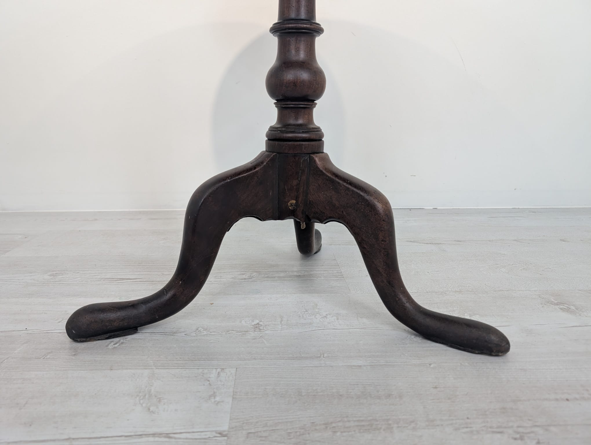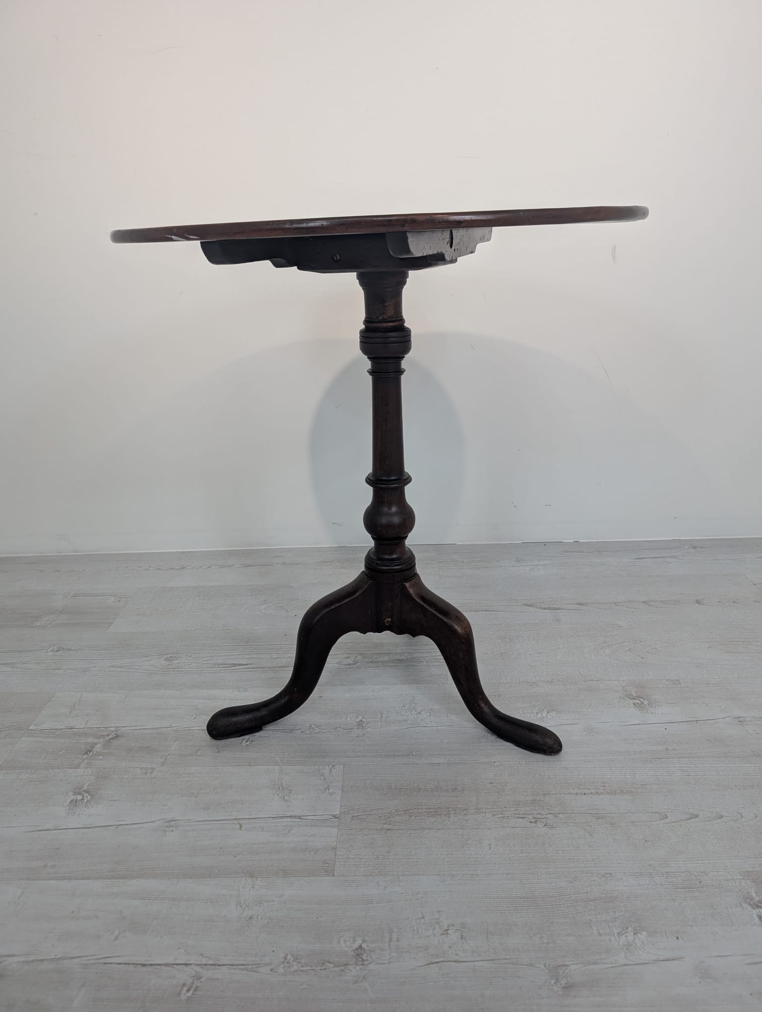 Okrągły drewniany stolik kawowy w kolorze mahoniowym z lat 40. XX wieku. Mebel jest w stanie używanym, ale nadal prezentuje się elegancko i pasuje do wielu aranżacji wnętrz.