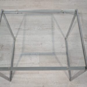 Minimalistyczny, elegancki stolik kawowy z grubym szklanym blatem i metalową, niklowaną ramą. Prosty, nowoczesny design pasujący do różnych aranżacji wnętrz.