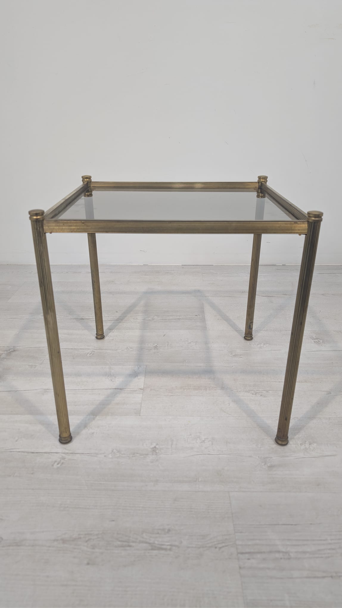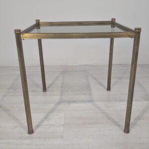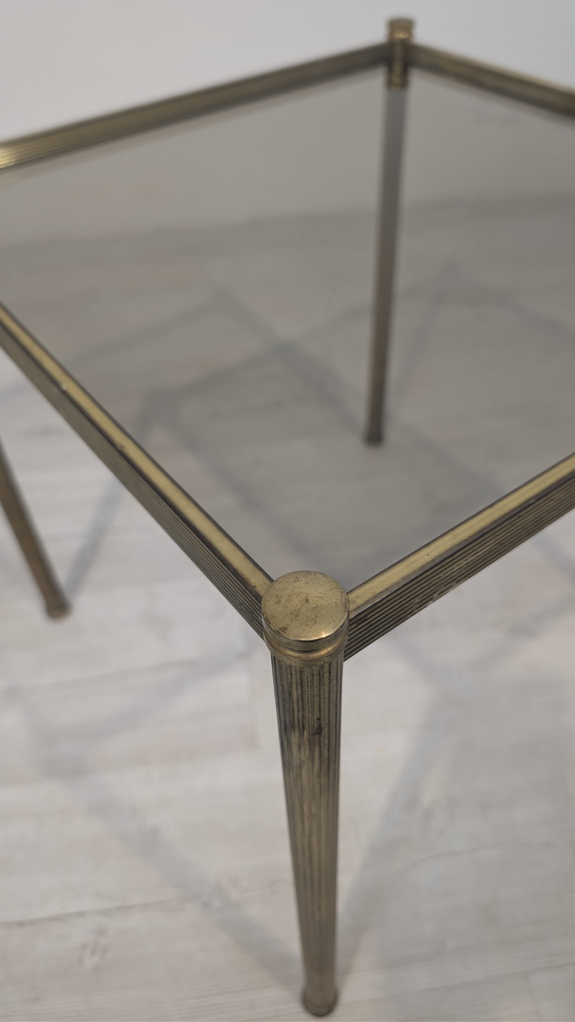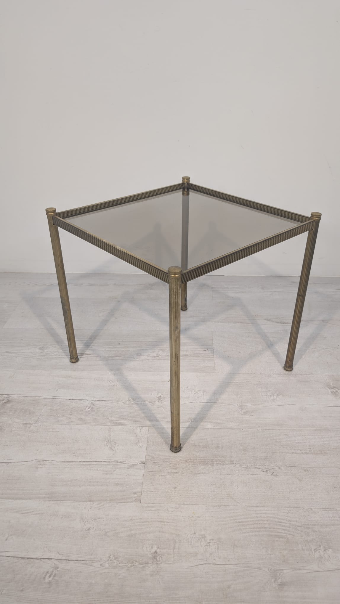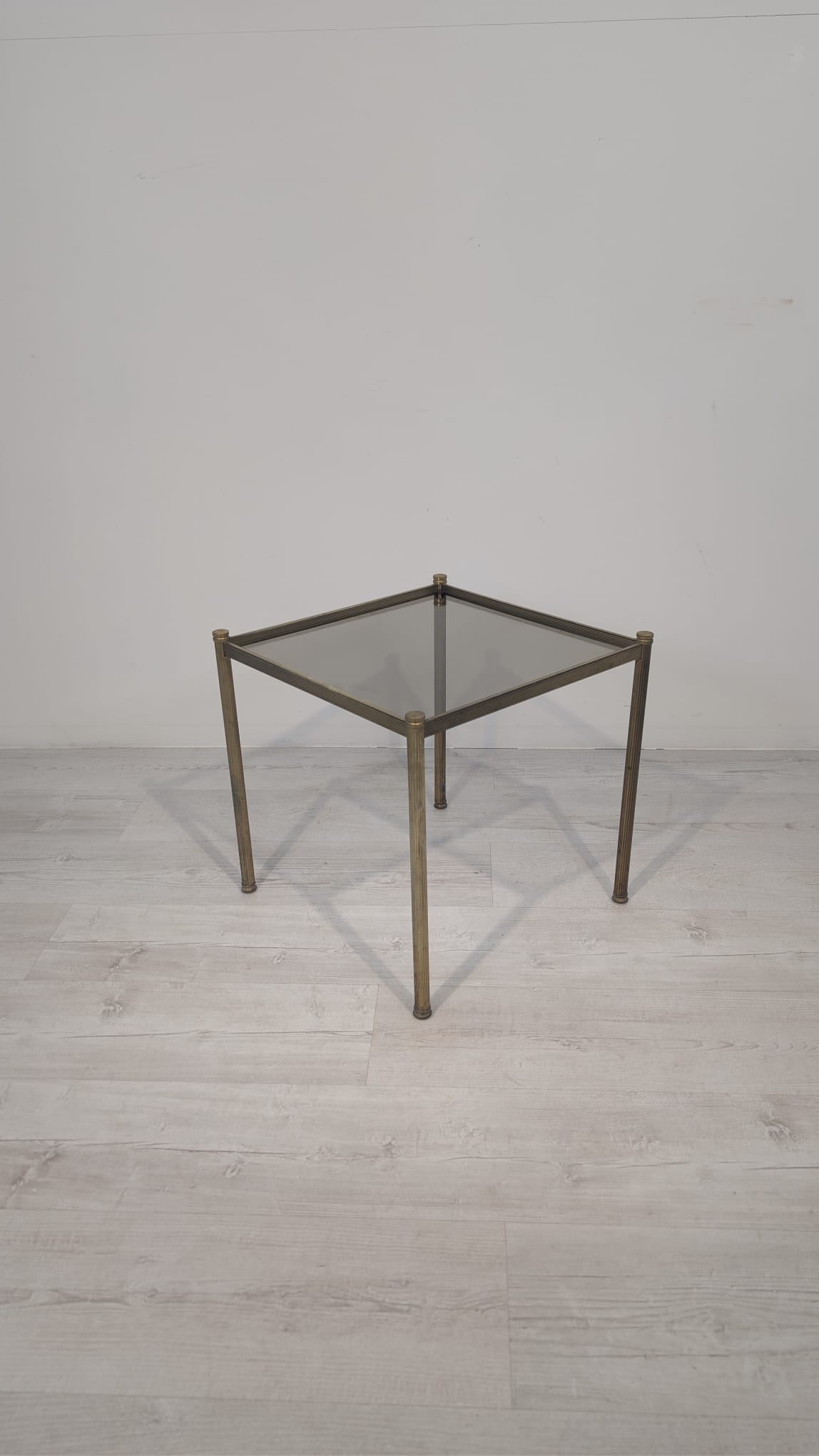 Stylowy stolik kawowy z lat 70. Wykonany z mosiężnej metalowej konstrukcji oraz dymionego szkła. Ponadczasowa forma i elegancki wygląd doskonale wpisuje się w nowoczesne wnętrza.