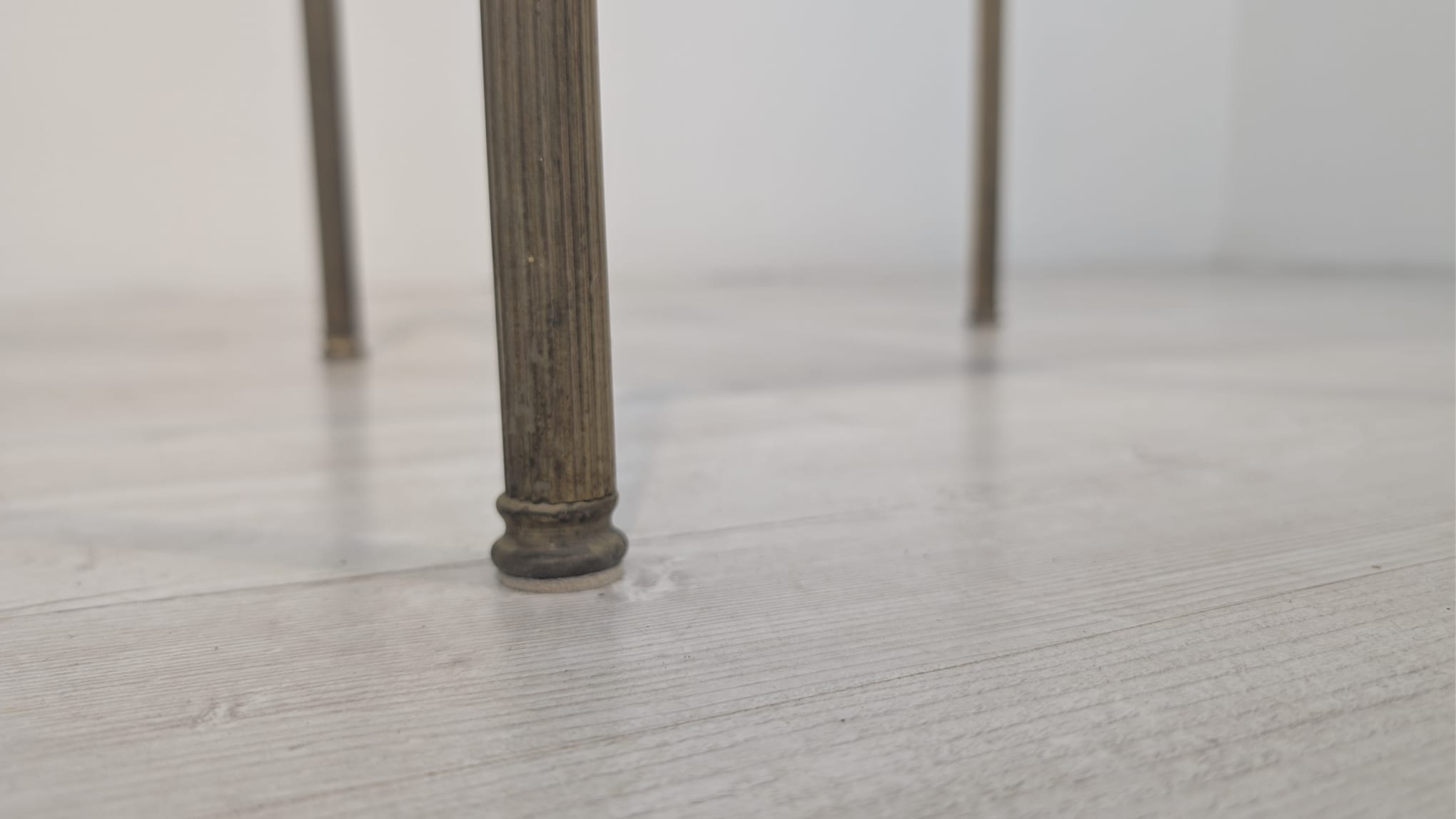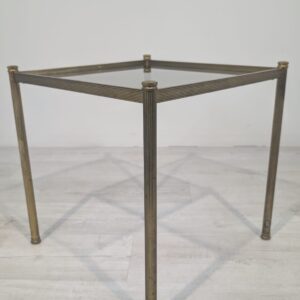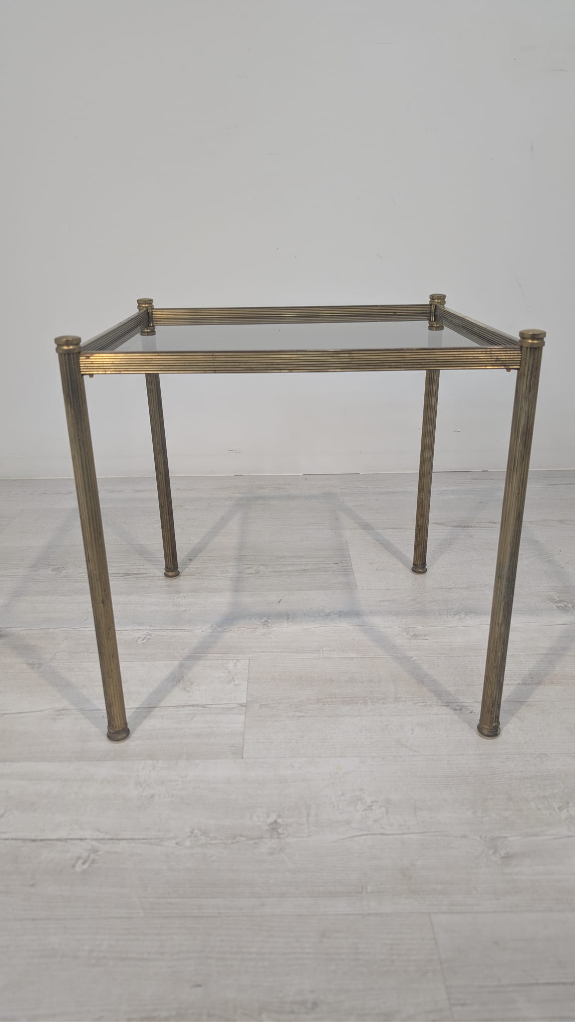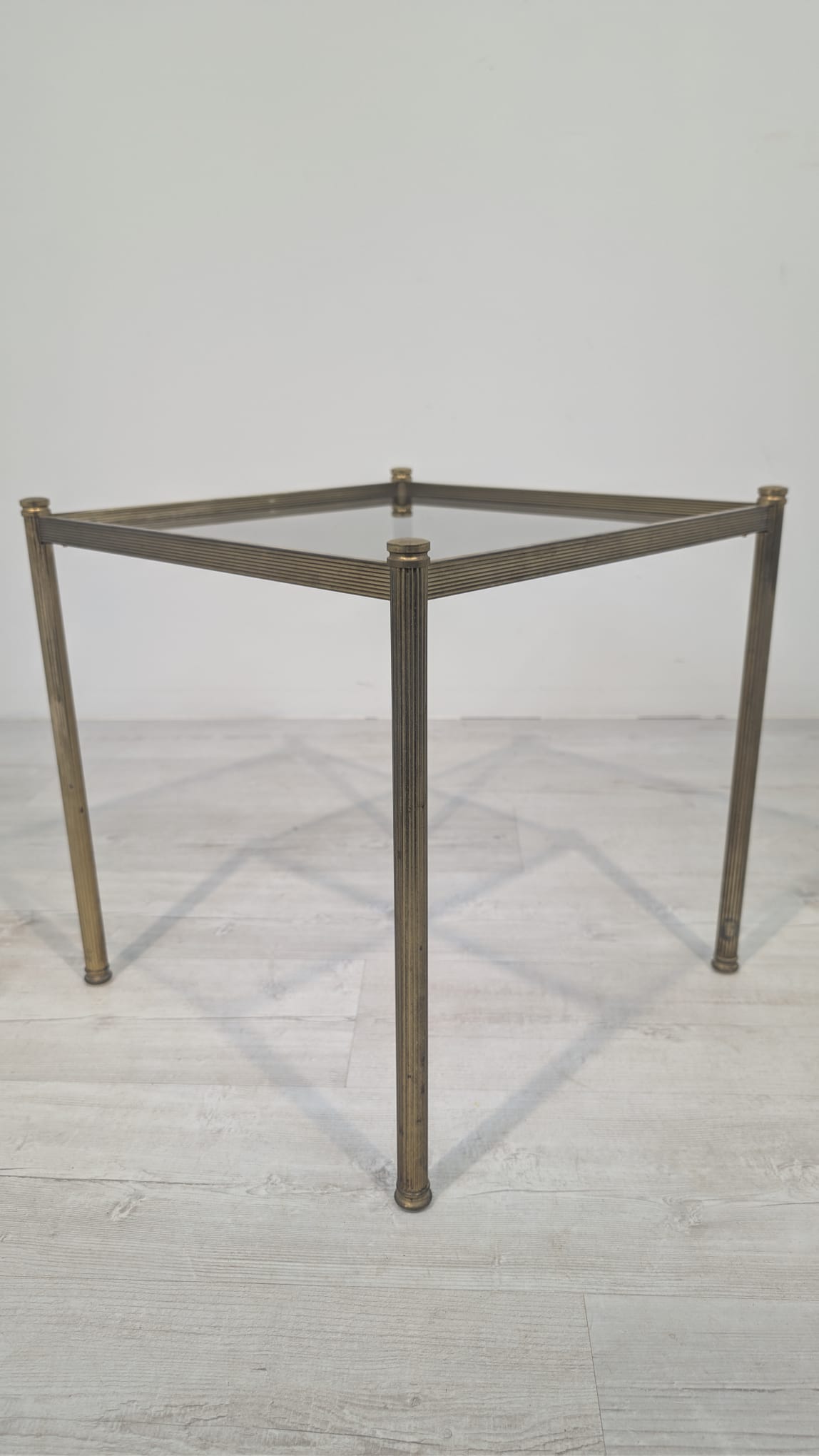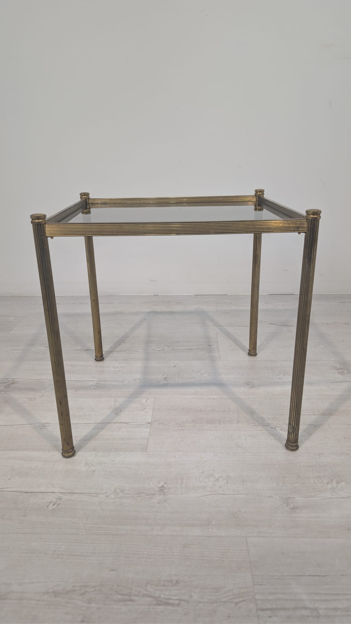 Stylowy stolik kawowy z lat 70. Wykonany z mosiężnej metalowej konstrukcji oraz dymionego szkła. Ponadczasowa forma i elegancki wygląd doskonale wpisuje się w nowoczesne wnętrza.