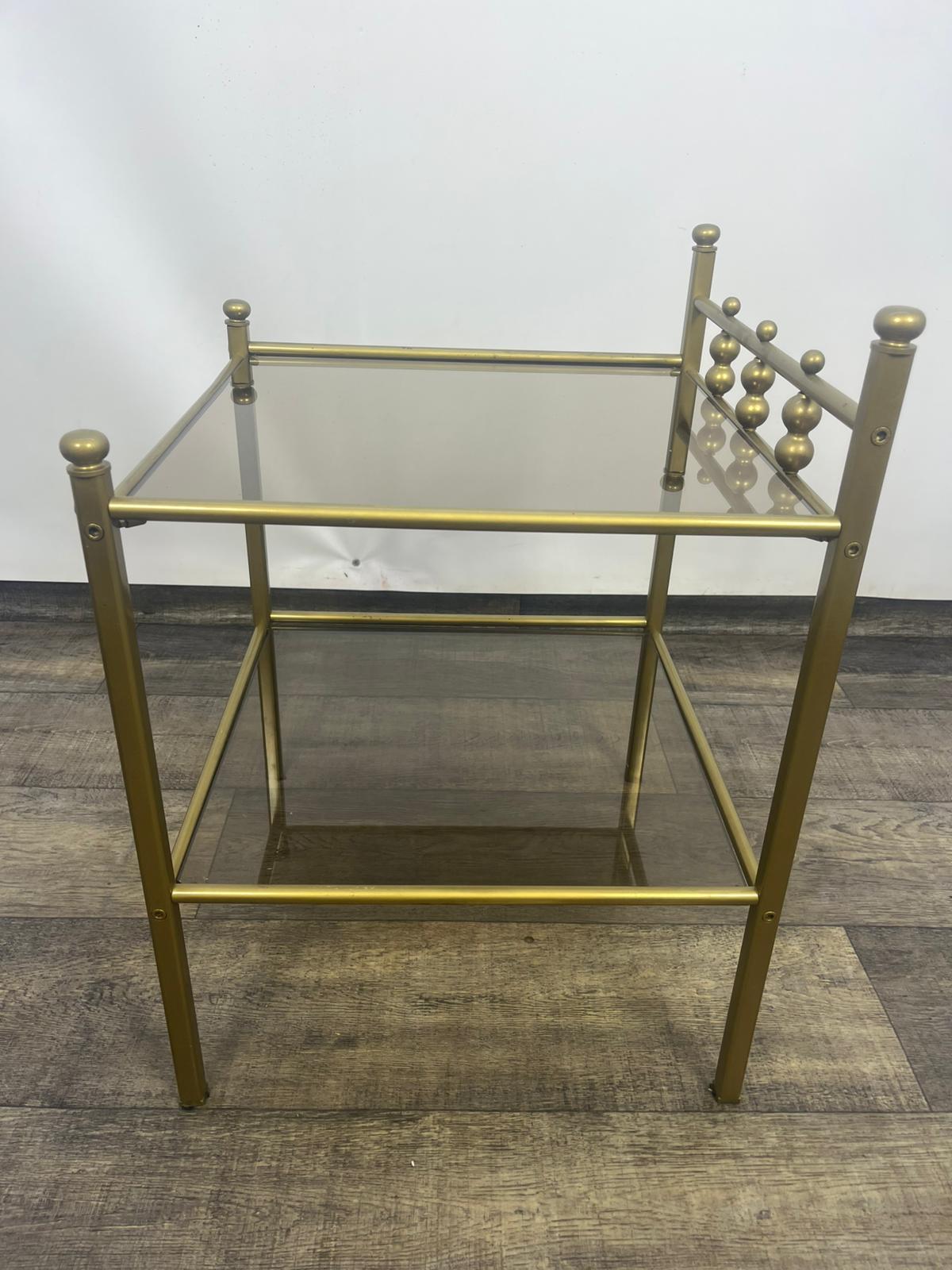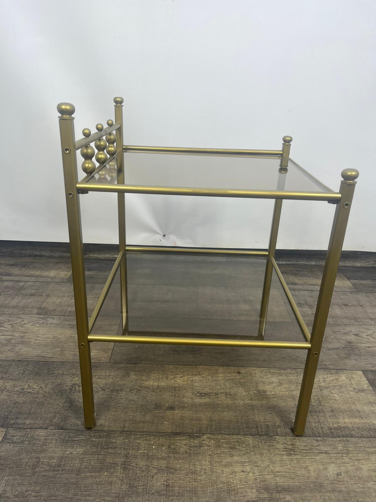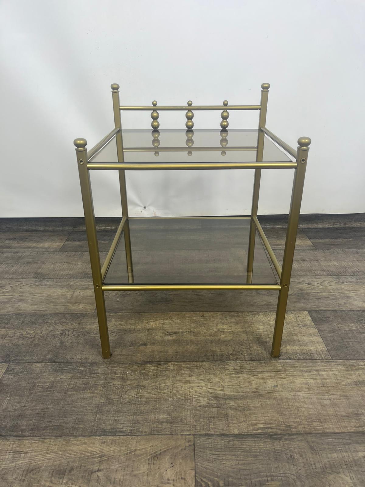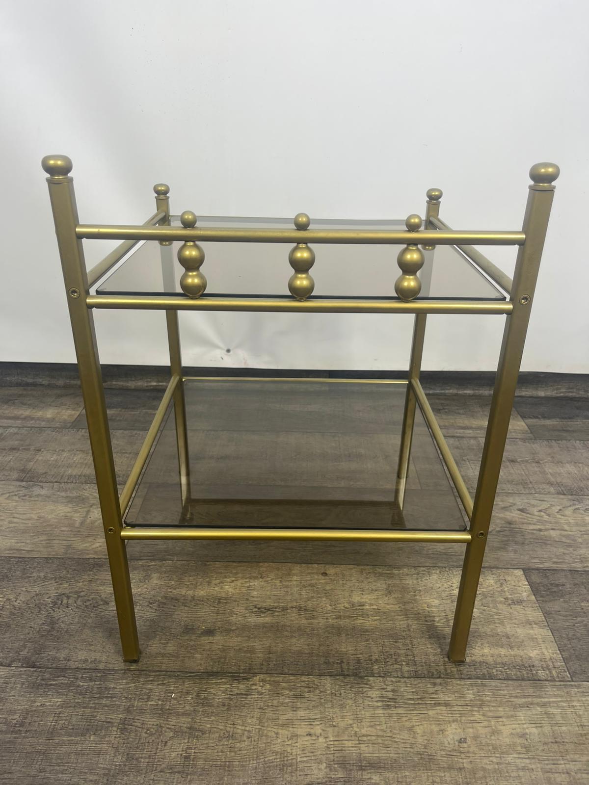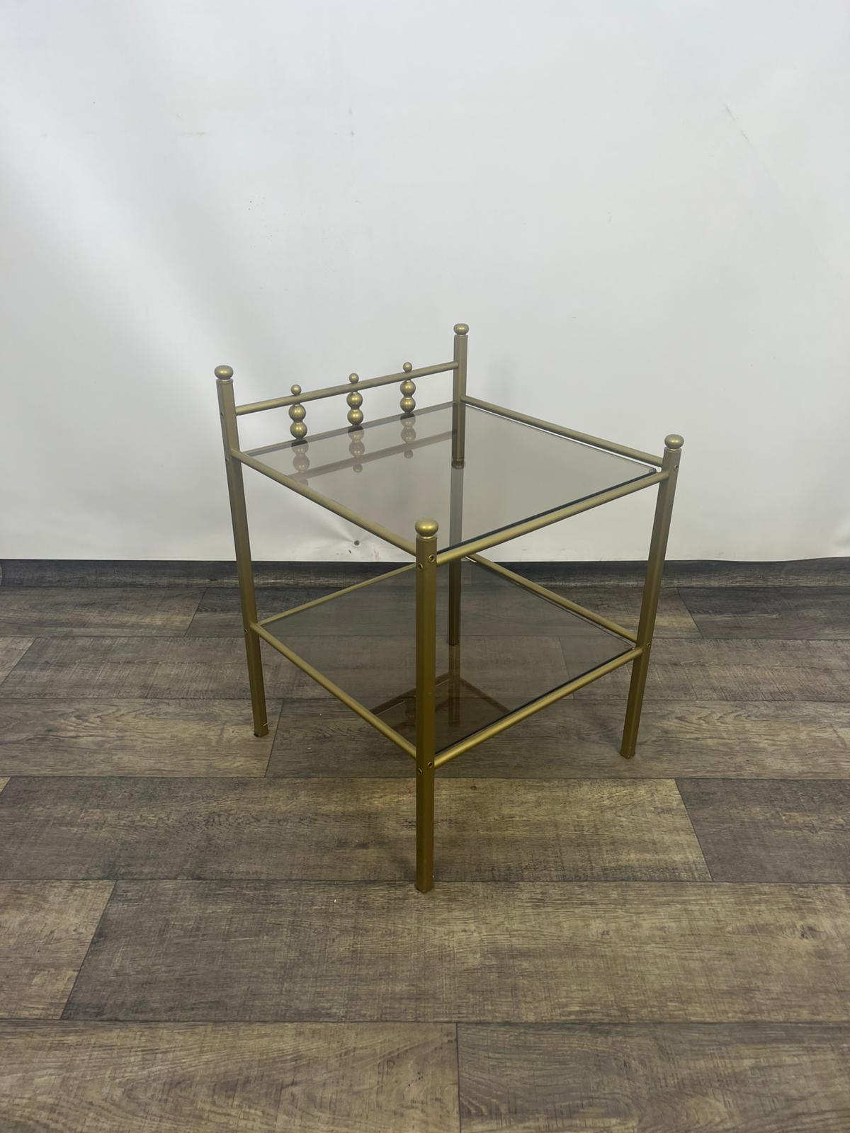 Stolik, stolik nocny wykonany z metalowej ramy w kolorze złota z szybami dymionymi.