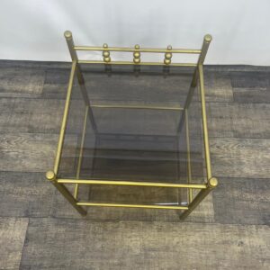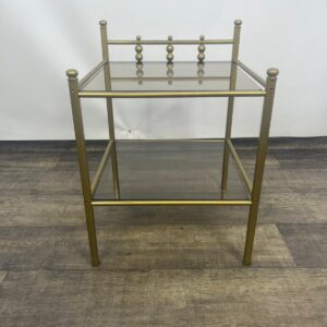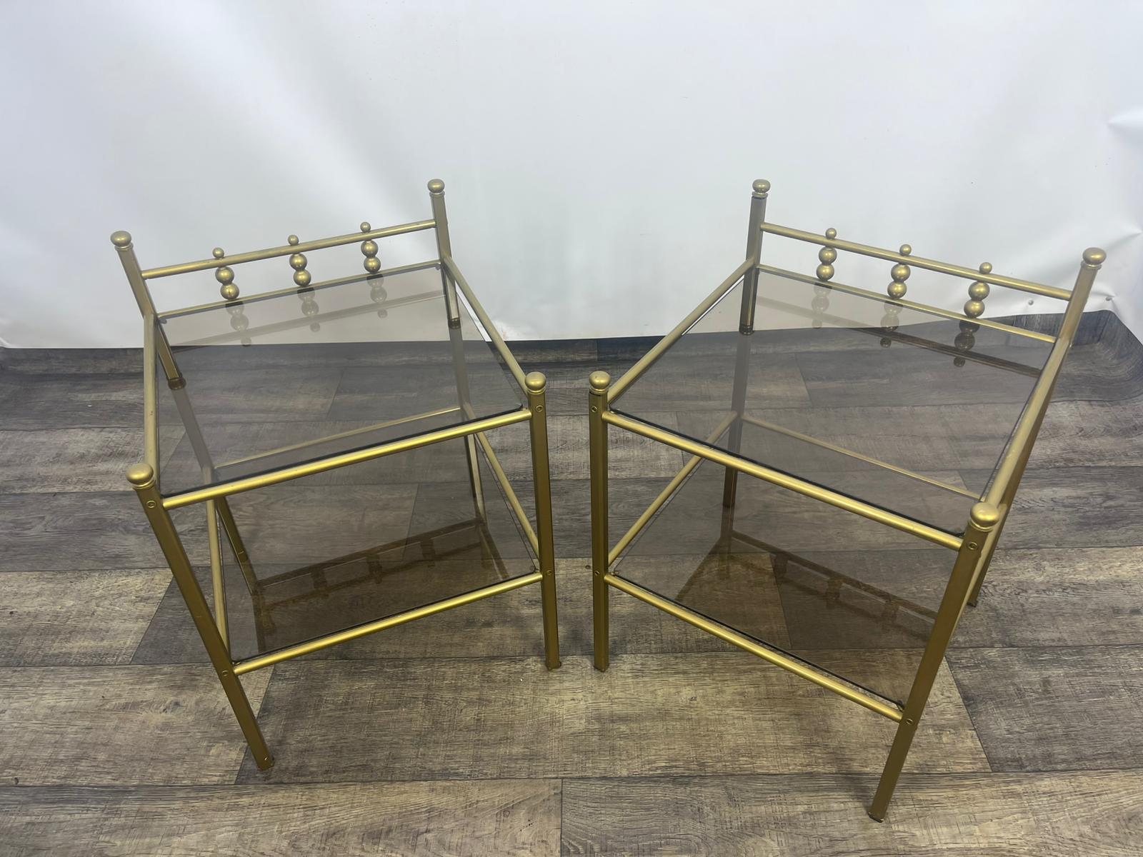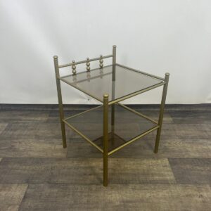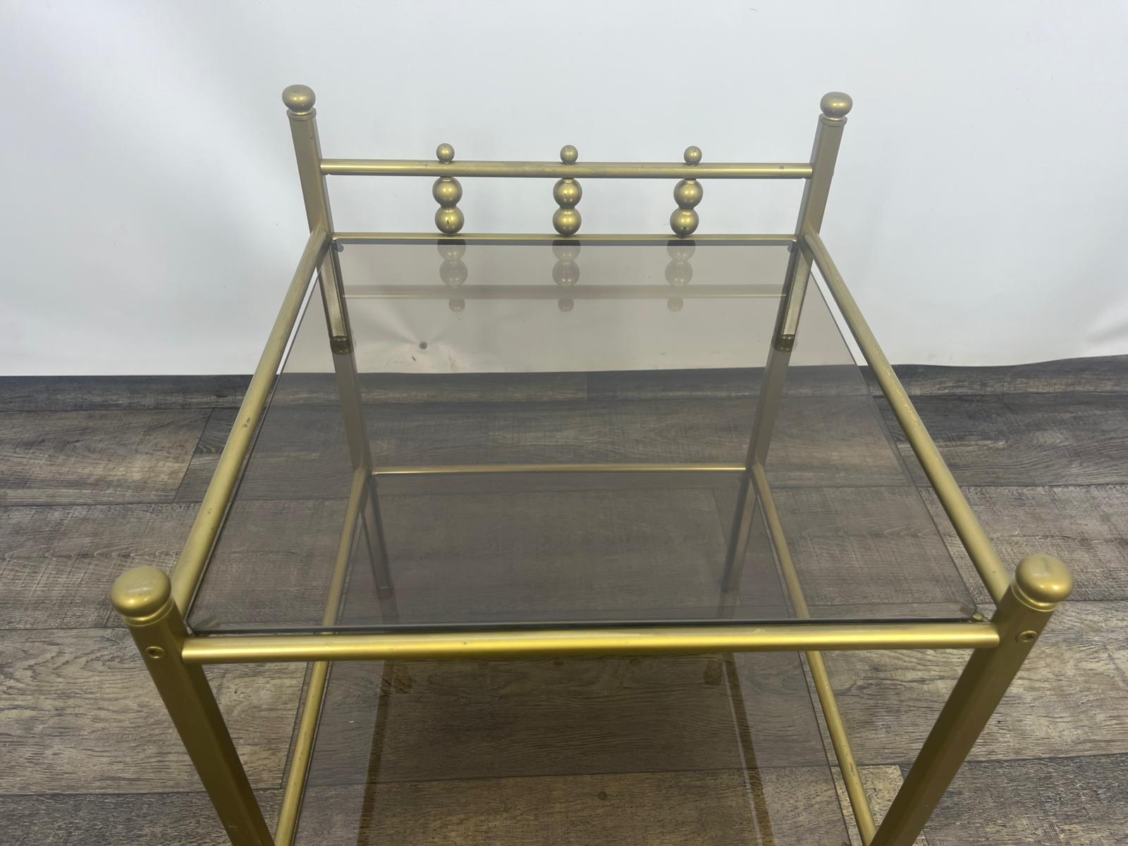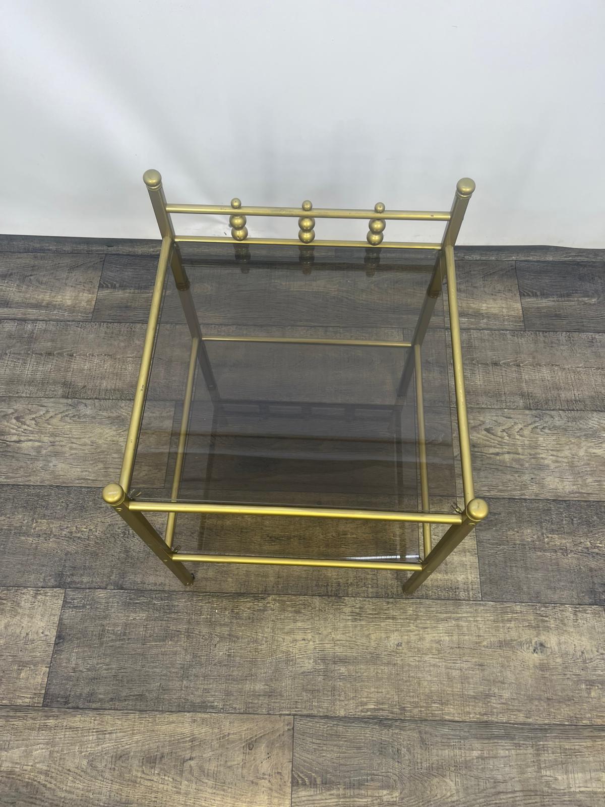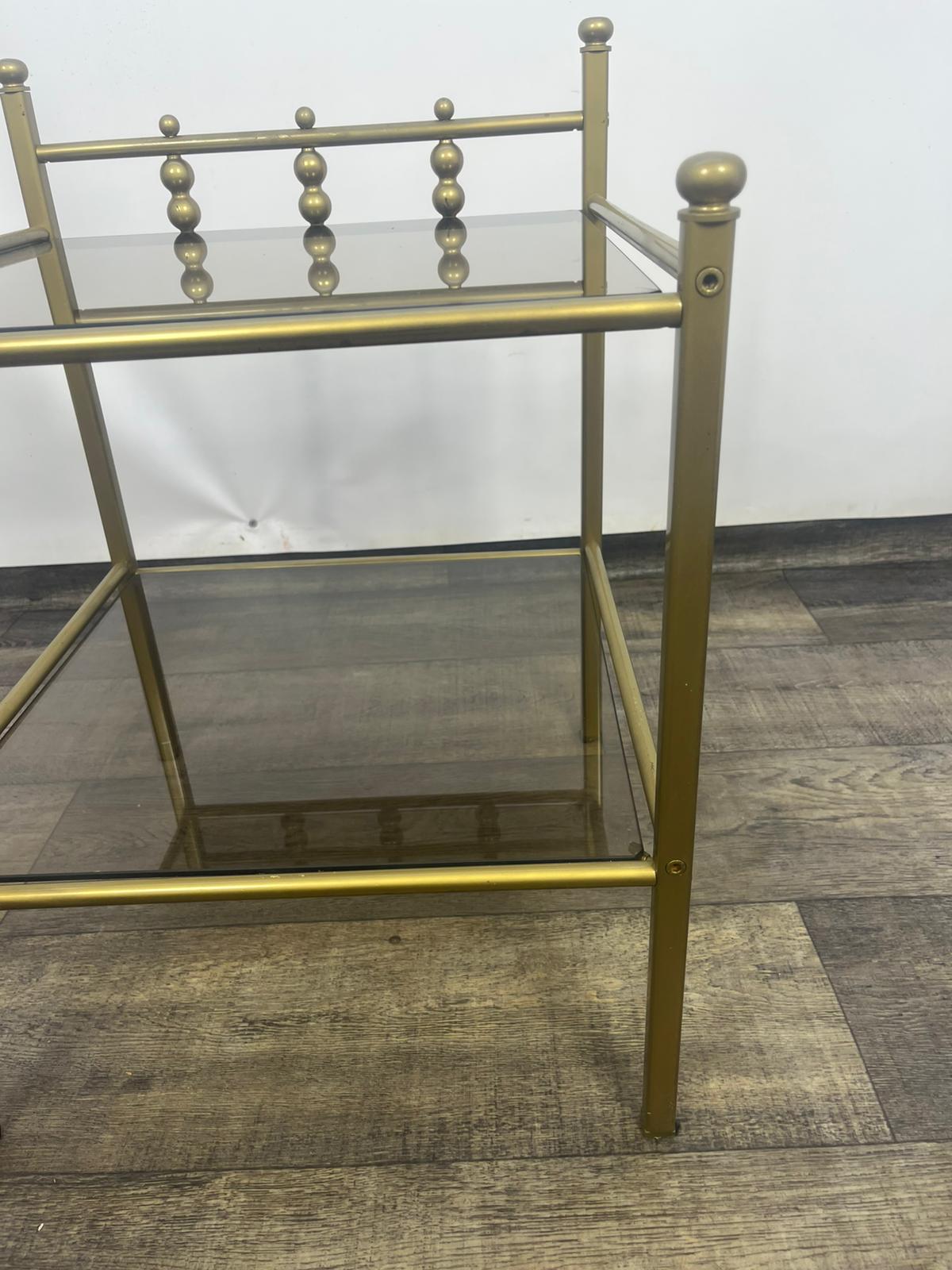 Stolik, stolik nocny wykonany z metalowej ramy w kolorze złota z szybami dymionymi.