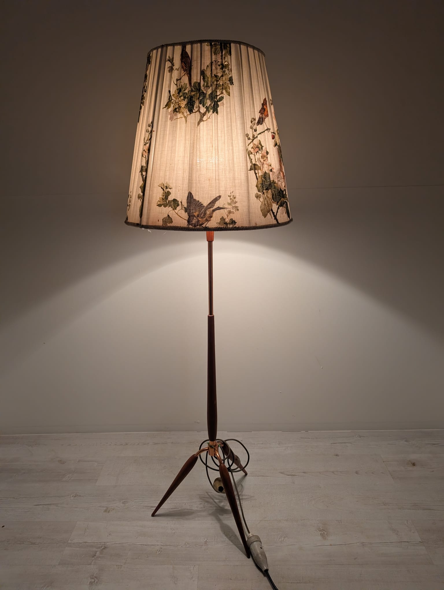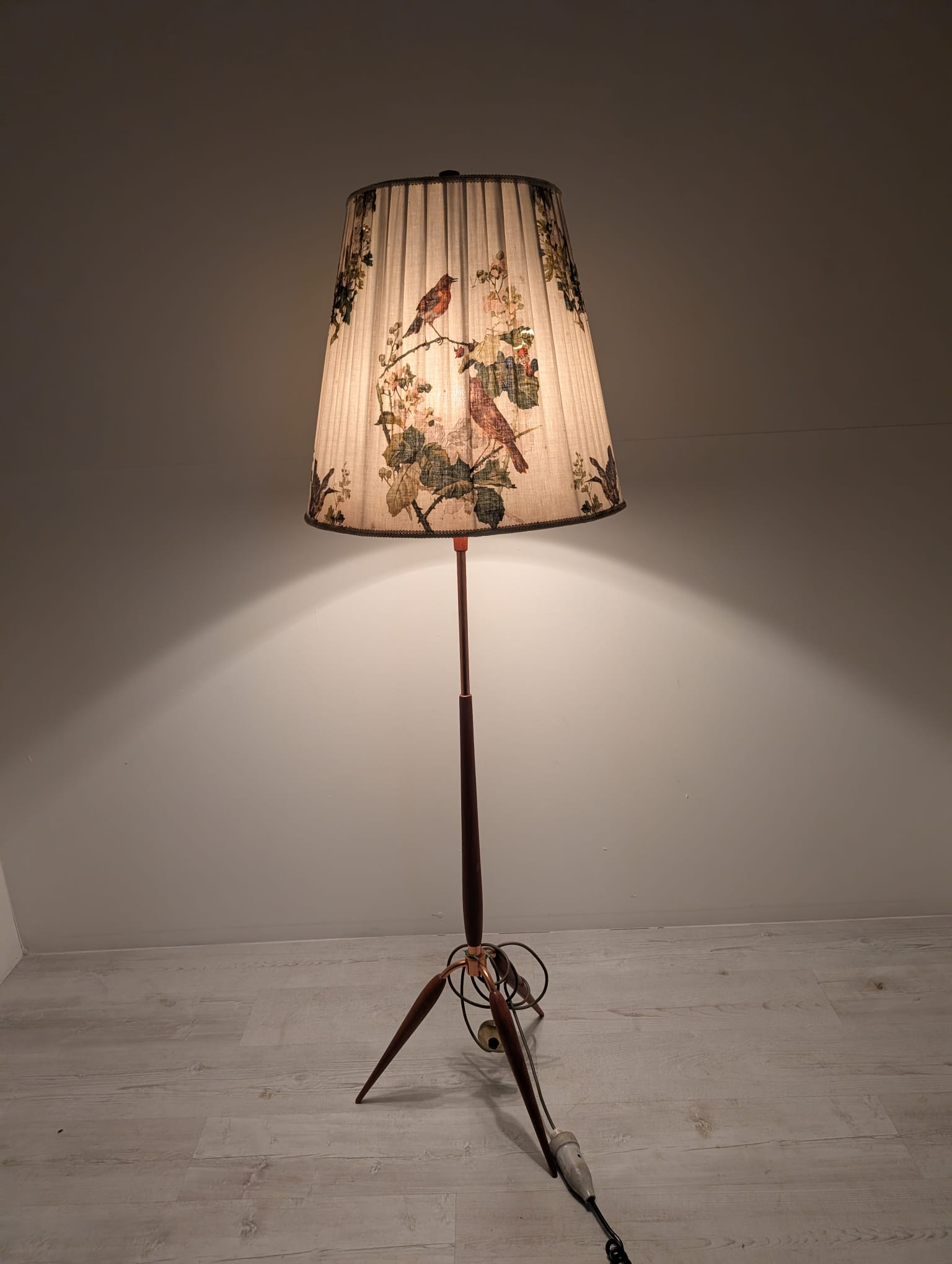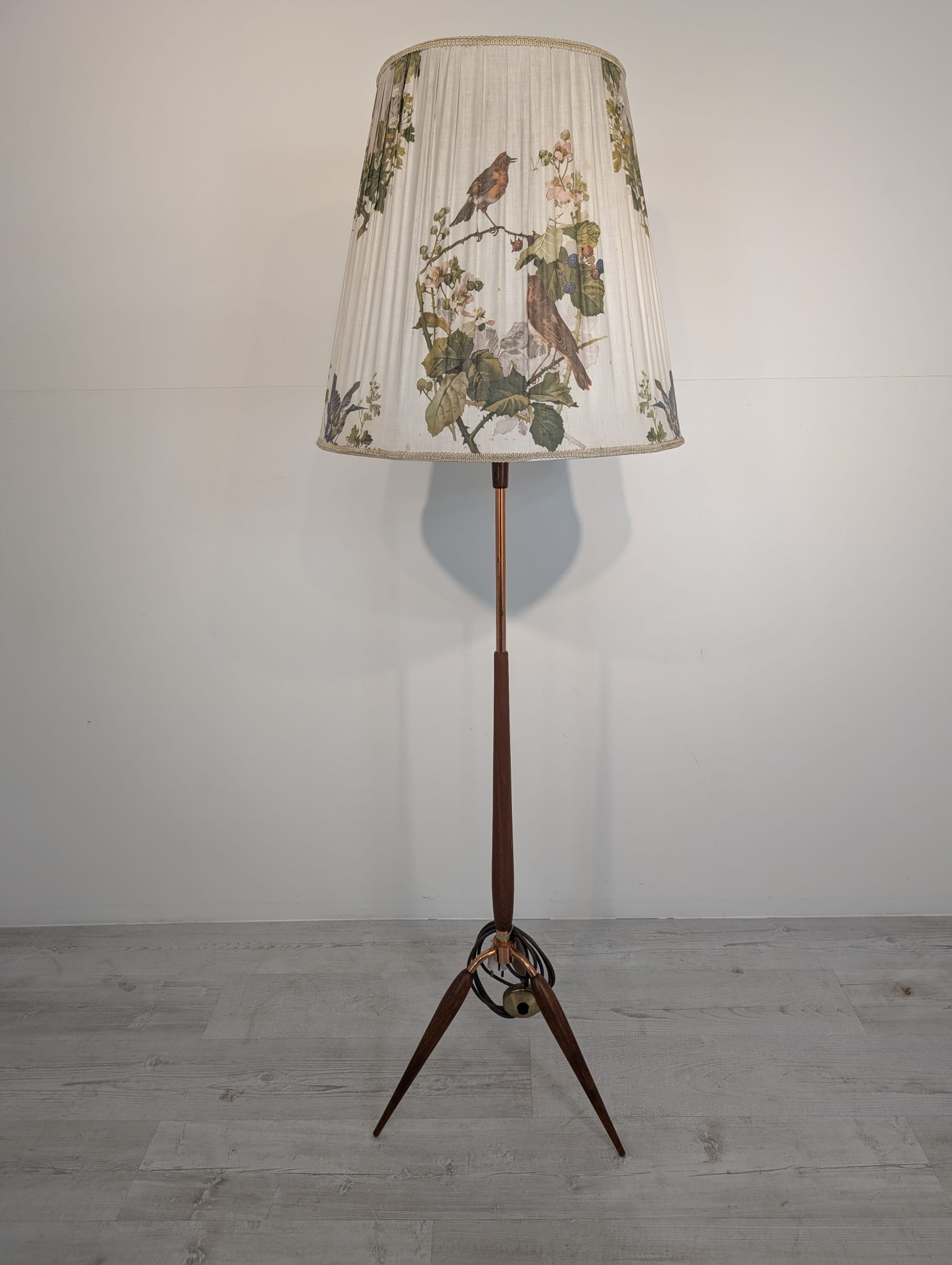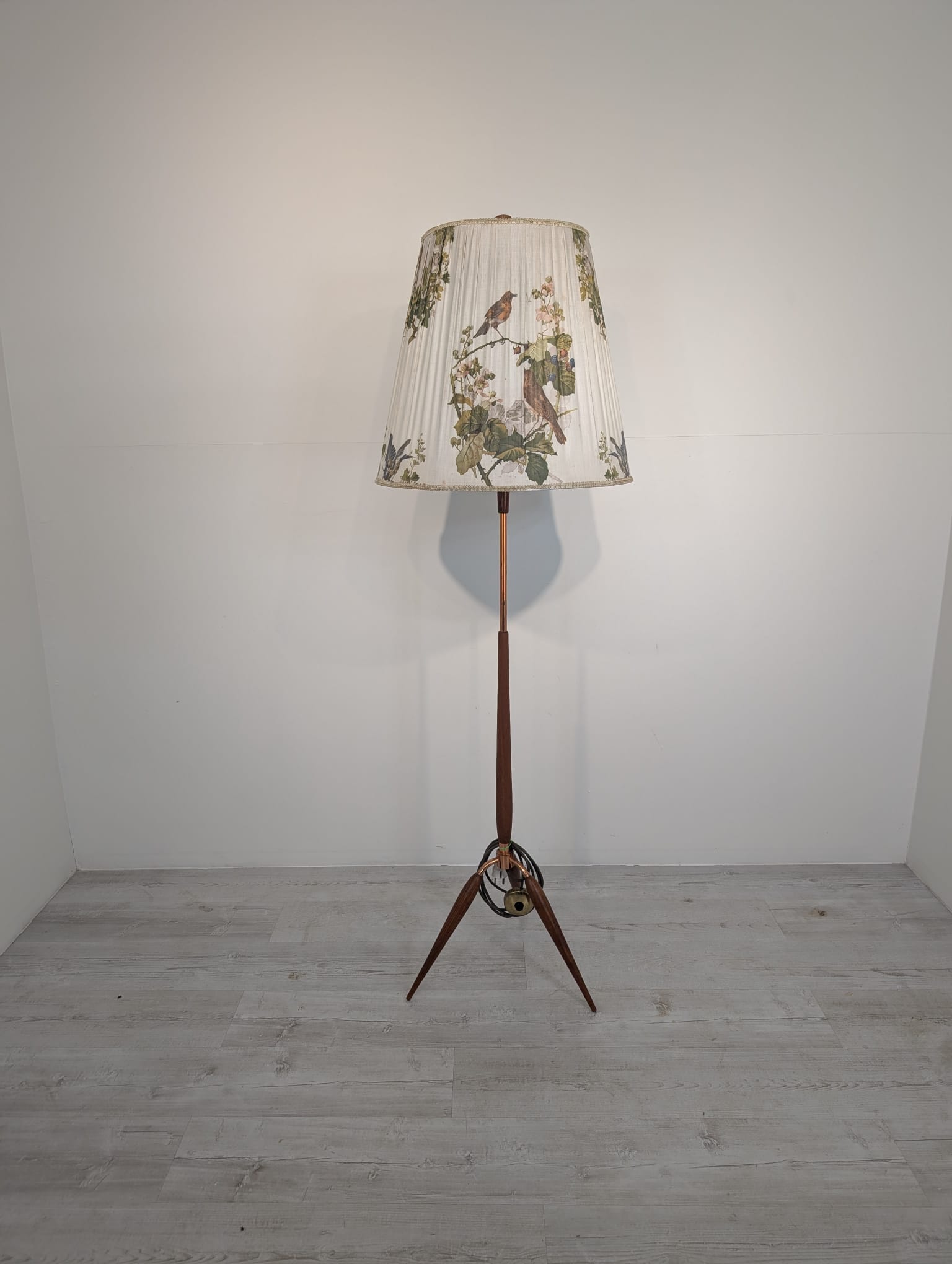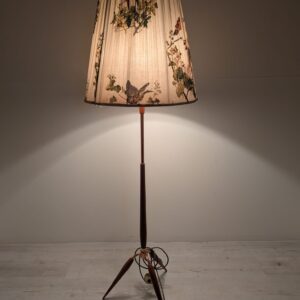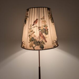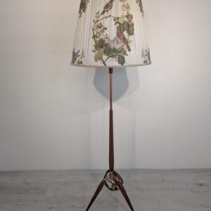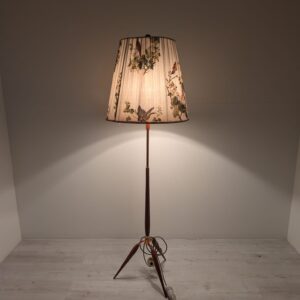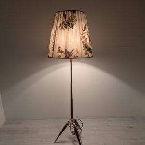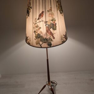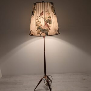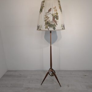 Stylowy, trójnożny lampowy stojak podłogowy w stylu lat 50./60. XX wieku, wykonany z drewna tekowego, mosiądzu i miedzi. Abażur oryginalny, zdobiony jest motywami roślinnymi i ptaków, nadając całości eleganckiego i nostalgicznego charakteru.
