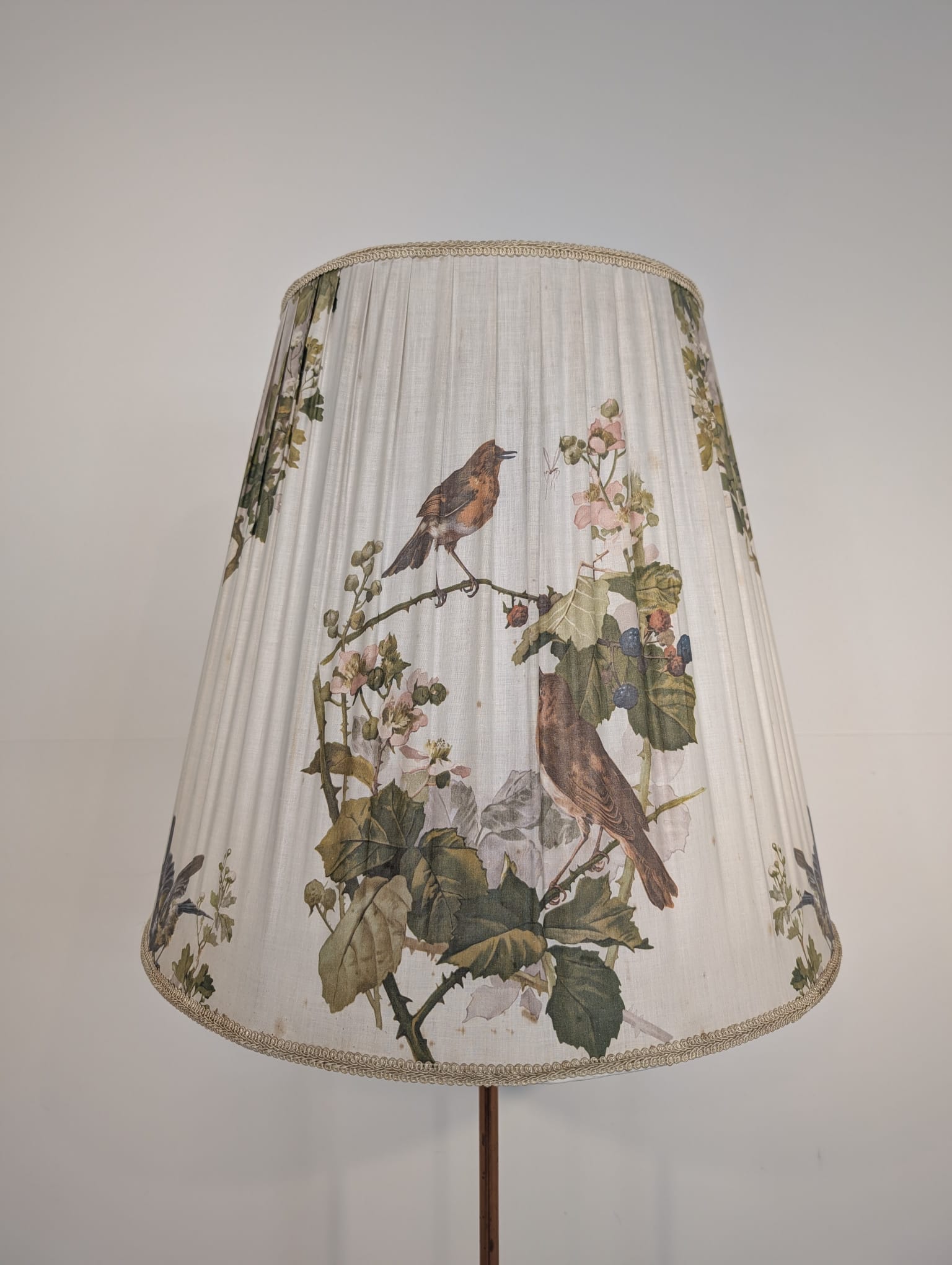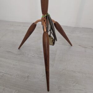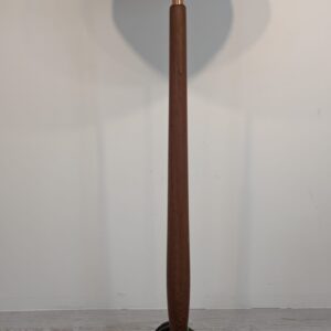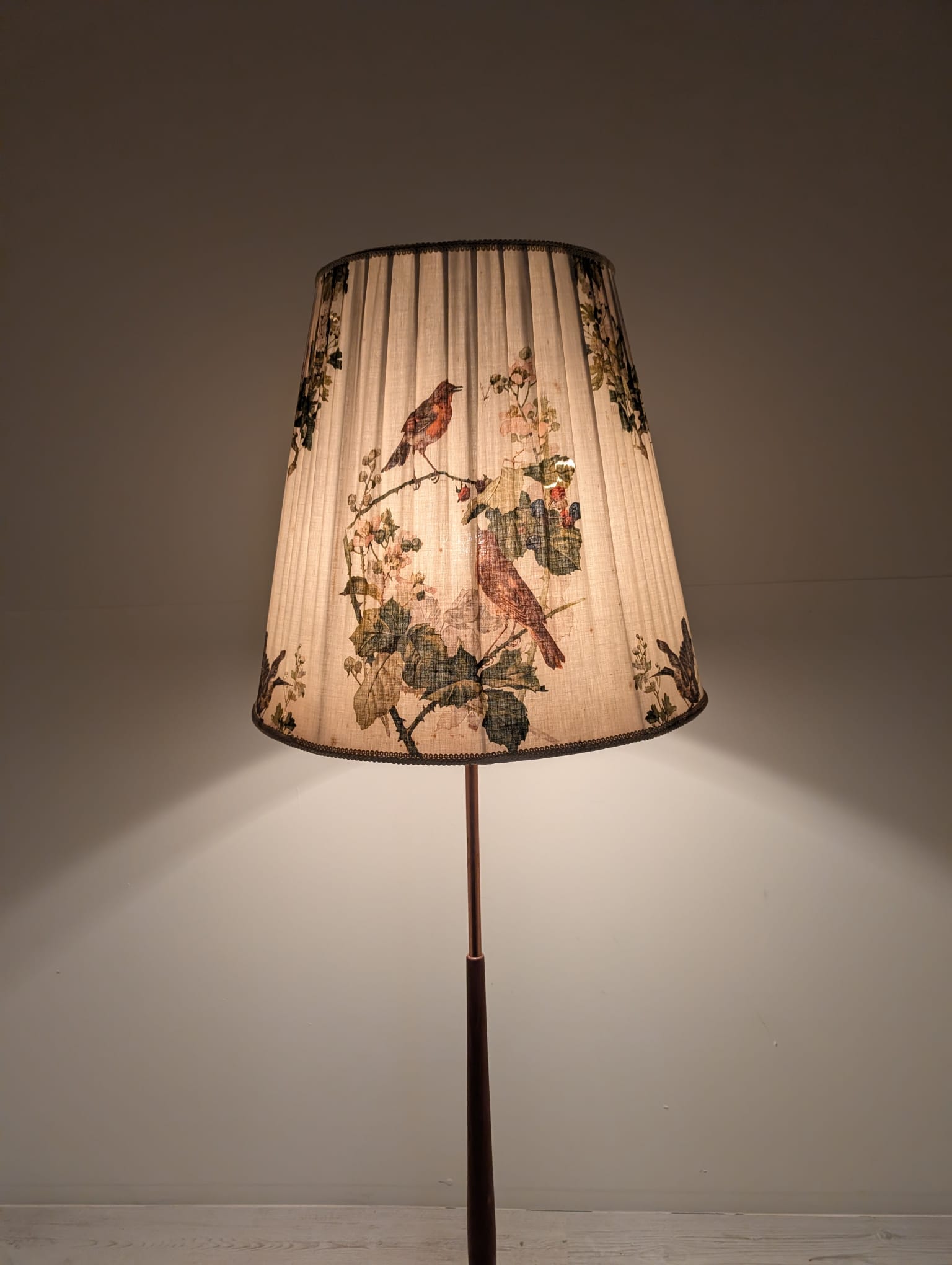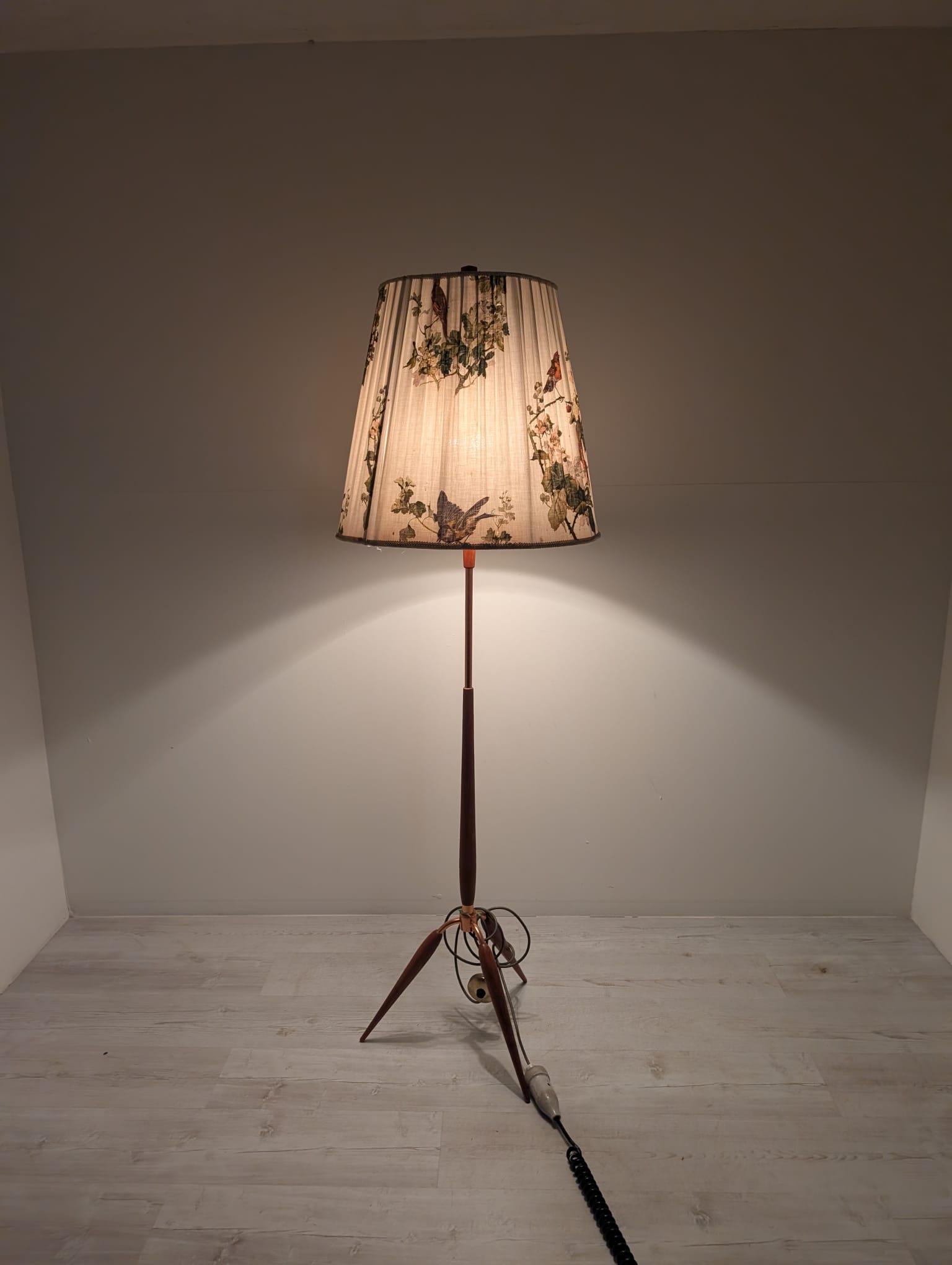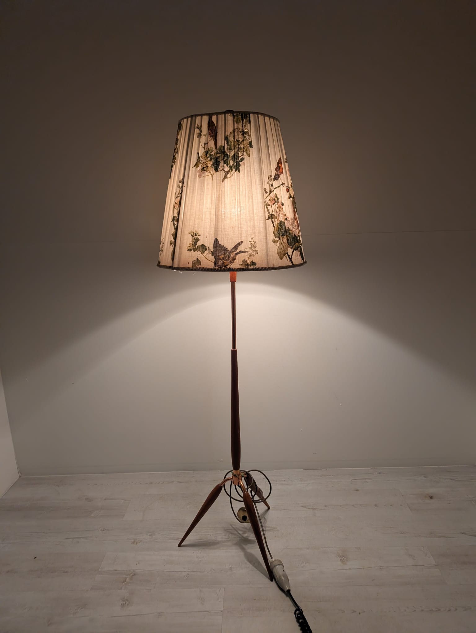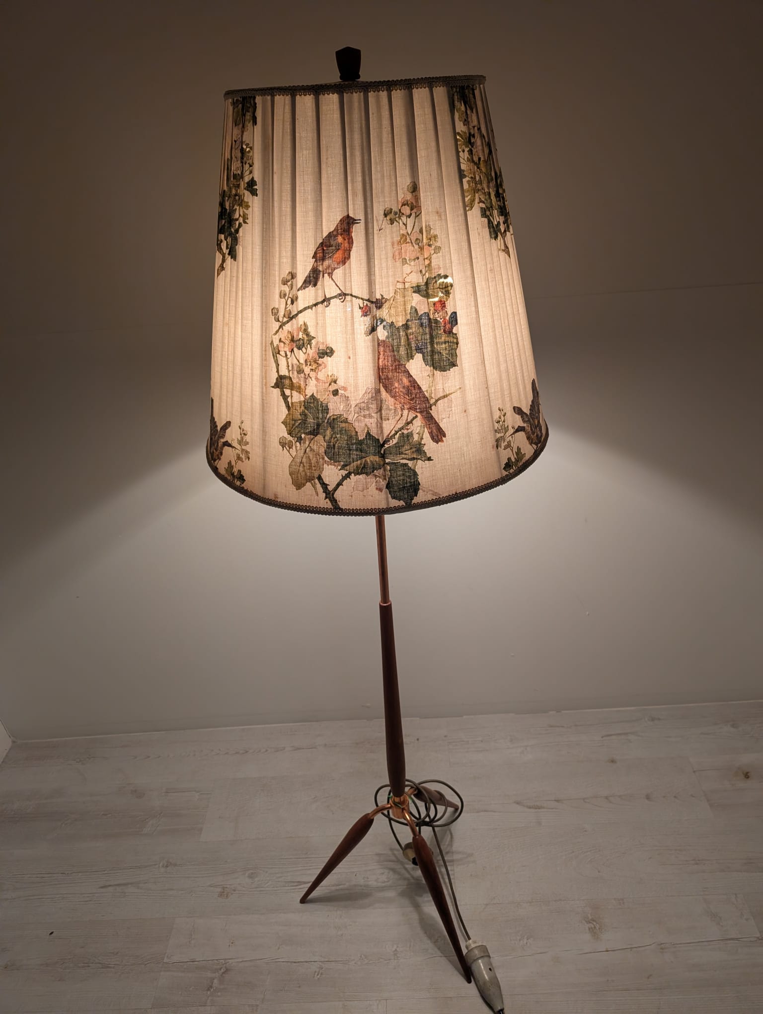 Stylowy, trójnożny lampowy stojak podłogowy w stylu lat 50./60. XX wieku, wykonany z drewna tekowego, mosiądzu i miedzi. Abażur oryginalny, zdobiony jest motywami roślinnymi i ptaków, nadając całości eleganckiego i nostalgicznego charakteru.