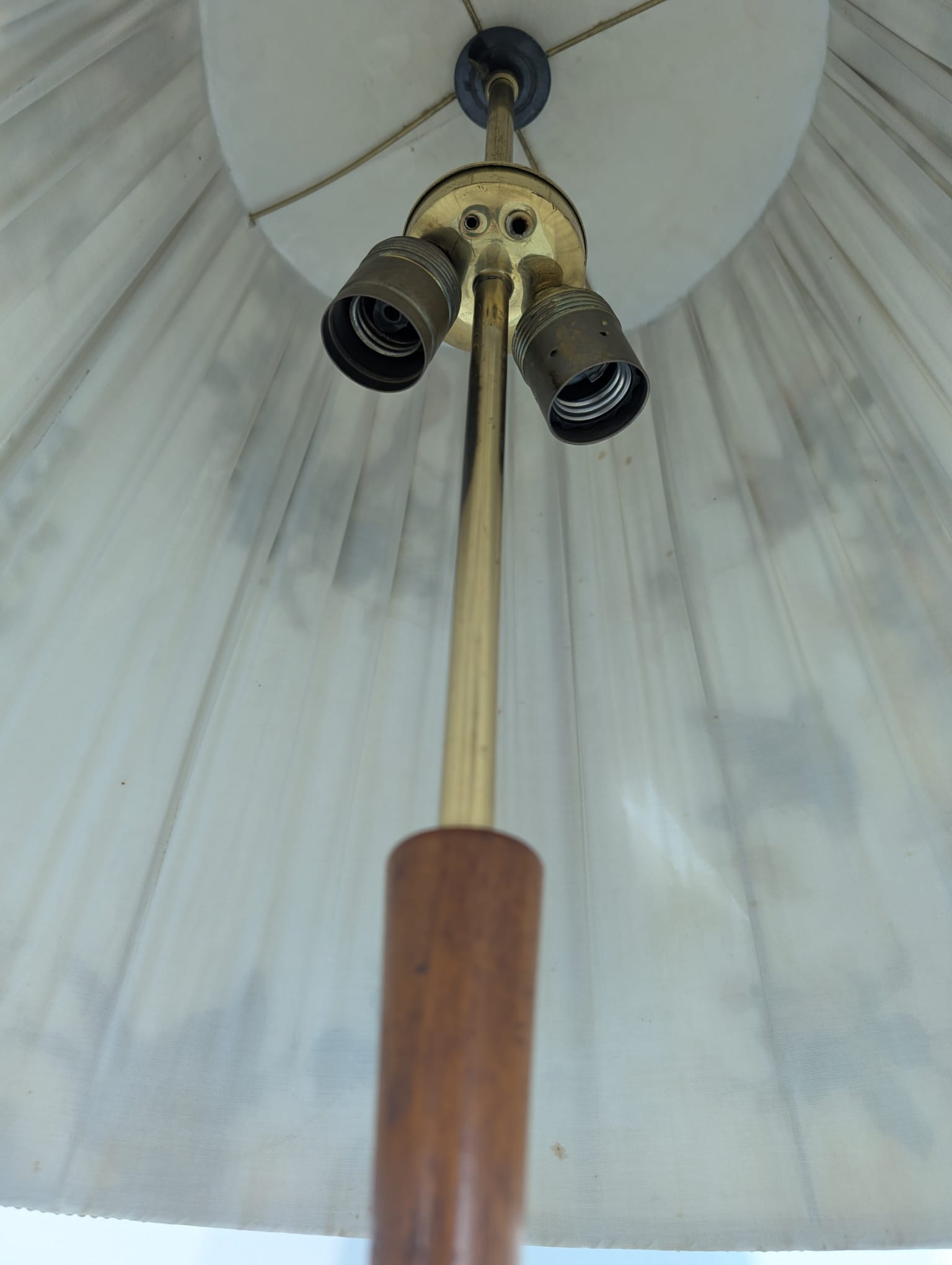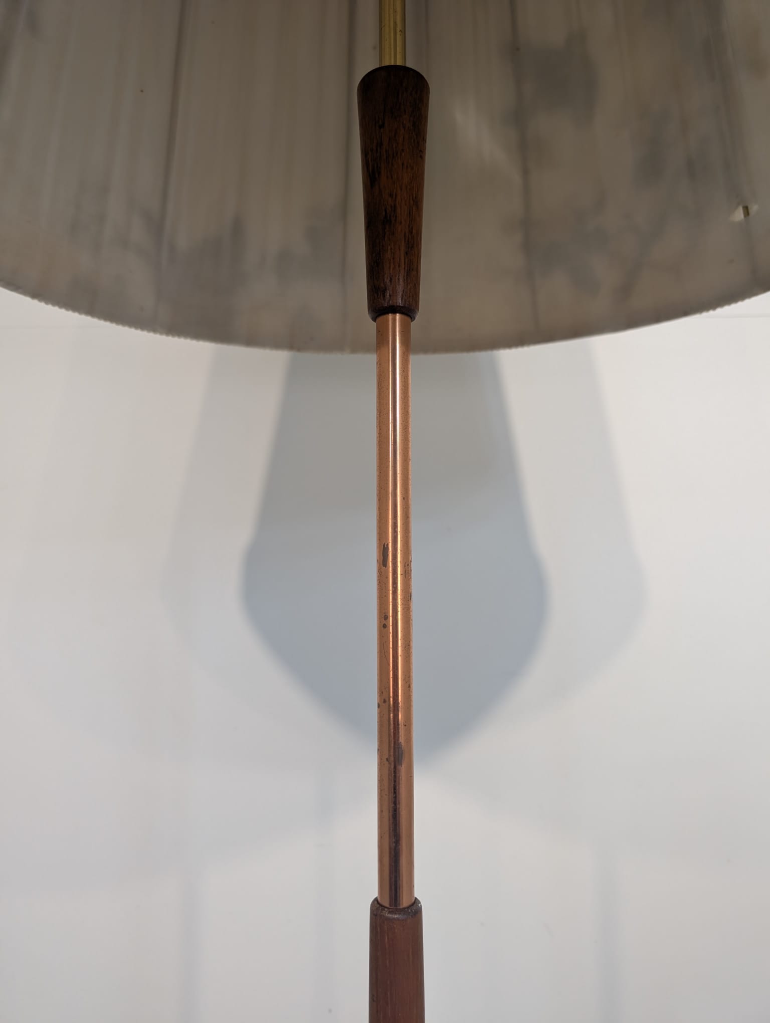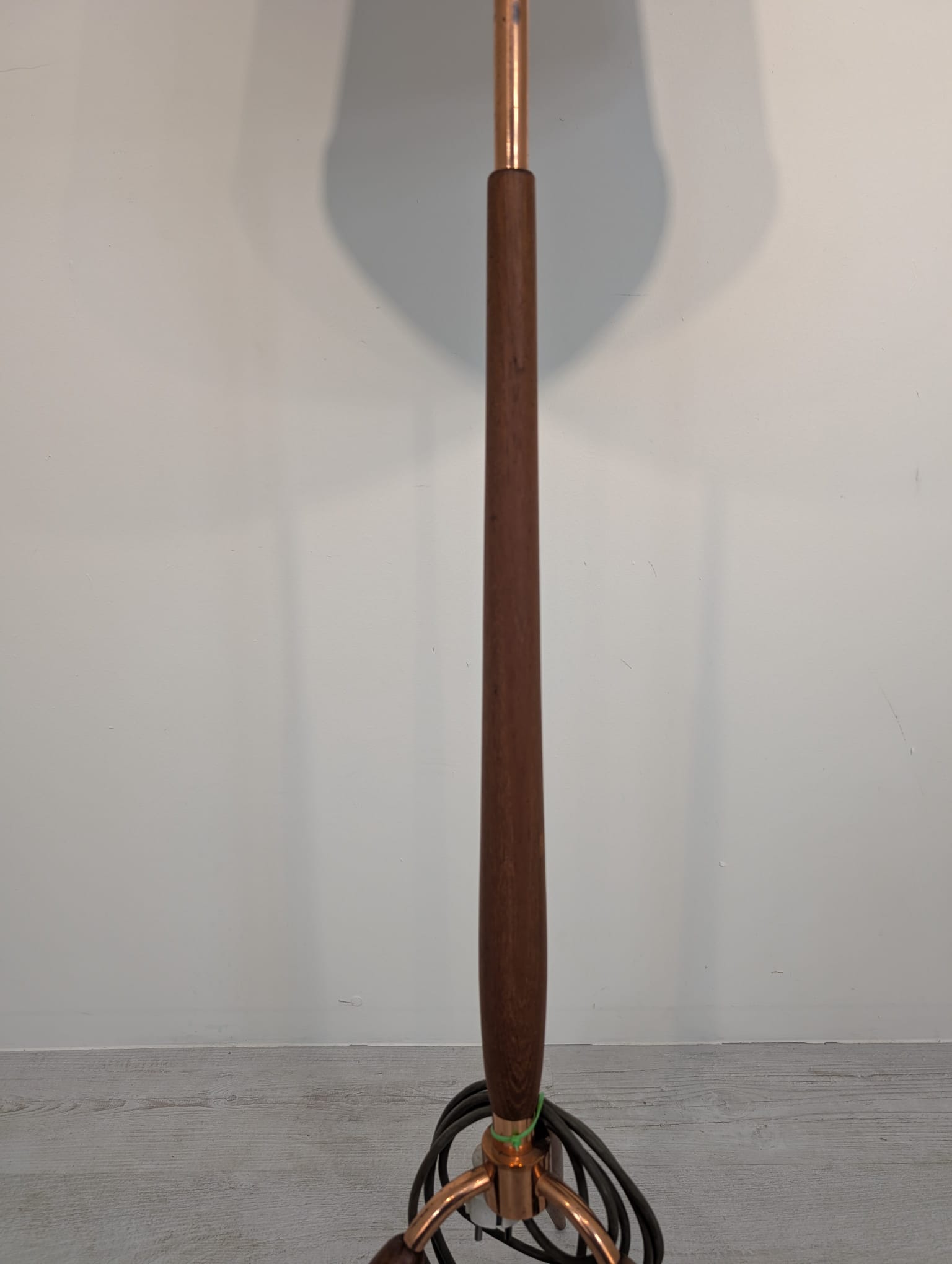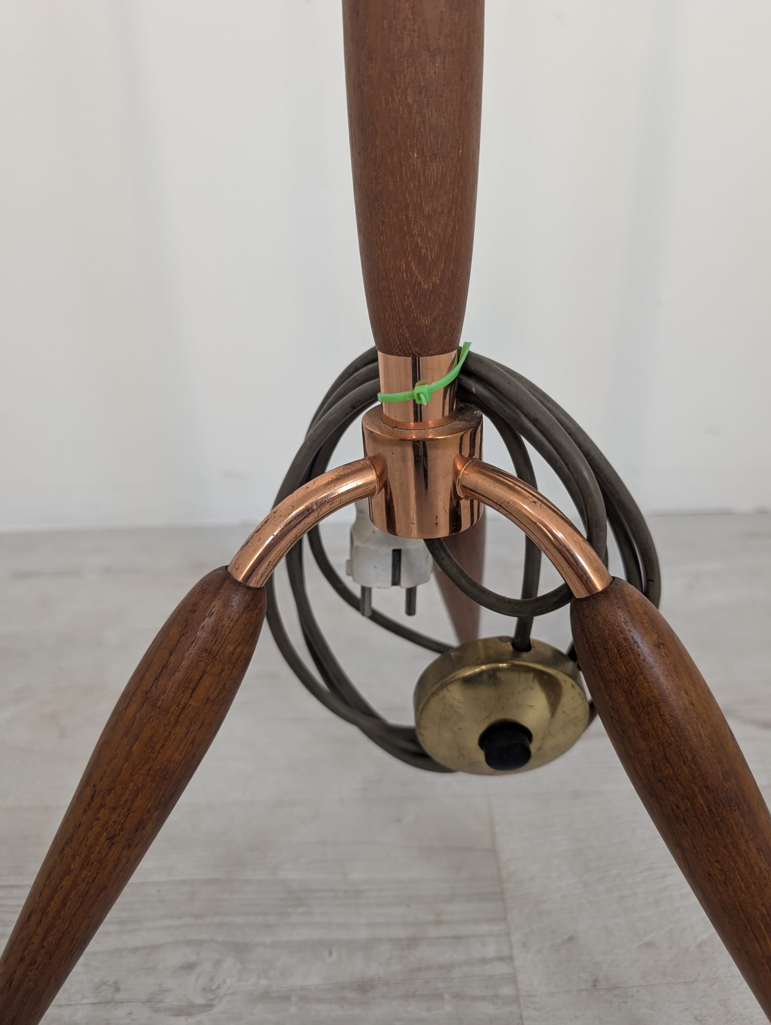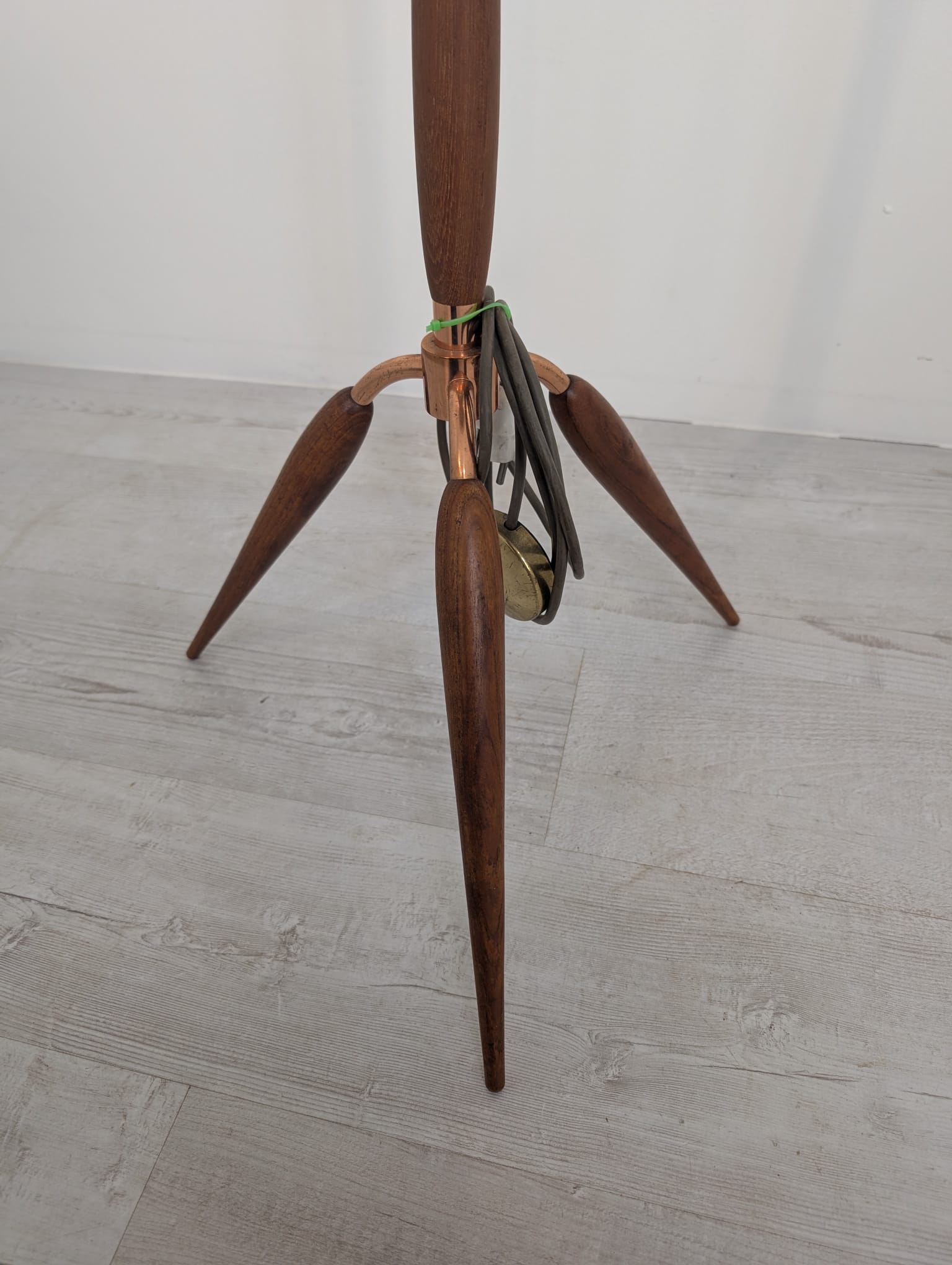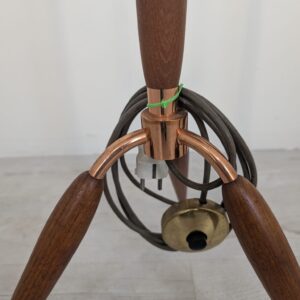 Stylish three-legged floor lamp made of teak, copper and brass from the 1950s/1960s