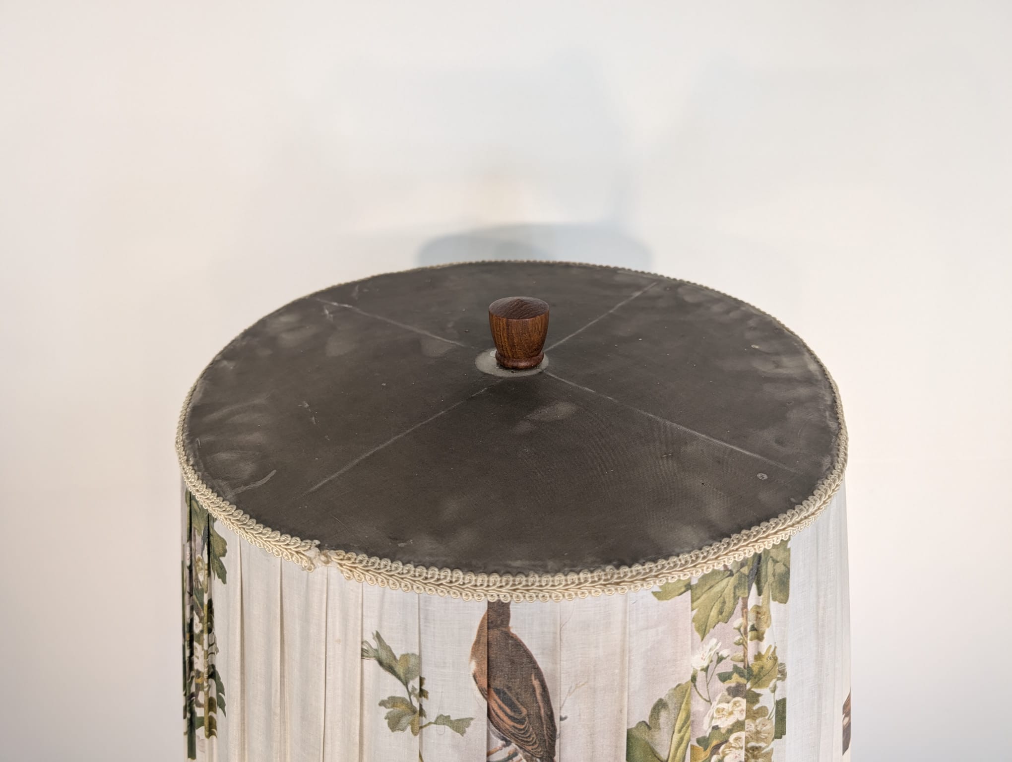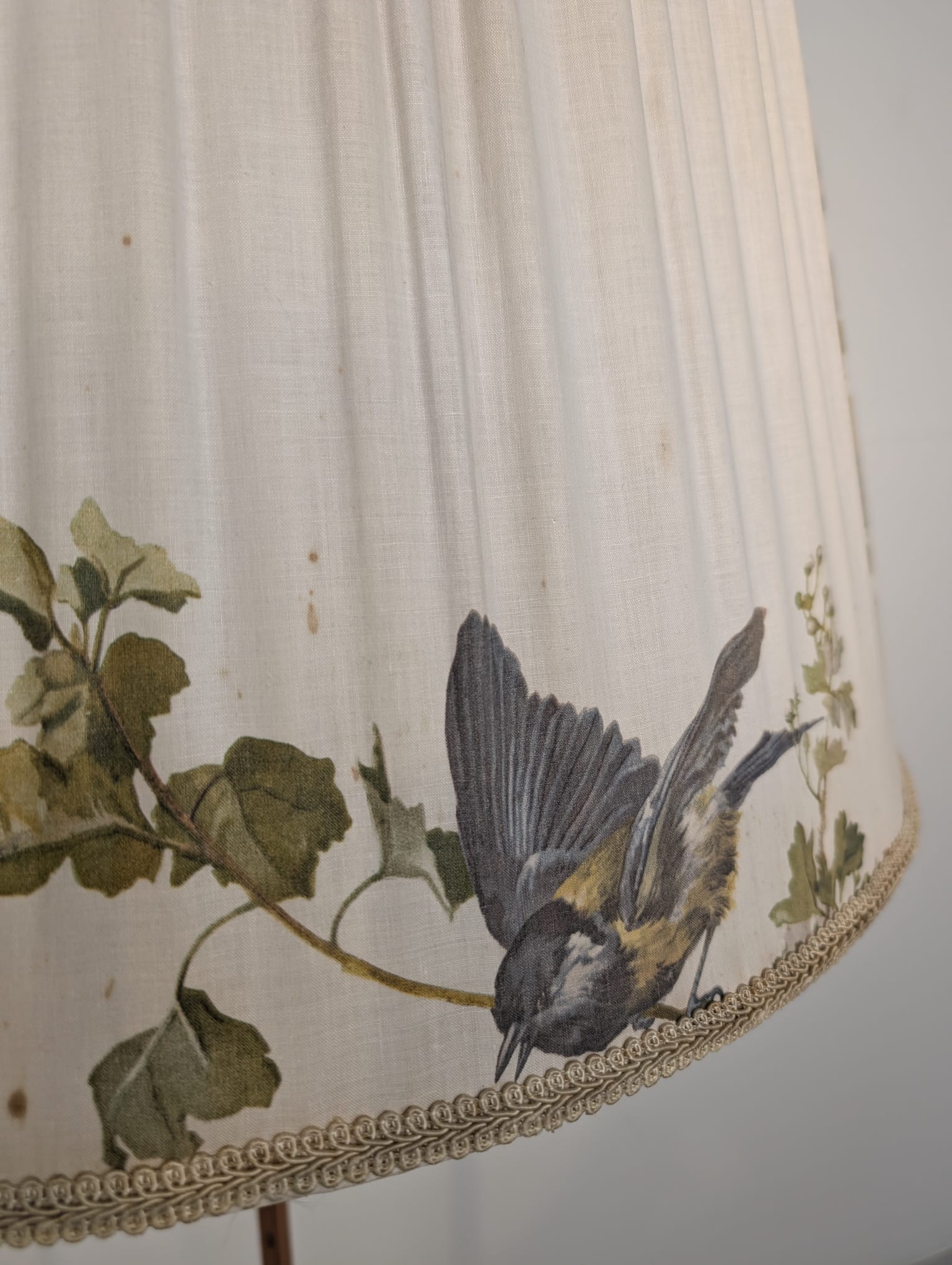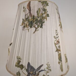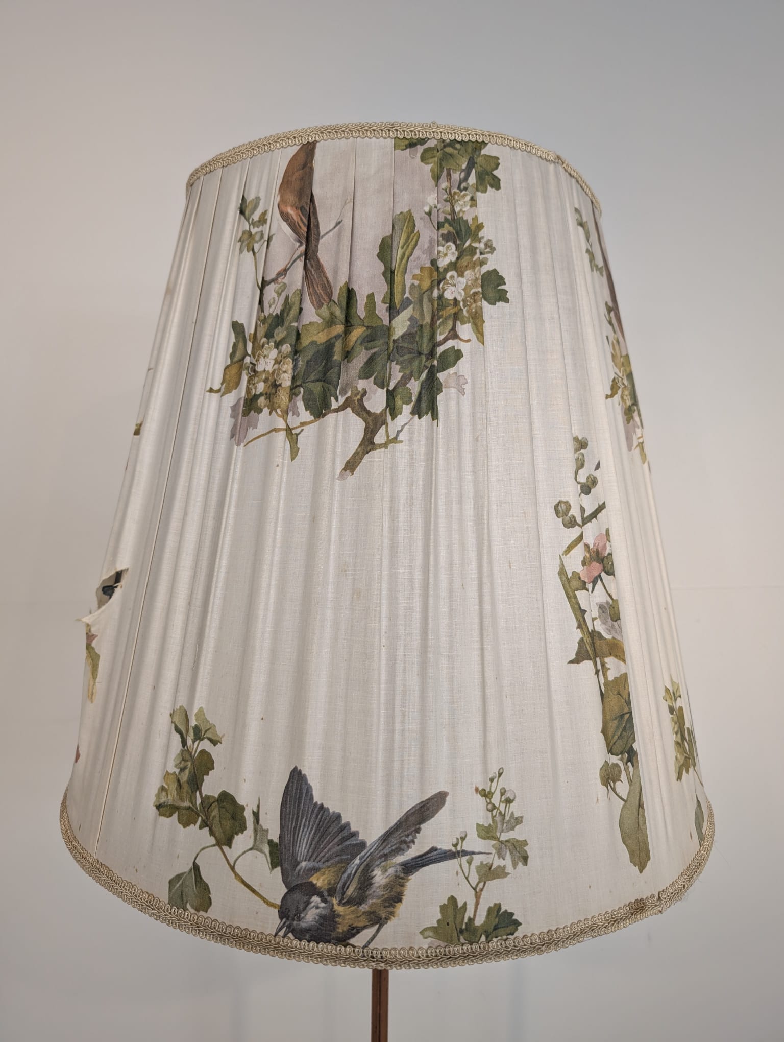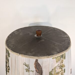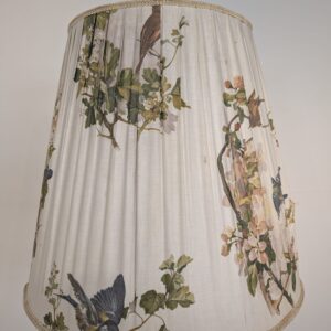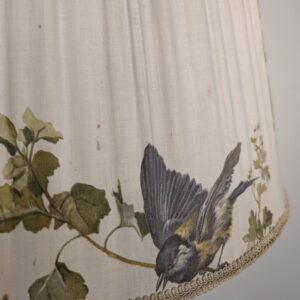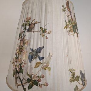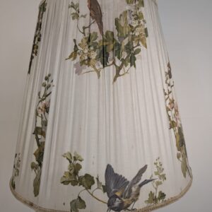 Lampa posiada ślady czasu oraz przedarty abażur.