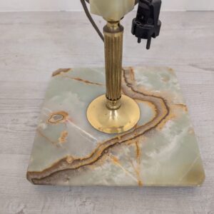 Stylowa lampa podłogowa z mosiężnymi i onyksu elementami. Elegancki design z metalową podstawą i długim, mosiężnym trzonem. Lampa ta będzie pięknym dodatkiem do każdego wnętrza, nadając mu niepowtarzalny charakter.