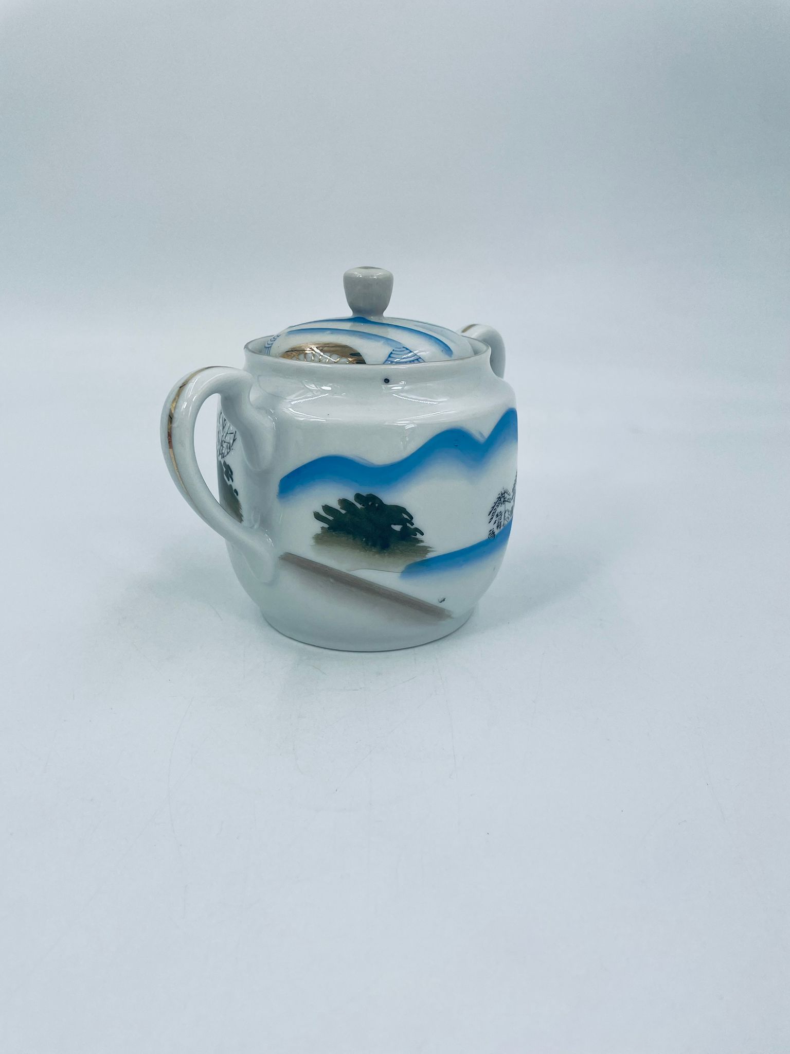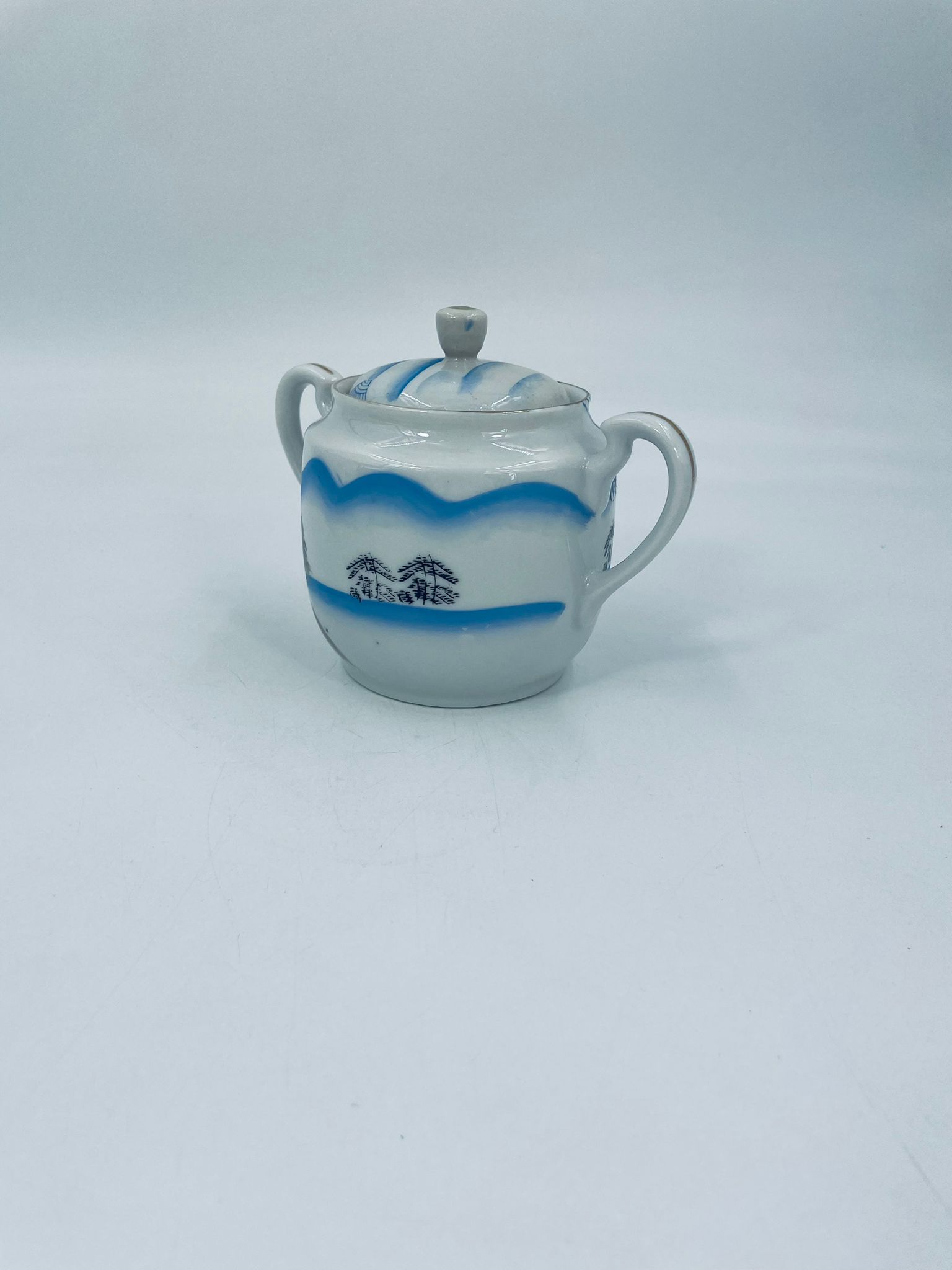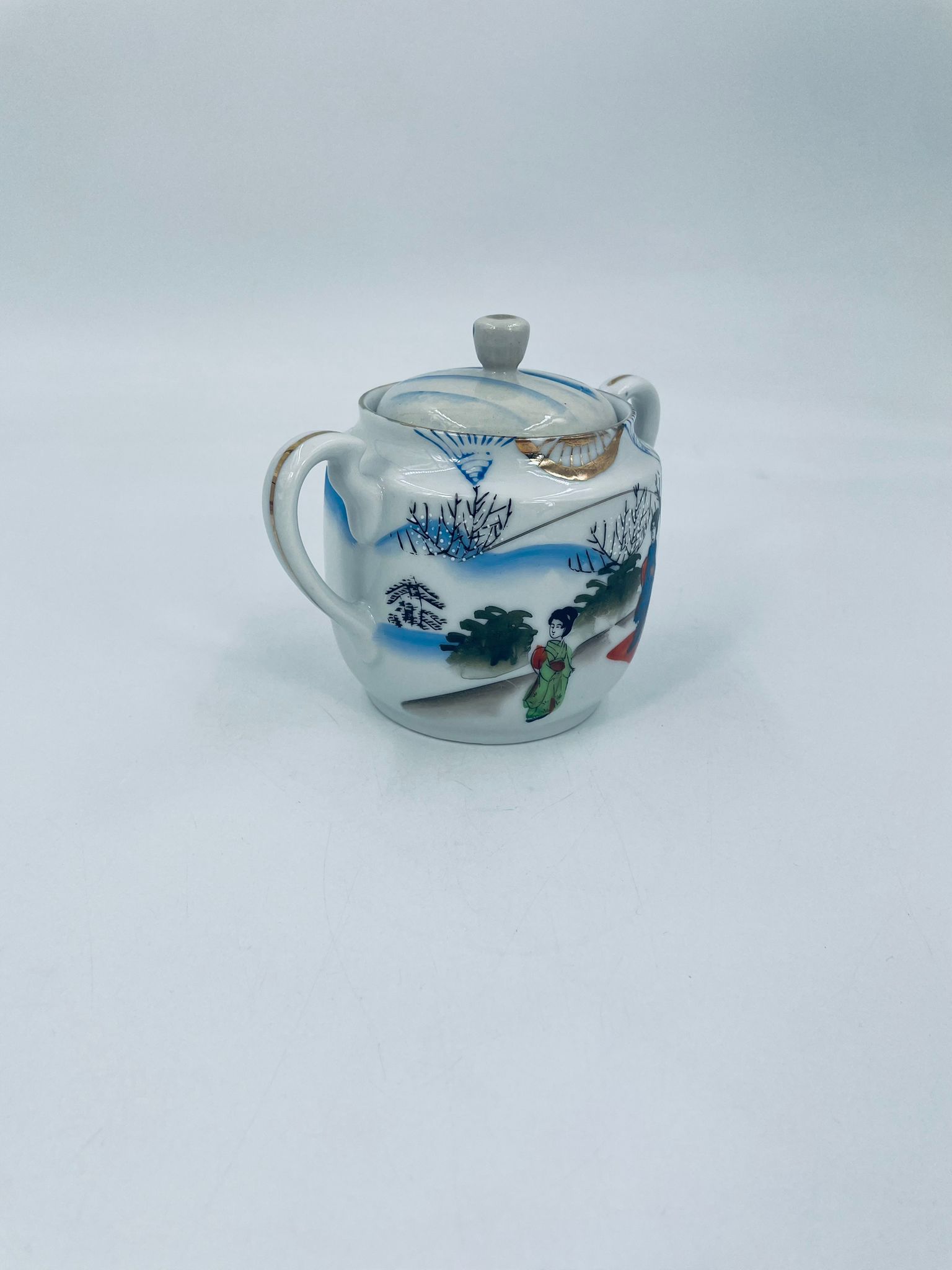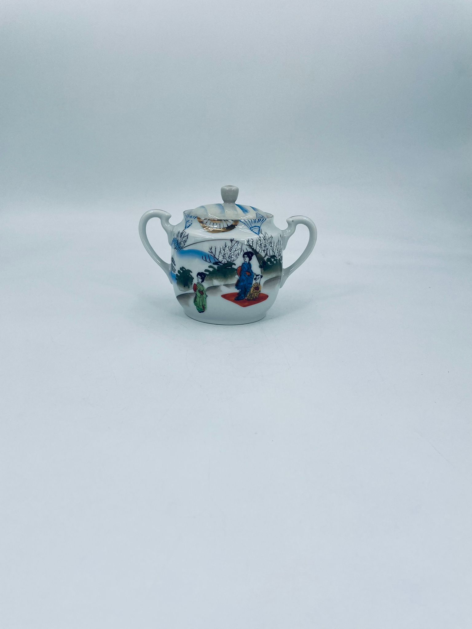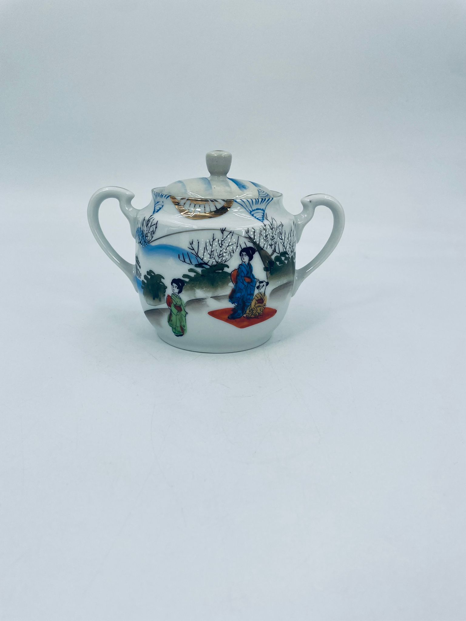Sugar bowl by Yamda Nippon, Japan , manufactured from white fine porcelain. The sugar bowl is hand-painted with a Geisha style design.