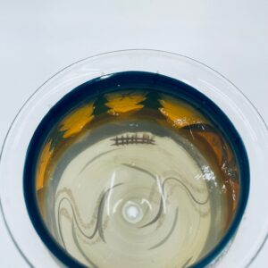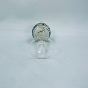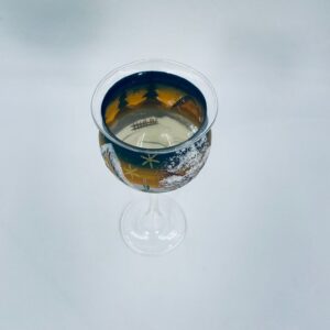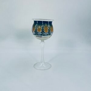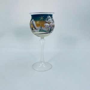 Świecznik dekoracyjny w stylu Vintage, wykonany z wysokiej jakości szkła kryształowego. Świecznik w kształcie kielicha, ozdobiony ręcznie malowanym motywem krajobrazu zimowego. Posiada drobne przetarcie.