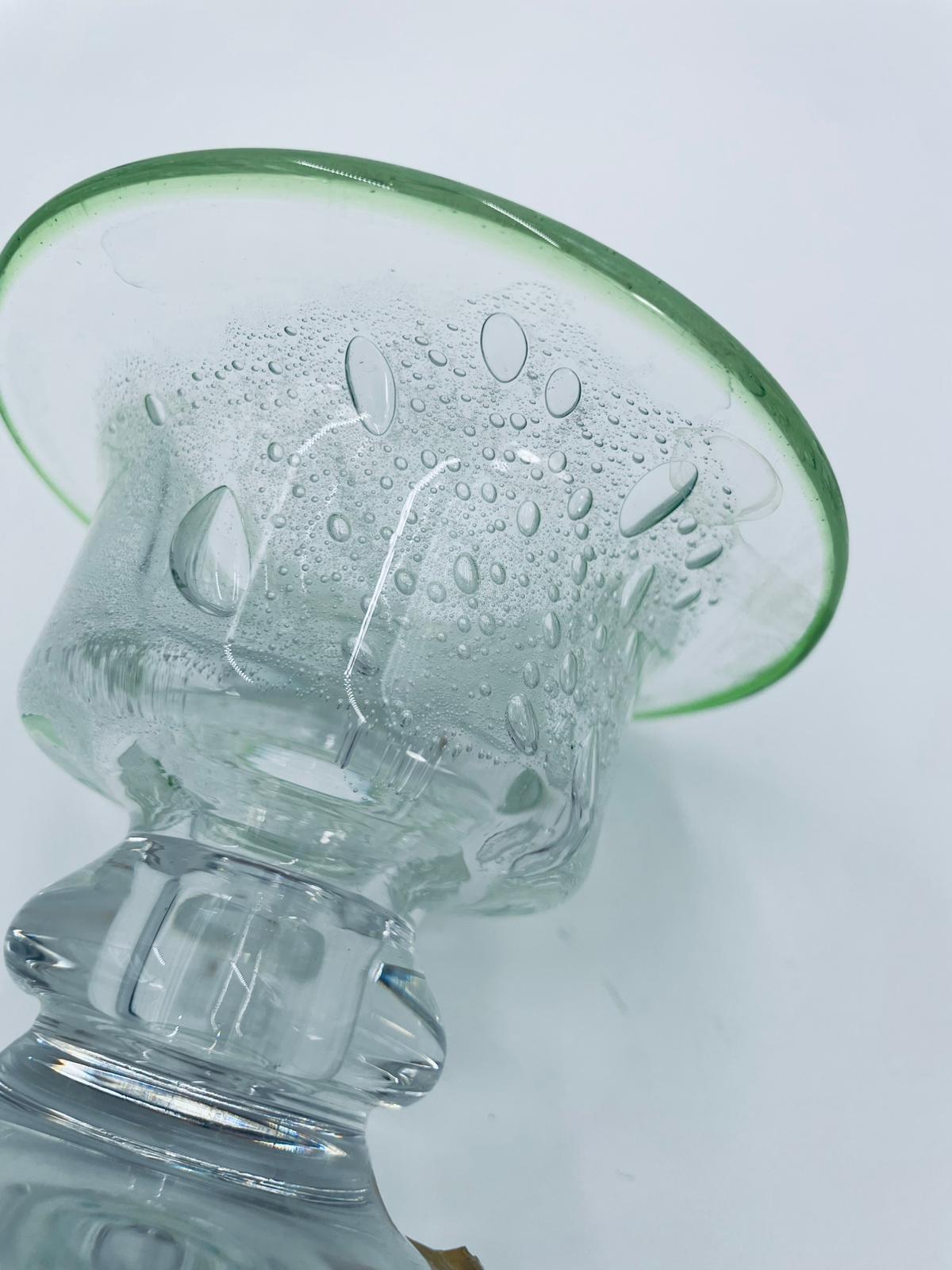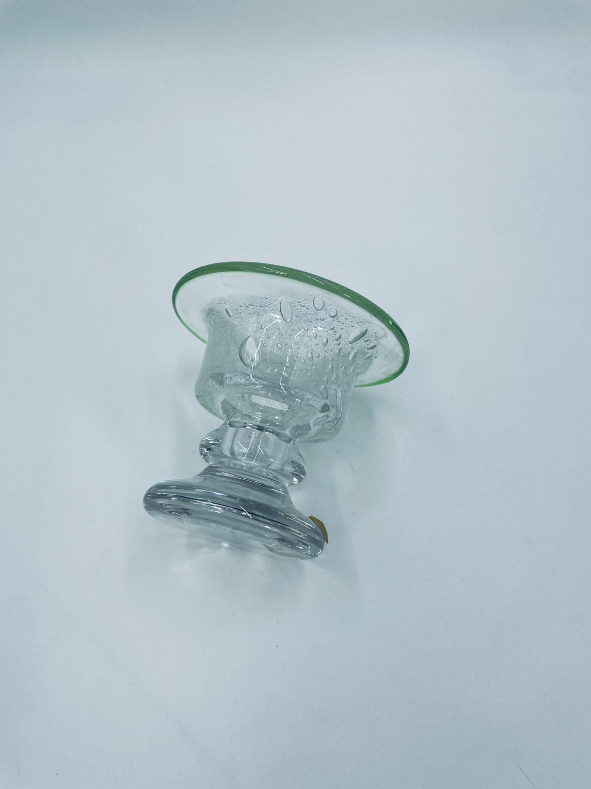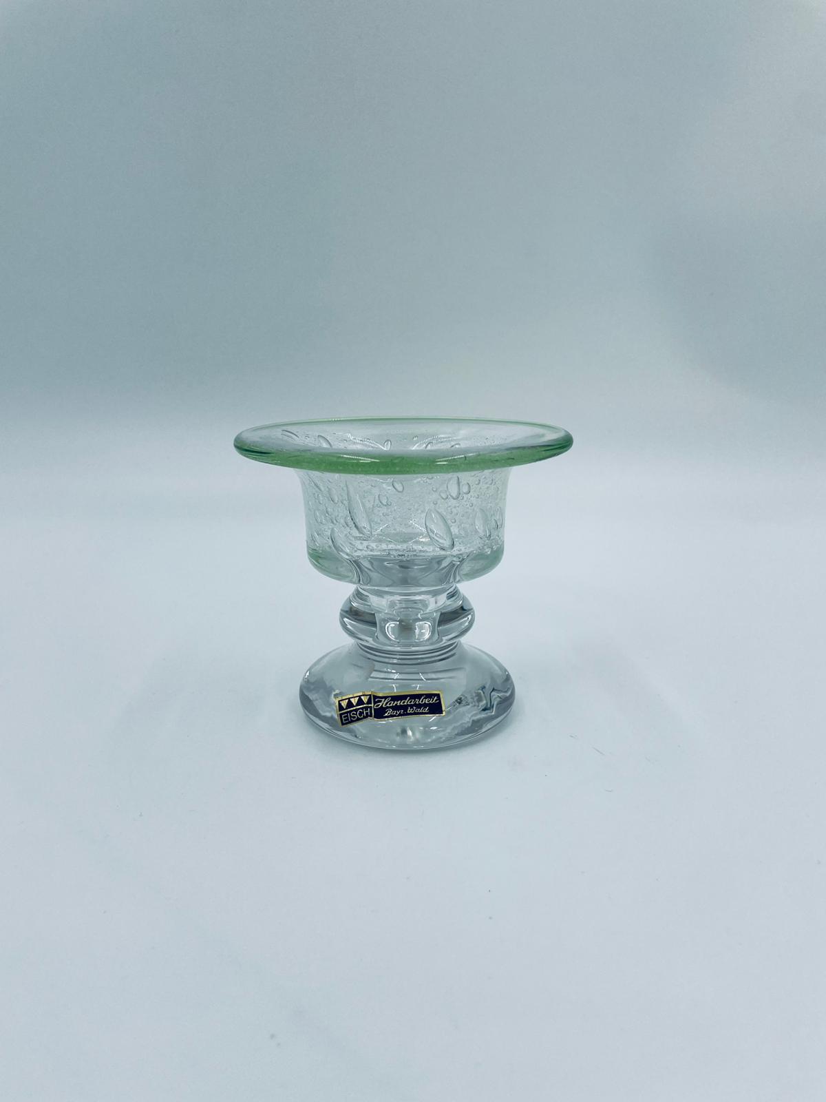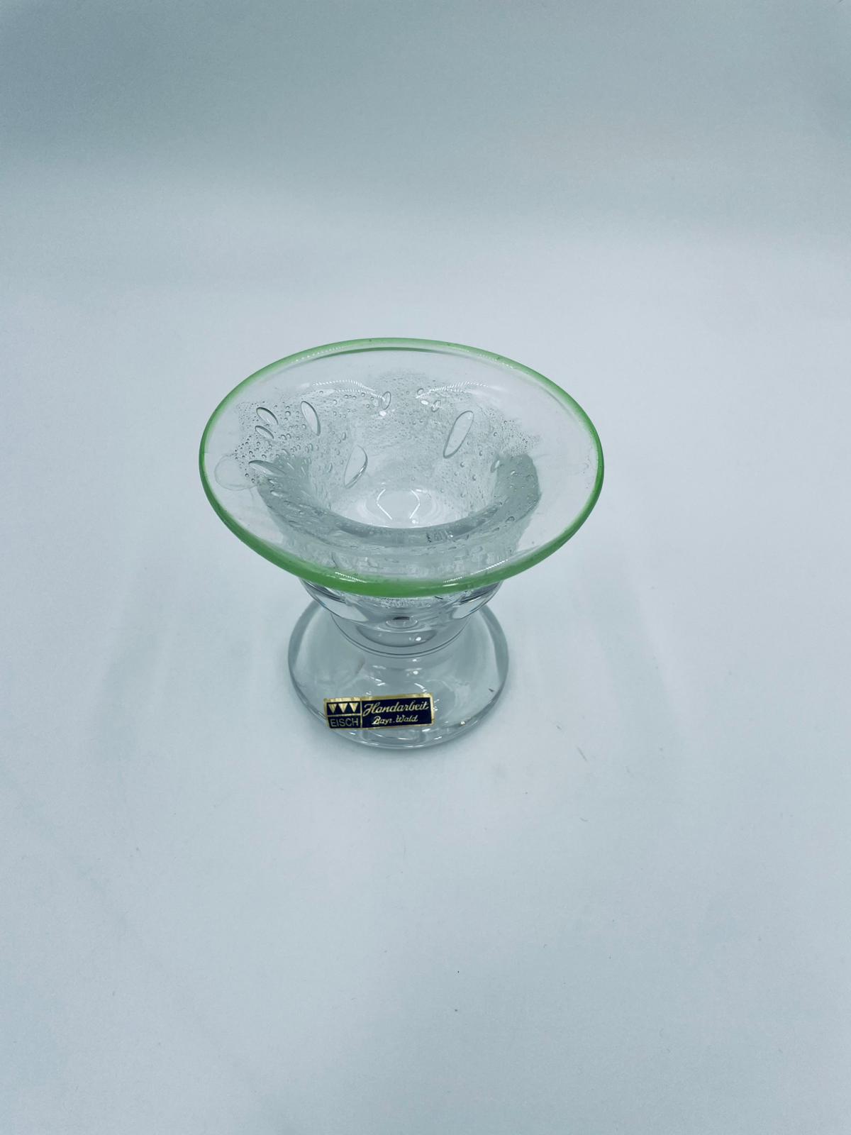 Świecznik dekoracyjny wytwórni Eisch, wykonany z wysokiej jakości szkła. Świecznik ręcznie robiony w Bawarskim lesie, charakteryzuje się efektem „bubble Glass” (szkło z pęcherzykami powietrza) oraz zielonym, ręcznie nakładanym rantem.