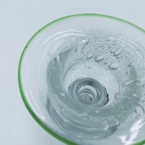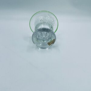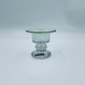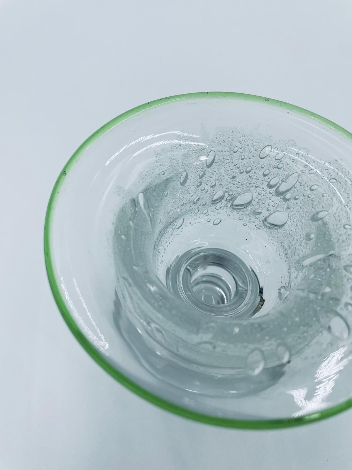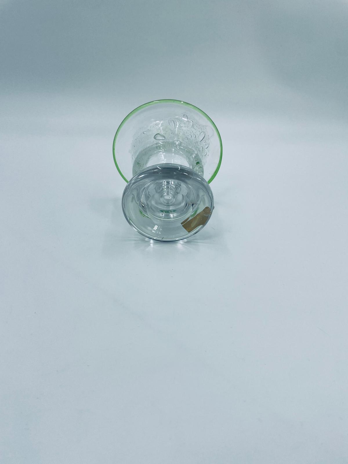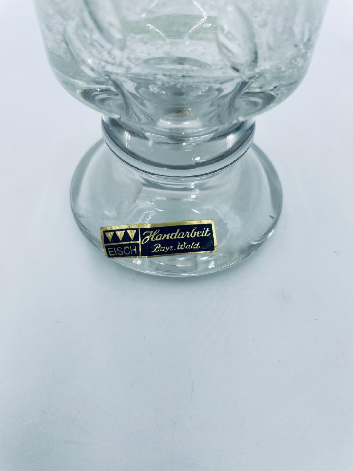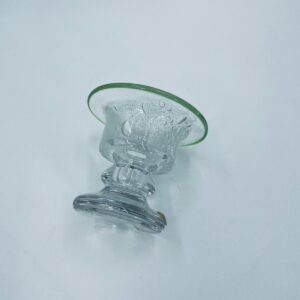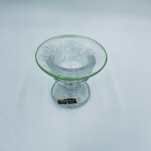 Świecznik dekoracyjny wytwórni Eisch, wykonany z wysokiej jakości szkła. Świecznik ręcznie robiony w Bawarskim lesie, charakteryzuje się efektem „bubble Glass” (szkło z pęcherzykami powietrza) oraz zielonym, ręcznie nakładanym rantem.