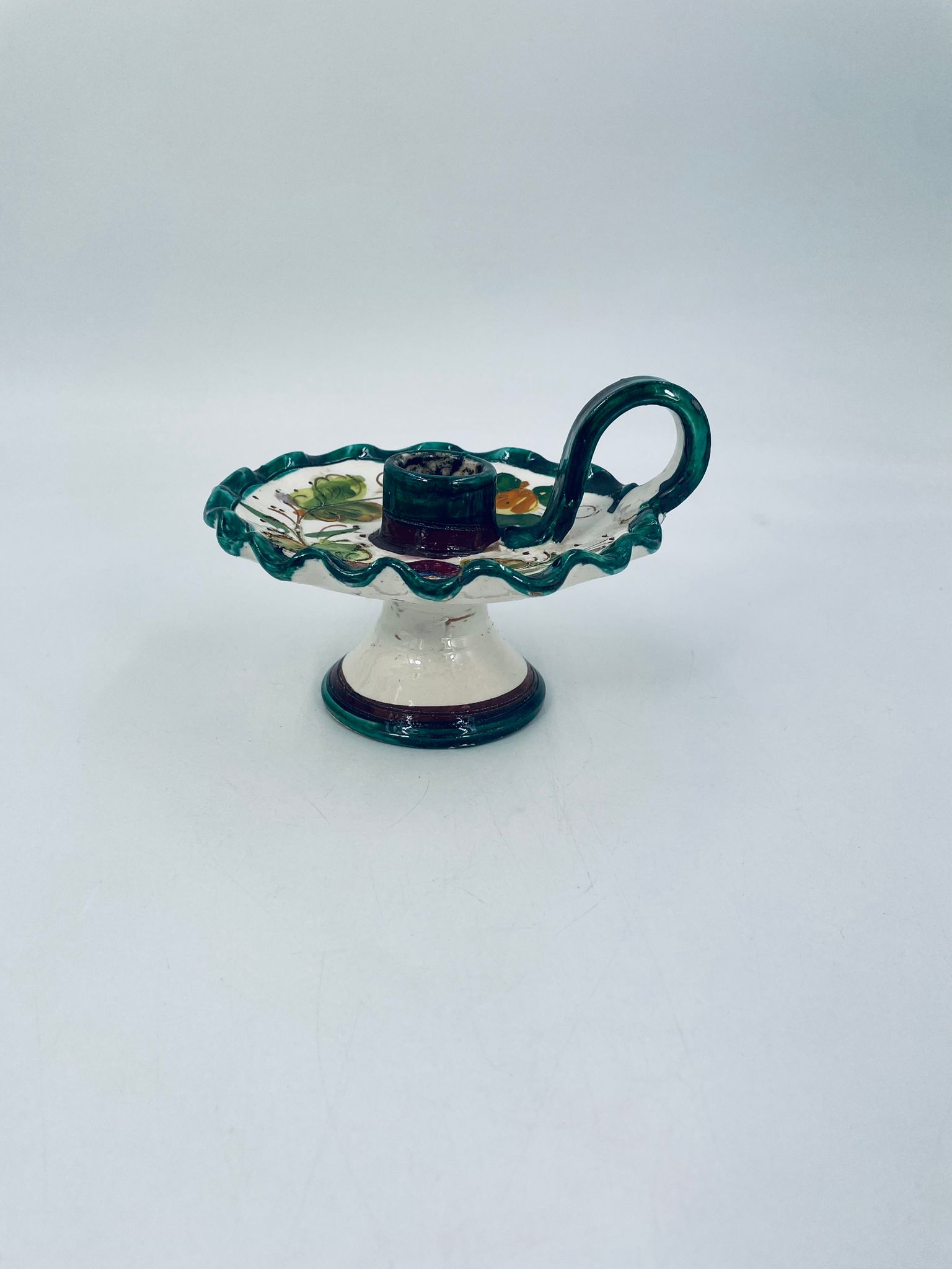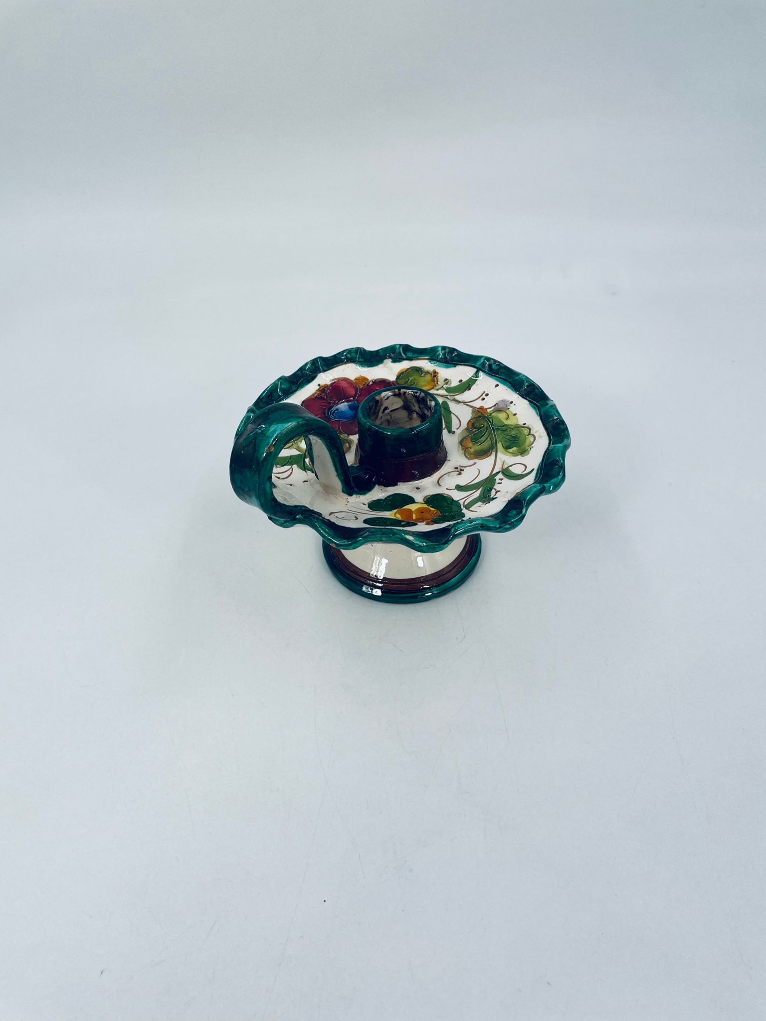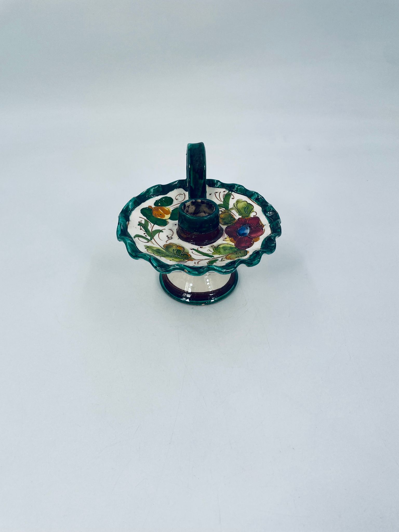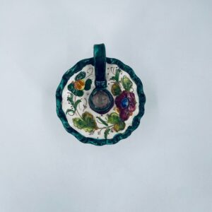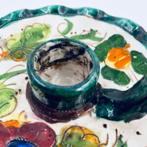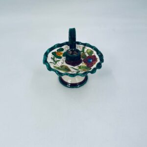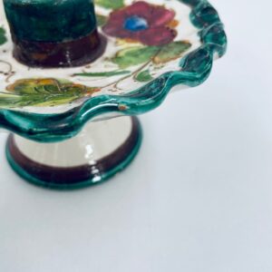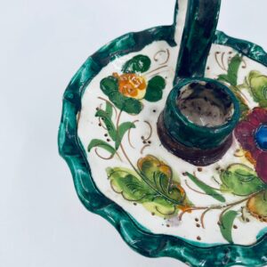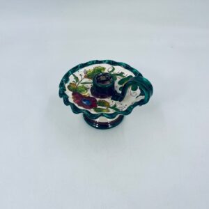 Świecznik z uchwytem, wykonany z Włoskiej mojaliki, ręcznie robiony i malowany. Charakteryzuje się zielonym falistym brzegiem, ozdobnym uchwytem oraz zdobieniami przedawniającymi liście i kwiaty w odcieniach, zieleni, pomarańczu i bordowego. Przedmiot służy do umieszczenia świecy, pełniąc również rolę użytkową jak i dekoracyjną. Świecznik posiada delikatne odpryski i pęknięcie.