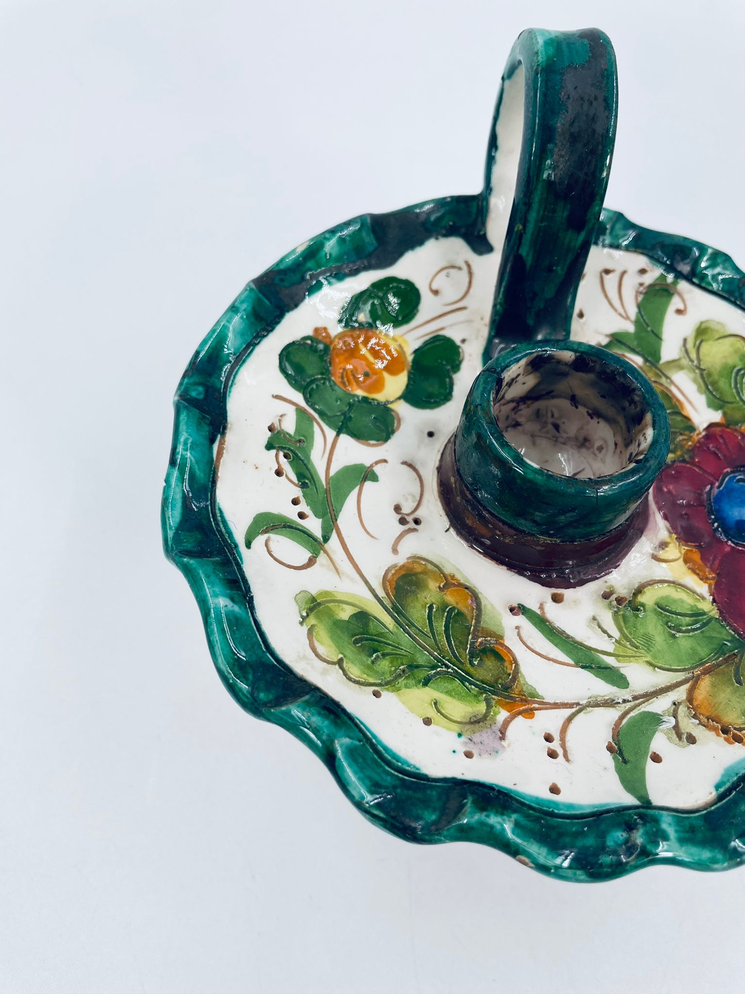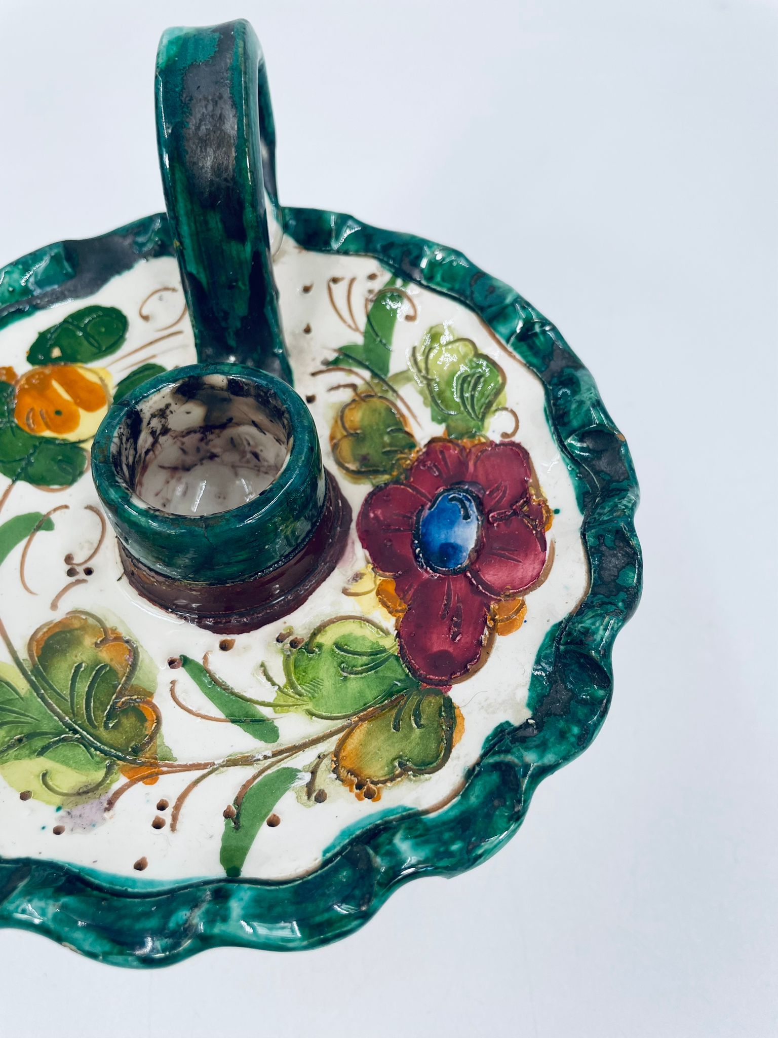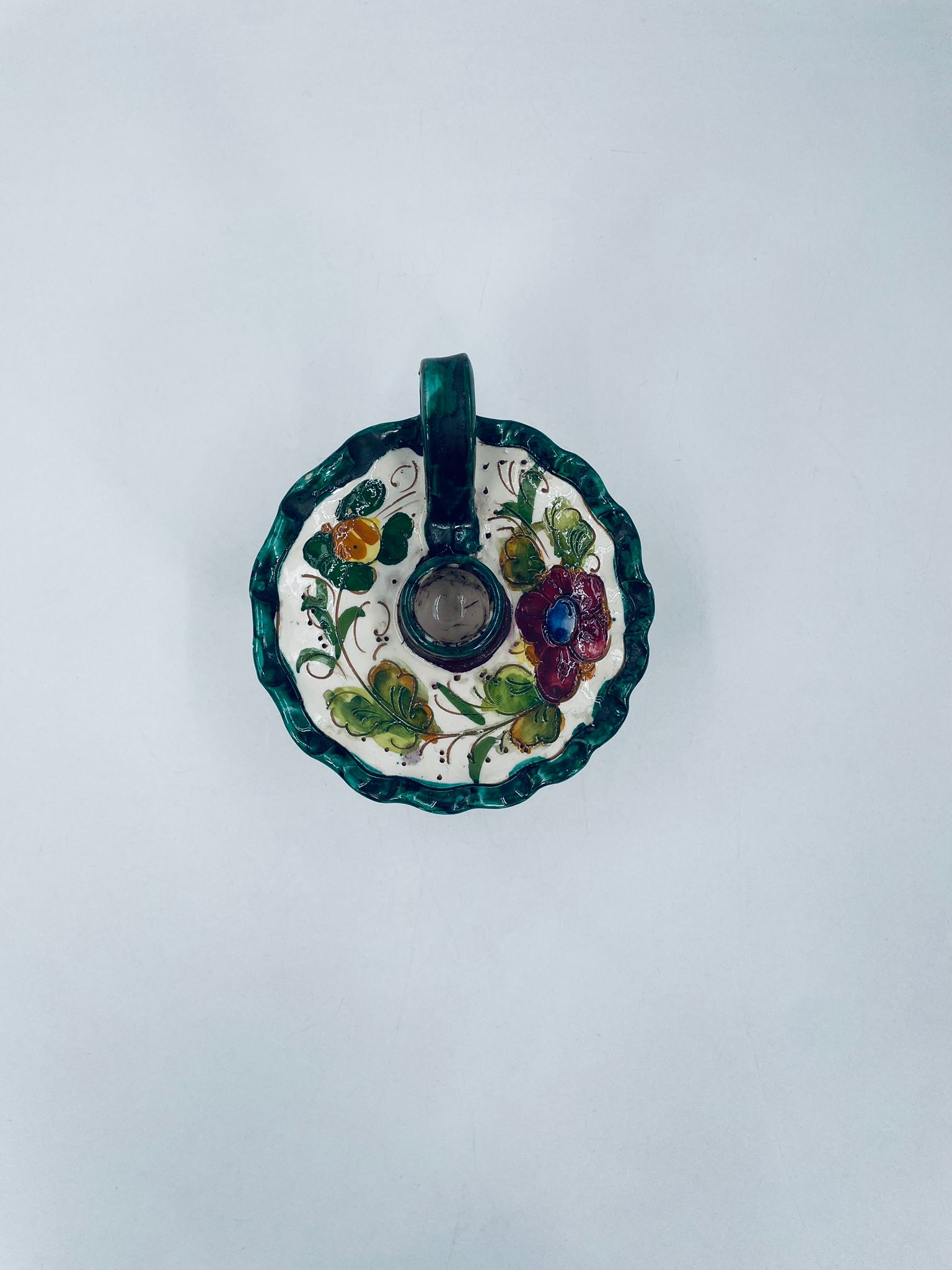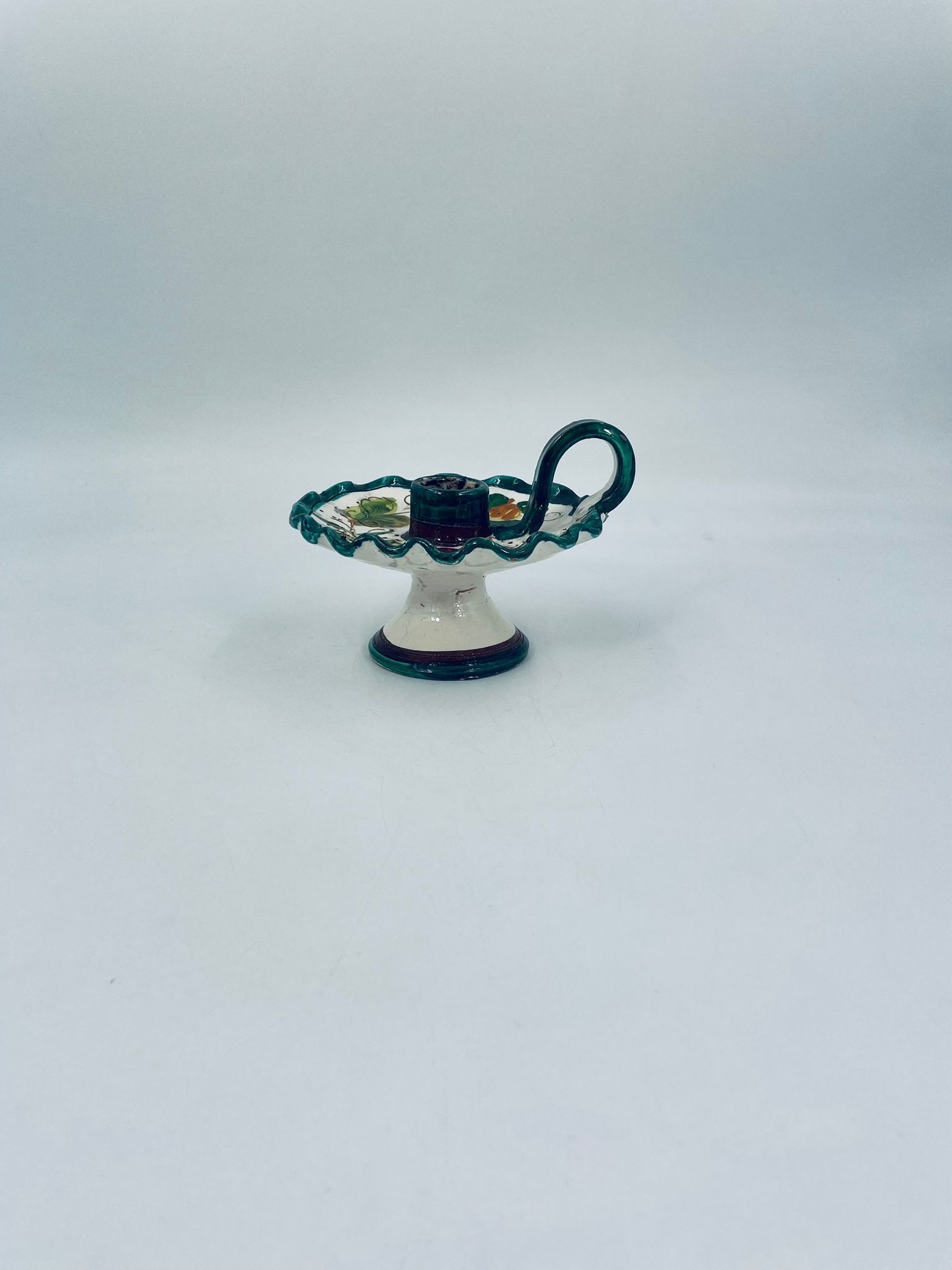 Świecznik z uchwytem, wykonany z Włoskiej mojaliki, ręcznie robiony i malowany. Charakteryzuje się zielonym falistym brzegiem, ozdobnym uchwytem oraz zdobieniami przedawniającymi liście i kwiaty w odcieniach, zieleni, pomarańczu i bordowego. Przedmiot służy do umieszczenia świecy, pełniąc również rolę użytkową jak i dekoracyjną. Świecznik posiada delikatne odpryski i pęknięcie.