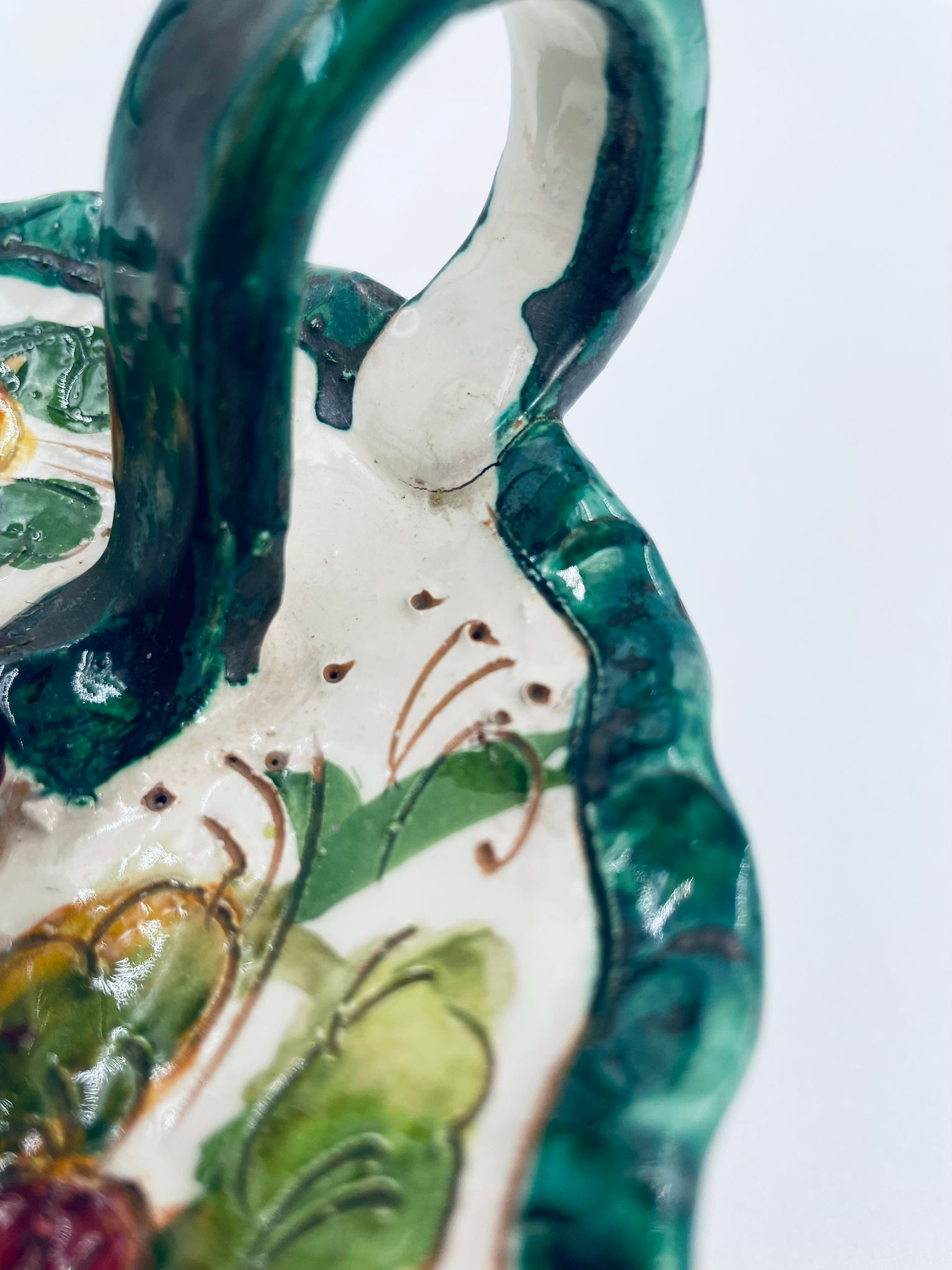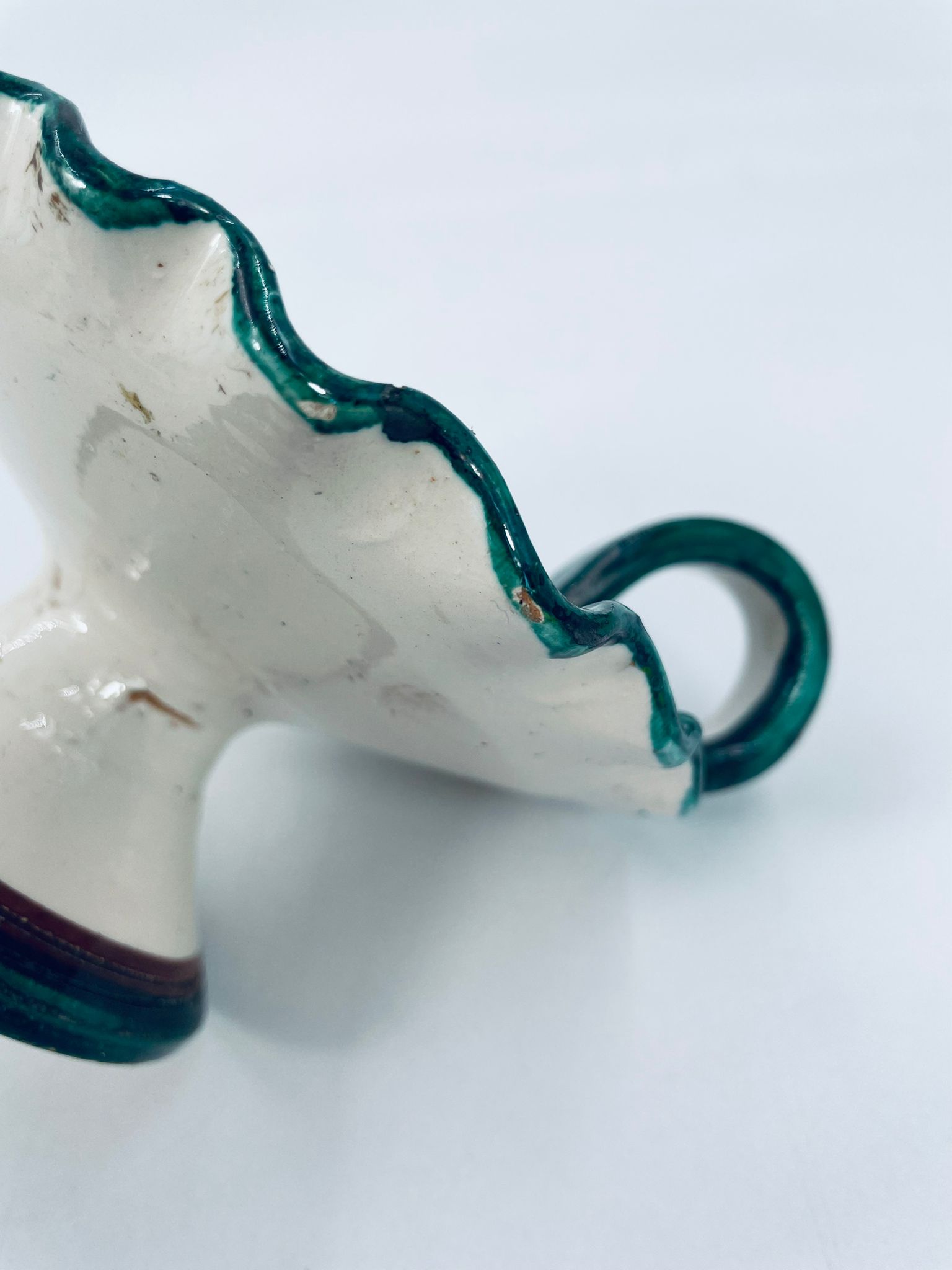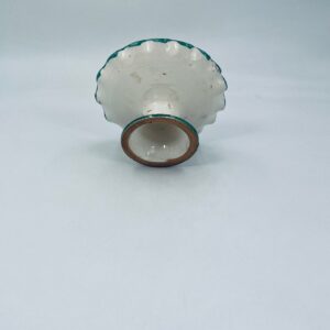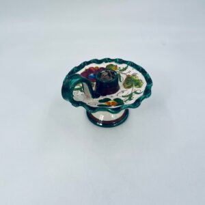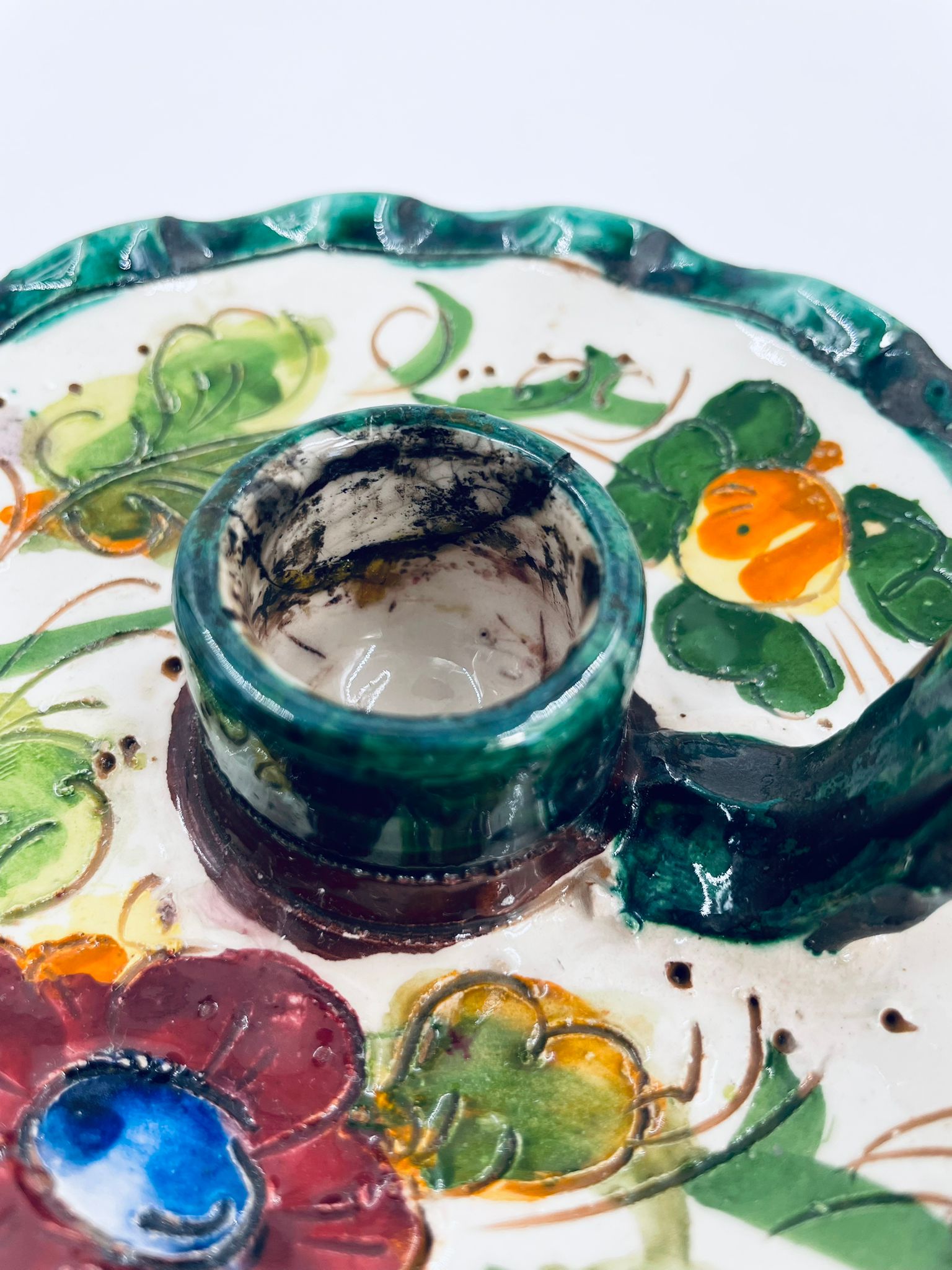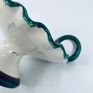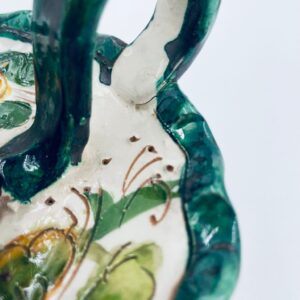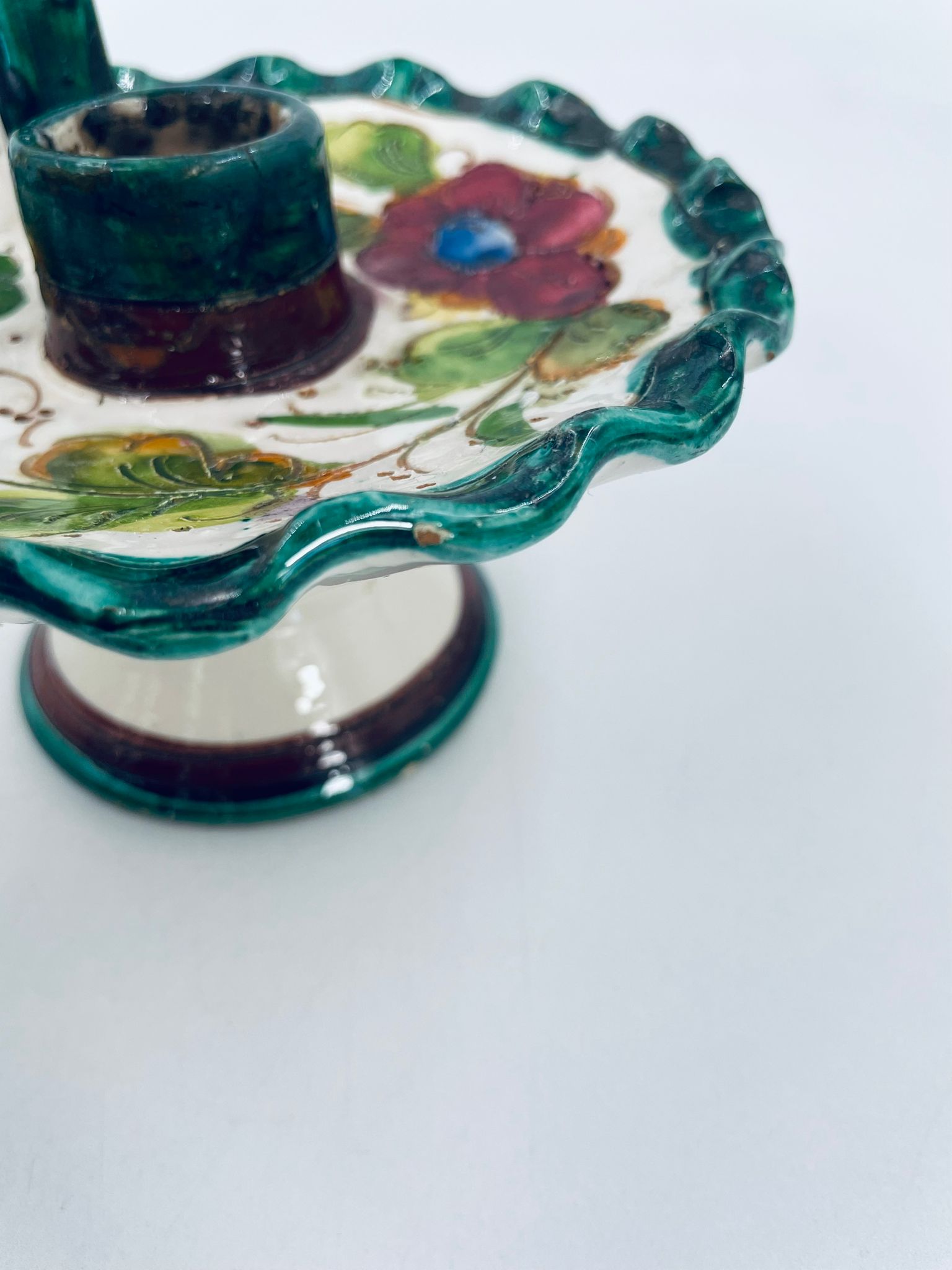 Świecznik z uchwytem, wykonany z Włoskiej mojaliki, ręcznie robiony i malowany. Charakteryzuje się zielonym falistym brzegiem, ozdobnym uchwytem oraz zdobieniami przedawniającymi liście i kwiaty w odcieniach, zieleni, pomarańczu i bordowego. Przedmiot służy do umieszczenia świecy, pełniąc również rolę użytkową jak i dekoracyjną. Świecznik posiada delikatne odpryski i pęknięcie.