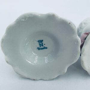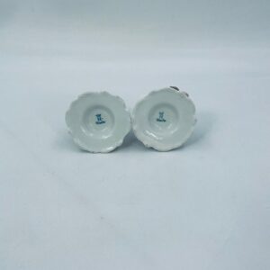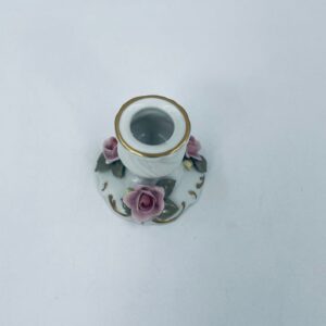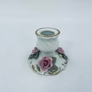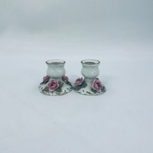 Zestaw świeczników w stylu Vintage Dresden, wykonane z wysokiej jakości białej porcelany. Świeczniki bogato zdobione formowanymi różowymi różami oraz złotymi akcentami i reliefami w górnej części.