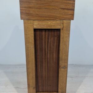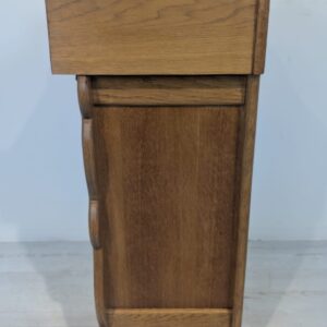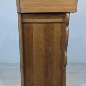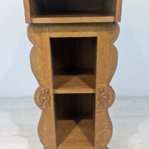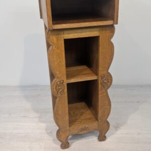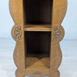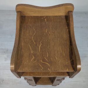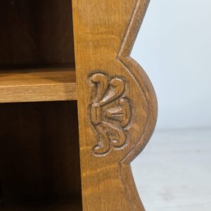 Solidna, ręcznie rzeźbiona, drewniana szafka z litego dębu. Posiada trzy otwarte półki, które mogą służyć do przechowywania różnych przedmiotów. Szafka ma elegancki, zabytkowy wygląd, który pasuje do wielu stylów wnętrz.