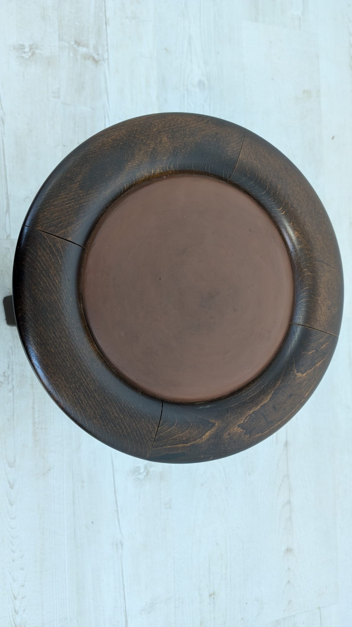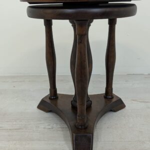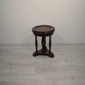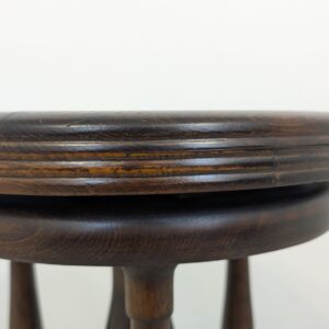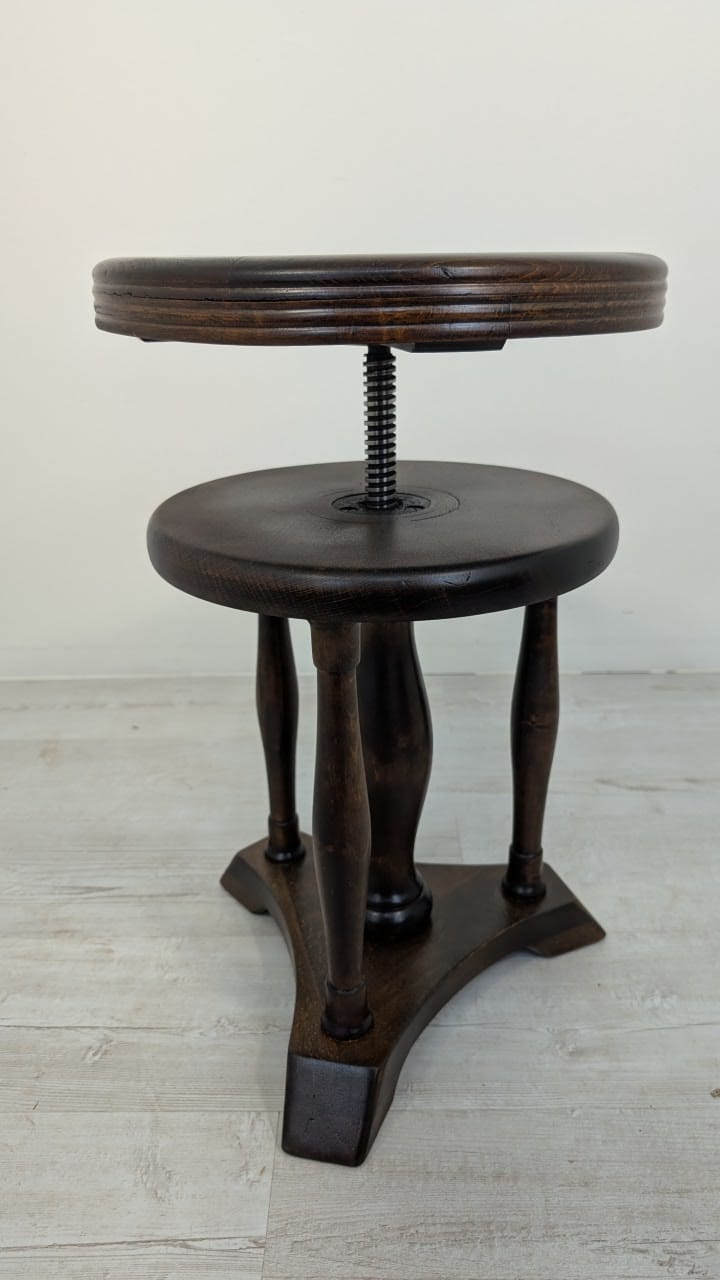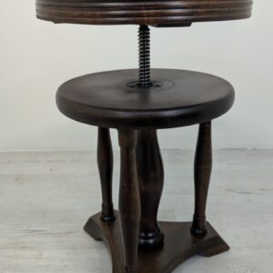 Drewniany, klasyczny obrotowy stołek do pianina w ciemnym kolorze. Posiada okrągłe siedzisko i nogi w stylu vintage. Może służyć jako praktyczny mebel do ćwiczeń muzycznych lub jako dekoracyjny dodatek do wnętrza.