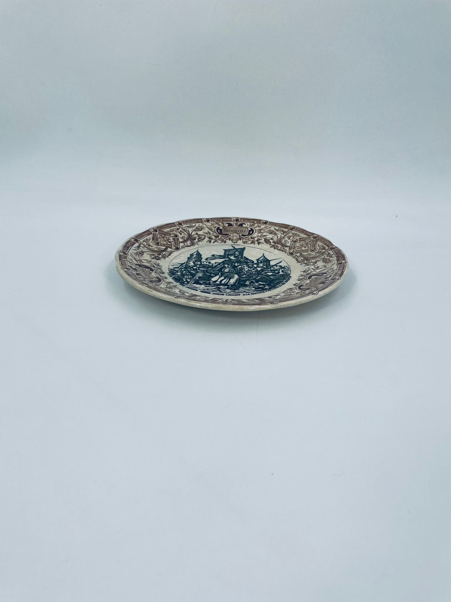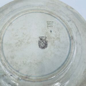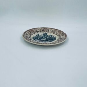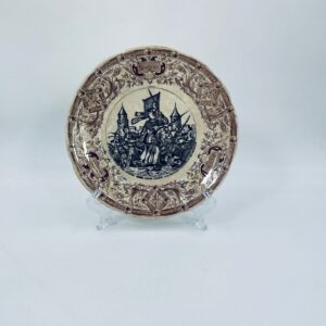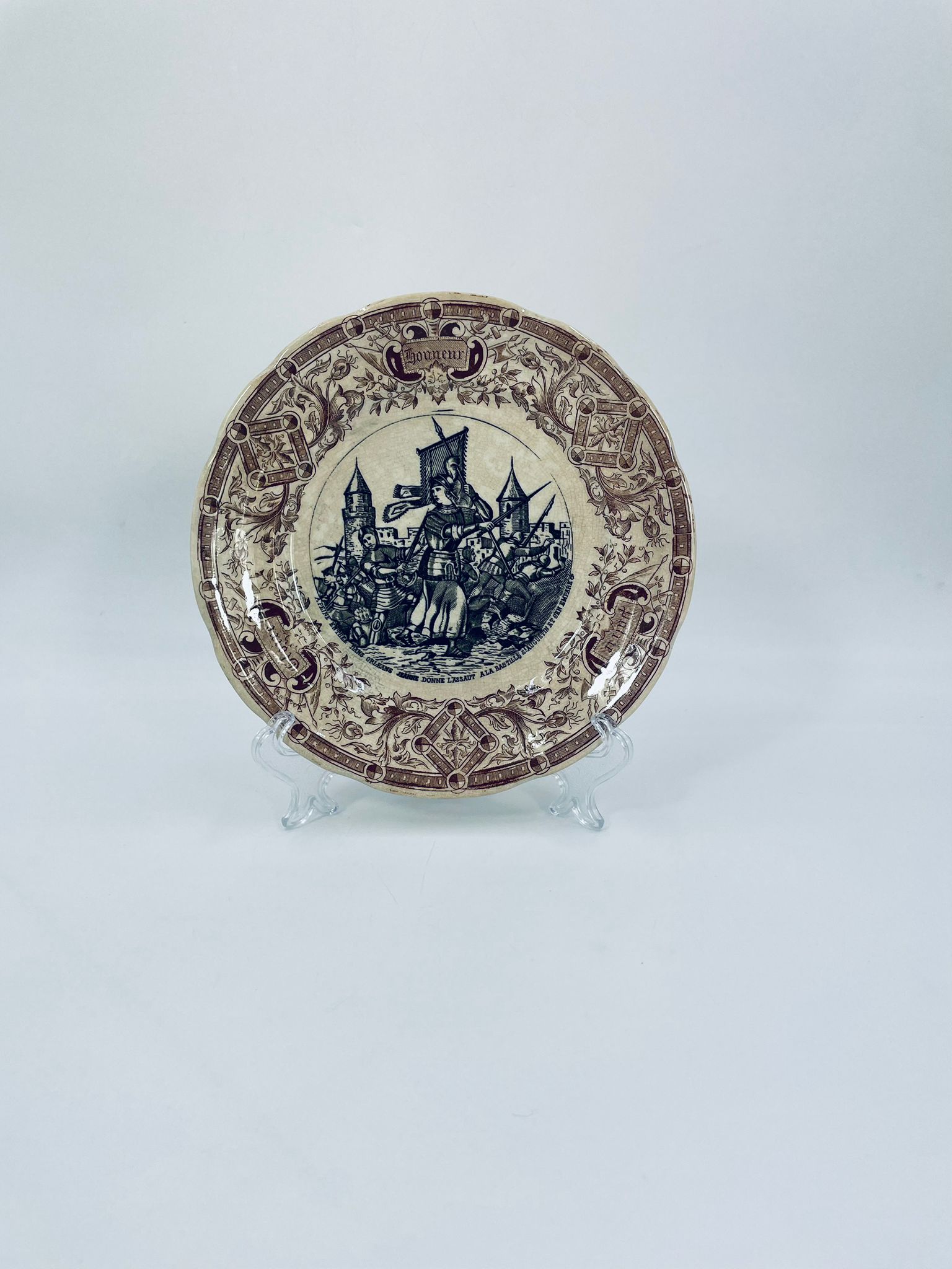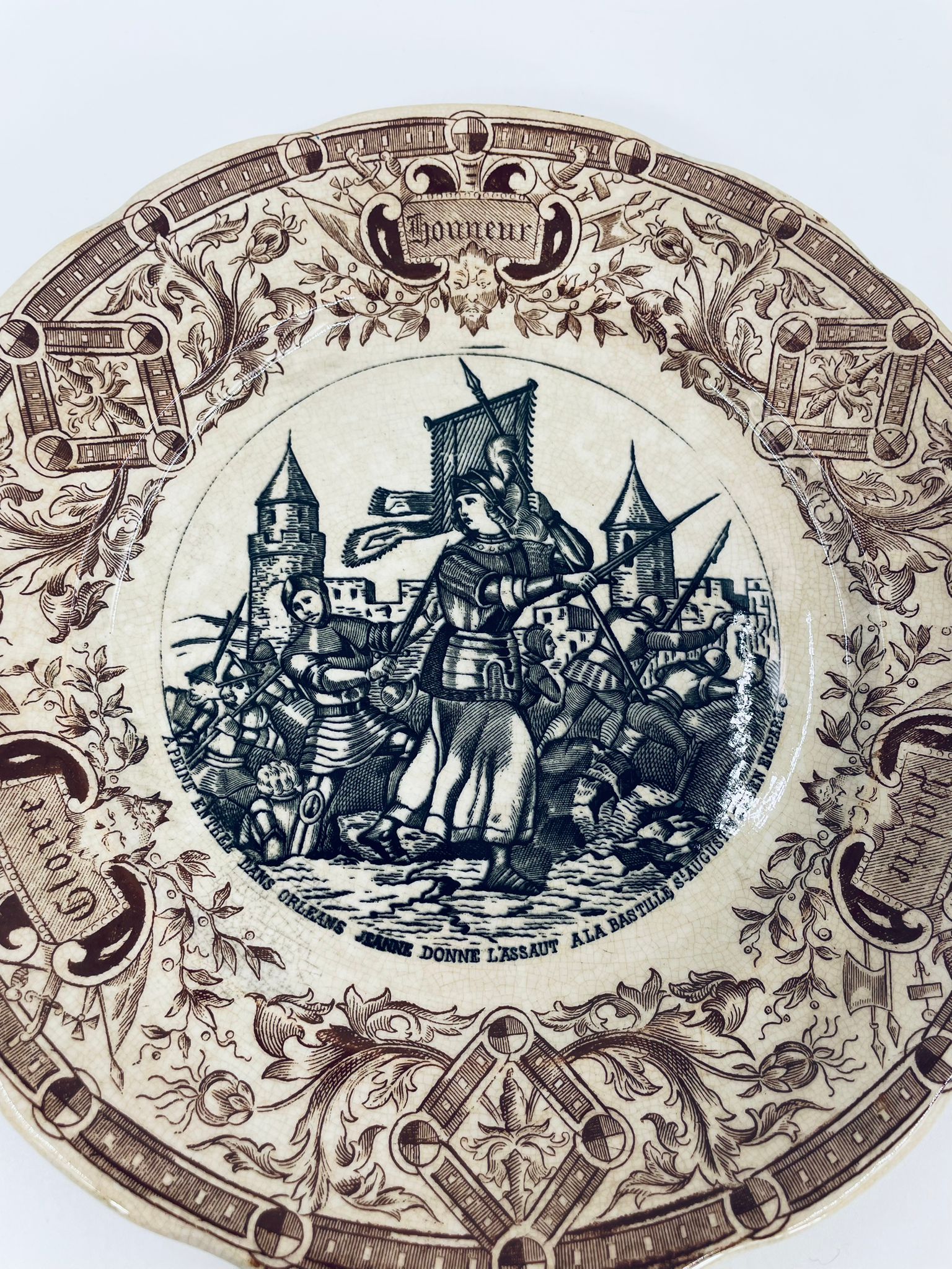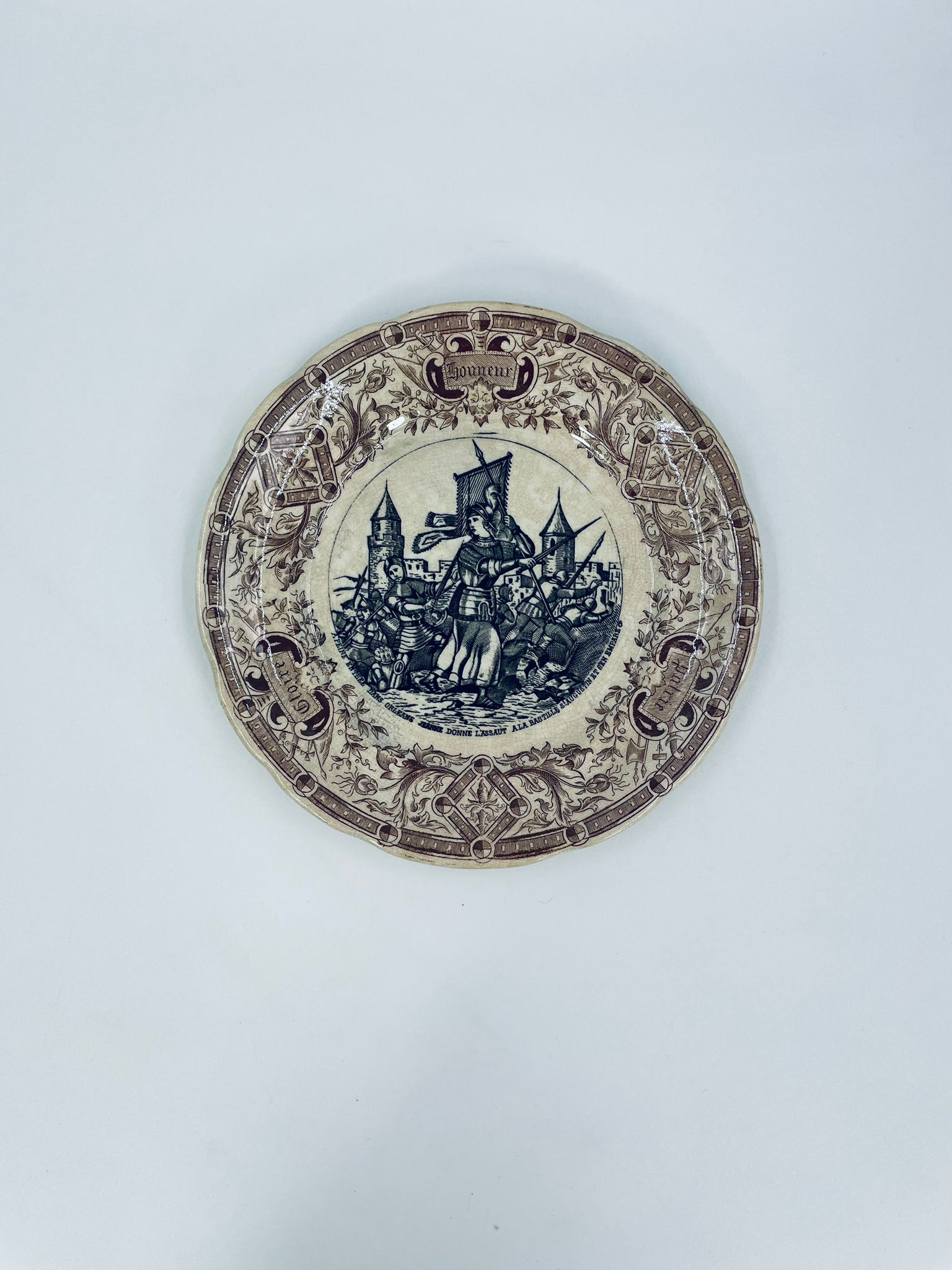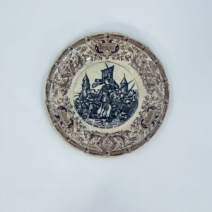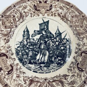 Antyczny talerz kolekcjonerski francuskiej wytwórni Digoin Sarreguemines, wykonany z ceramiki. Talerz z serii Jeanne d’Arc. Wzór na talerzu przedstawia scenę Joanny d’Arc w zbroi, prowadzącą żołnierzy do ataku na miasto. Talerz wykończony jest brązowym wzorem ornamentalnym, który ma charakter roślinny i geometryczny. Posiada pęknięcie szkliwa i przebarwienie.