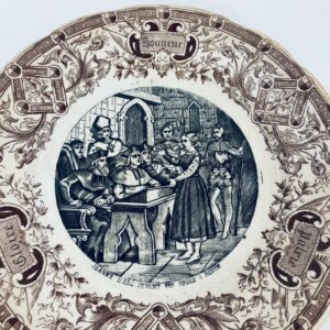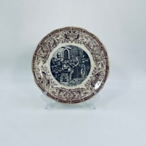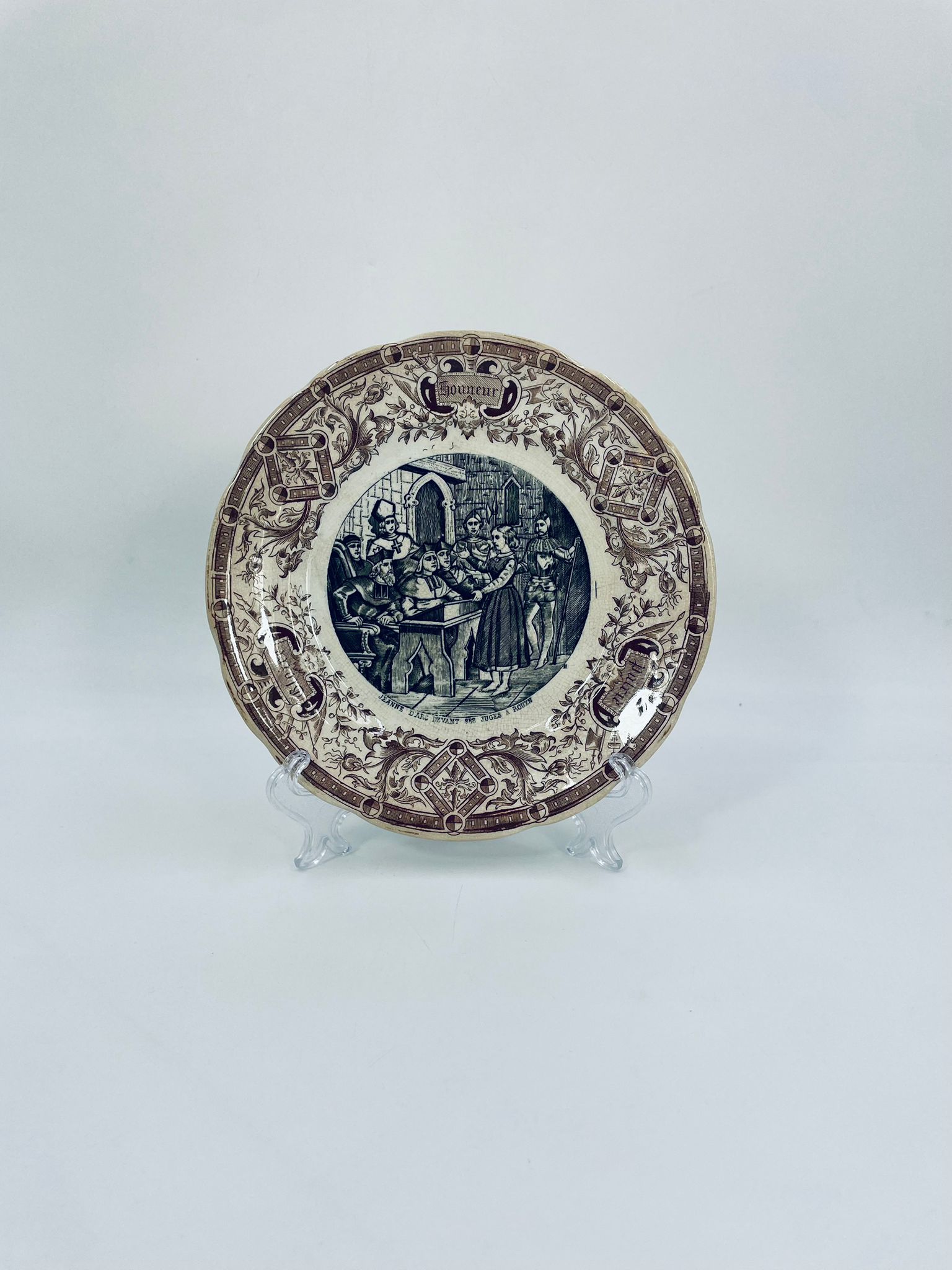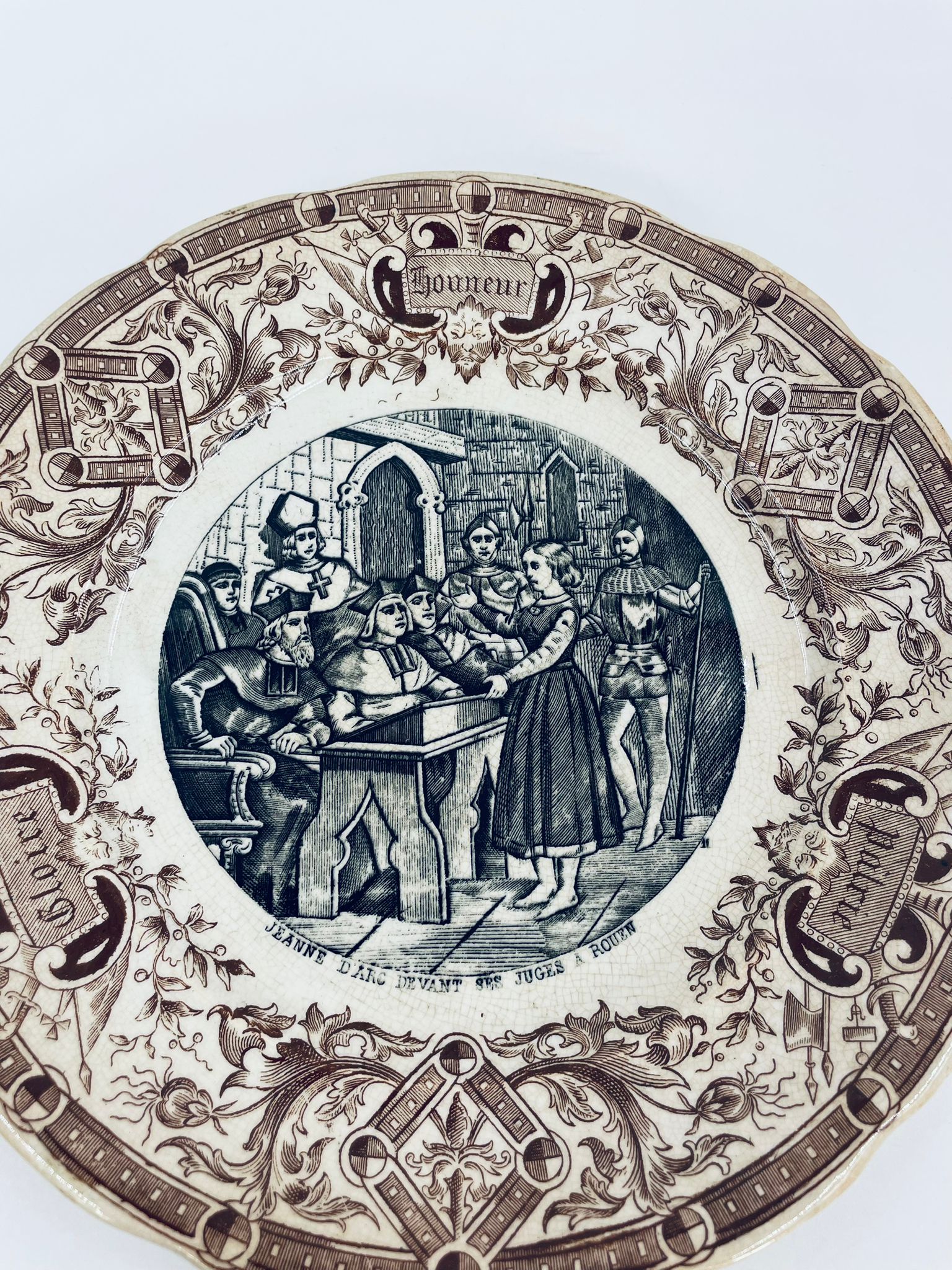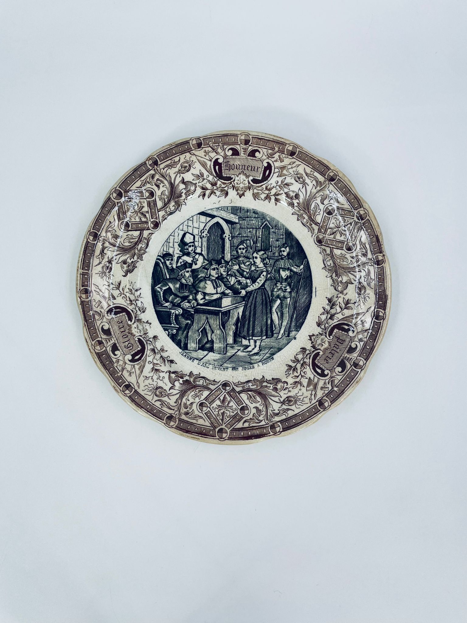 Antyczny talerz kolekcjonerski francuskiej wytwórni Digoin Sarreguemines, wykonany z ceramiki. Talerz z serii Jeanne d’Arc. Wzór na talerzu przedstawia scenę z procesu Joanny d’Arc, który odbył się w Rouen w 1431r. Talerz wykończony jest brązowym wzorem ornamentalnym, który ma charakter roślinny i geometryczny. Posiada pęknięcie szkliwa i przebarwienie.