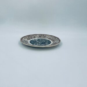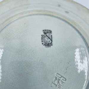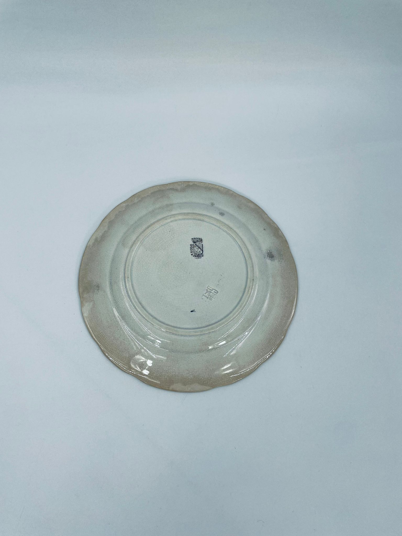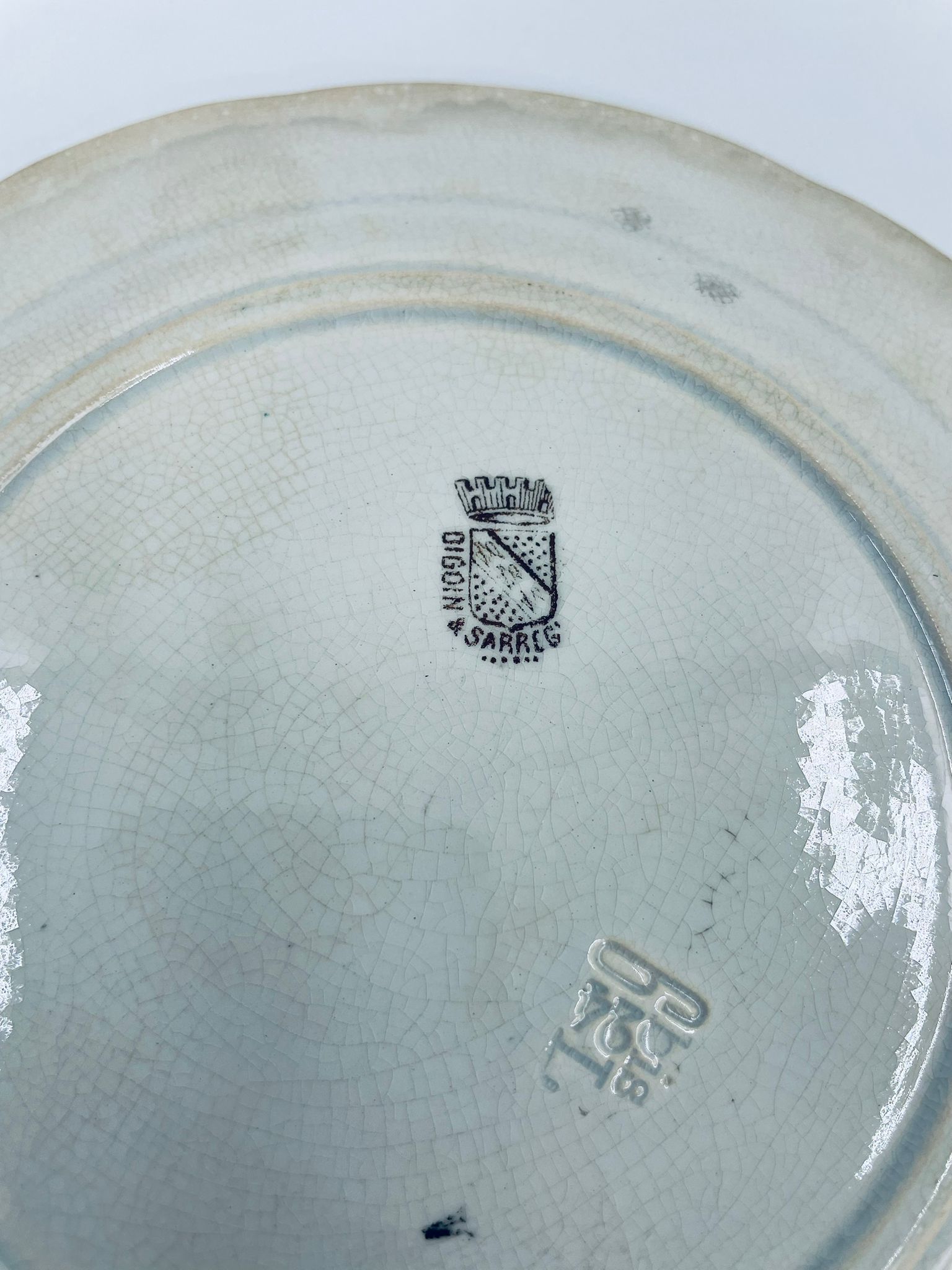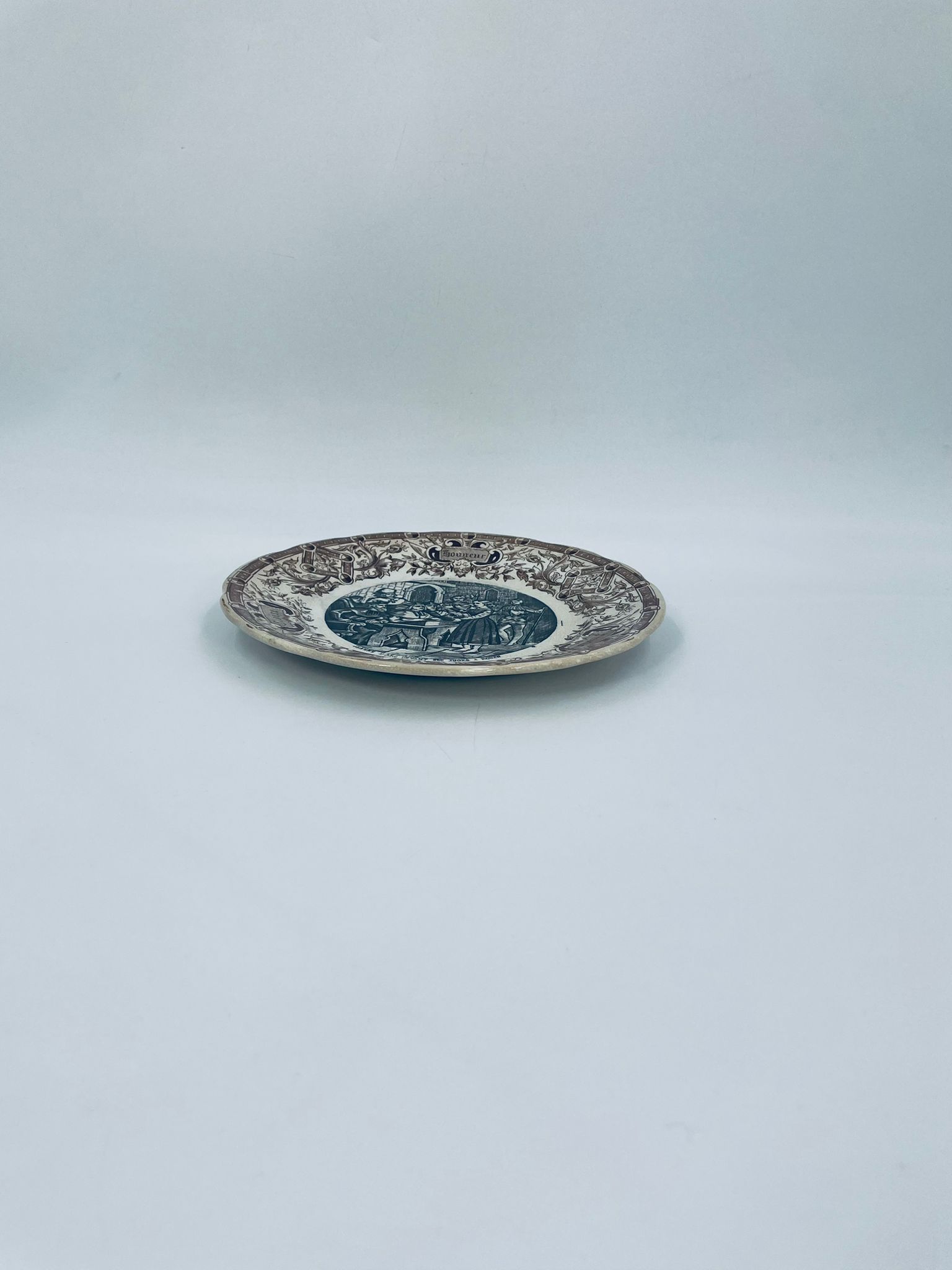 Antyczny talerz kolekcjonerski francuskiej wytwórni Digoin Sarreguemines, wykonany z ceramiki. Talerz z serii Jeanne d’Arc. Wzór na talerzu przedstawia scenę z procesu Joanny d’Arc, który odbył się w Rouen w 1431r. Talerz wykończony jest brązowym wzorem ornamentalnym, który ma charakter roślinny i geometryczny. Posiada pęknięcie szkliwa i przebarwienie.