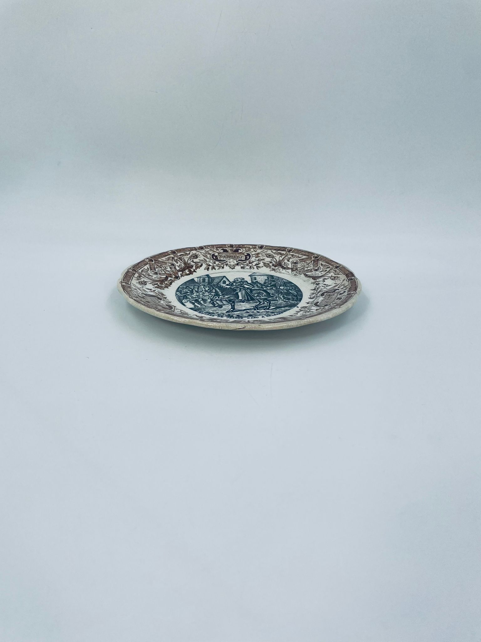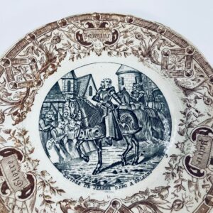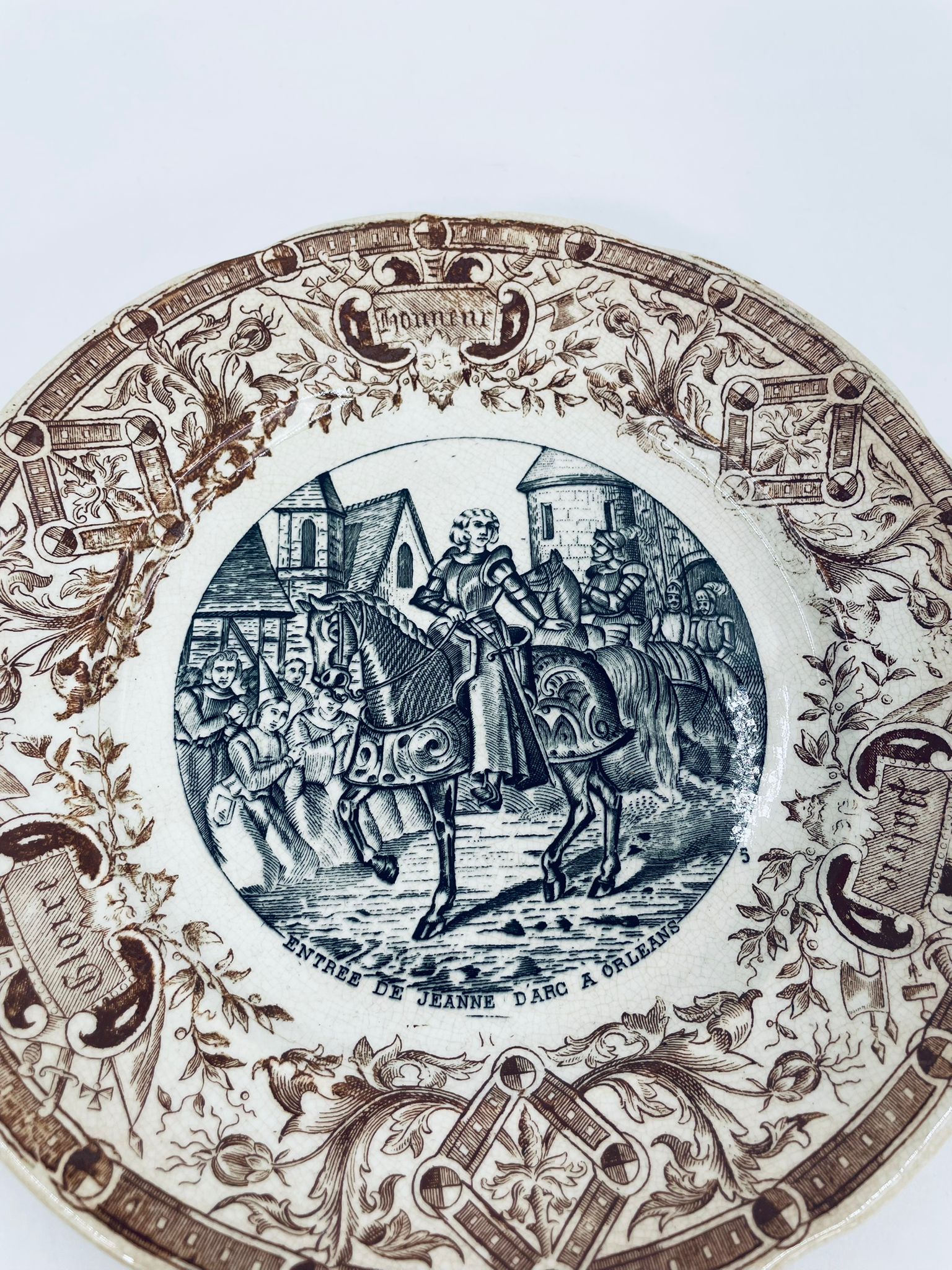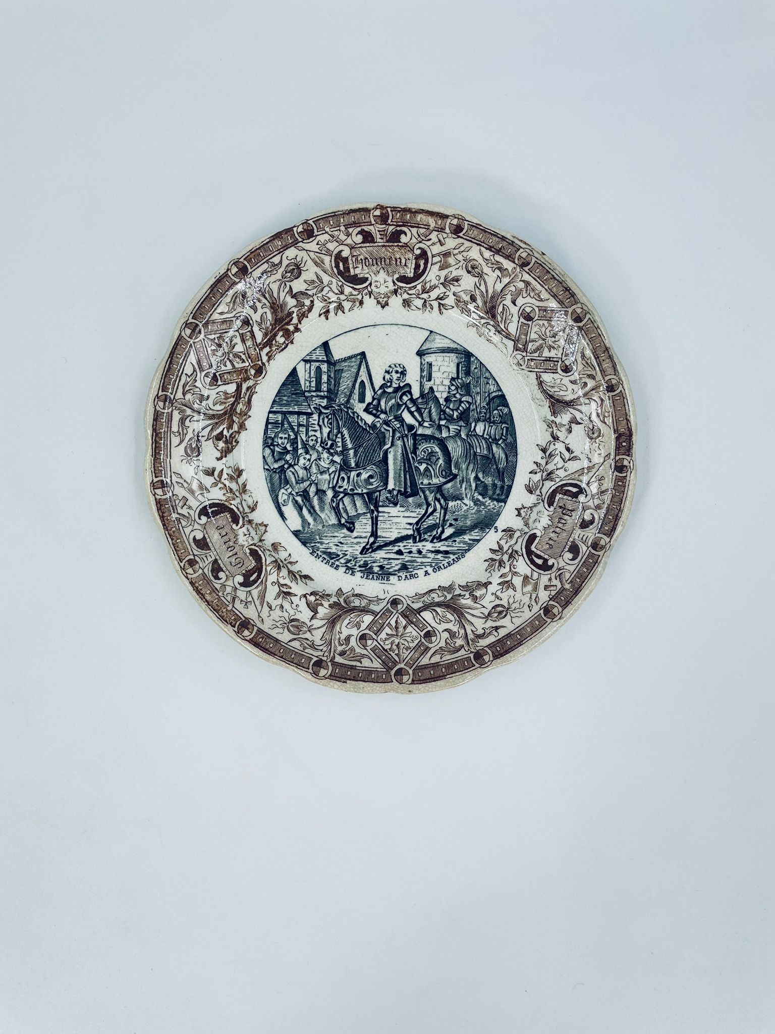 Antyczny talerz kolekcjonerski francuskiej wytwórni Digoin Sarreguemines, wykonany z ceramiki. Talerz z serii Jeanne d’Arc. Wzór na talerzu przedstawia scenę Joanny d’arc wjeżdżającej do Orleanu. Talerz wykończony jest brązowym wzorem ornamentalnym, który ma charakter roślinny i geometryczny. Posiada pęknięcie szkliwa i przebarwienie.