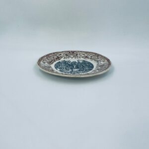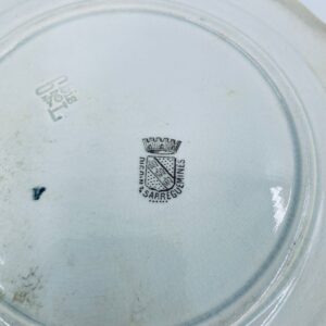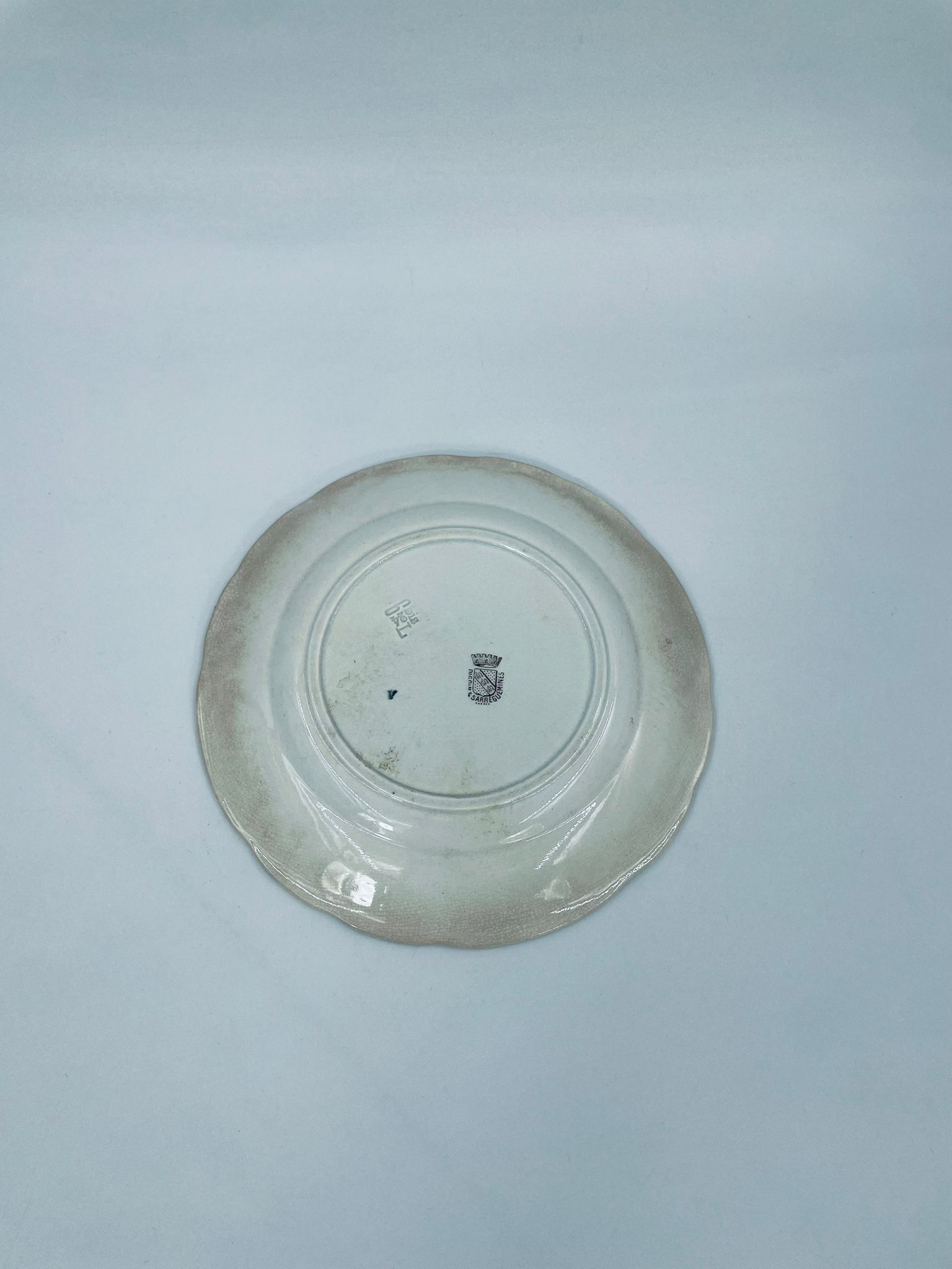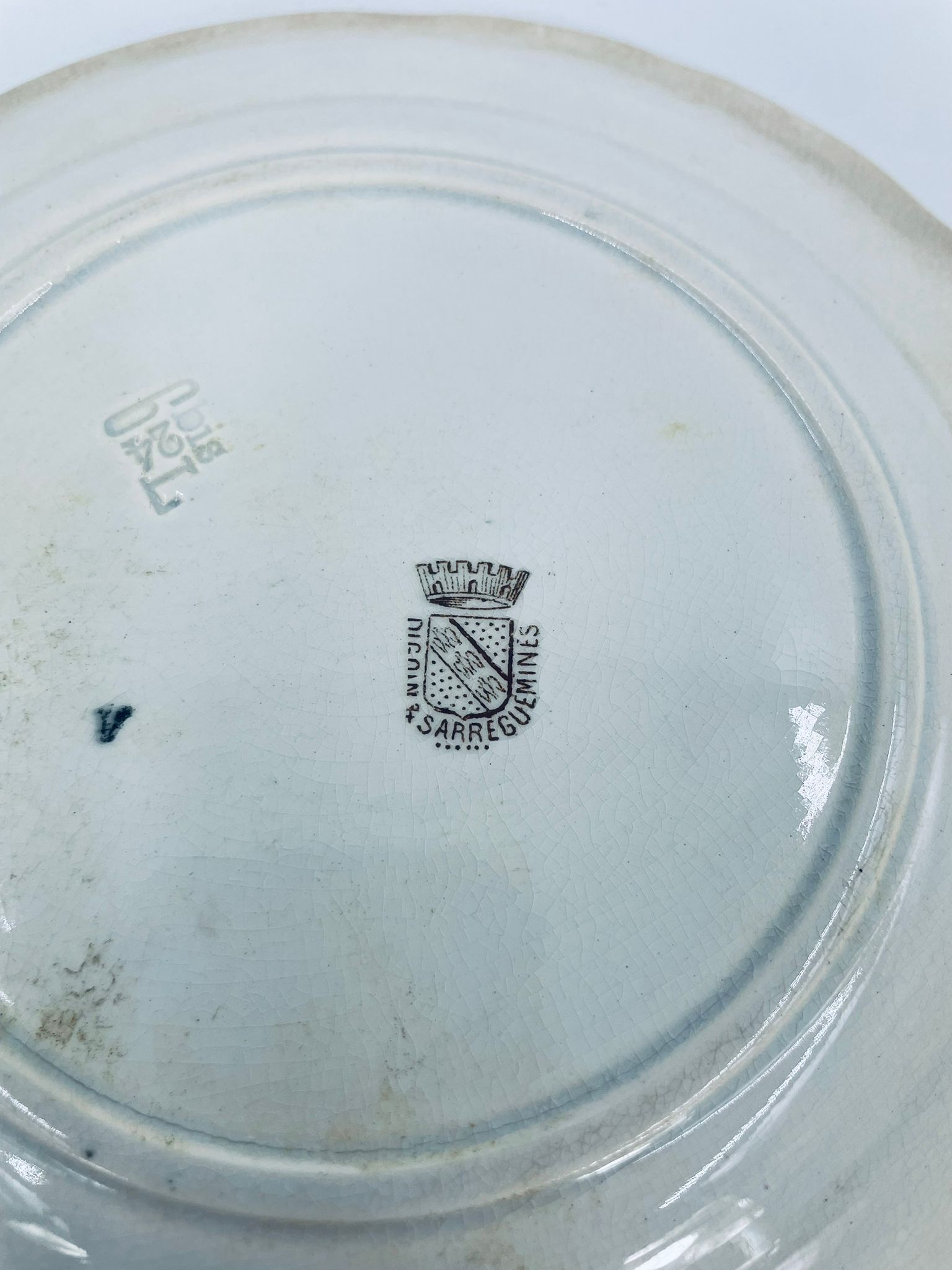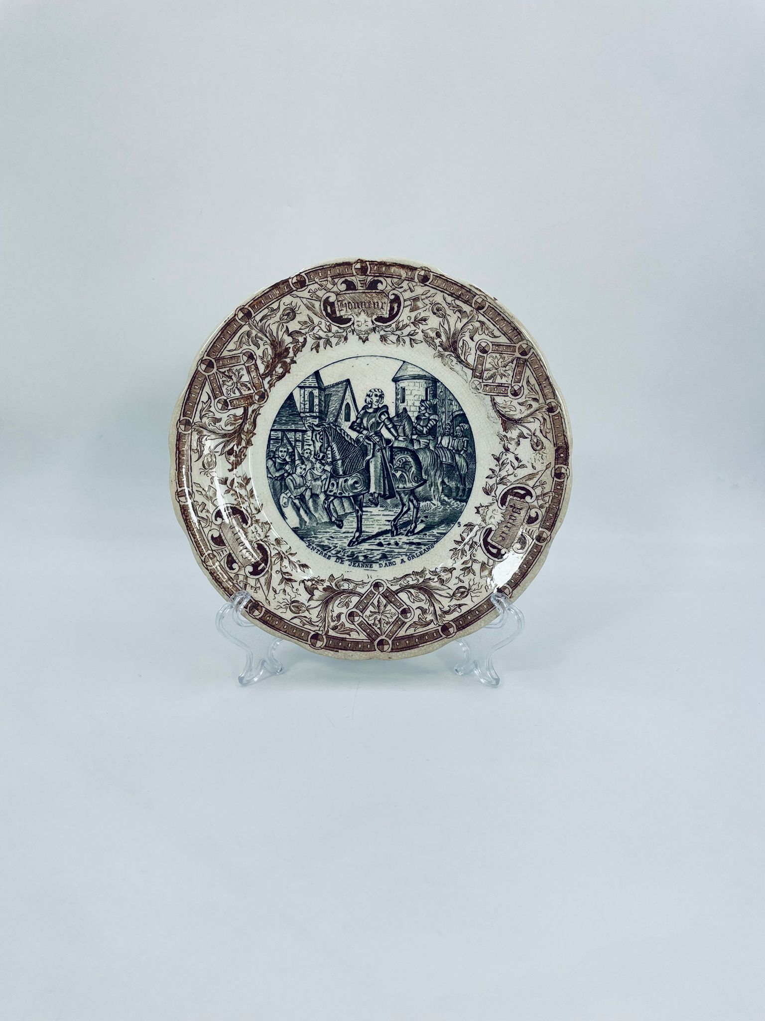 Antyczny talerz kolekcjonerski francuskiej wytwórni Digoin Sarreguemines, wykonany z ceramiki. Talerz z serii Jeanne d’Arc. Wzór na talerzu przedstawia scenę Joanny d’arc wjeżdżającej do Orleanu. Talerz wykończony jest brązowym wzorem ornamentalnym, który ma charakter roślinny i geometryczny. Posiada pęknięcie szkliwa i przebarwienie.