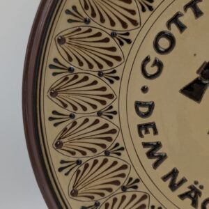 Ceramiczna talerz z emblematem straży pożarnej A-9 z lat 1900-1920. Przedmiot jest w stanie używanym, ale dobrze zachowany. Unikatowy element kolekcjonerski związany z historią straży pożarnej.