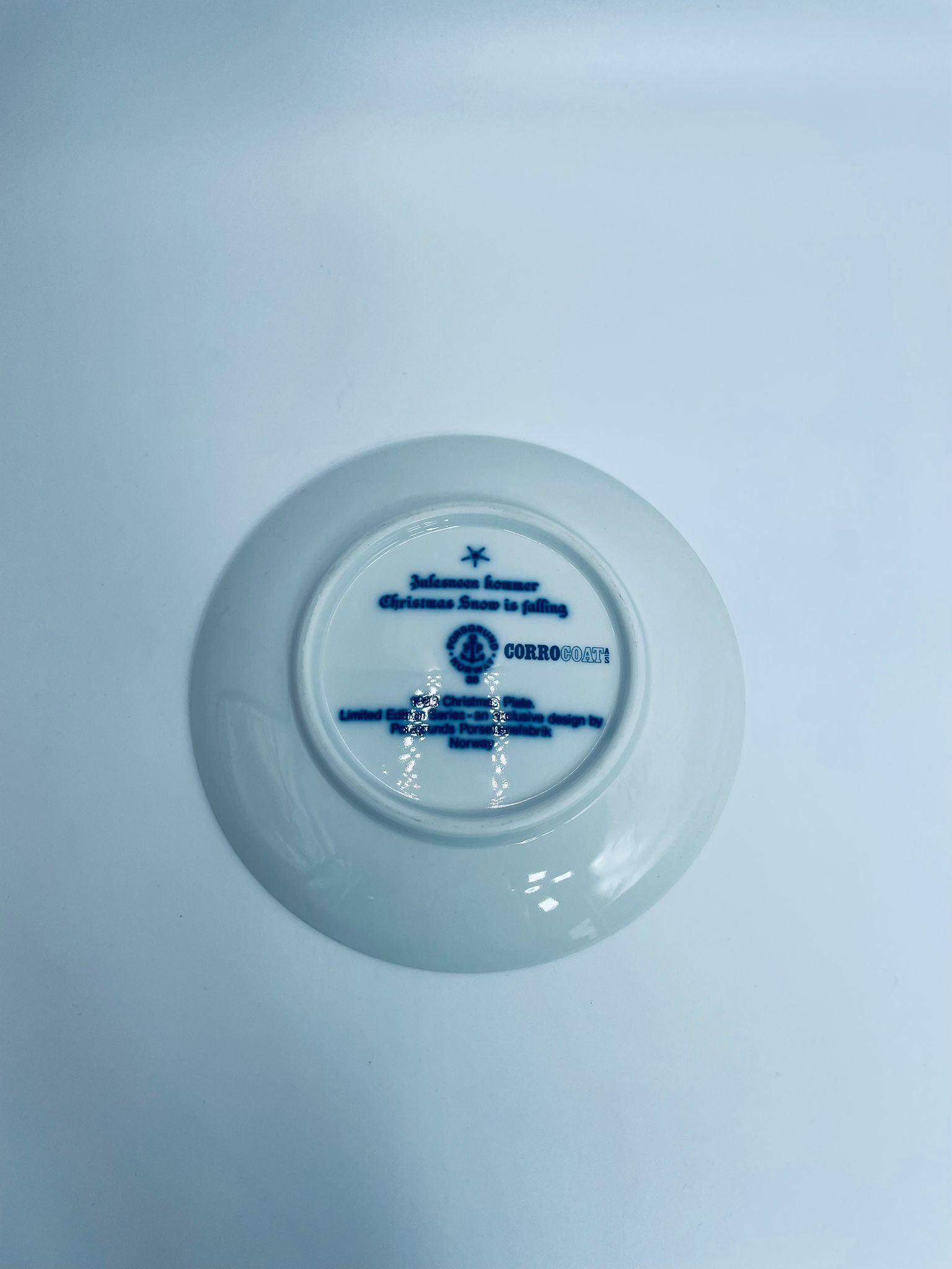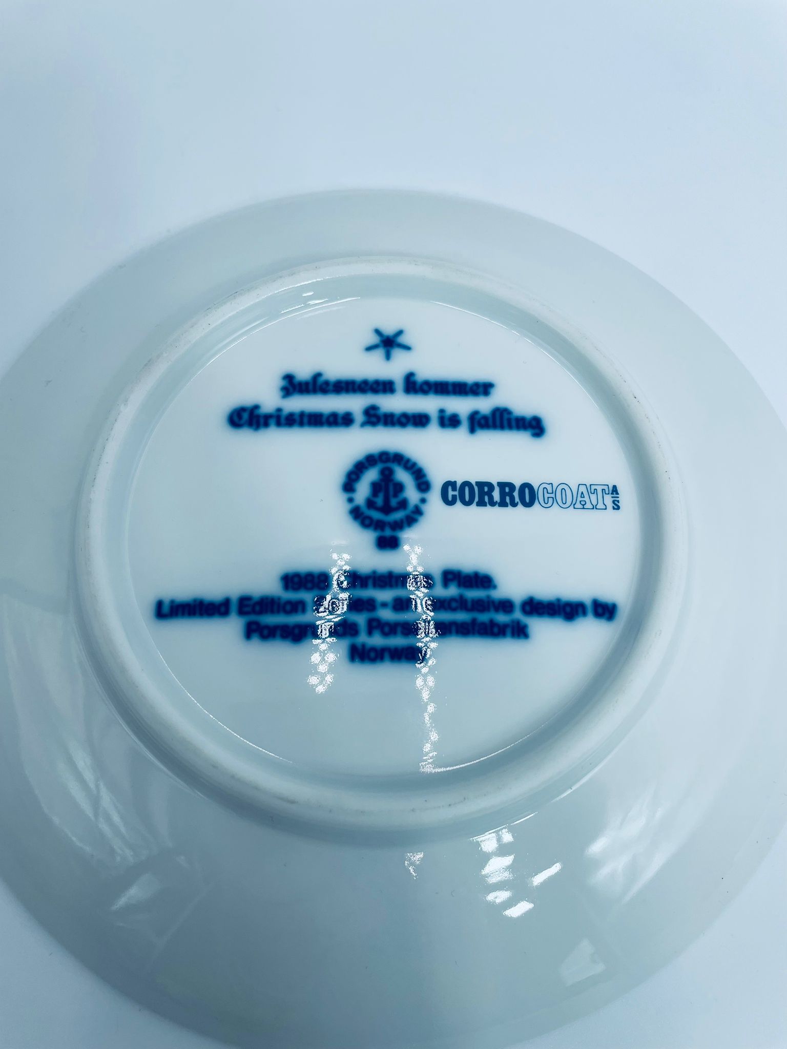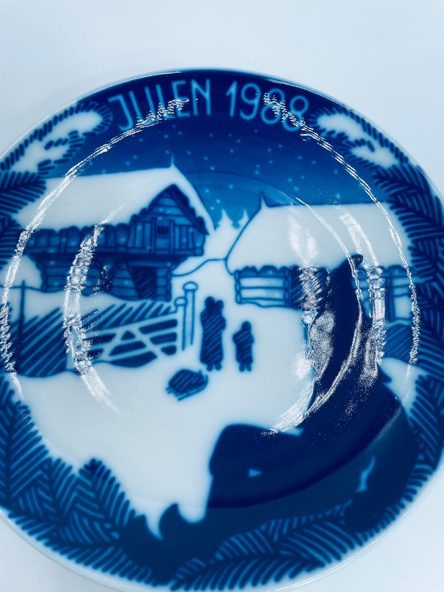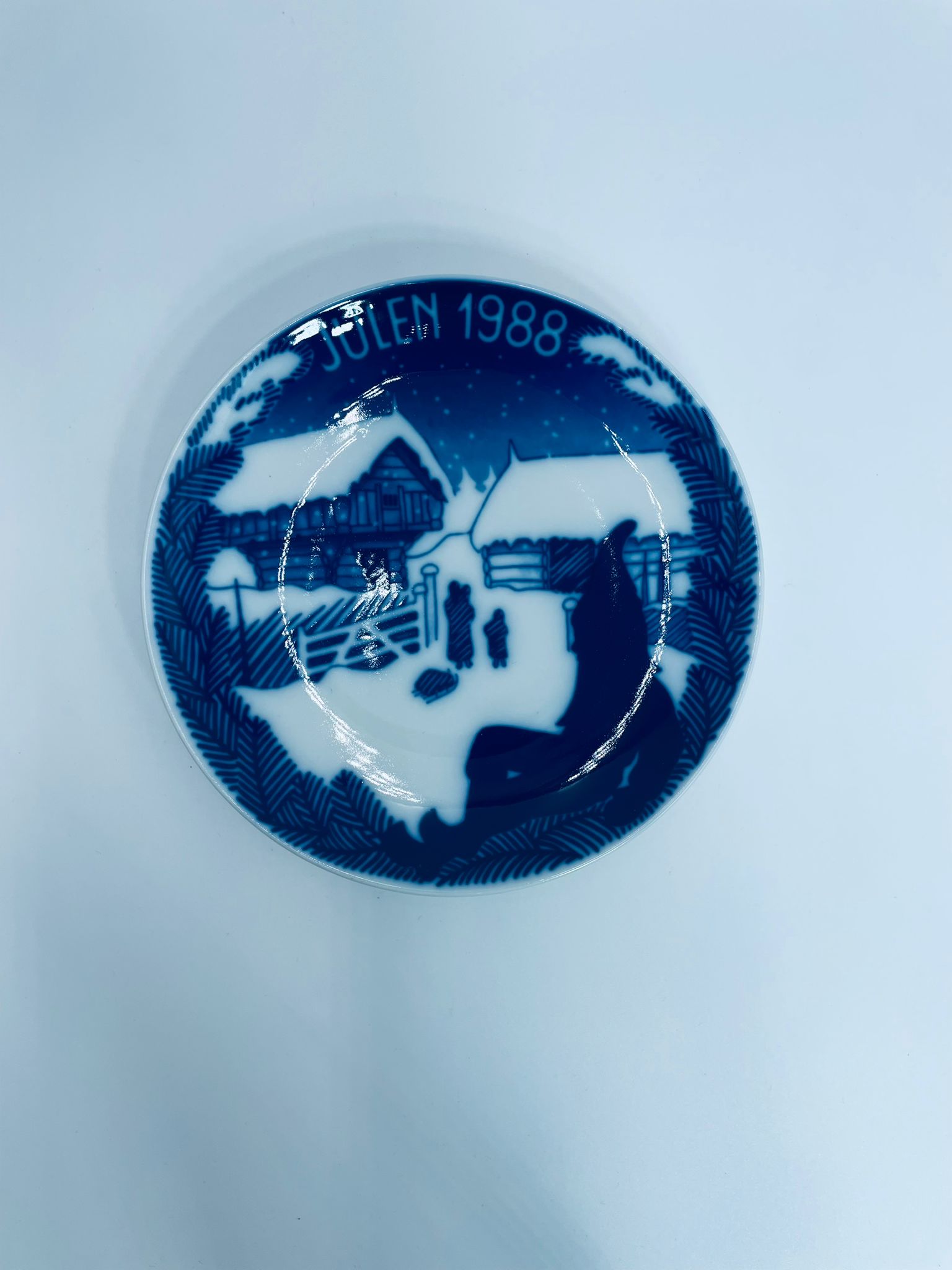 Talerz dekoracyjny Porsgrund 1988r. zaprojektowany jest przez Gunnera Bratliego. Talerz porcelanowy, w kolorze biało granatowym przedstawiający zimową scene z zabudowaniami gospodarskimi, matką z dwójką dzieci. Talerz charakterystyczny dla Norweskiej tradycji.