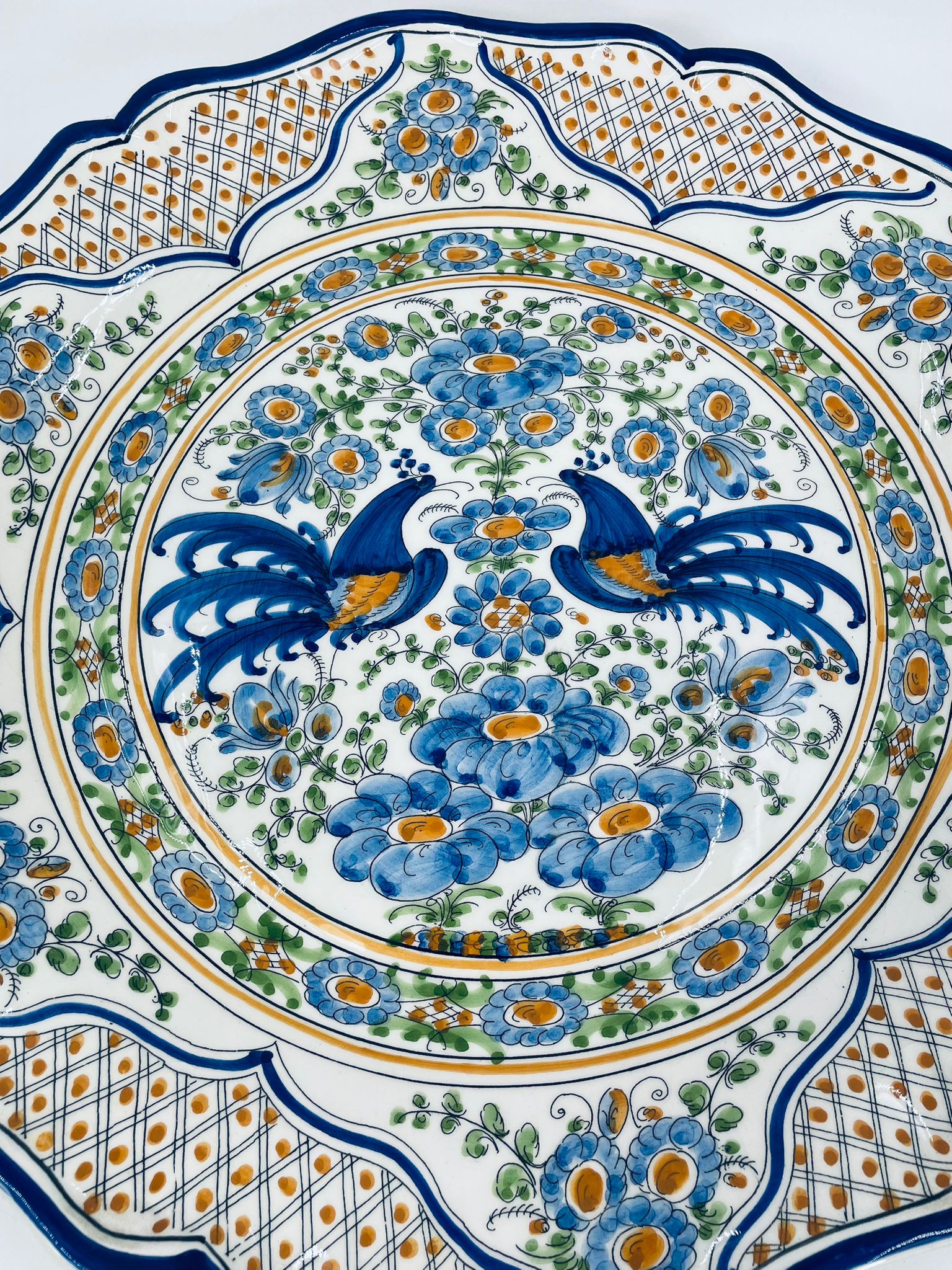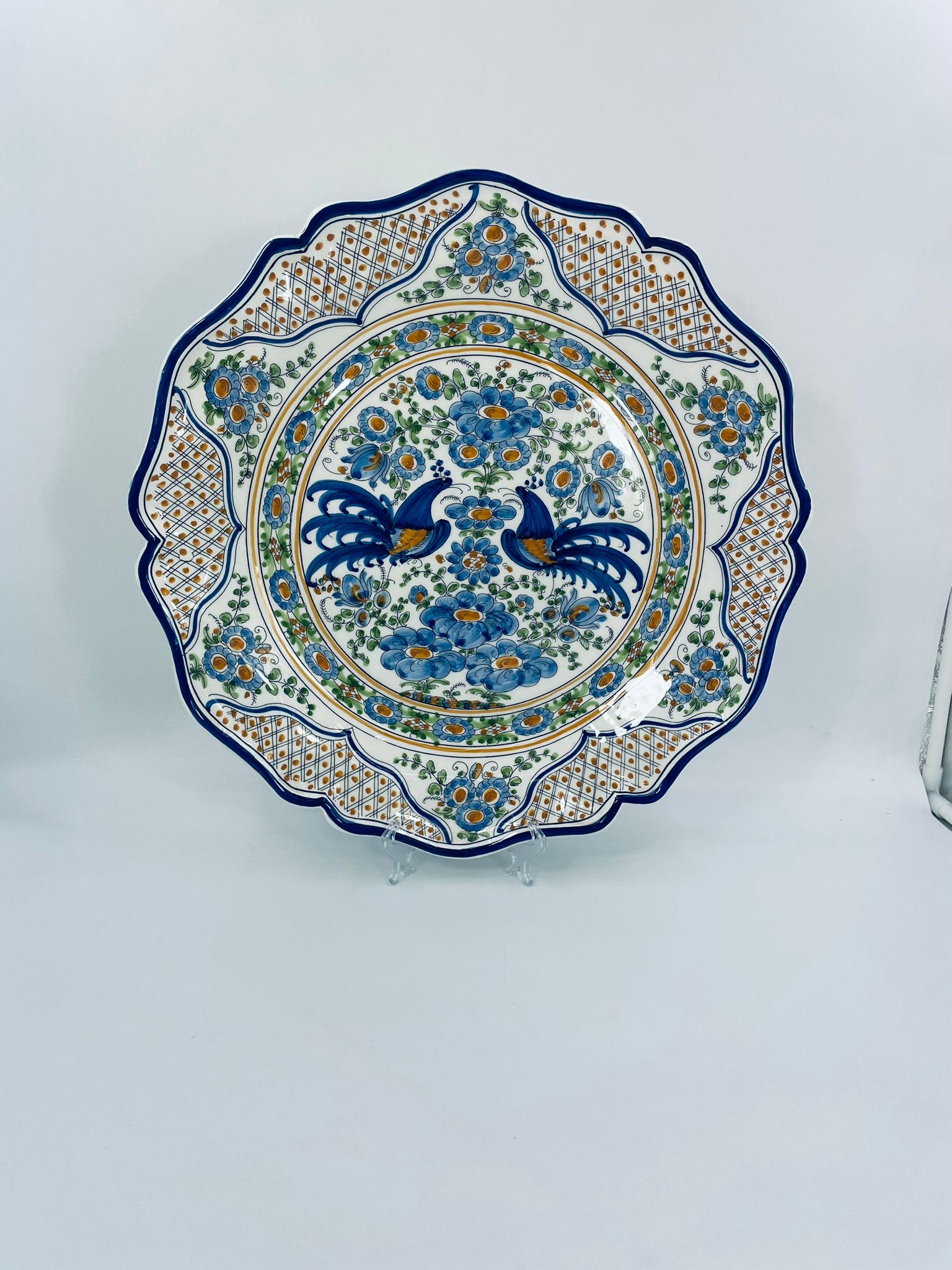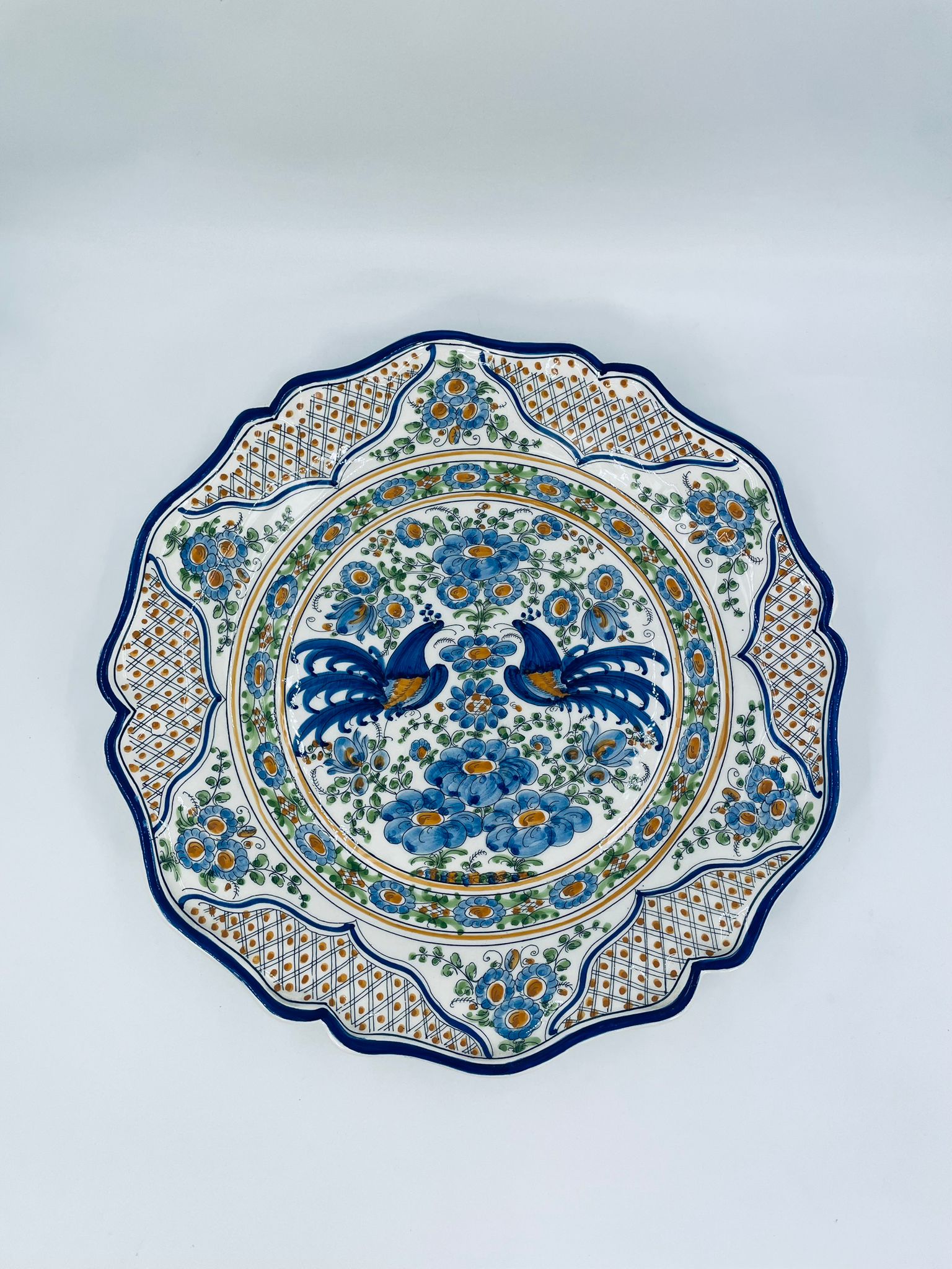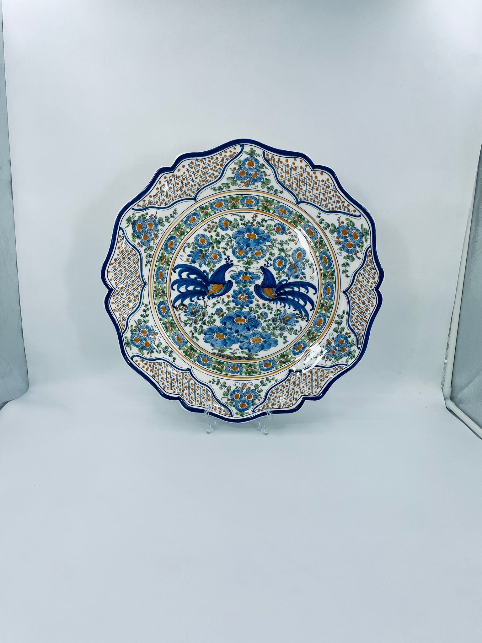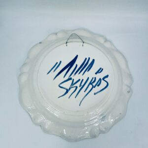 Talerz dekoracyjny wykonana przez artystę Skyrosa , wykonany z Włoskiej Majoliki. Duży talerz ekstremalnie malowany i ozdobiony stylizowanymi pawiami, otoczony wzorem kwiatowym i geometrycznym, wykończony kolorem ciemnoniebieskim na falistej krawędzi. Talerz przeznaczony jest do ekspozycji na ścianie. Posiada mały uszczerbek, przetarcie oraz pęknięcie szkliwa.