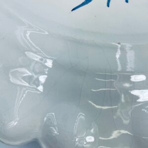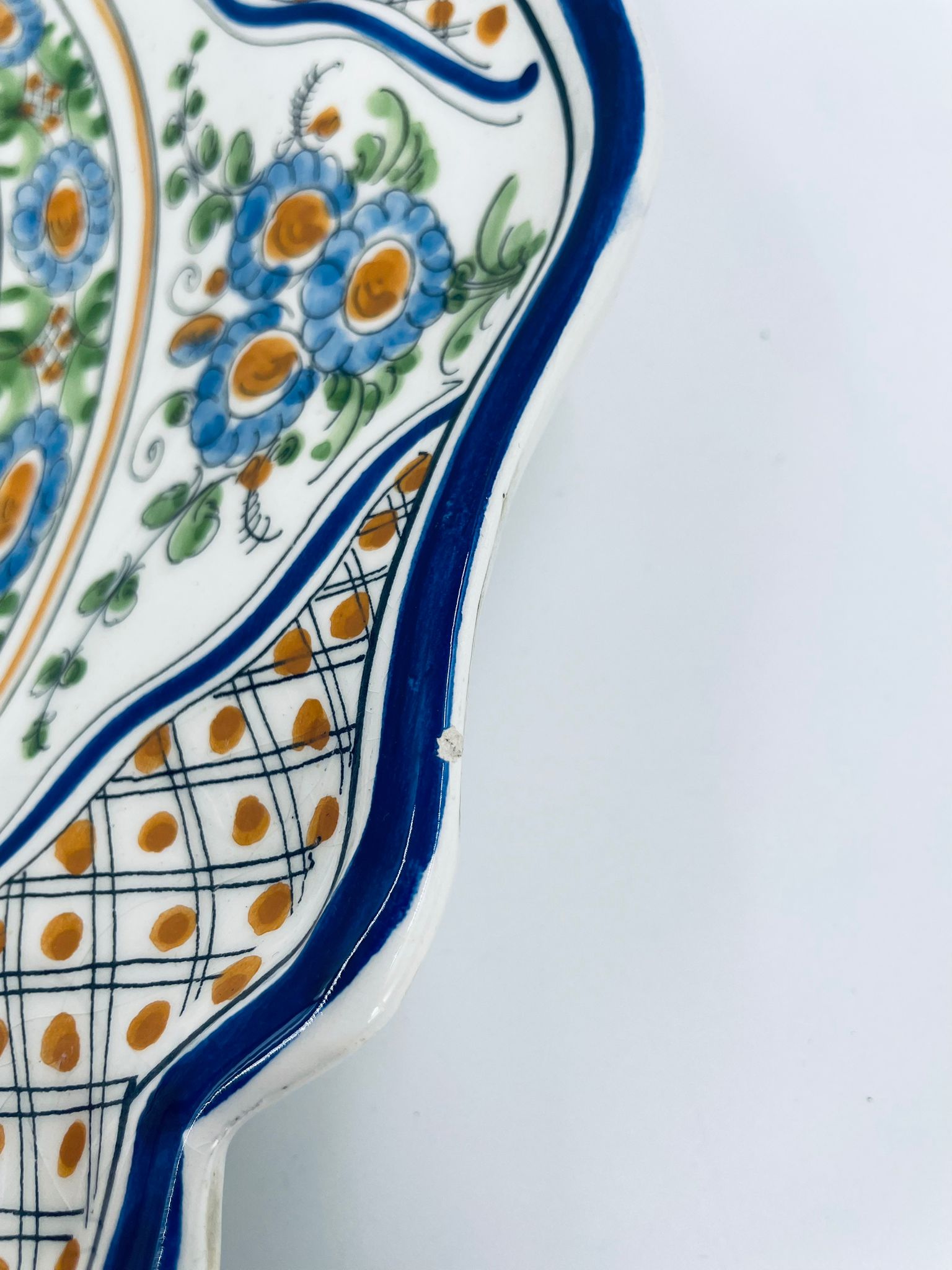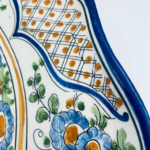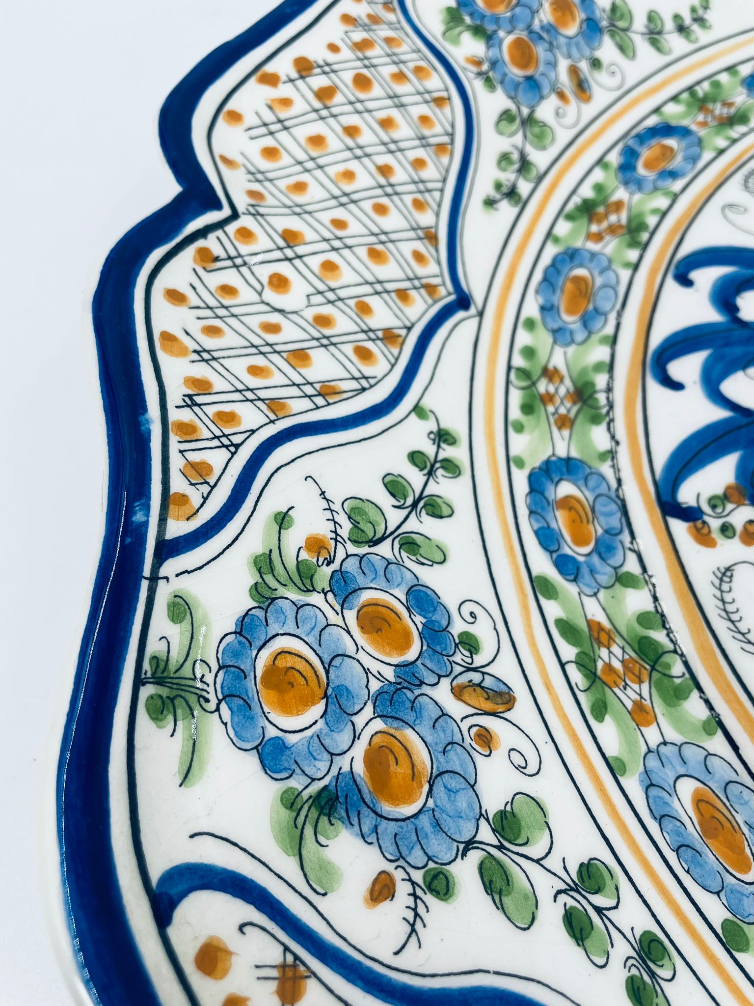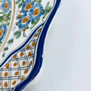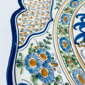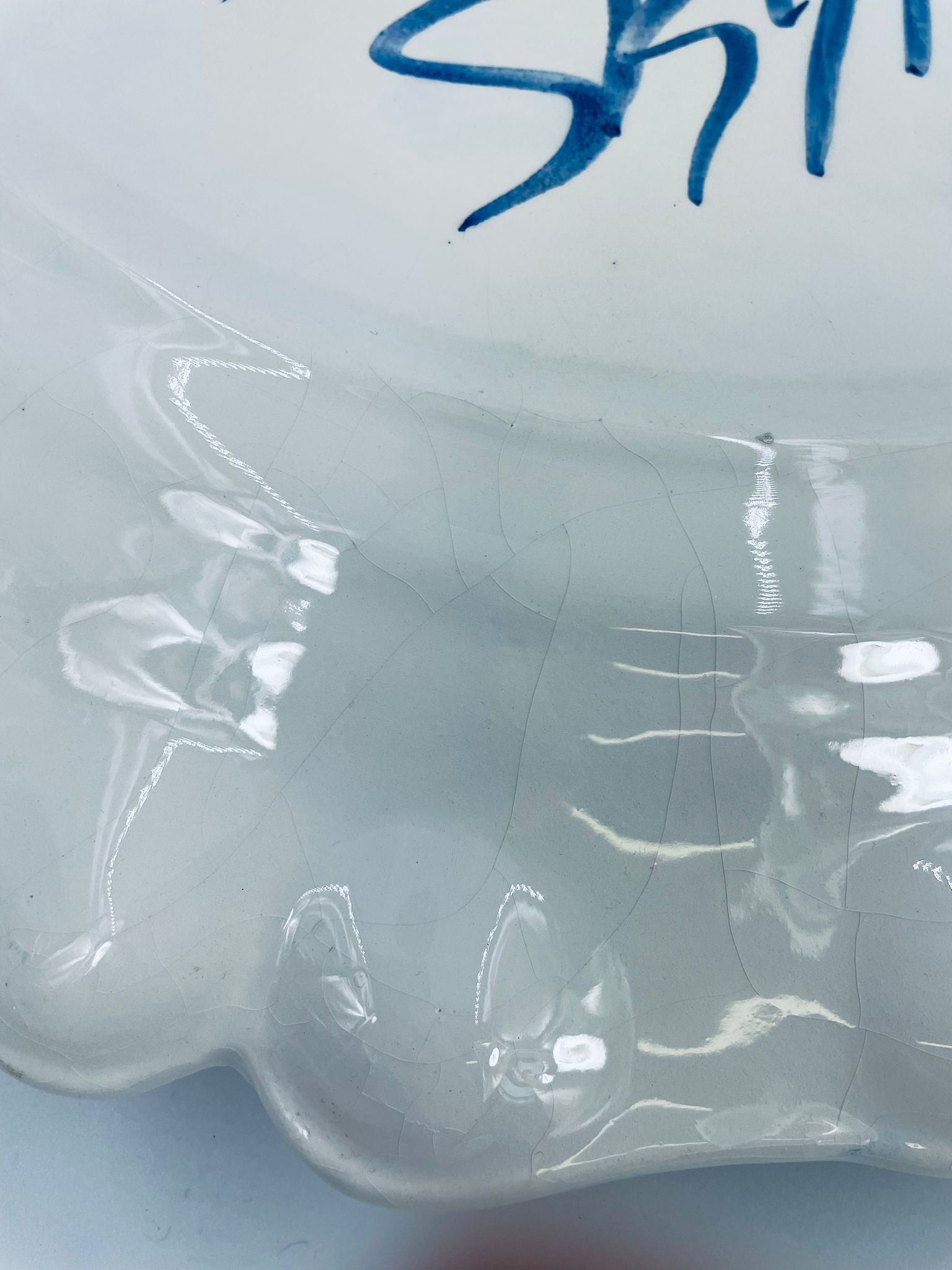 Talerz dekoracyjny wykonana przez artystę Skyrosa , wykonany z Włoskiej Majoliki. Duży talerz ekstremalnie malowany i ozdobiony stylizowanymi pawiami, otoczony wzorem kwiatowym i geometrycznym, wykończony kolorem ciemnoniebieskim na falistej krawędzi. Talerz przeznaczony jest do ekspozycji na ścianie. Posiada mały uszczerbek, przetarcie oraz pęknięcie szkliwa.
