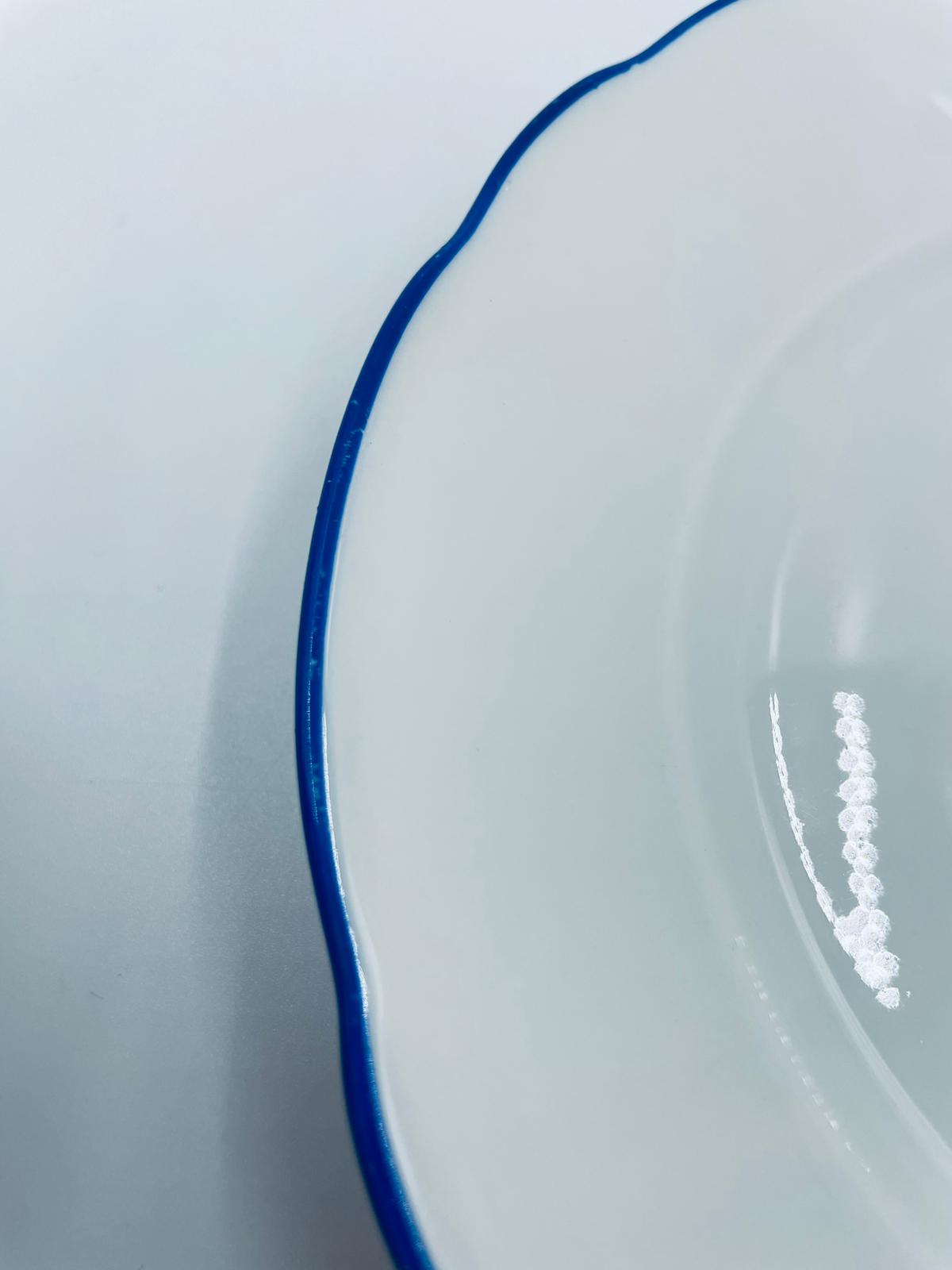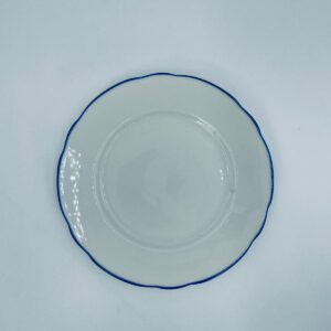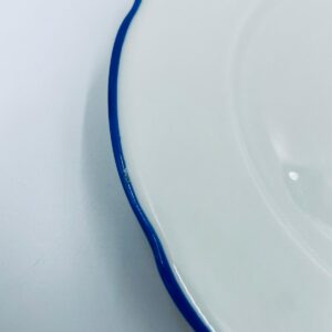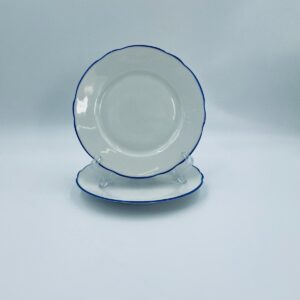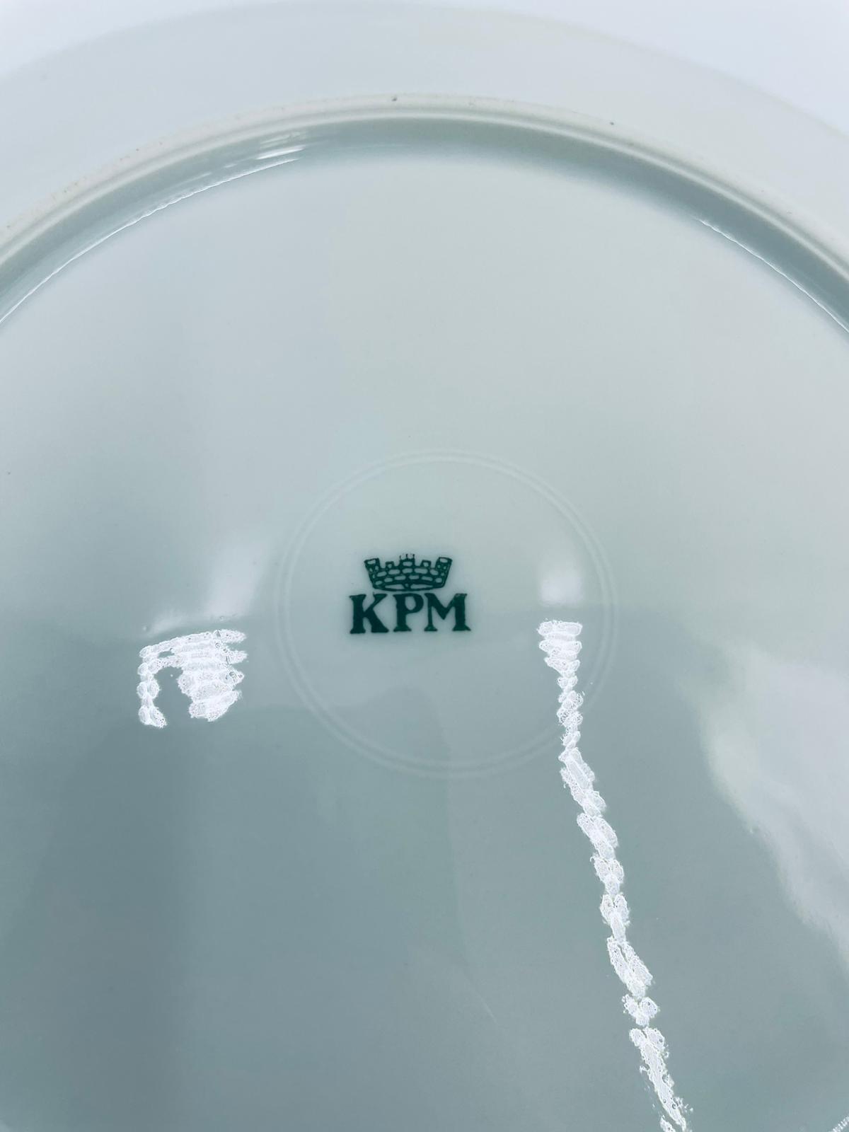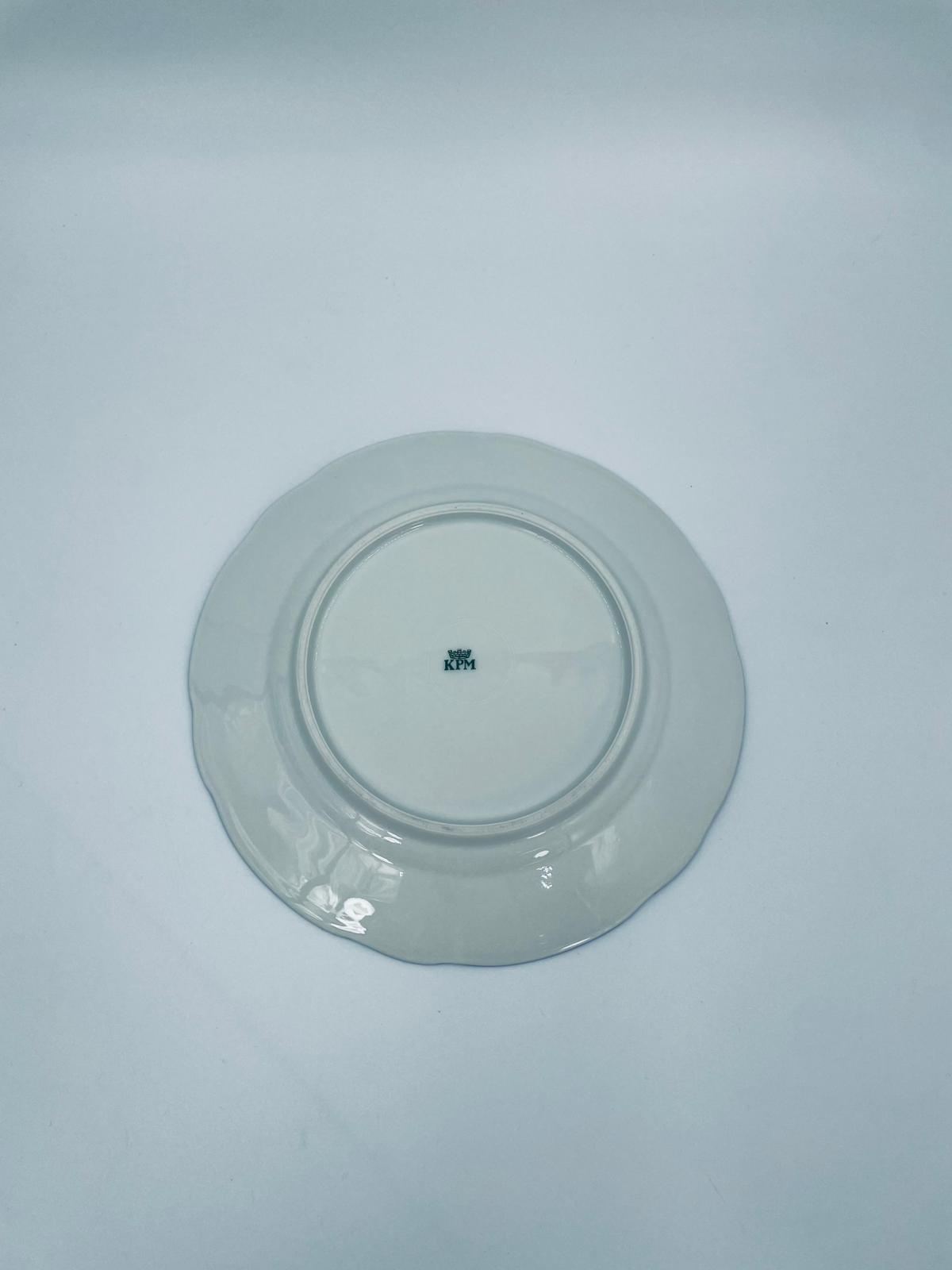 Talerz deserowy królewskiej manufaktury KPM Berlin z czasów PRL-u, wykonany z wysokiej jakości białej porcelany. Talerzyk elegancki, klasyczny, ozdobiony niebieskim pasem na krawędziach. Posiada przetarcia.