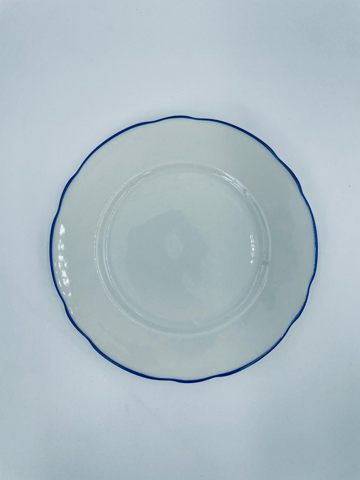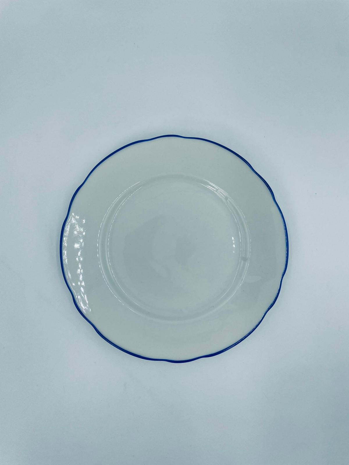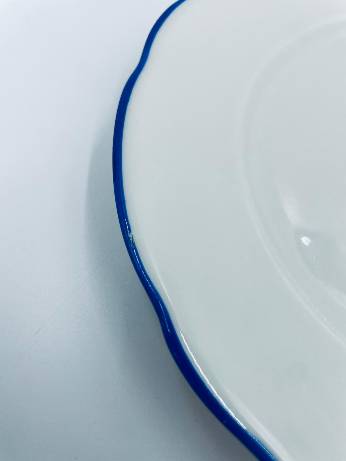 Talerz deserowy królewskiej manufaktury KPM Berlin z czasów PRL-u, wykonany z wysokiej jakości białej porcelany. Talerzyk elegancki, klasyczny, ozdobiony niebieskim pasem na krawędziach. Posiada przetarcia.