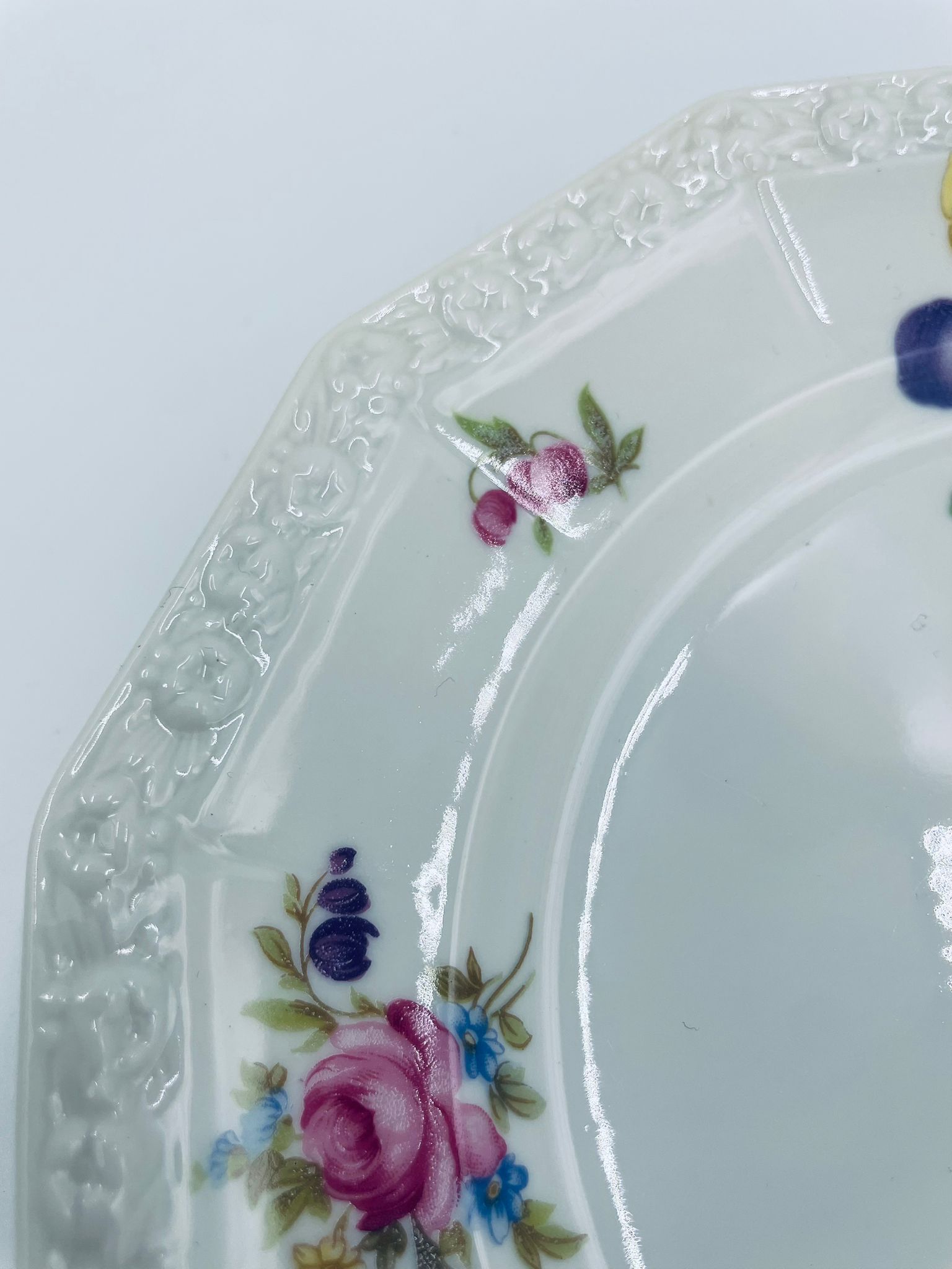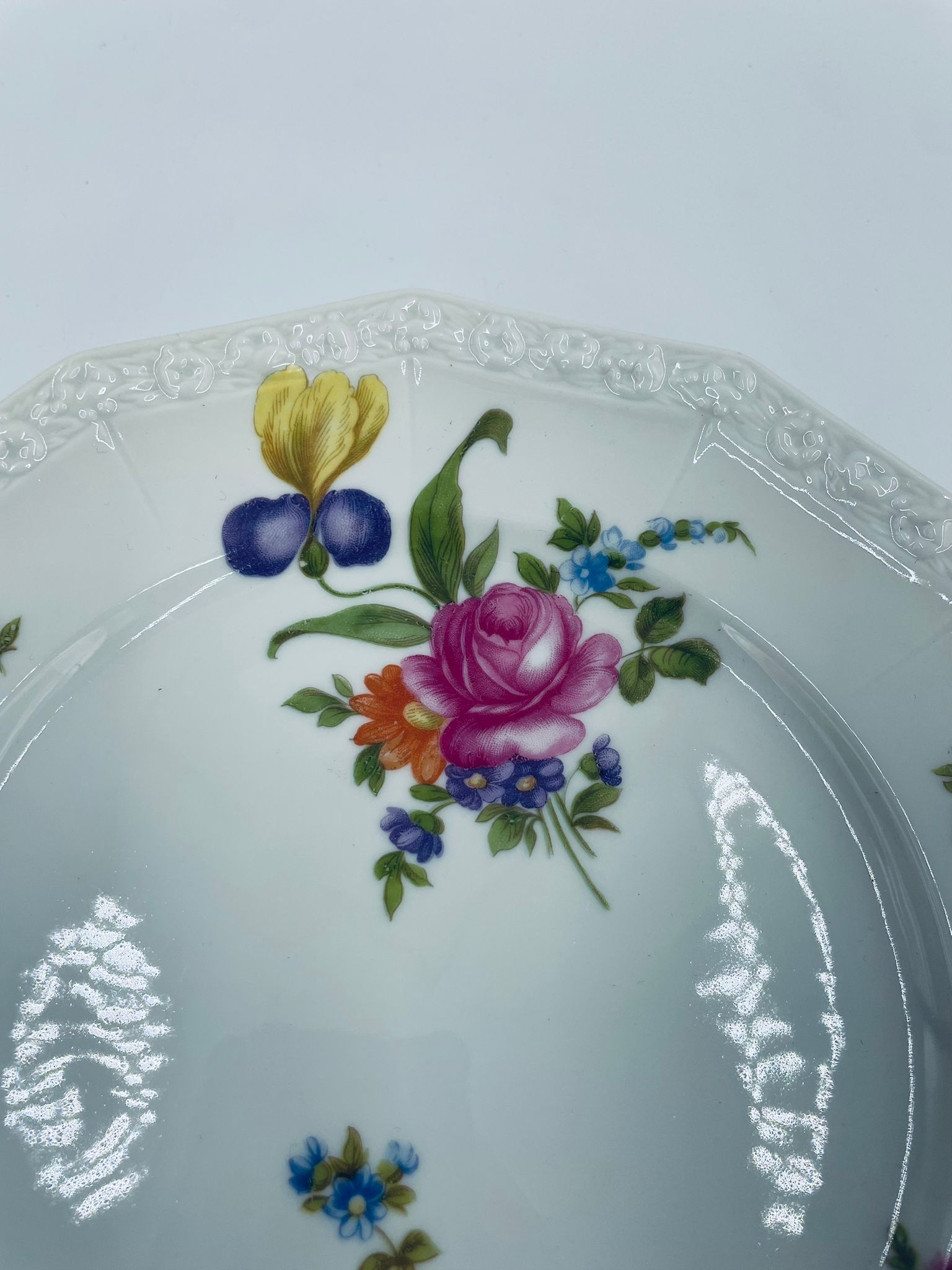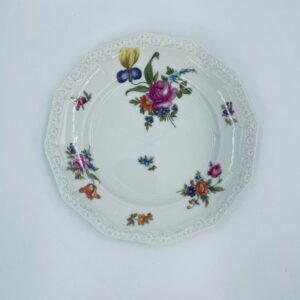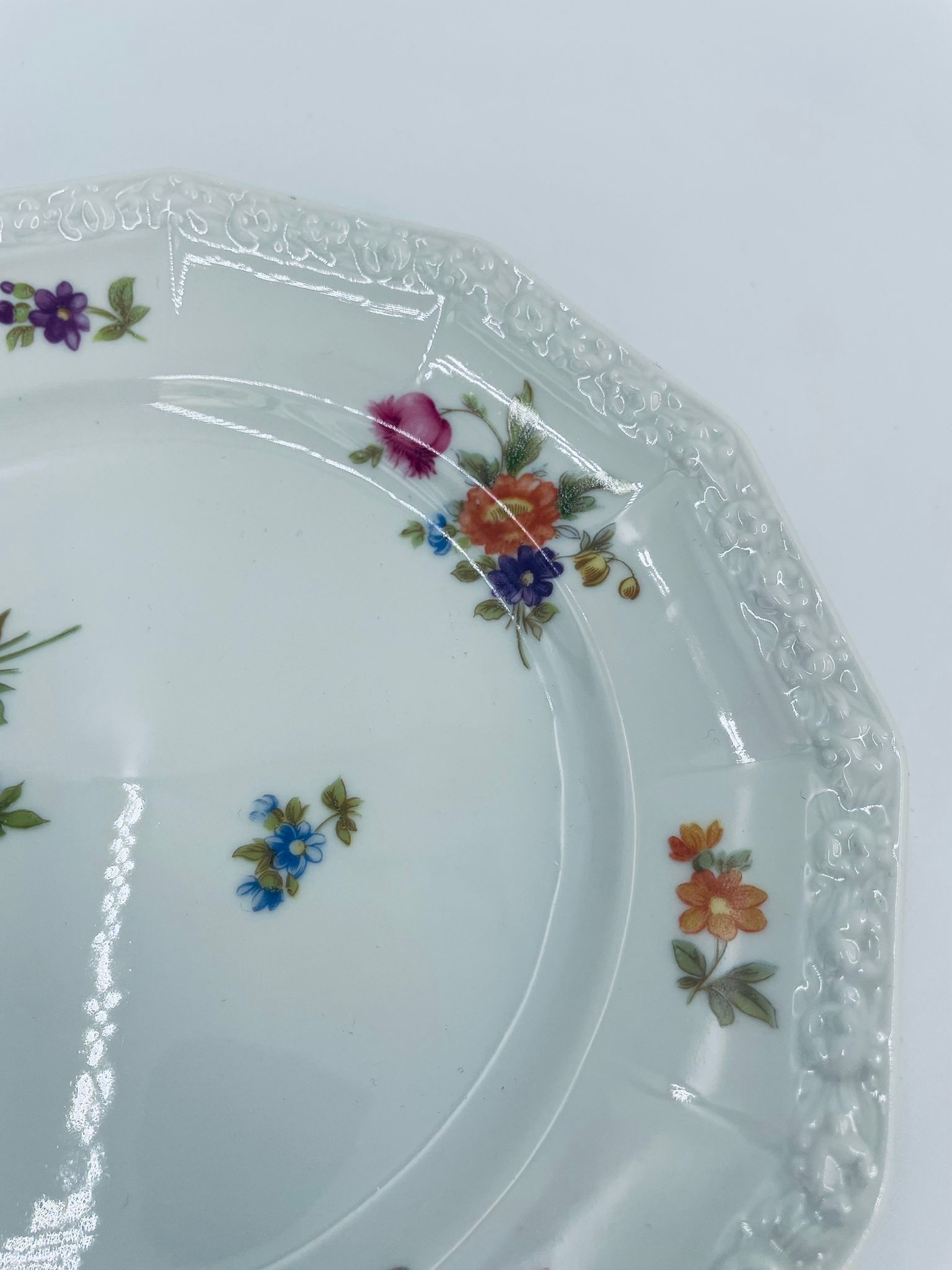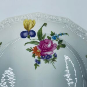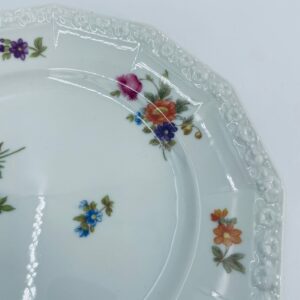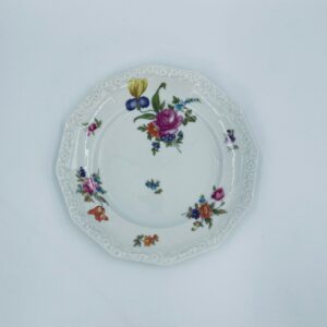 Talerz deserowy renomowanej wytwórni Rosenthal Maria, wykonany z najwyższej jakości białej porcelany. Talerz charakteryzuje się wielokątnym kształtem, reliefowymi bordiurami na obrzeżu oraz motywem wielokolorowych kwiatów.