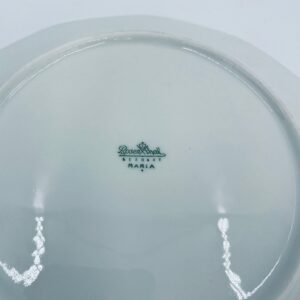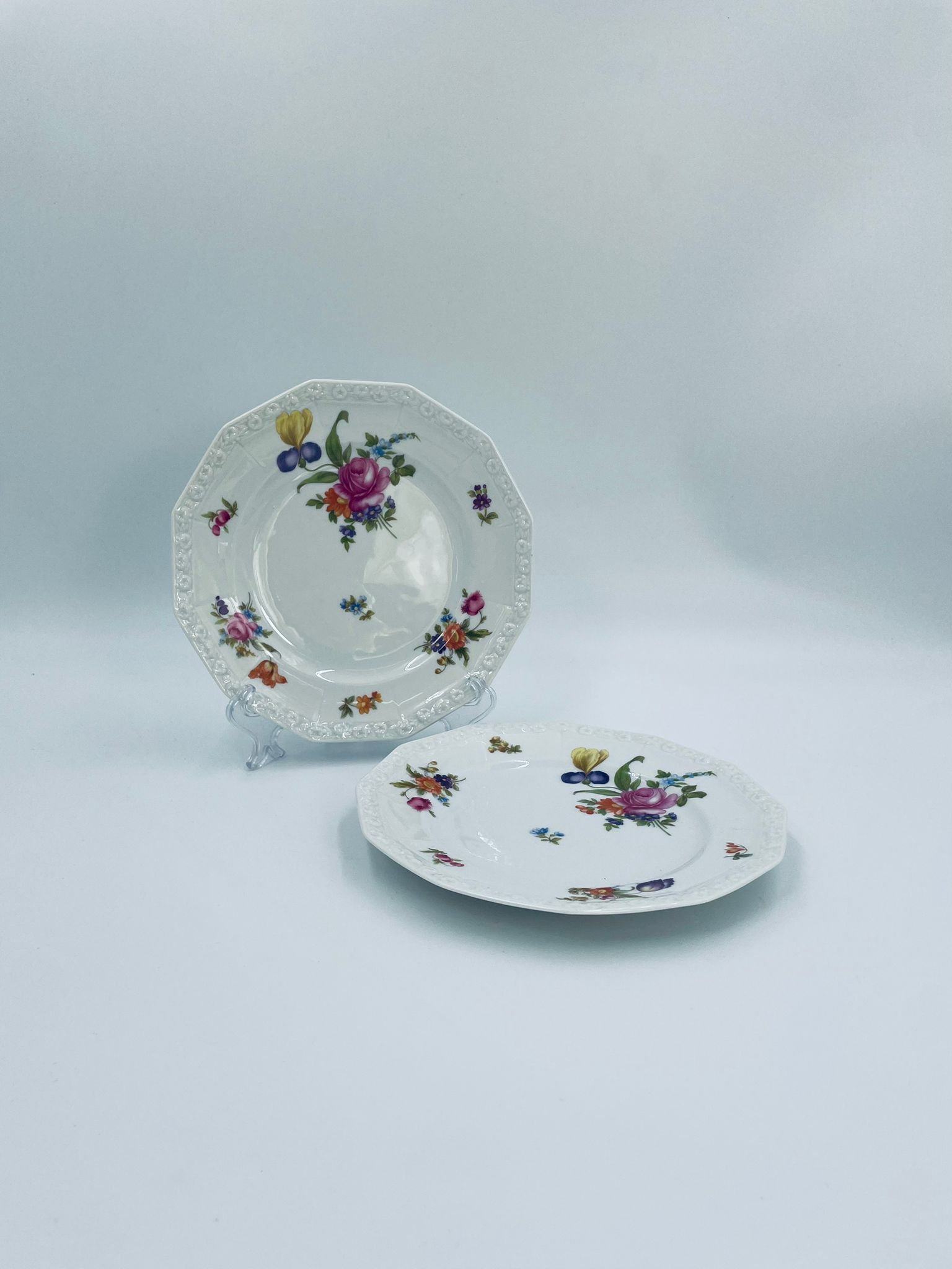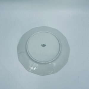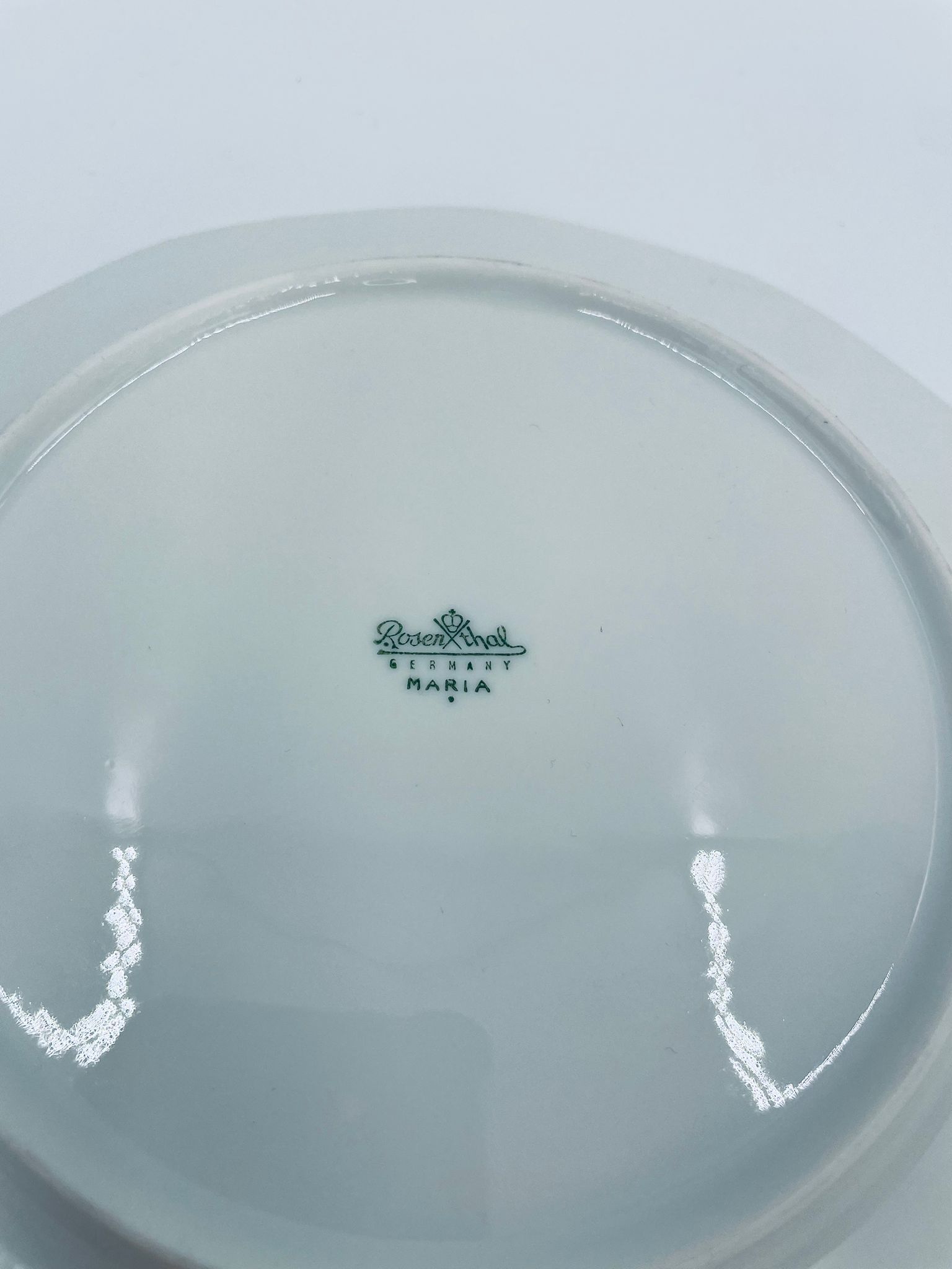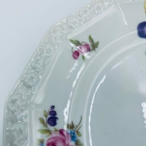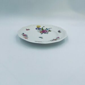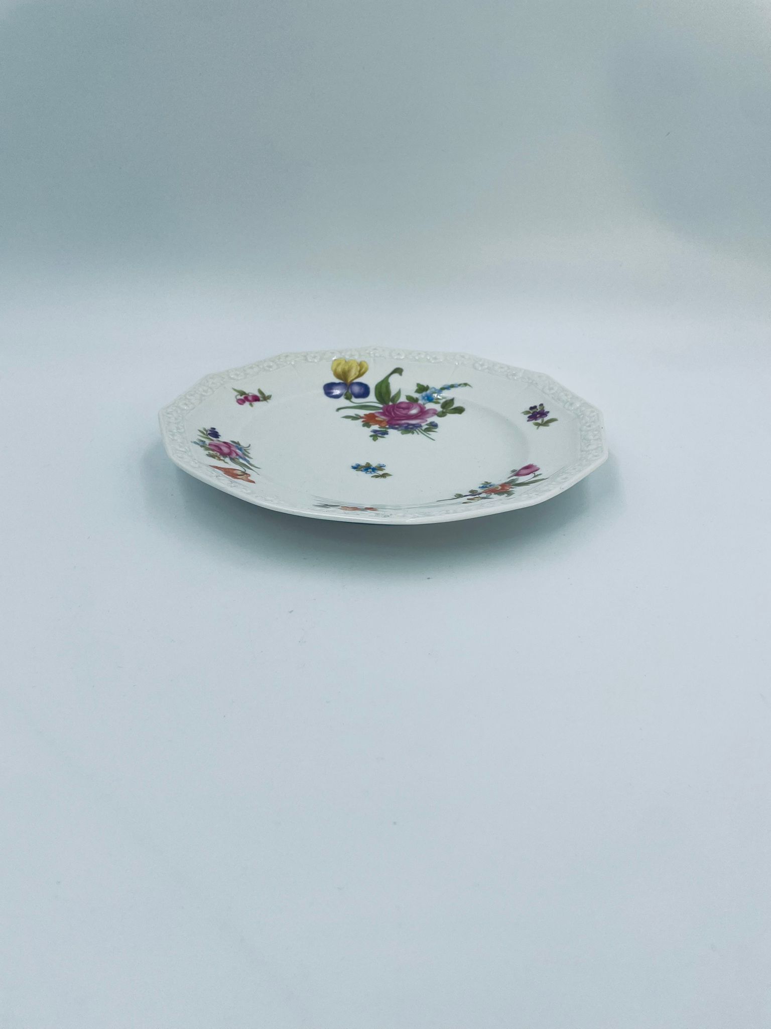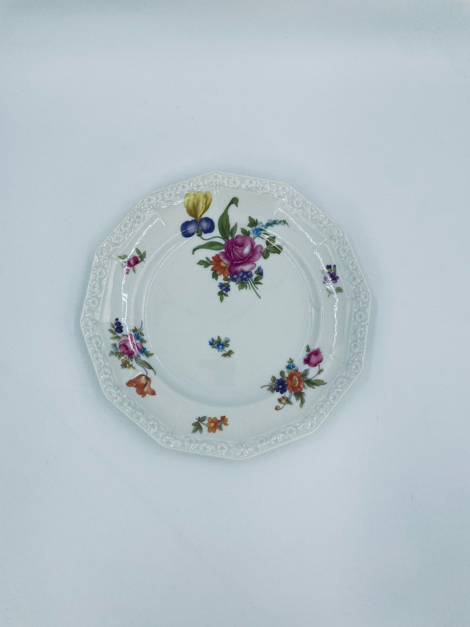 Talerz deserowy renomowanej wytwórni Rosenthal Maria, wykonany z najwyższej jakości białej porcelany. Talerz charakteryzuje się wielokątnym kształtem, reliefowymi bordiurami na obrzeżu oraz motywem wielokolorowych kwiatów.
