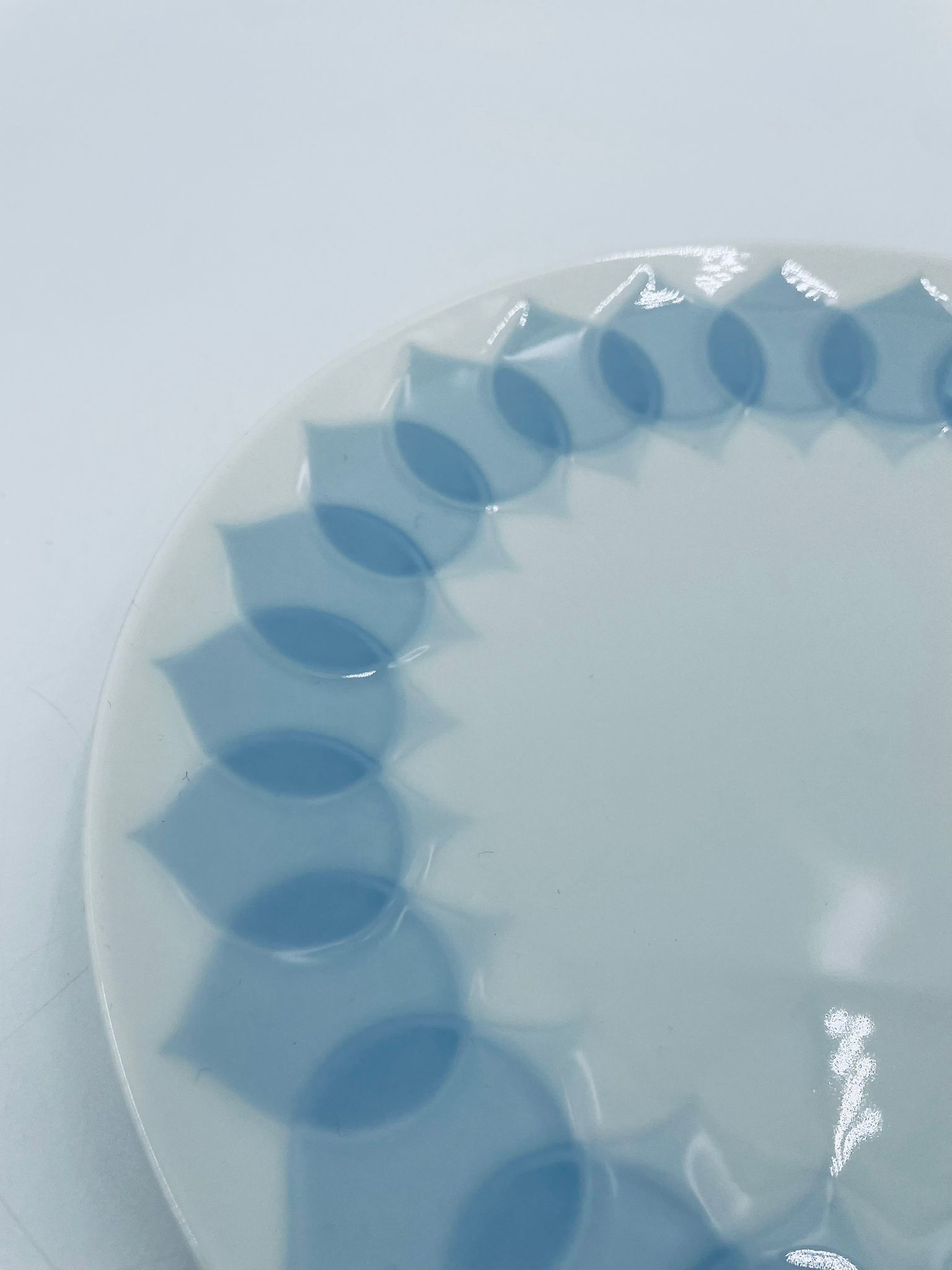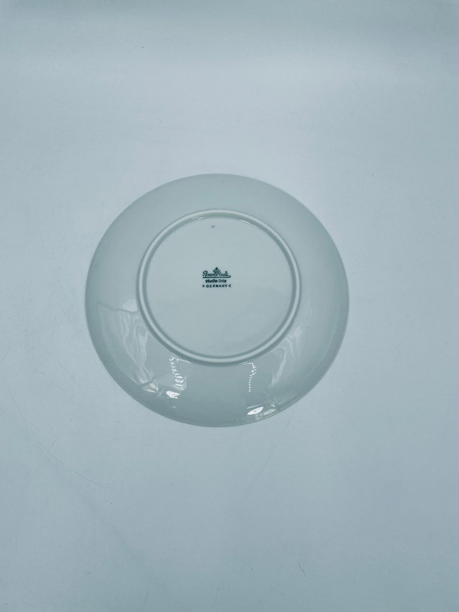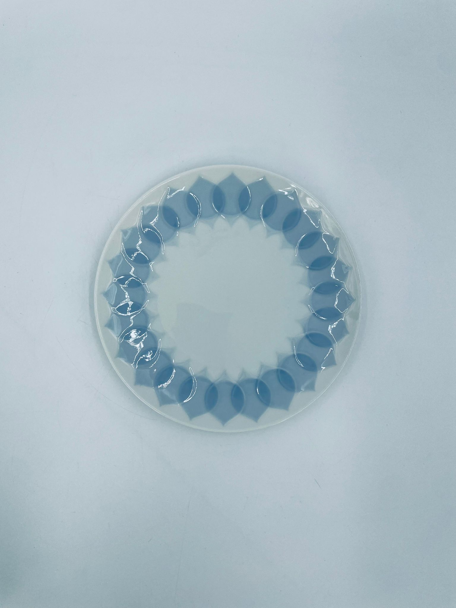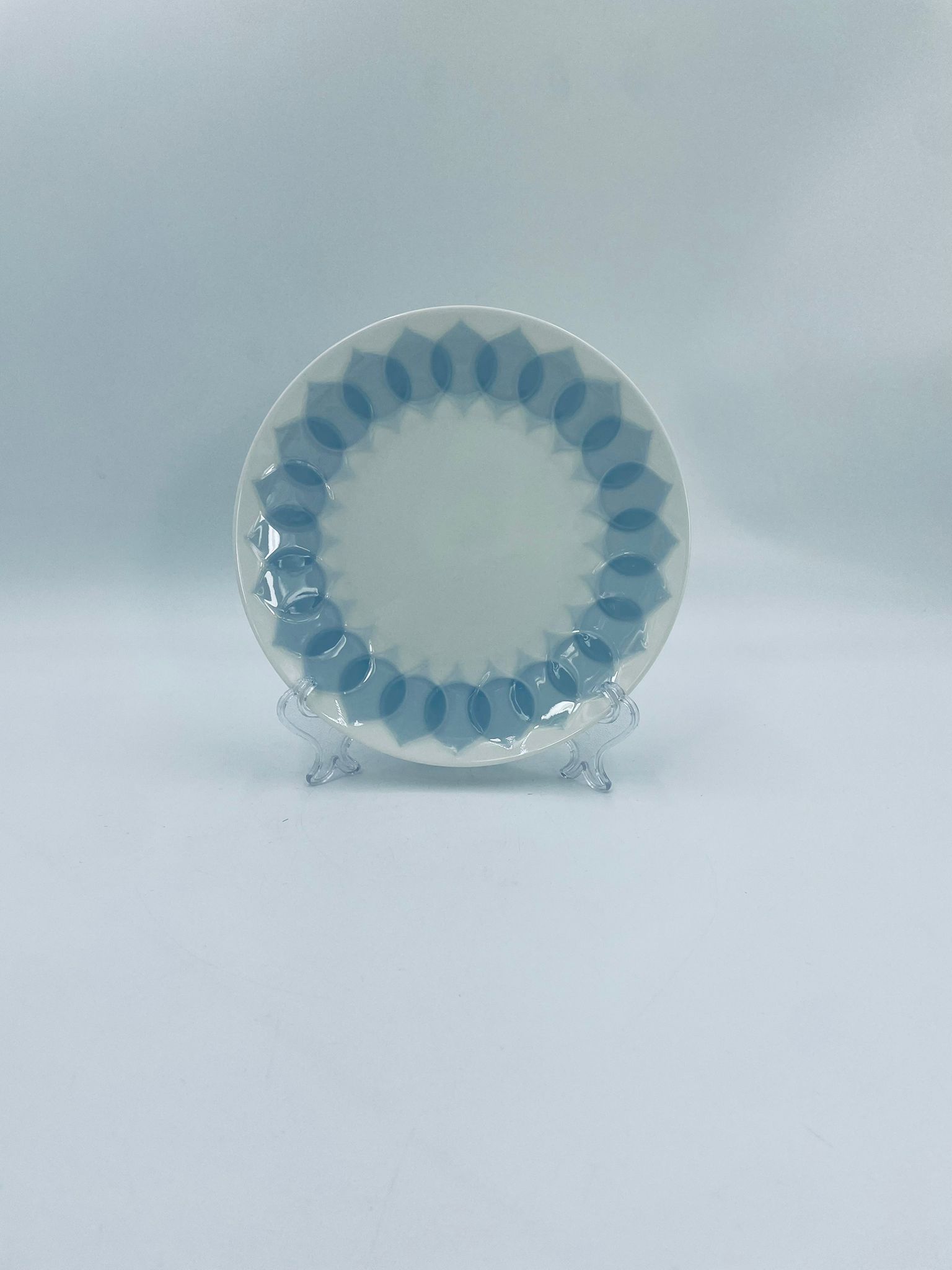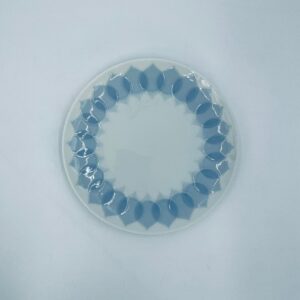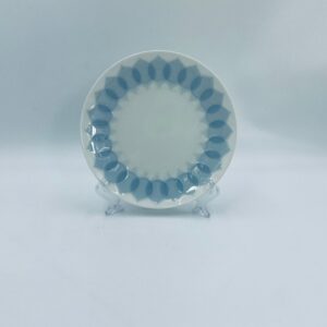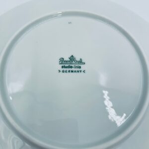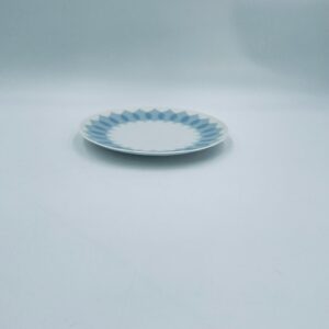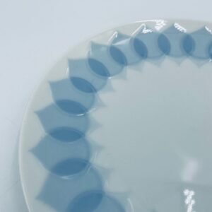 Talerzyk deserowy renomowanej wytwórni Rosenthal Studio Line z serii Lotus Blau , zaprojektowany przez duńskiego artystę Bjorna Wiinblada w 1964r, wykonany z najwyższej jakości białej porcelany. Talerz ozdobiony wzorem „Blau” z delikatnym, geometrycznym motywem przypominający liście lotosu w niebieskim odcieniu.