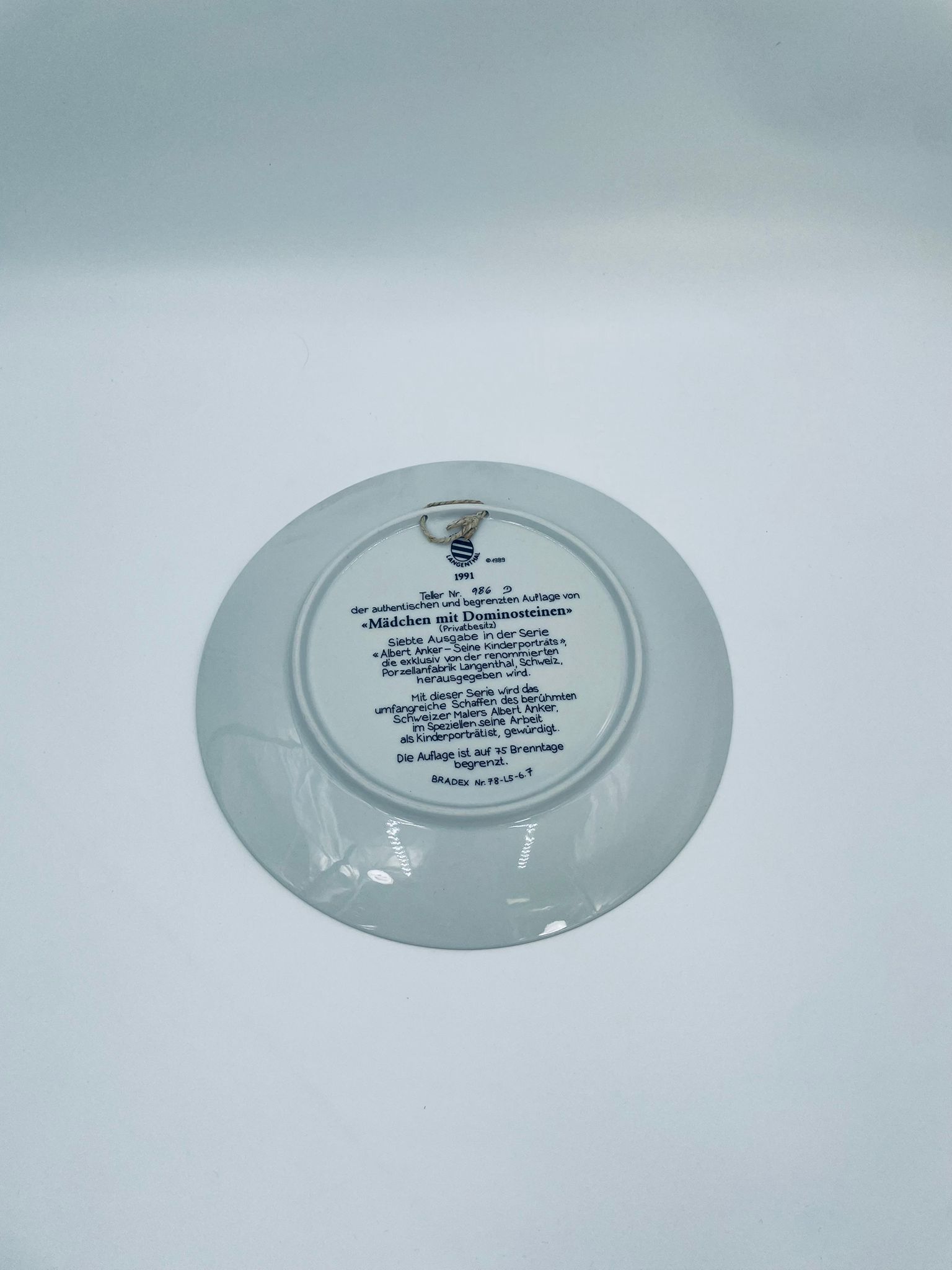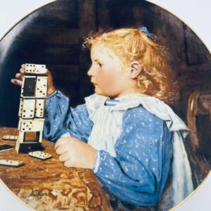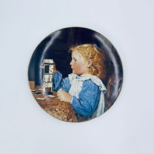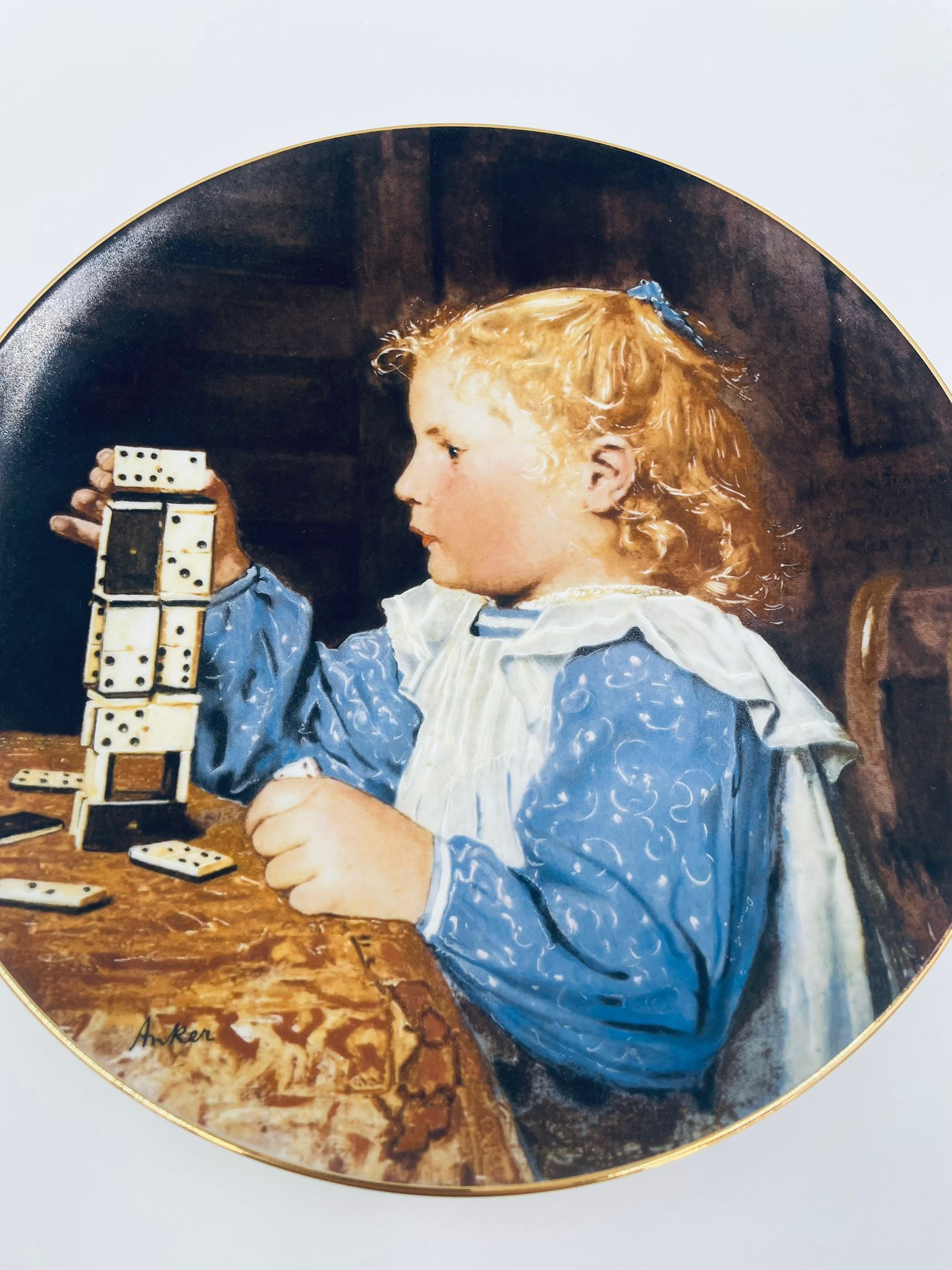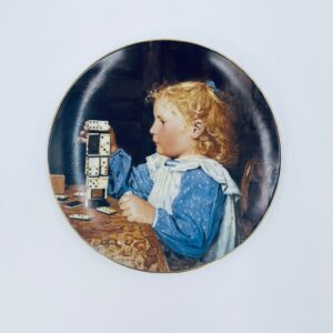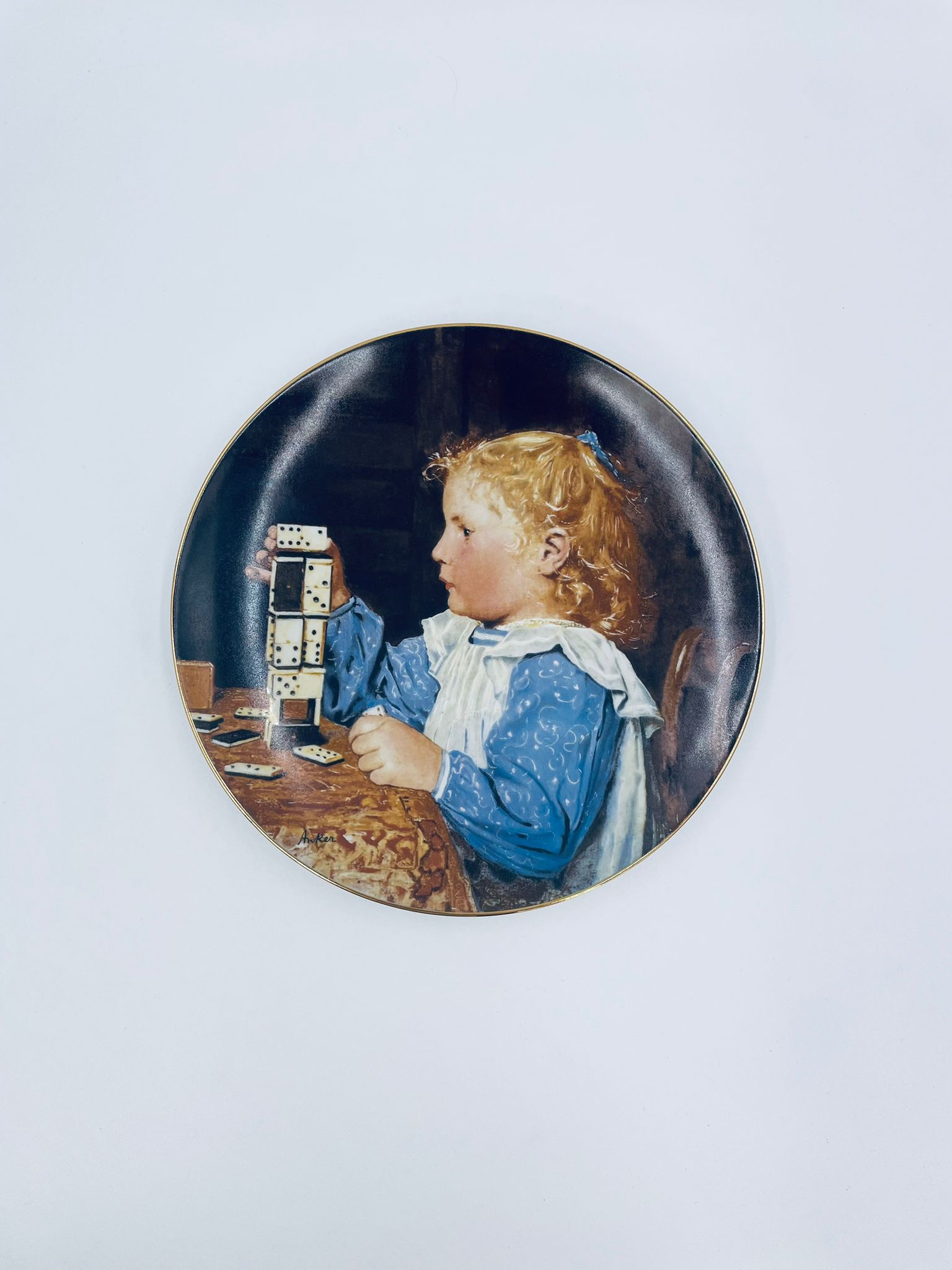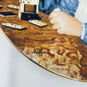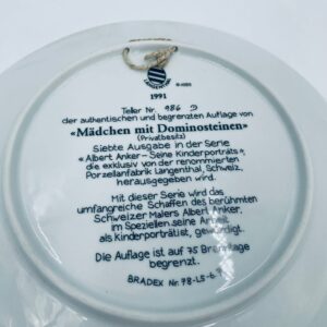 Talerz kolekcjonerski wyprodukowany przez szwajcarską manufakturę porcelany Langenthal, wykonany z wysokiej jakości porcelany. Talerz pochodzi z limitowanej edycji, siódmej serii, reprodukcji obrazu szwajcarskiego malarza Alberta Ankera, zatytułowanego „Mädchen mit Dominosteinen” (Dziewczynka z domino), wykończony złoceniem na rancie.