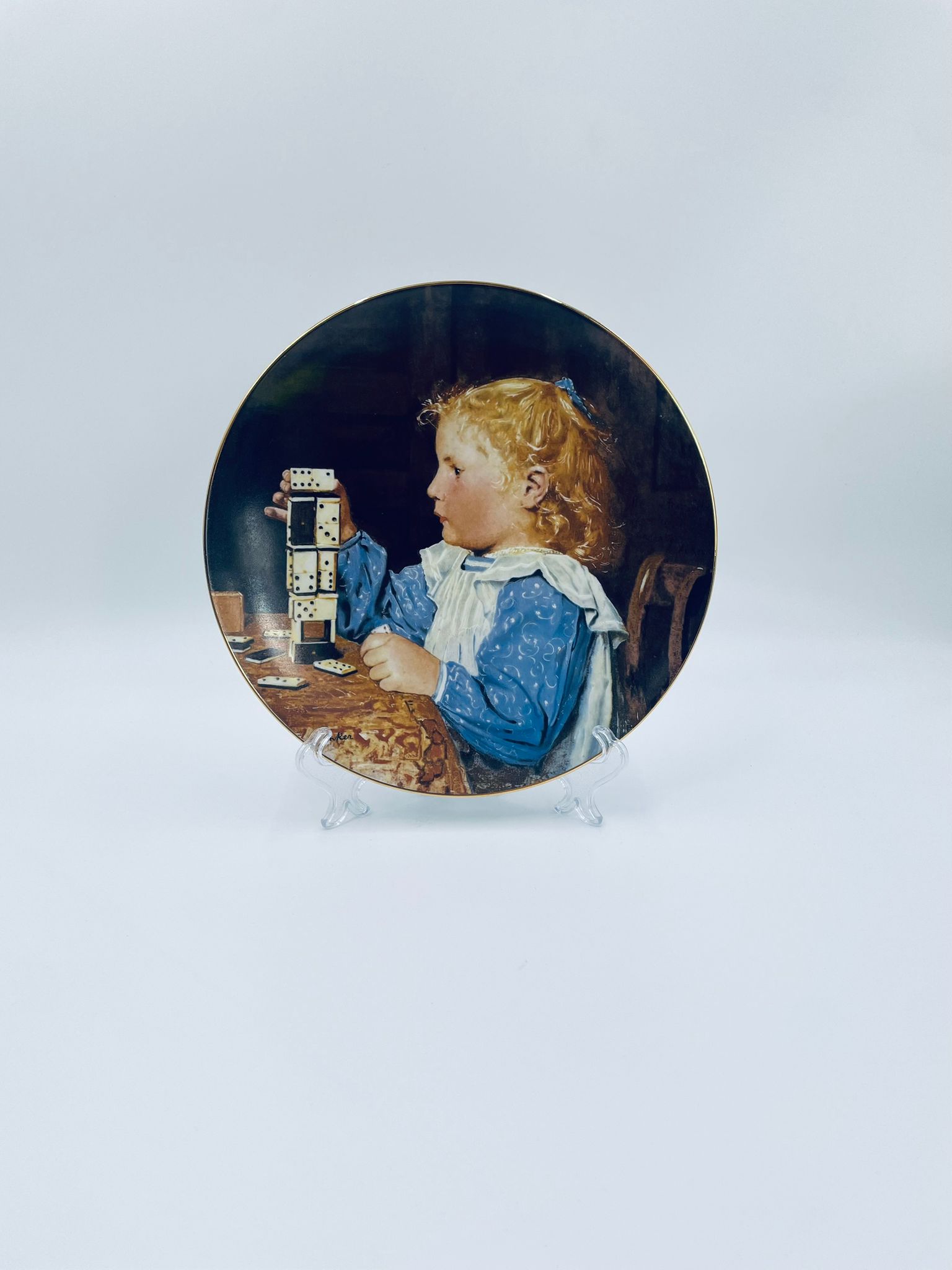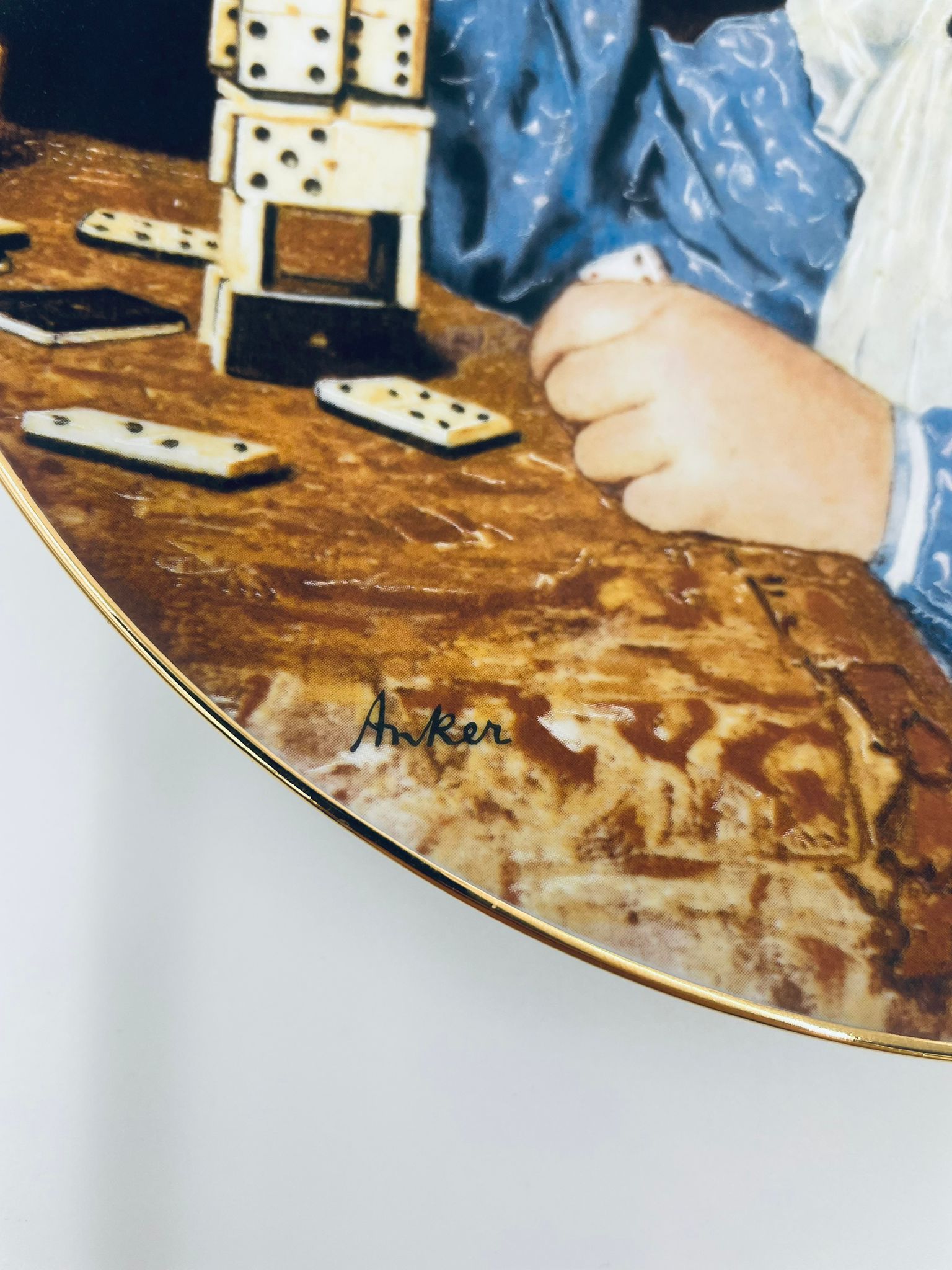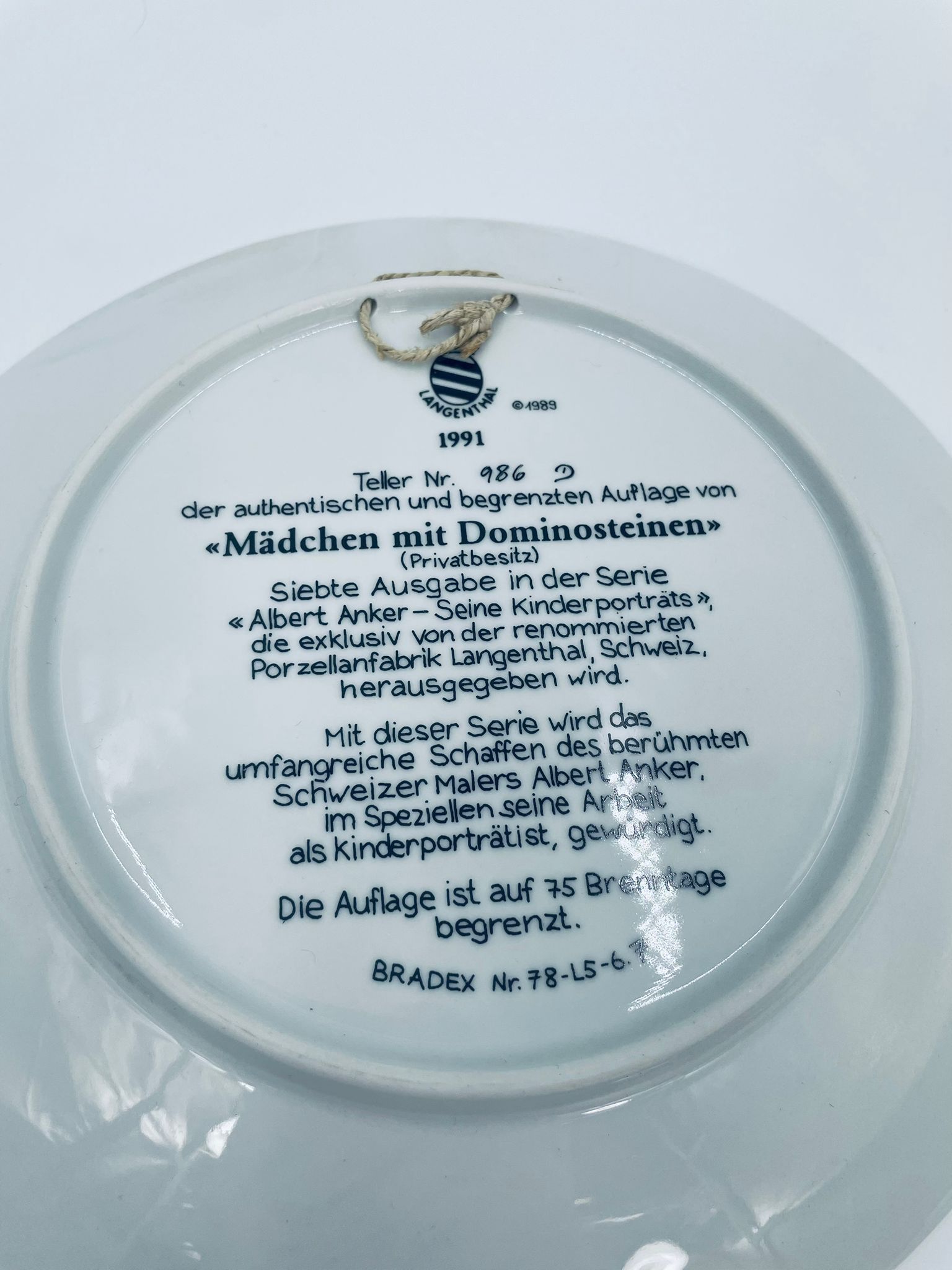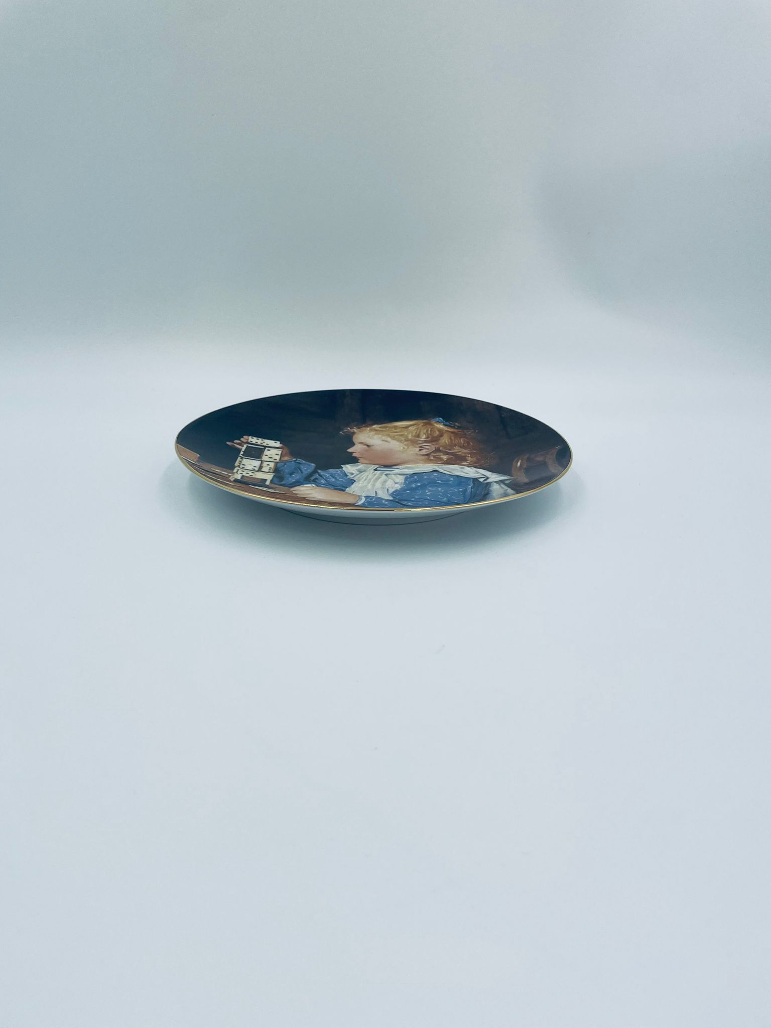 Talerz kolekcjonerski wyprodukowany przez szwajcarską manufakturę porcelany Langenthal, wykonany z wysokiej jakości porcelany. Talerz pochodzi z limitowanej edycji, siódmej serii, reprodukcji obrazu szwajcarskiego malarza Alberta Ankera, zatytułowanego „Mädchen mit Dominosteinen” (Dziewczynka z domino), wykończony złoceniem na rancie.