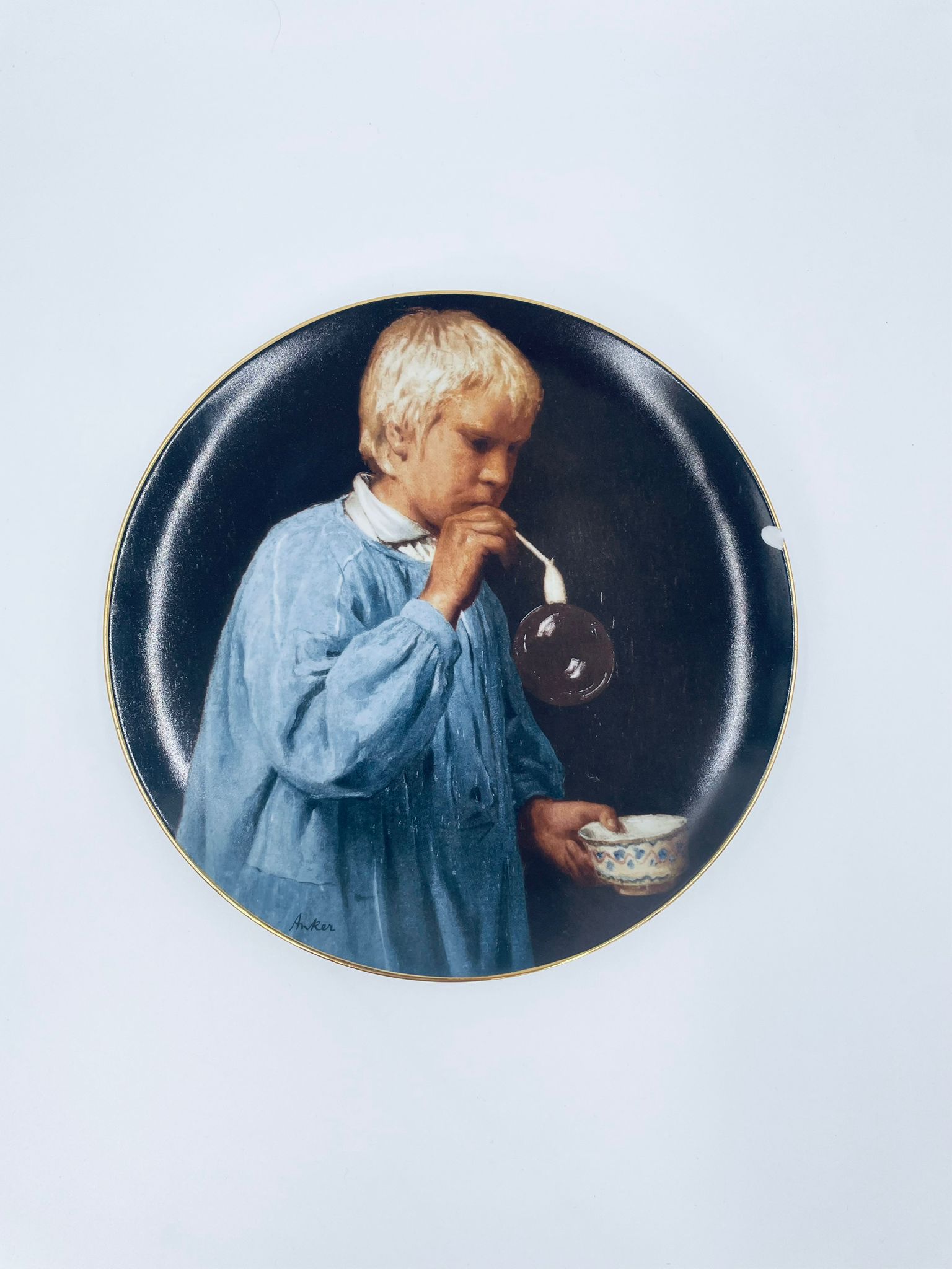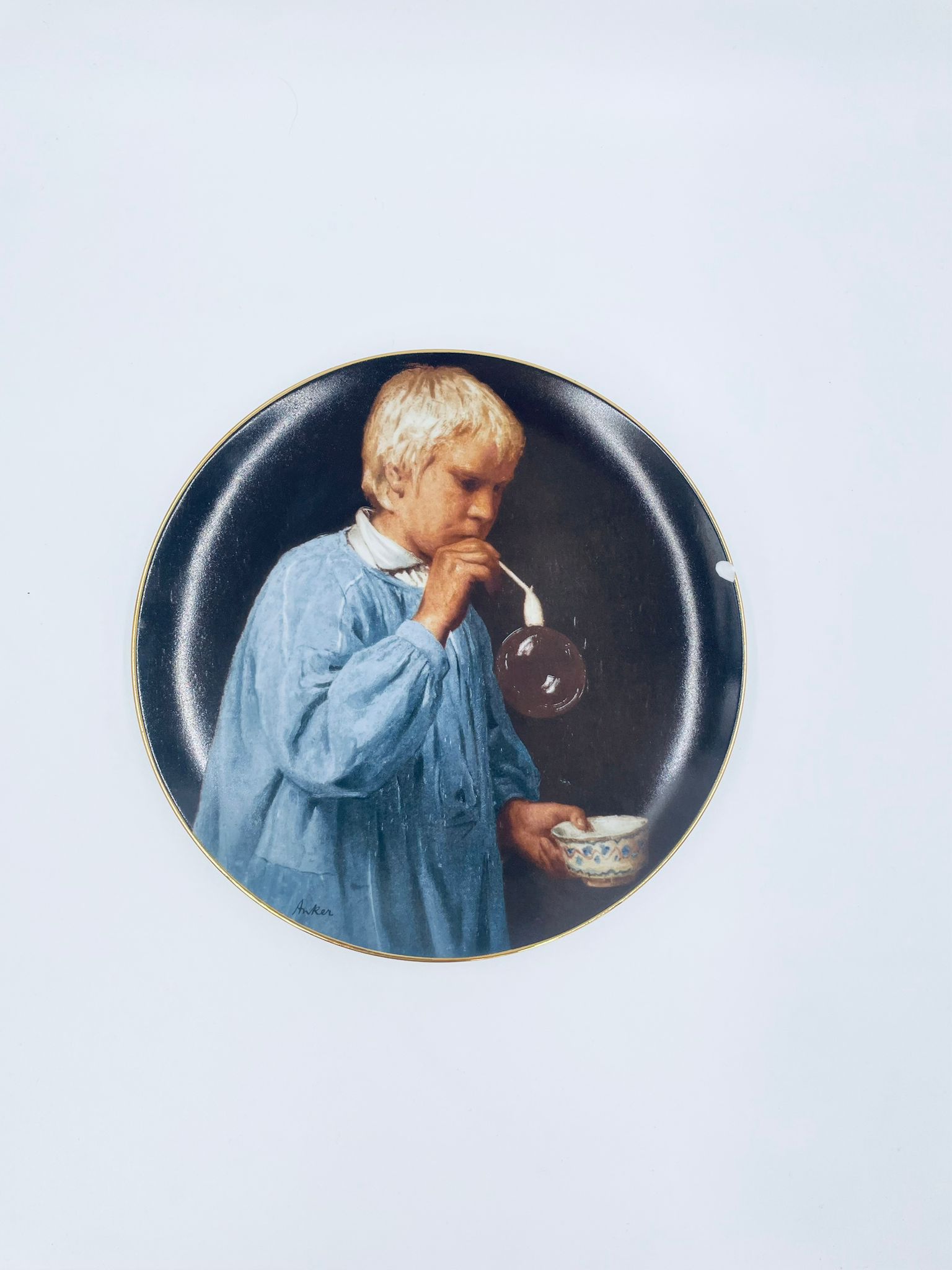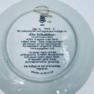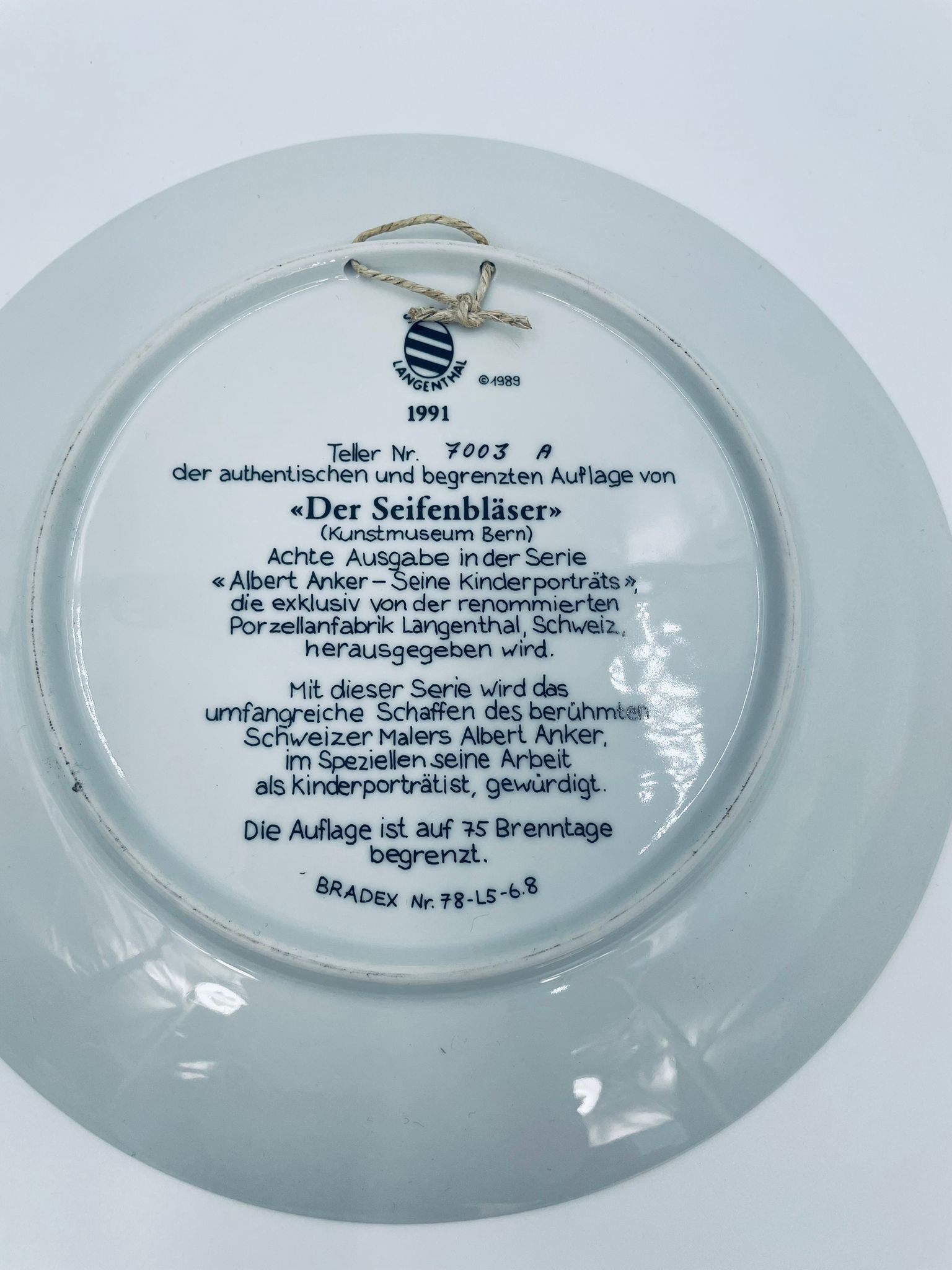 Talerz kolekcjonerski wyprodukowany przez szwajcarską manufakturę porcelany Langenthal, wykonany z wysokiej jakości porcelany. Talerz pochodzi z limitowanej edycji, ósmej serii, reprodukcji obrazu szwajcarskiego malarza Alberta Ankera, zatytułowanego „Der Seifenbläser” (Chłopiec puszczający bańki mydlane), wykończony złoceniem na rancie.