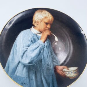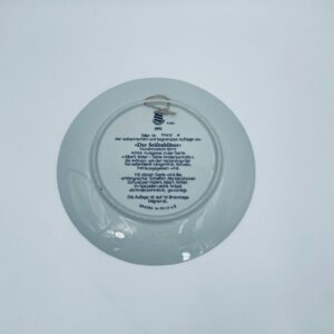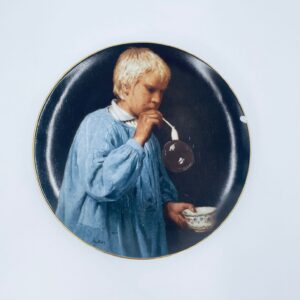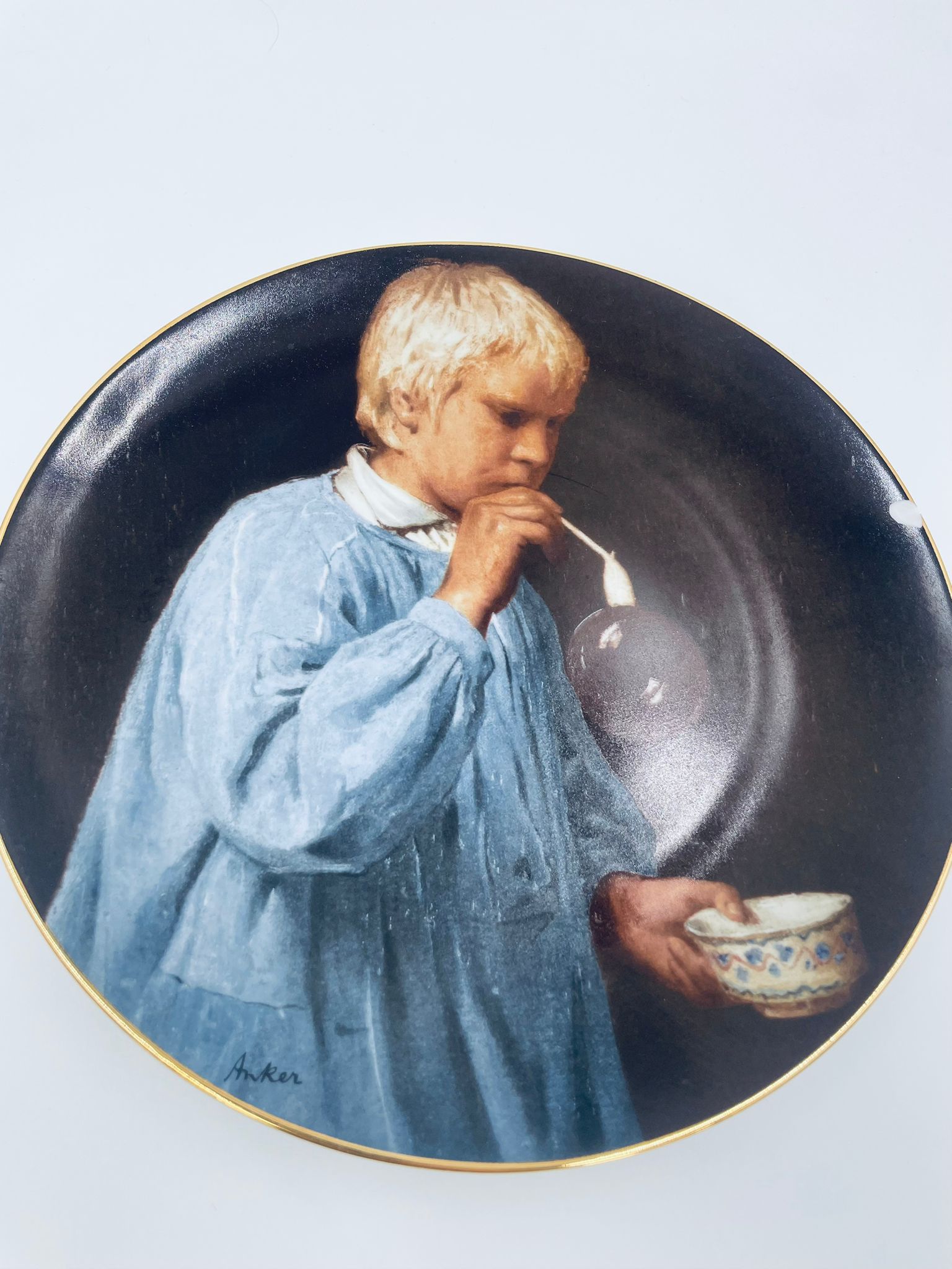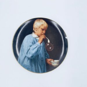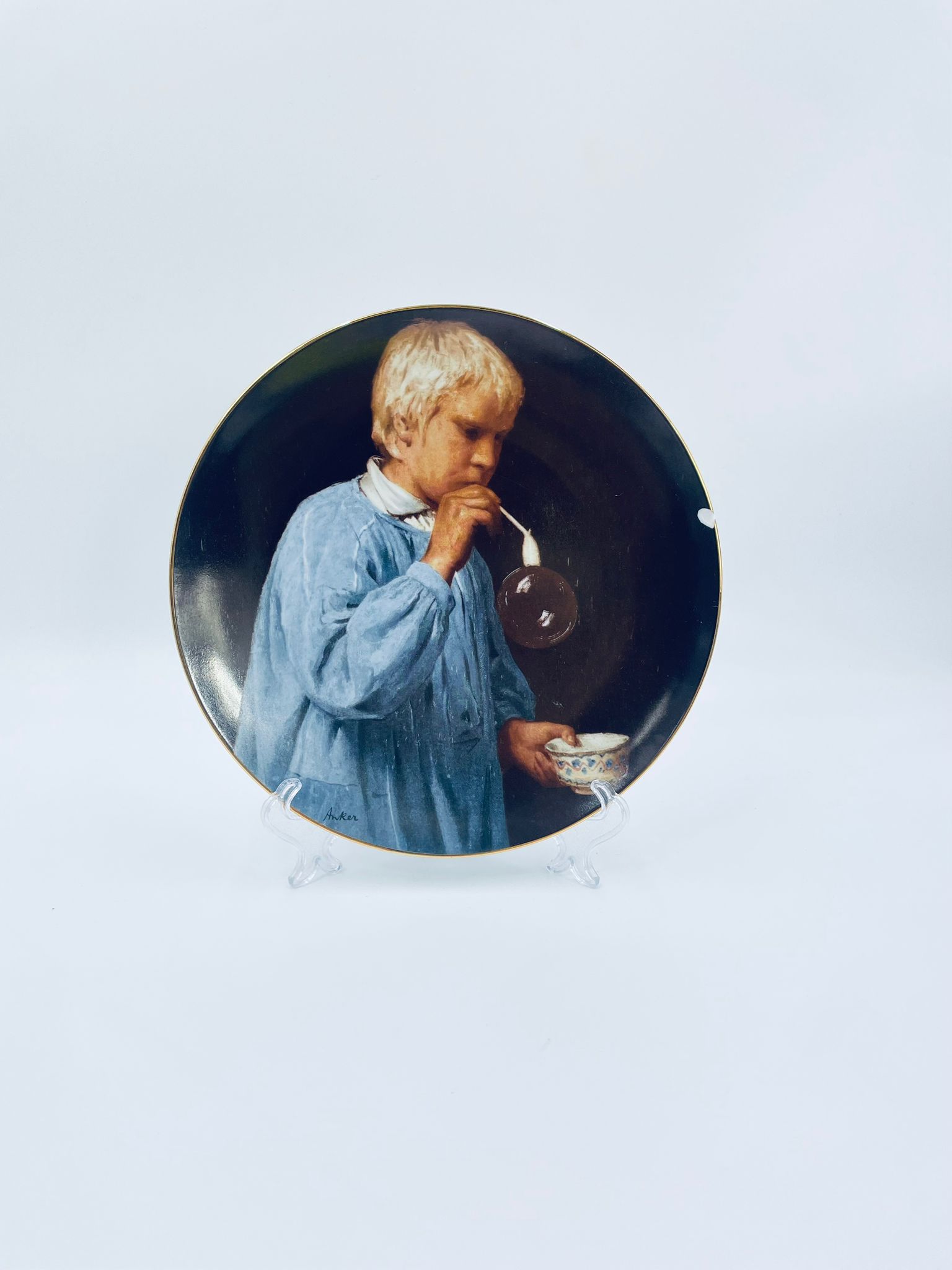 Talerz kolekcjonerski wyprodukowany przez szwajcarską manufakturę porcelany Langenthal, wykonany z wysokiej jakości porcelany. Talerz pochodzi z limitowanej edycji, ósmej serii, reprodukcji obrazu szwajcarskiego malarza Alberta Ankera, zatytułowanego „Der Seifenbläser” (Chłopiec puszczający bańki mydlane), wykończony złoceniem na rancie.