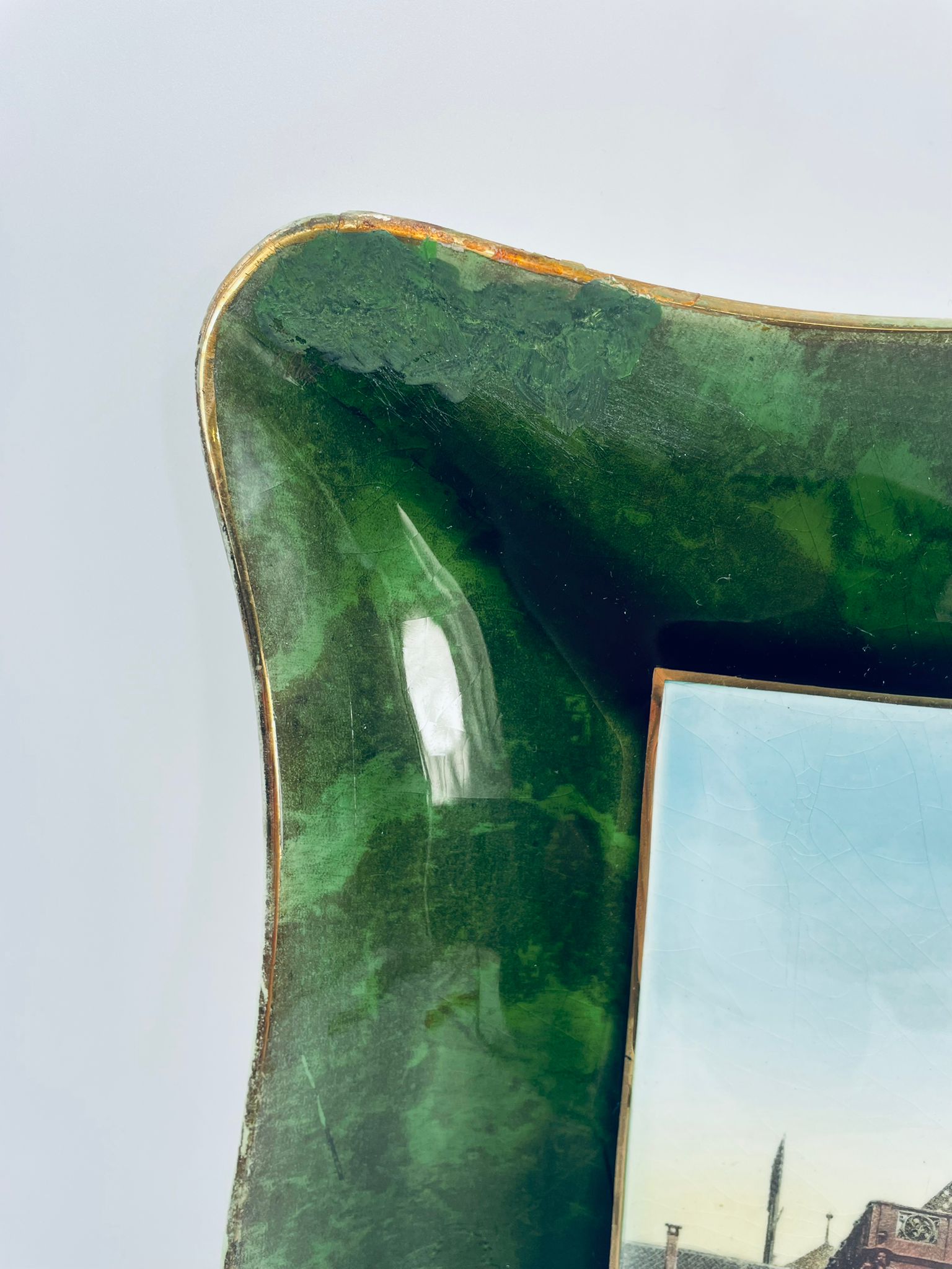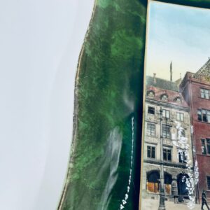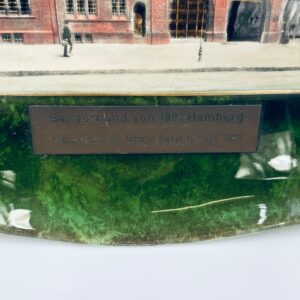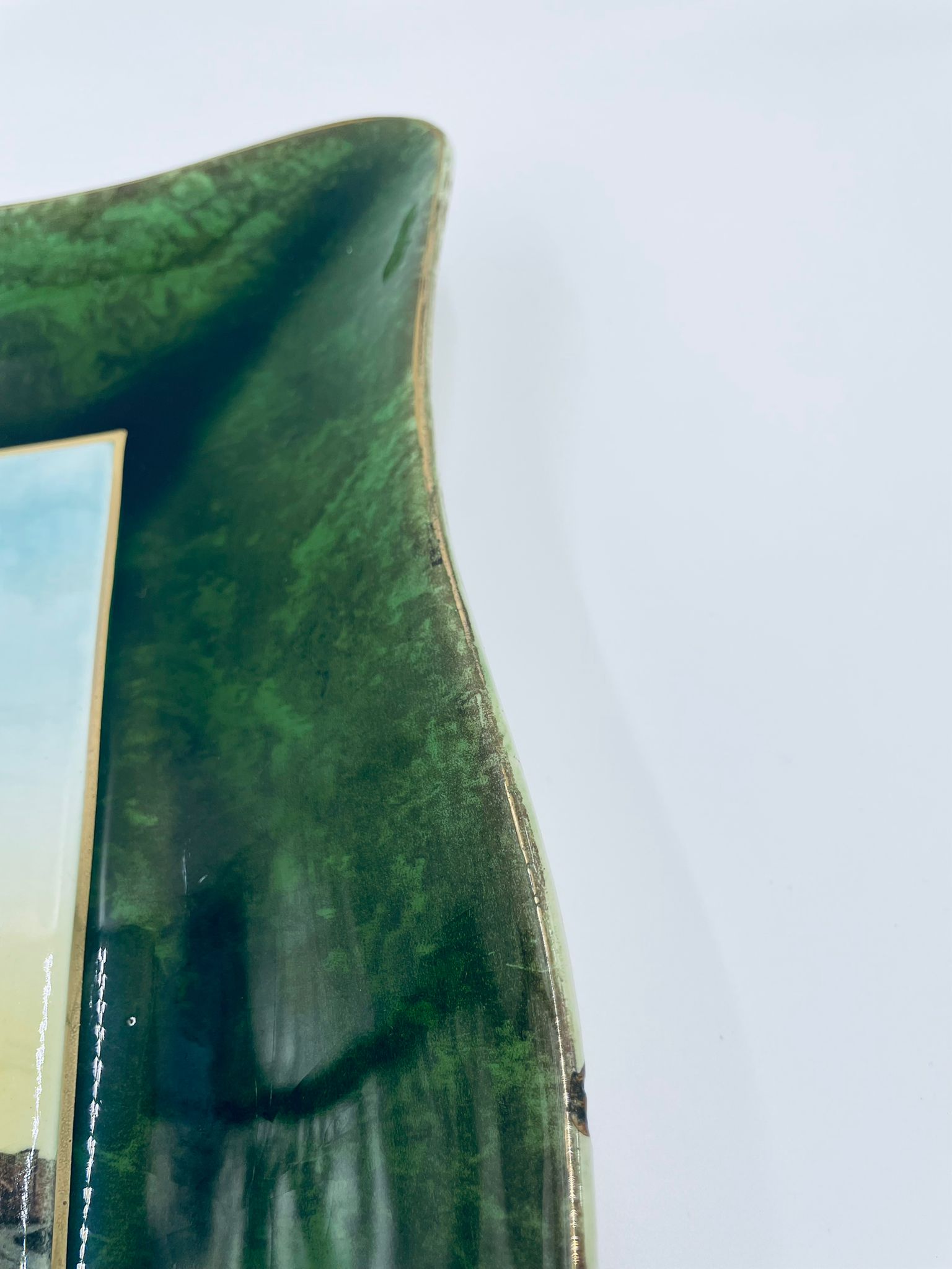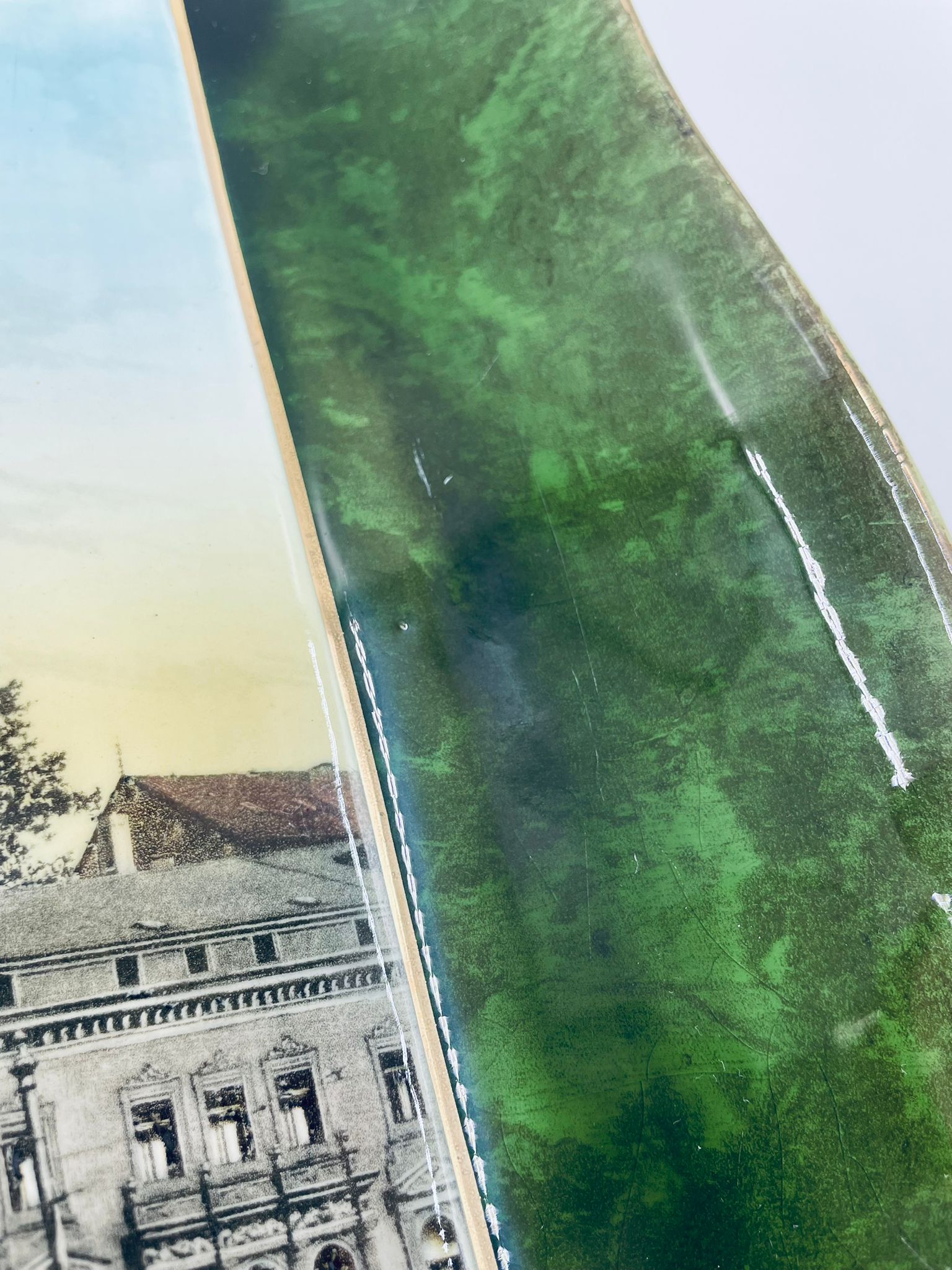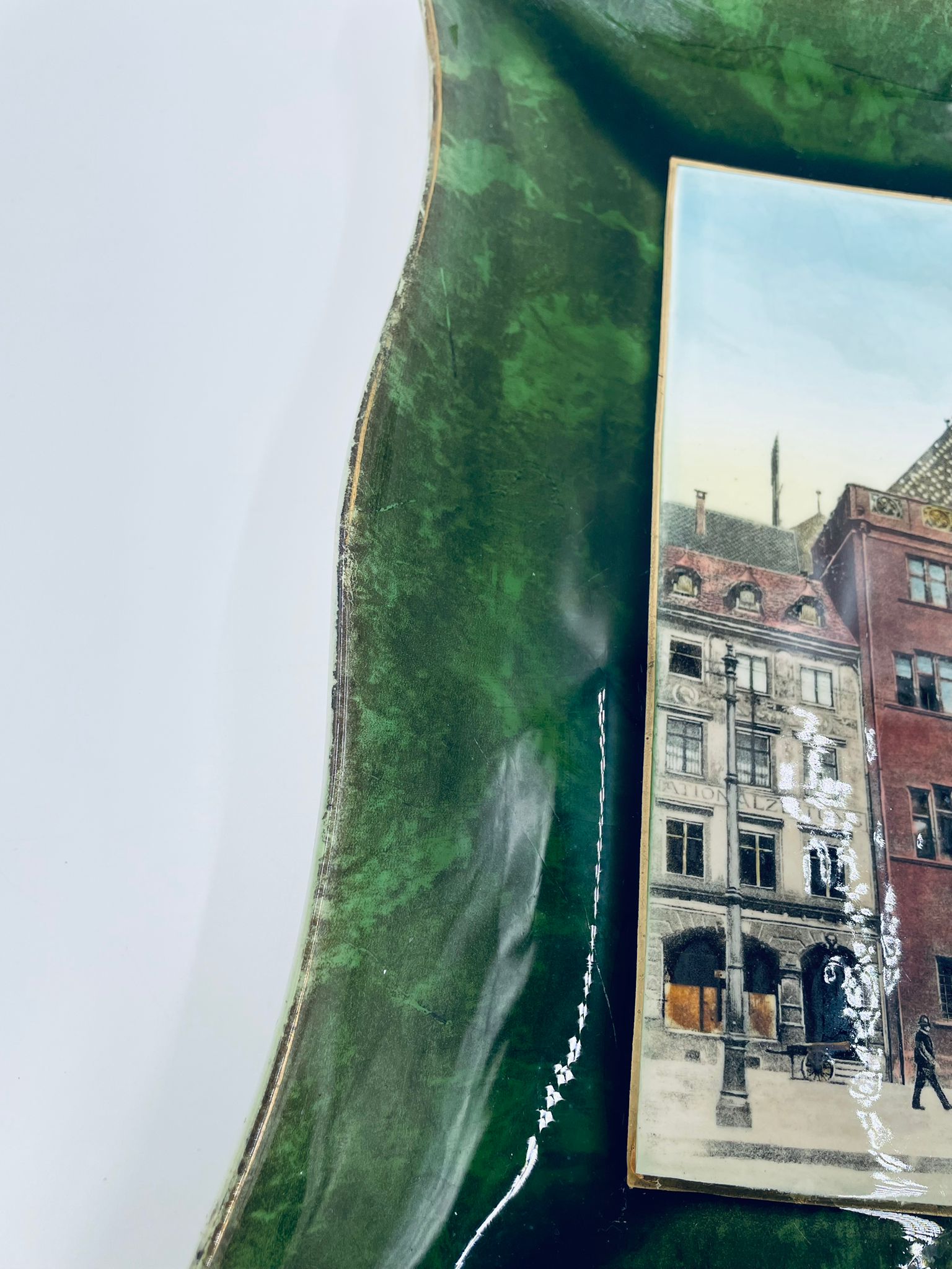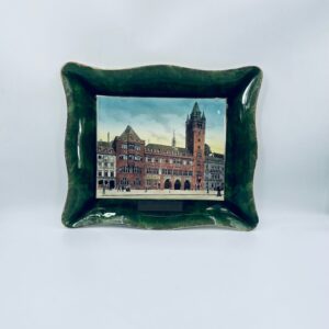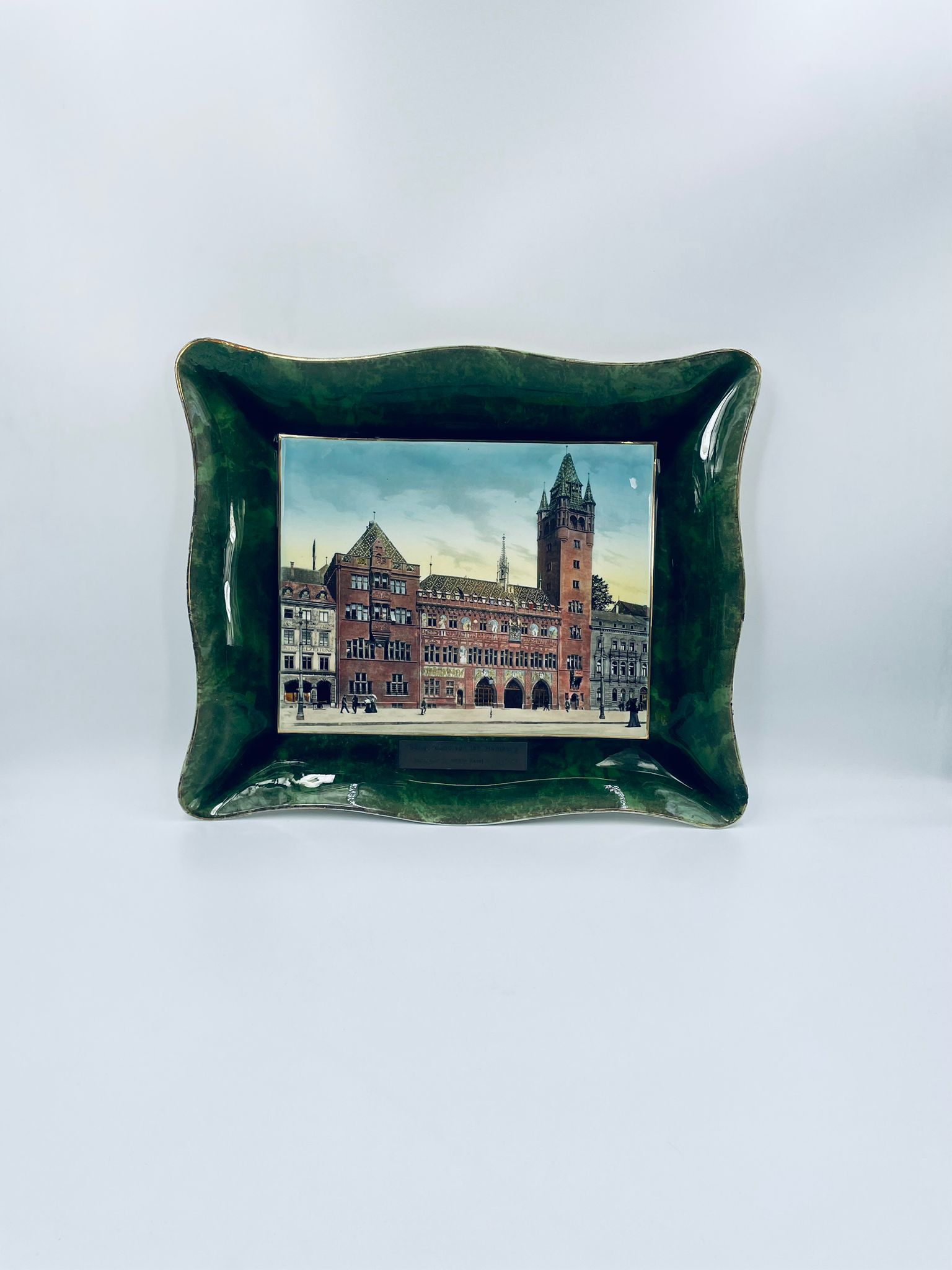 Talerz kolekcjonerski ścienny w stylu Vintage, wykonany z wysokiej jakości szkliwionej ceramiki. Talerz o unikalnym, pofalowanym kształcie, wykończony zielonym szkliwem oraz złoceniem na krawędzi. Centralny motyw na talerzu przedstawia wizerunek historycznego Ratuszu w Bazylei w Szwajcarii. Talerz posiada przetarcie złocenia, pęknięcie szkliwa oraz uszczerbki.
