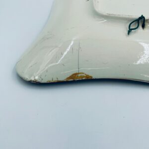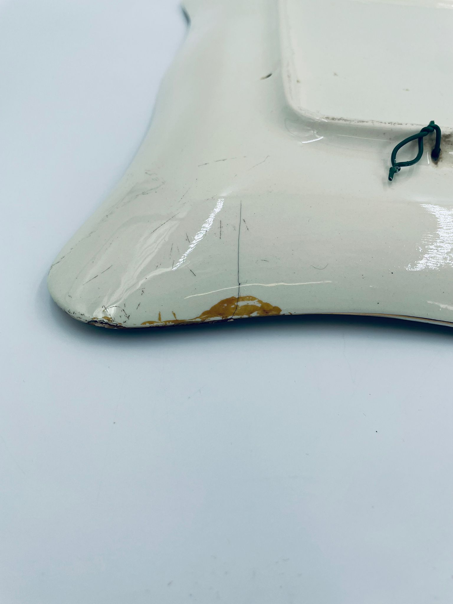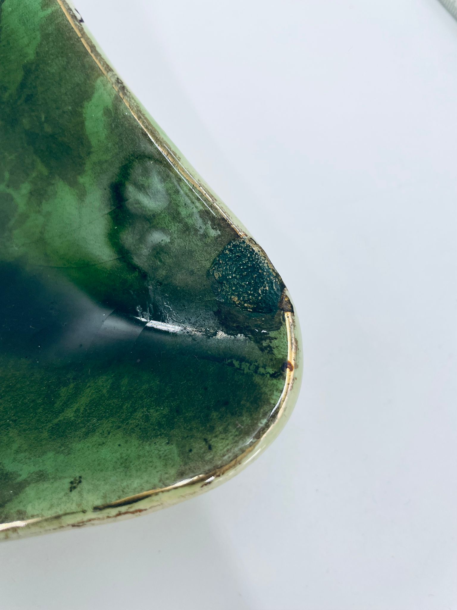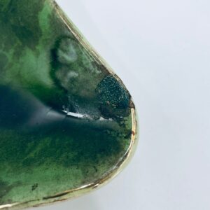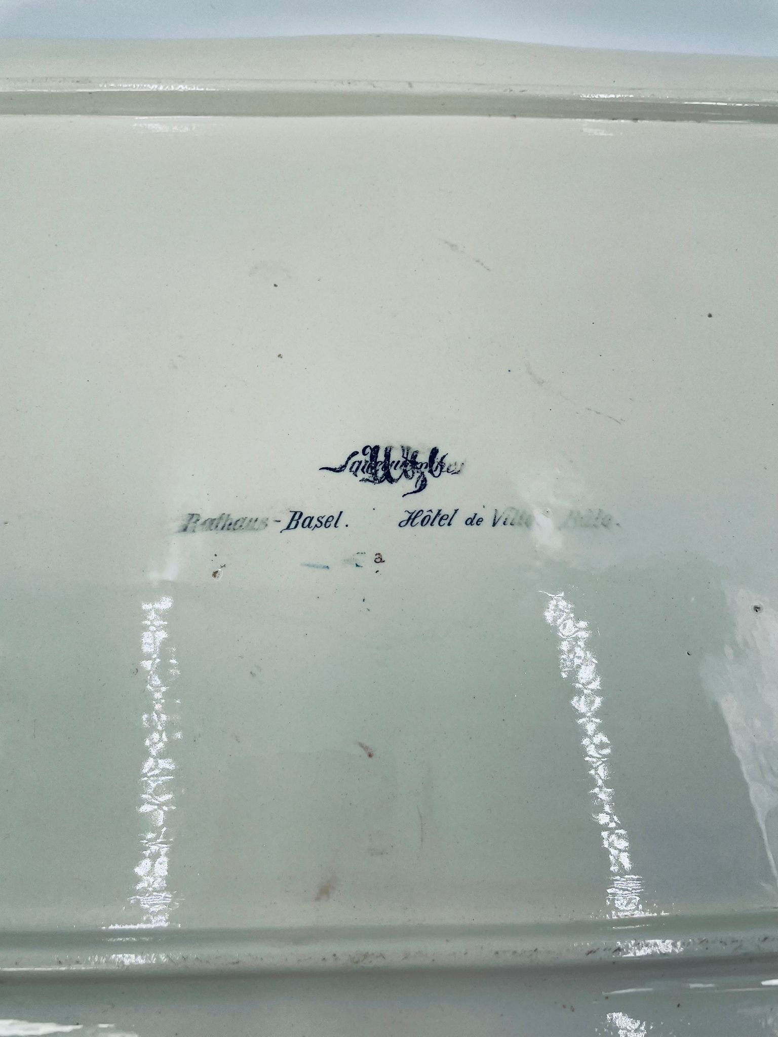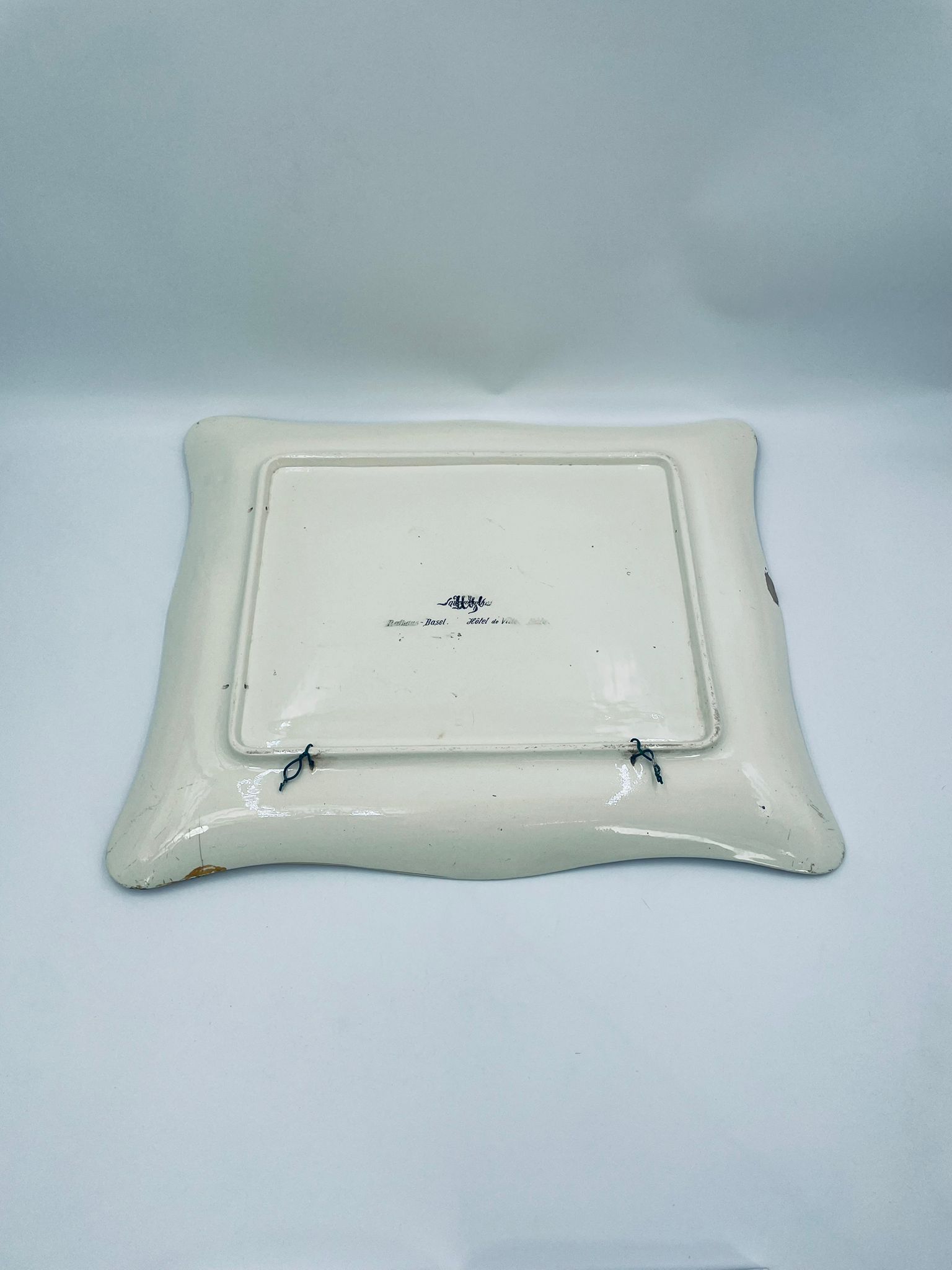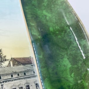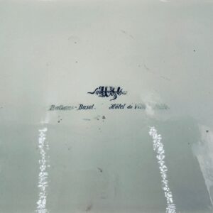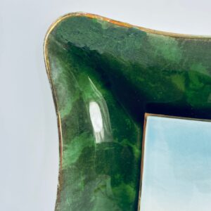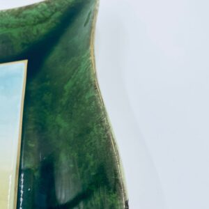 Talerz kolekcjonerski ścienny w stylu Vintage, wykonany z wysokiej jakości szkliwionej ceramiki. Talerz o unikalnym, pofalowanym kształcie, wykończony zielonym szkliwem oraz złoceniem na krawędzi. Centralny motyw na talerzu przedstawia wizerunek historycznego Ratuszu w Bazylei w Szwajcarii. Talerz posiada przetarcie złocenia, pęknięcie szkliwa oraz uszczerbki.
