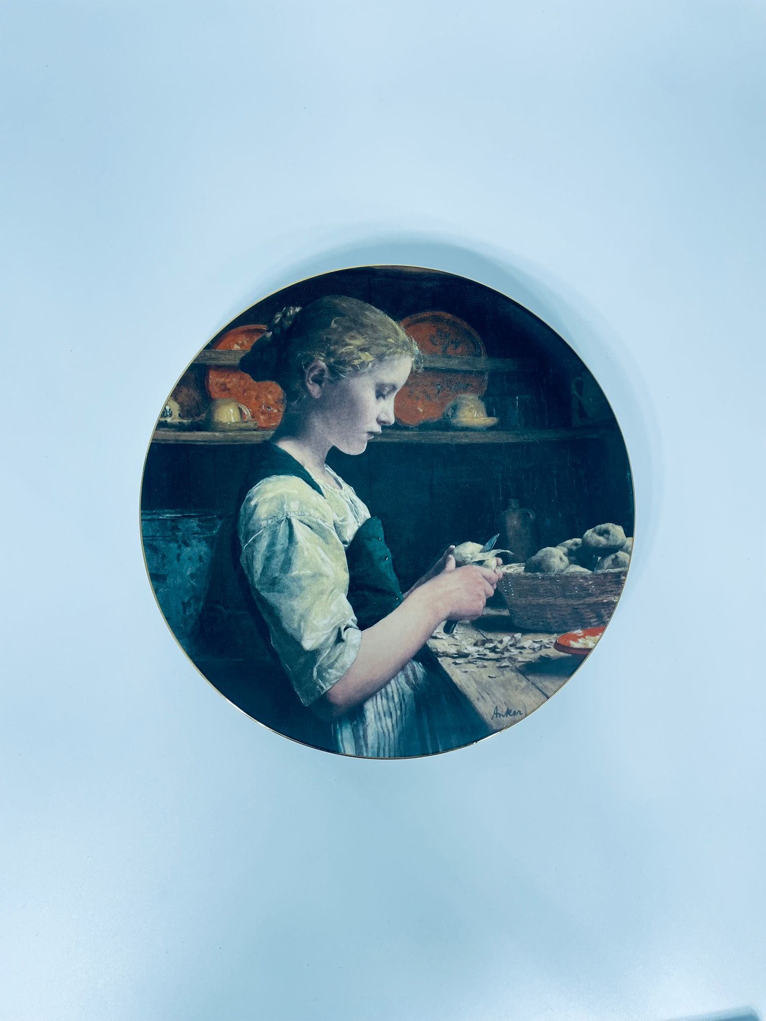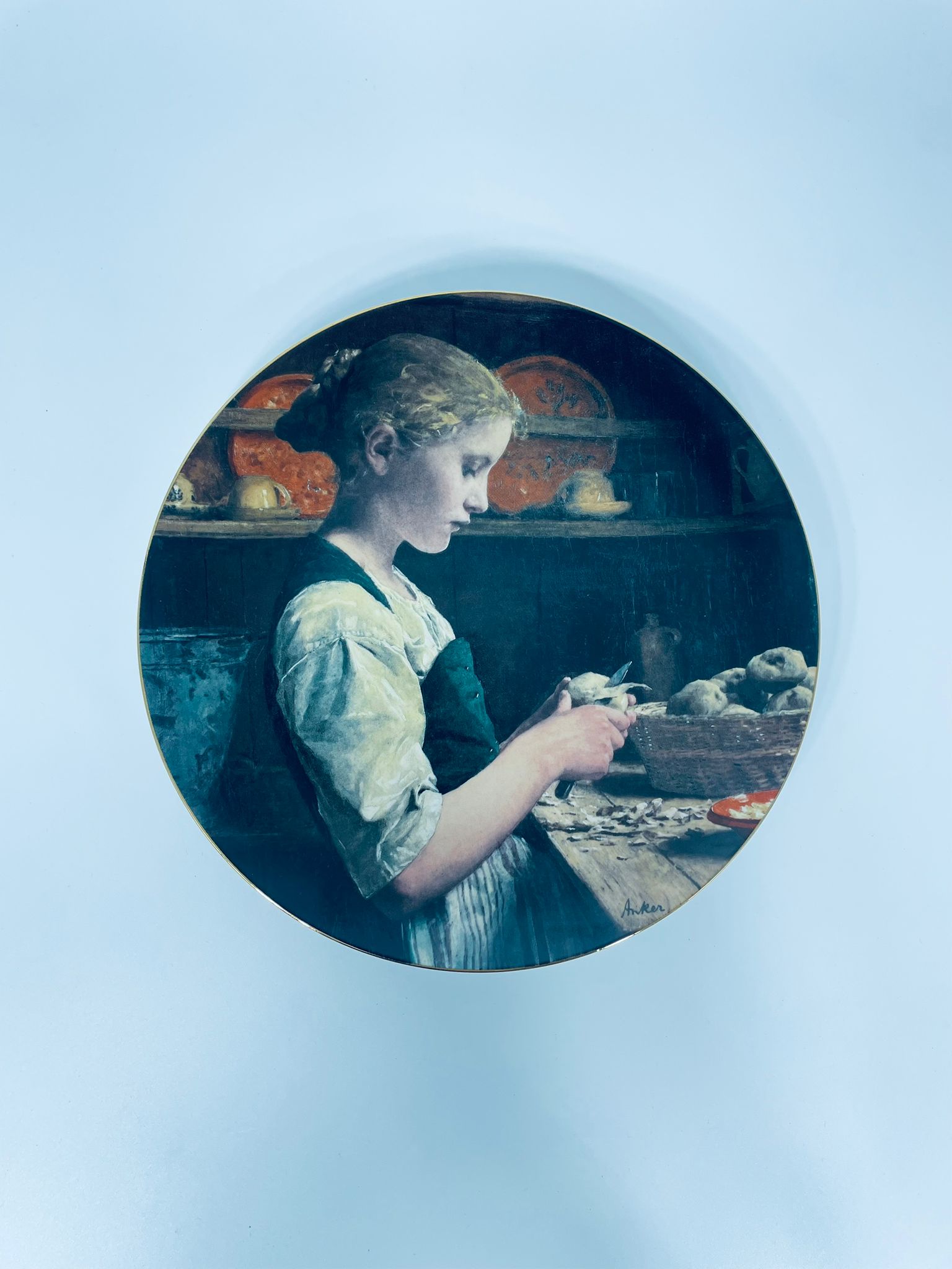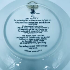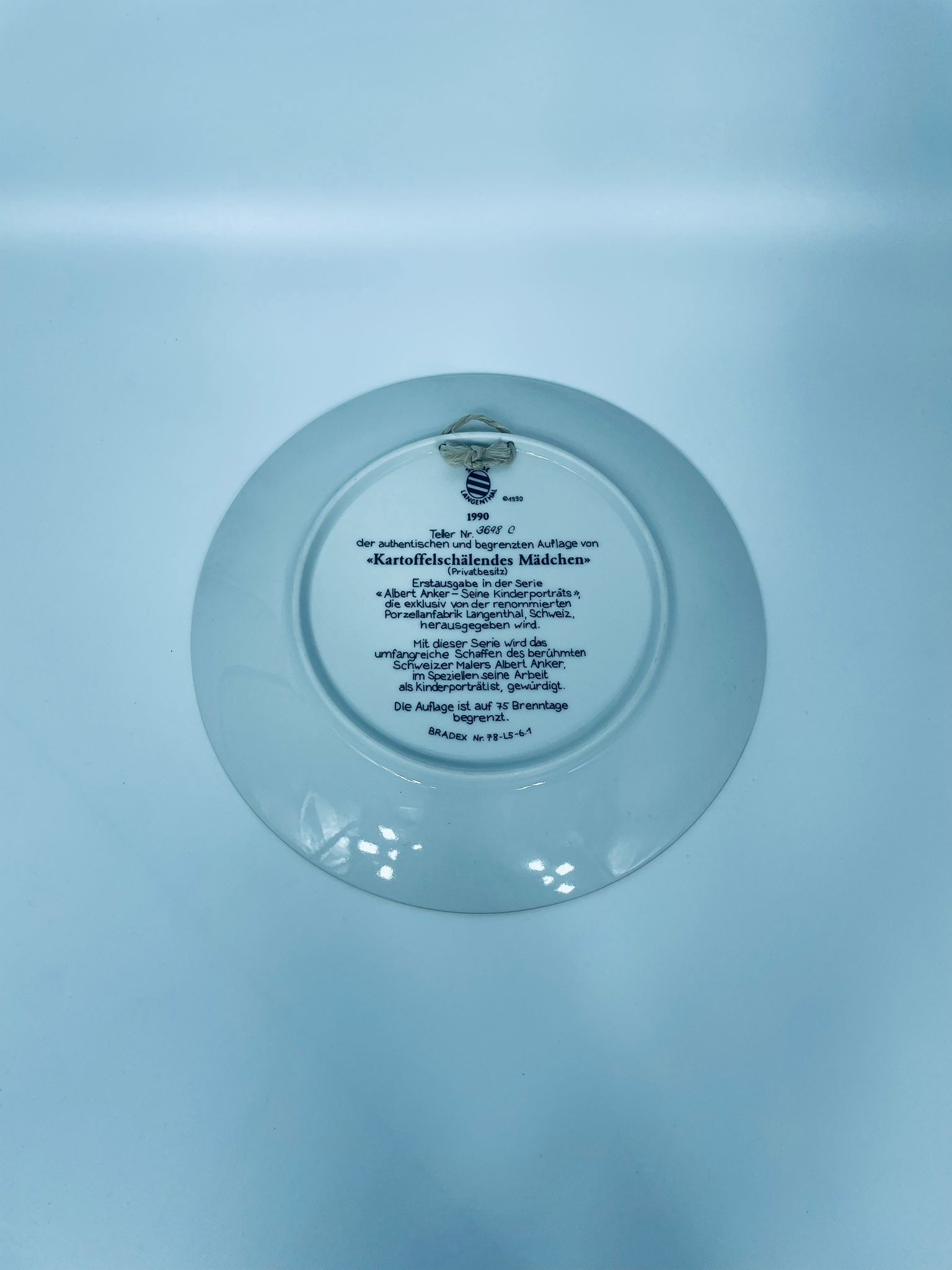 Talerz kolekcjonerski wyprodukowany przez szwajcarską manufakturę porcelany Langenthal, wykonany z wysokiej jakości porcelany. Talerz pochodzi z limitowanej edycji, pierwszej serii, reprodukcji obrazu szwajcarskiego malarza Alberta Ankera, zatytułowanego „Karttoffelschälendes Mädchen” (Dziewczyna obierająca ziemniaki), wykończony złoceniem na rancie.