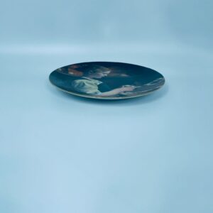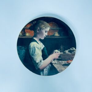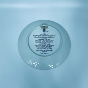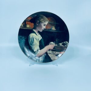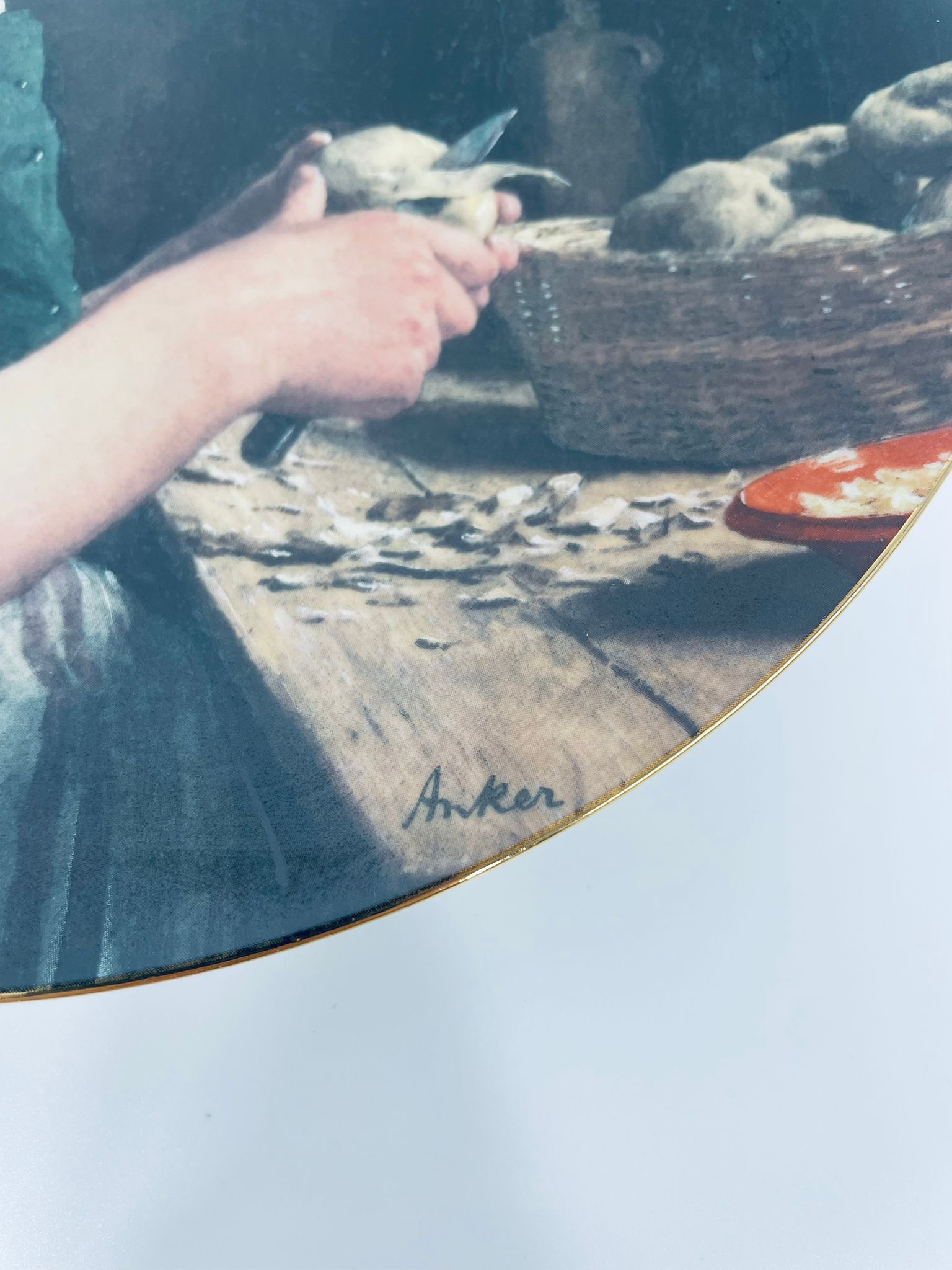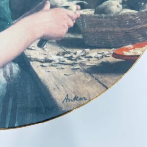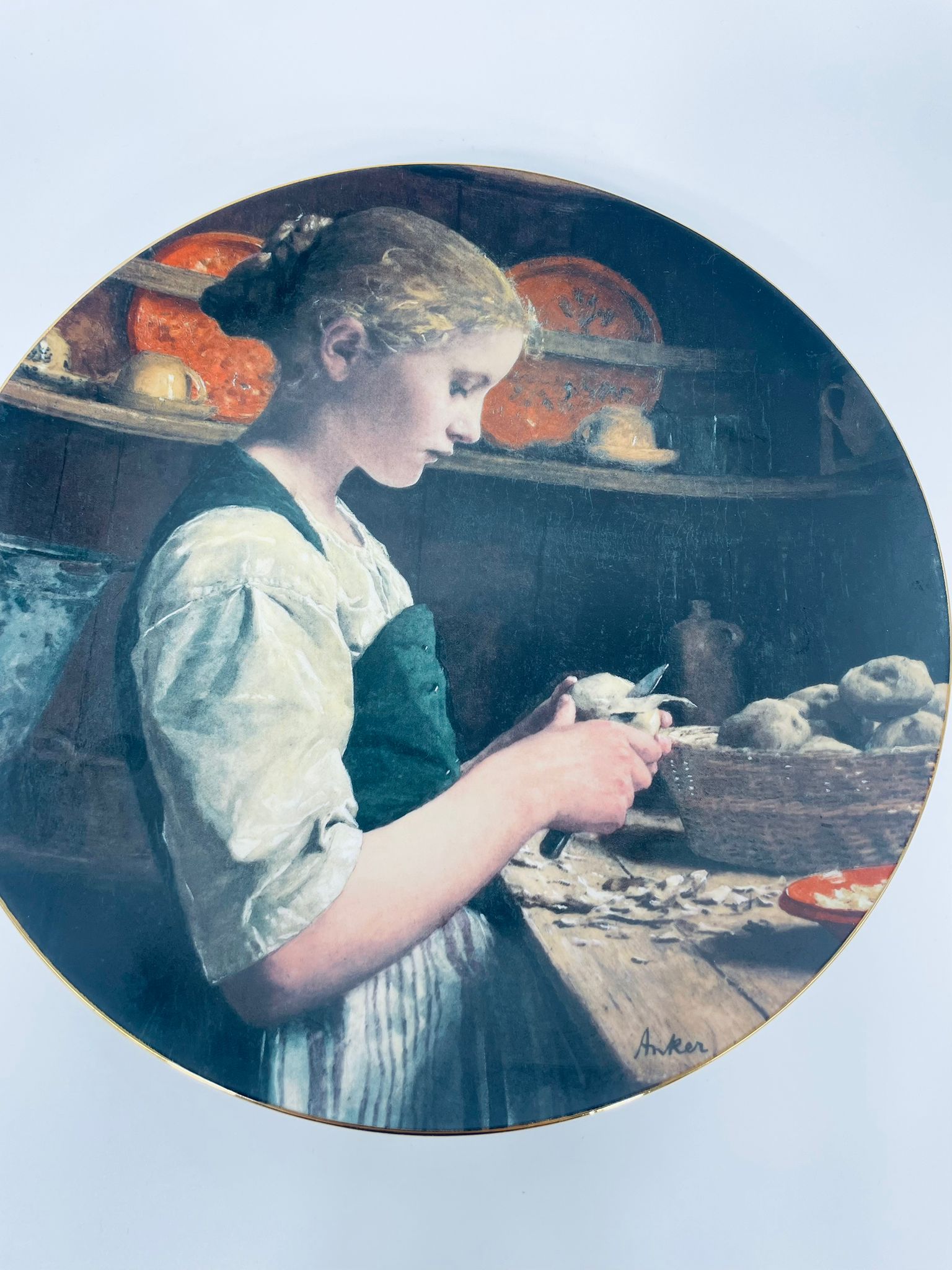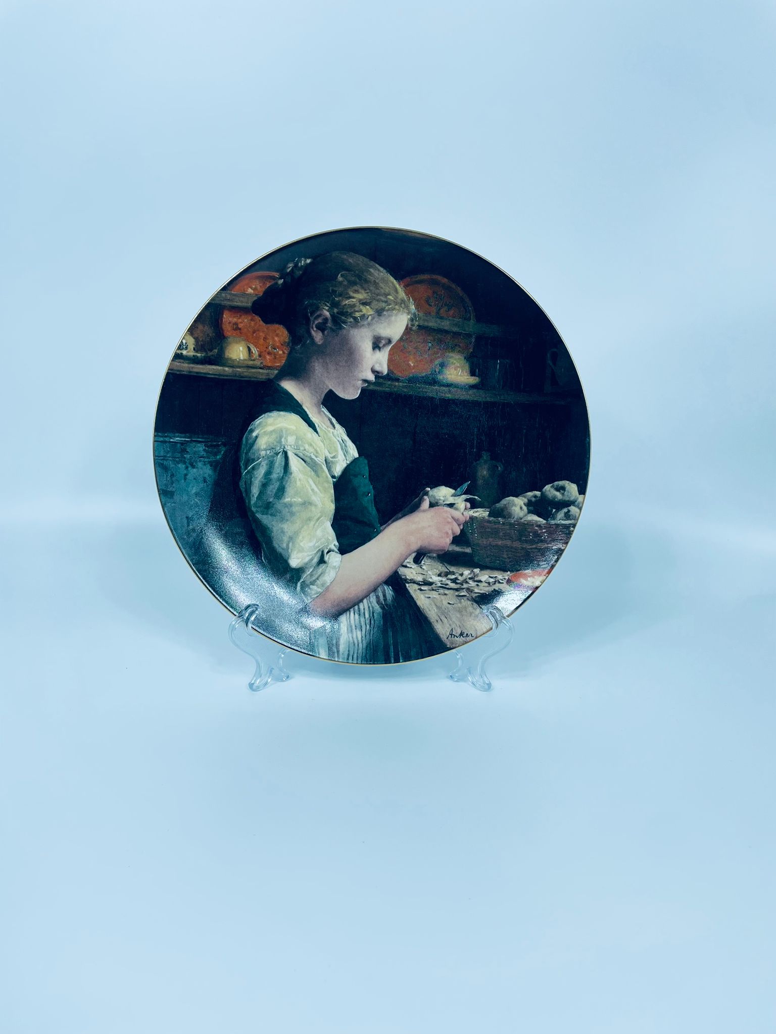 Talerz kolekcjonerski wyprodukowany przez szwajcarską manufakturę porcelany Langenthal, wykonany z wysokiej jakości porcelany. Talerz pochodzi z limitowanej edycji, pierwszej serii, reprodukcji obrazu szwajcarskiego malarza Alberta Ankera, zatytułowanego „Karttoffelschälendes Mädchen” (Dziewczyna obierająca ziemniaki), wykończony złoceniem na rancie.