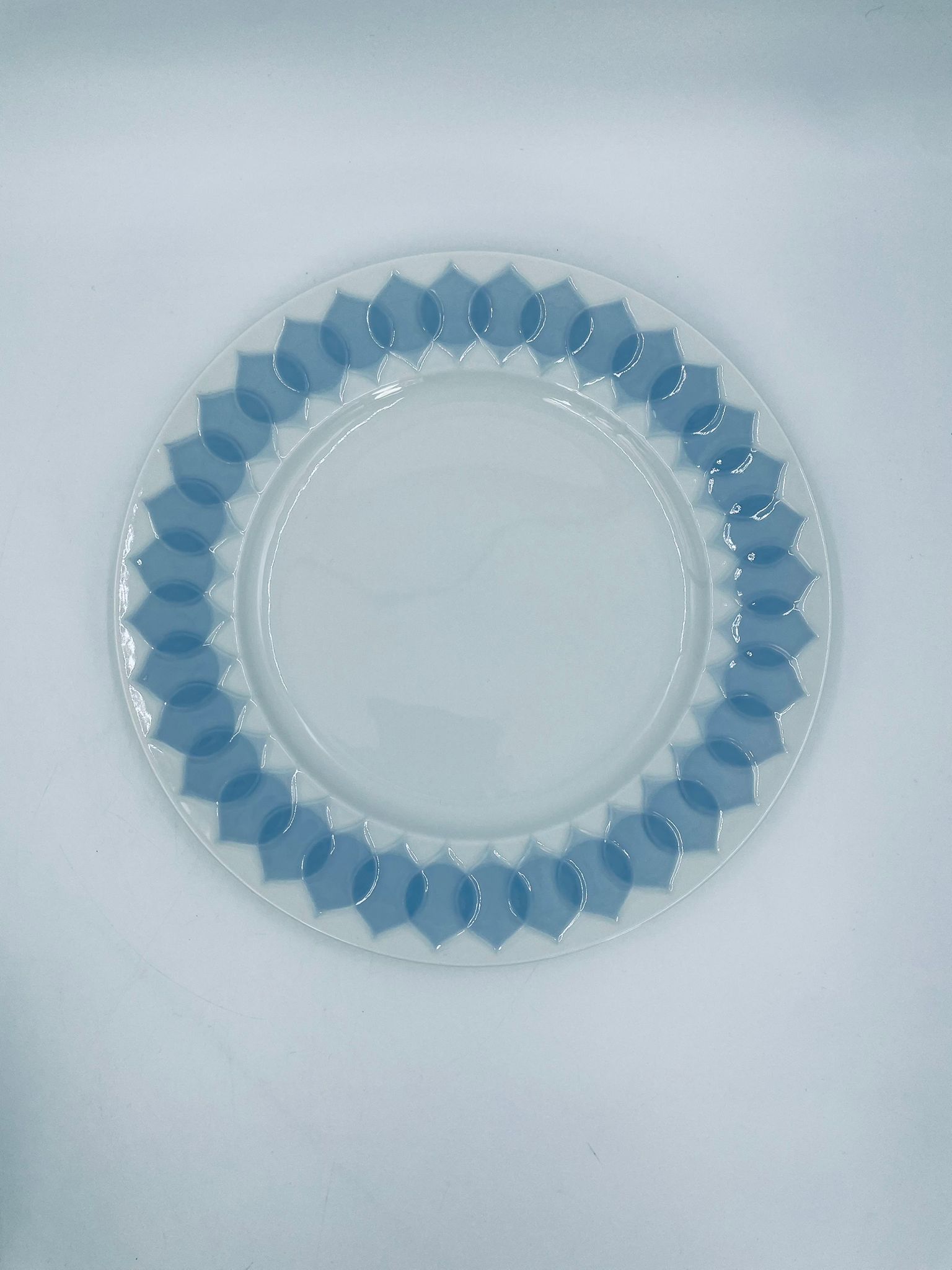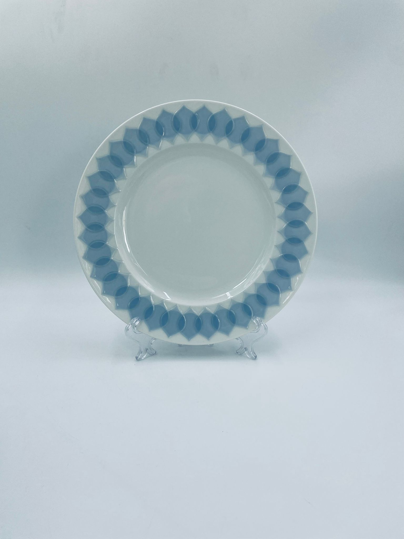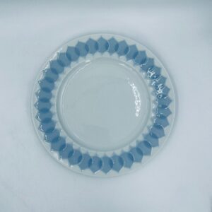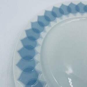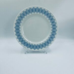 Talerz obiadowy płaski renomowanej wytwórni Rosenthal Studio Line z serii Lotus Blau , zaprojektowany przez duńskiego artystę Bjorna Wiinblada w 1964r, wykonany z najwyższej jakości białej porcelany. Talerz ozdobiony wzorem „Blau” z delikatnym, geometrycznym motywem przypominający liście lotosu w niebieskim odcieniu.