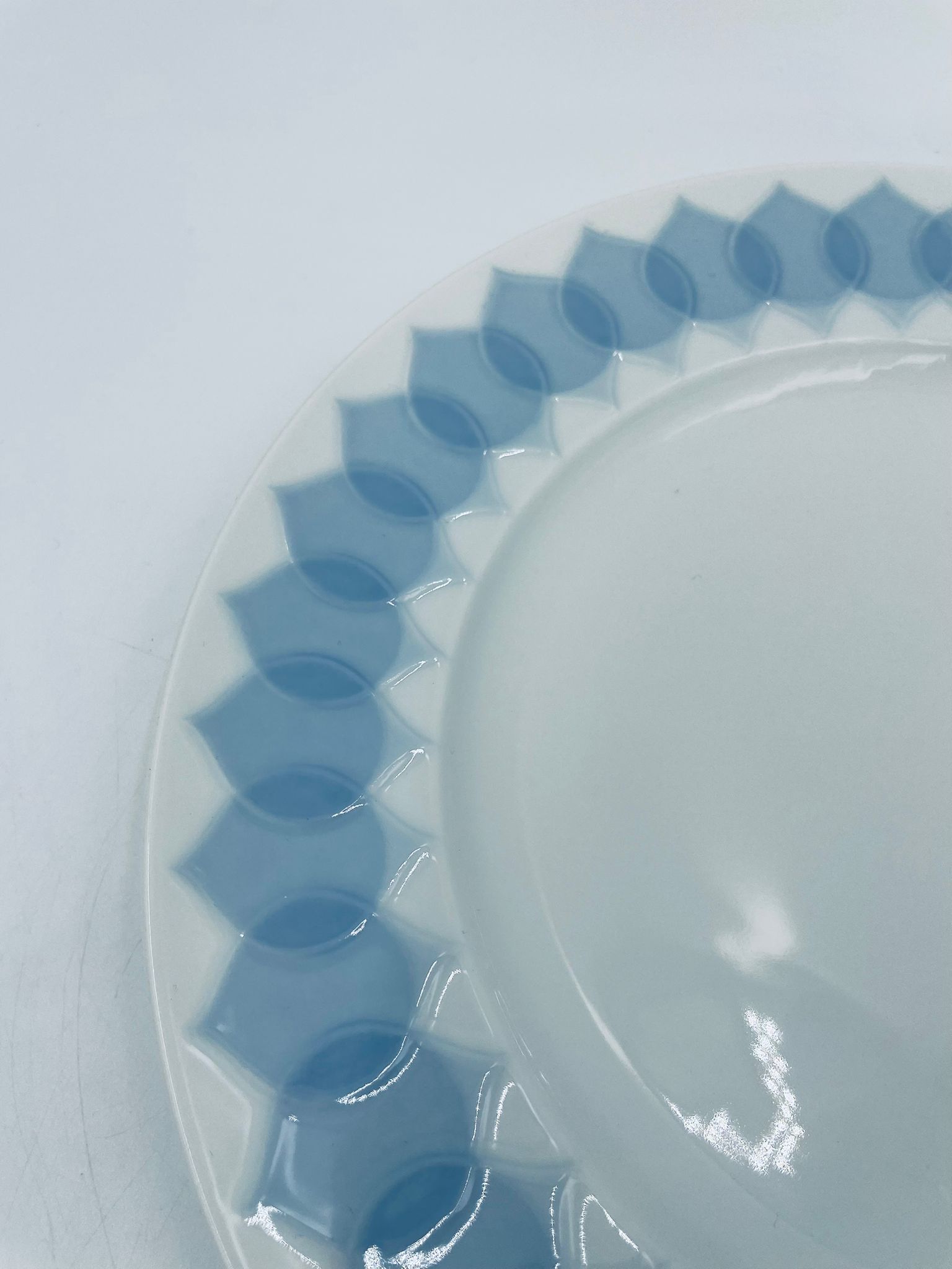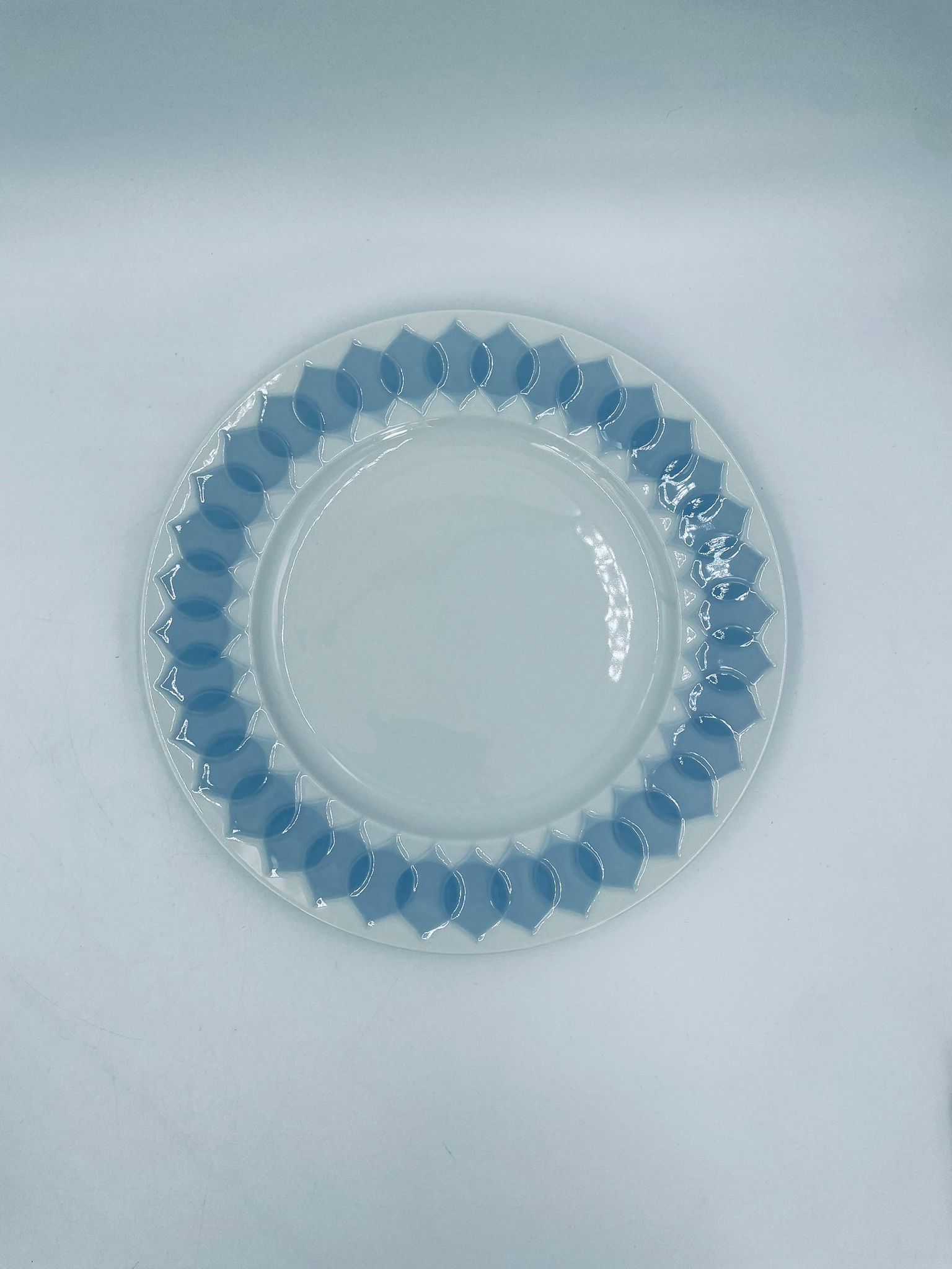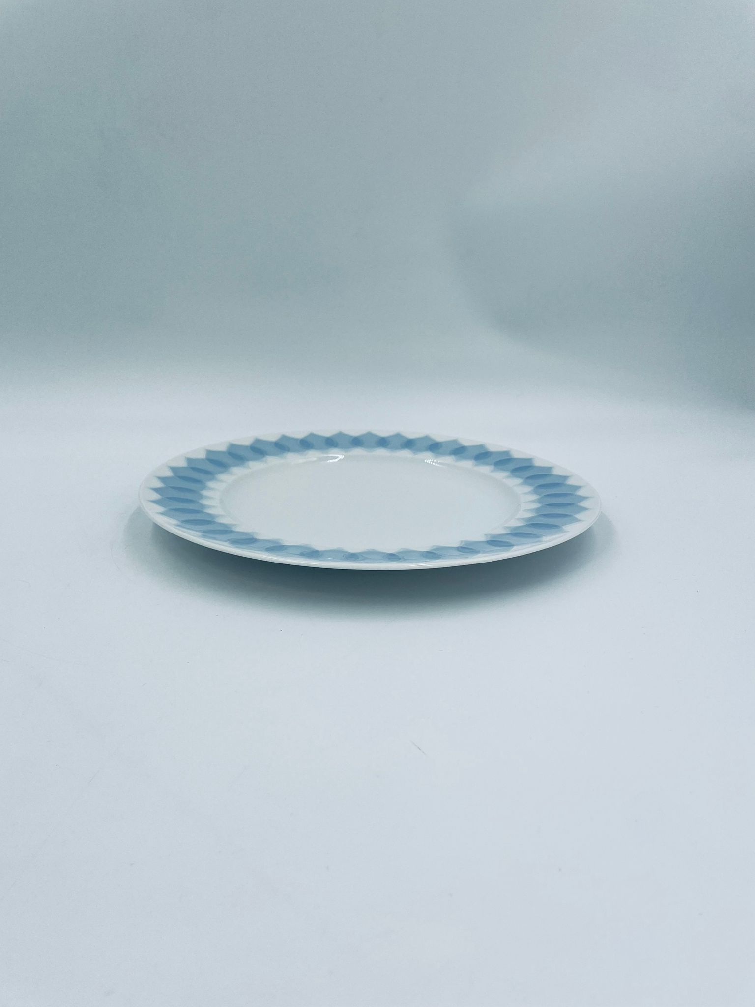 Talerz obiadowy płaski renomowanej wytwórni Rosenthal Studio Line z serii Lotus Blau , zaprojektowany przez duńskiego artystę Bjorna Wiinblada w 1964r, wykonany z najwyższej jakości białej porcelany. Talerz ozdobiony wzorem „Blau” z delikatnym, geometrycznym motywem przypominający liście lotosu w niebieskim odcieniu.