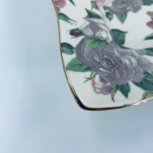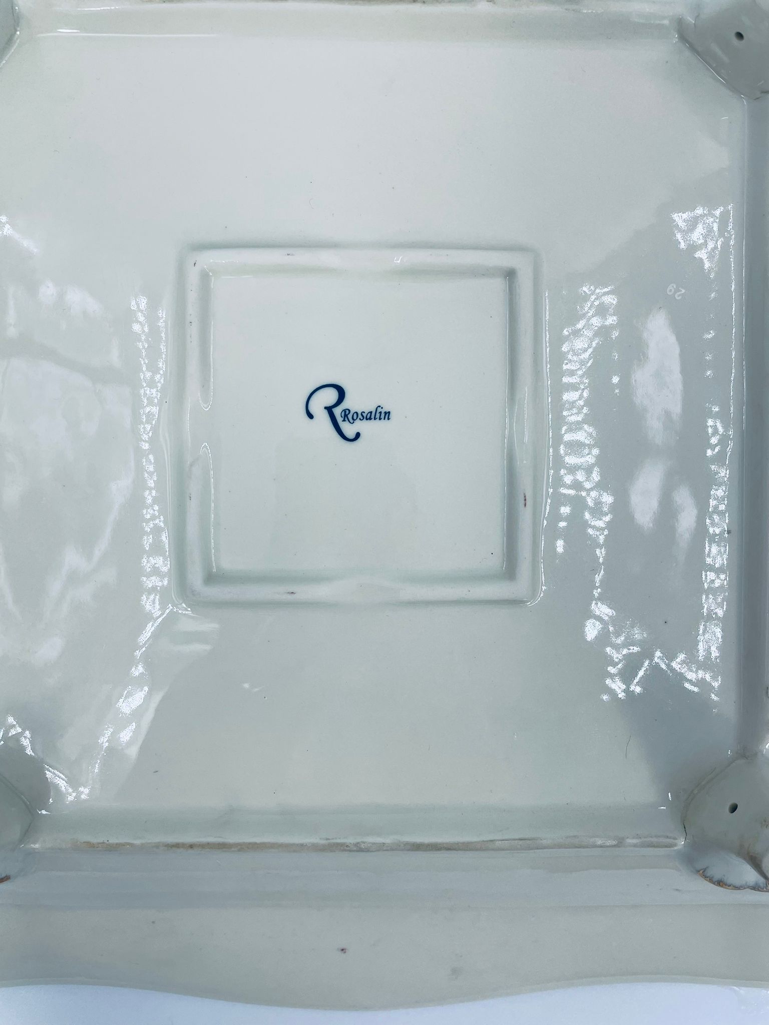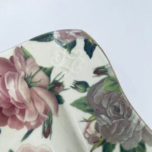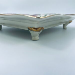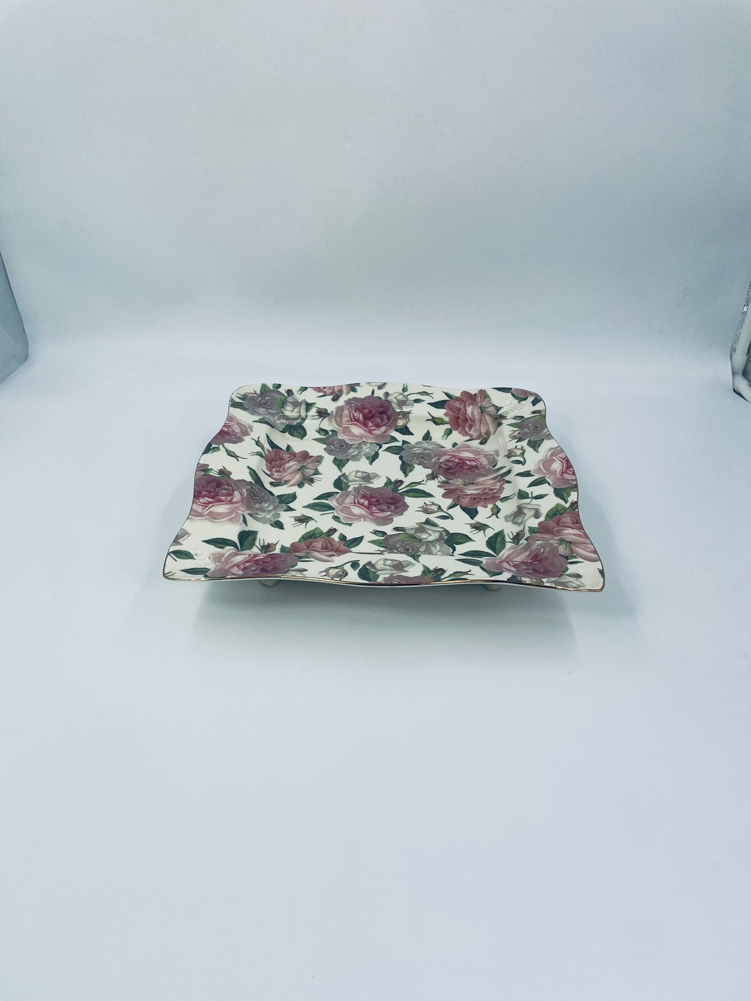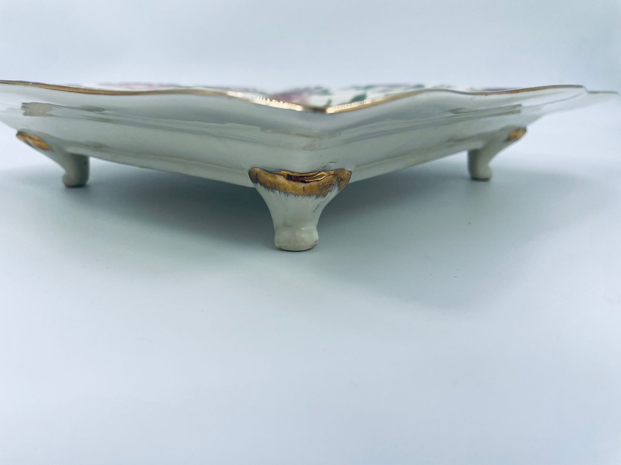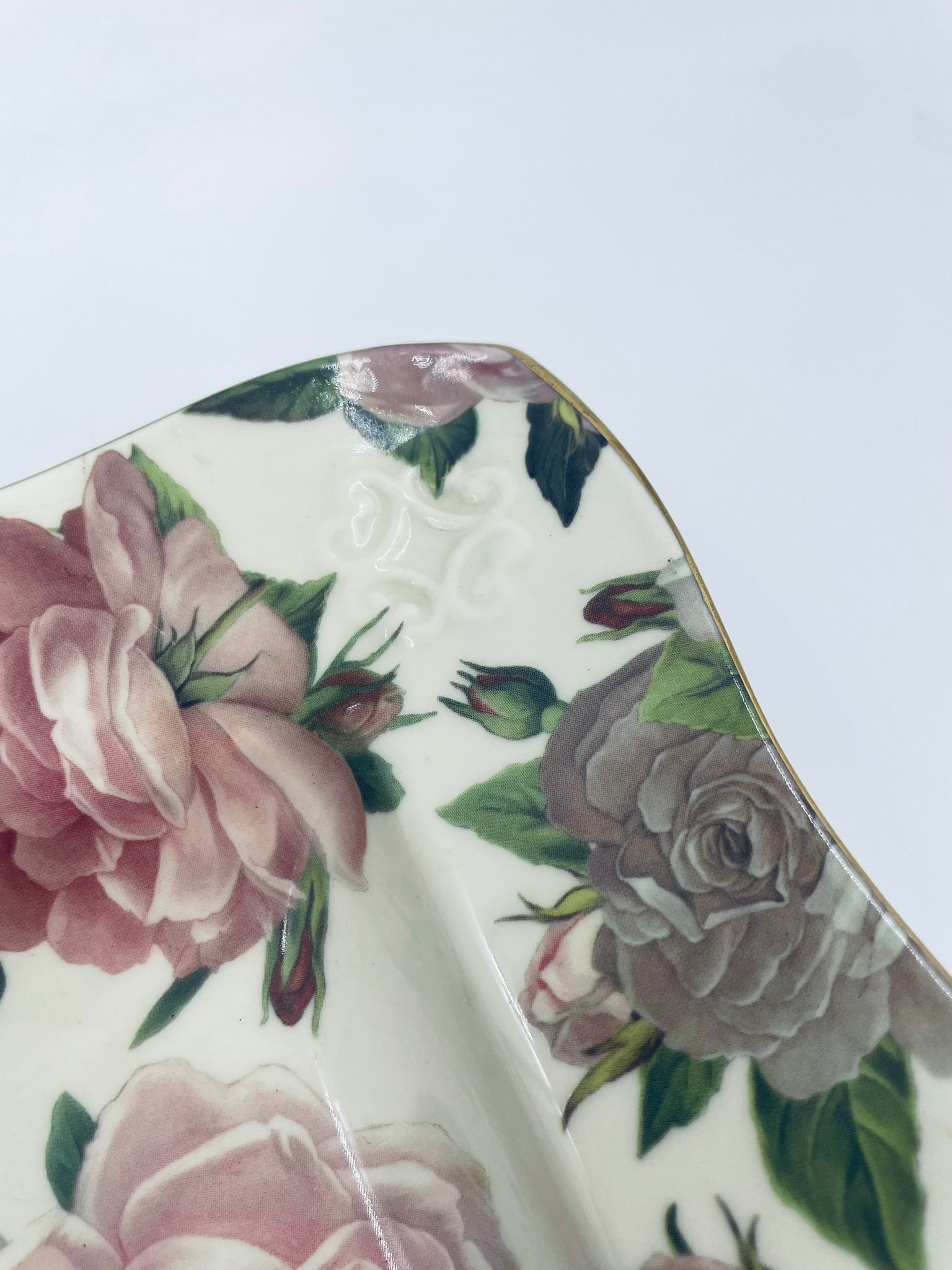 Dekoracyjna patera wytwórni Rosalin z lat 90tych., wykonana z porcelany w kolorze ecru, z dominującym wzorem purpurowych róż z zielonymi liśćmi. Patera z nieregularnym i falistym brzegiem na czterech ozdobnych nóżkach, wykończonych złoceniem. Może służyć jako patera na przekąski, owoce lub jako element dekoracyjny. Delikatne przetarcie na złoceniu.