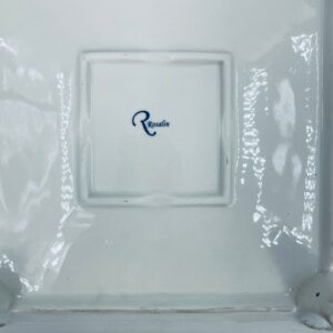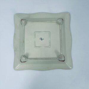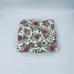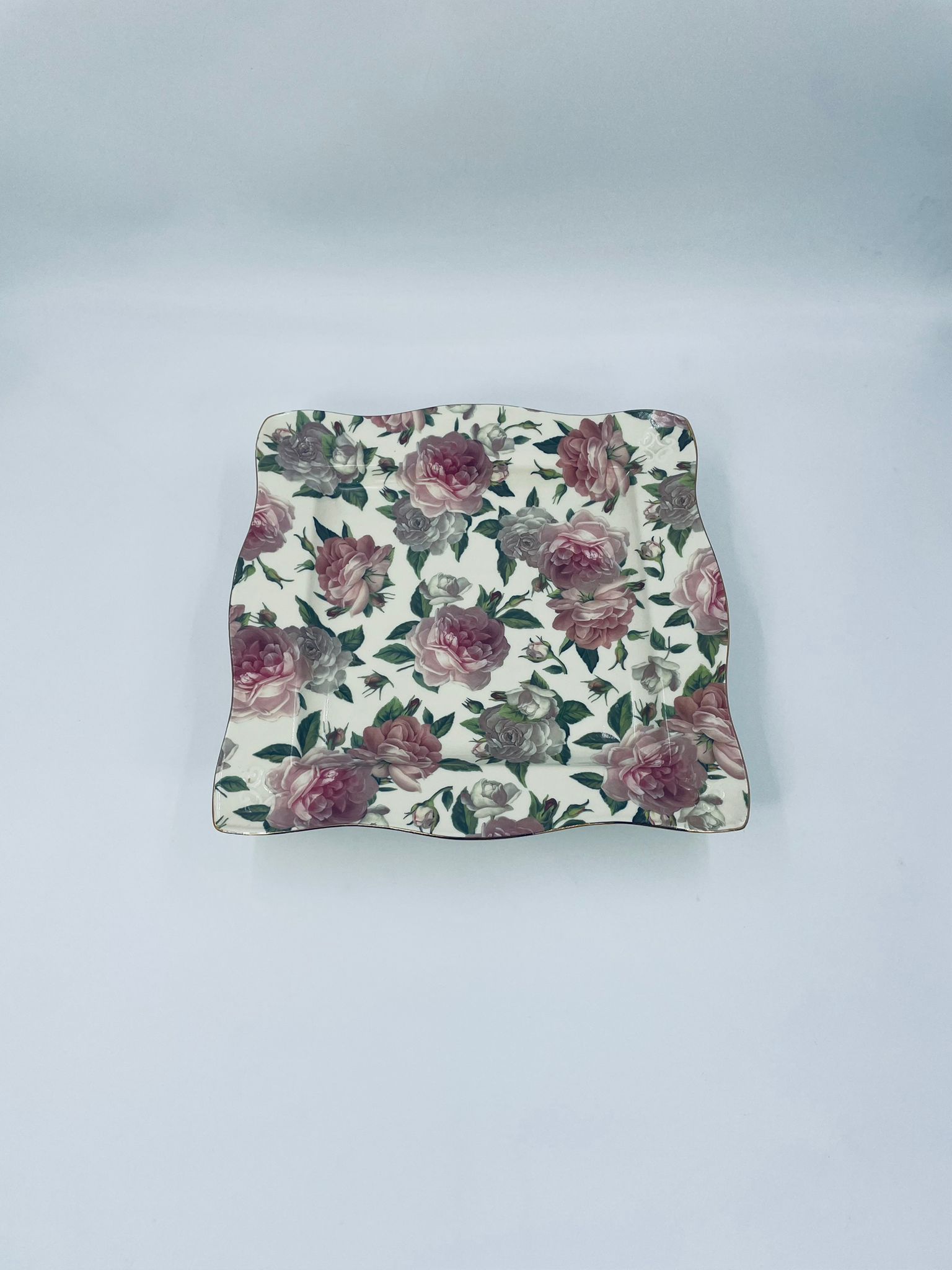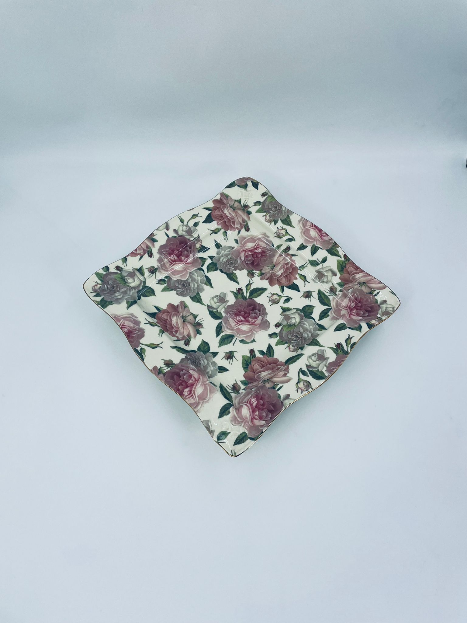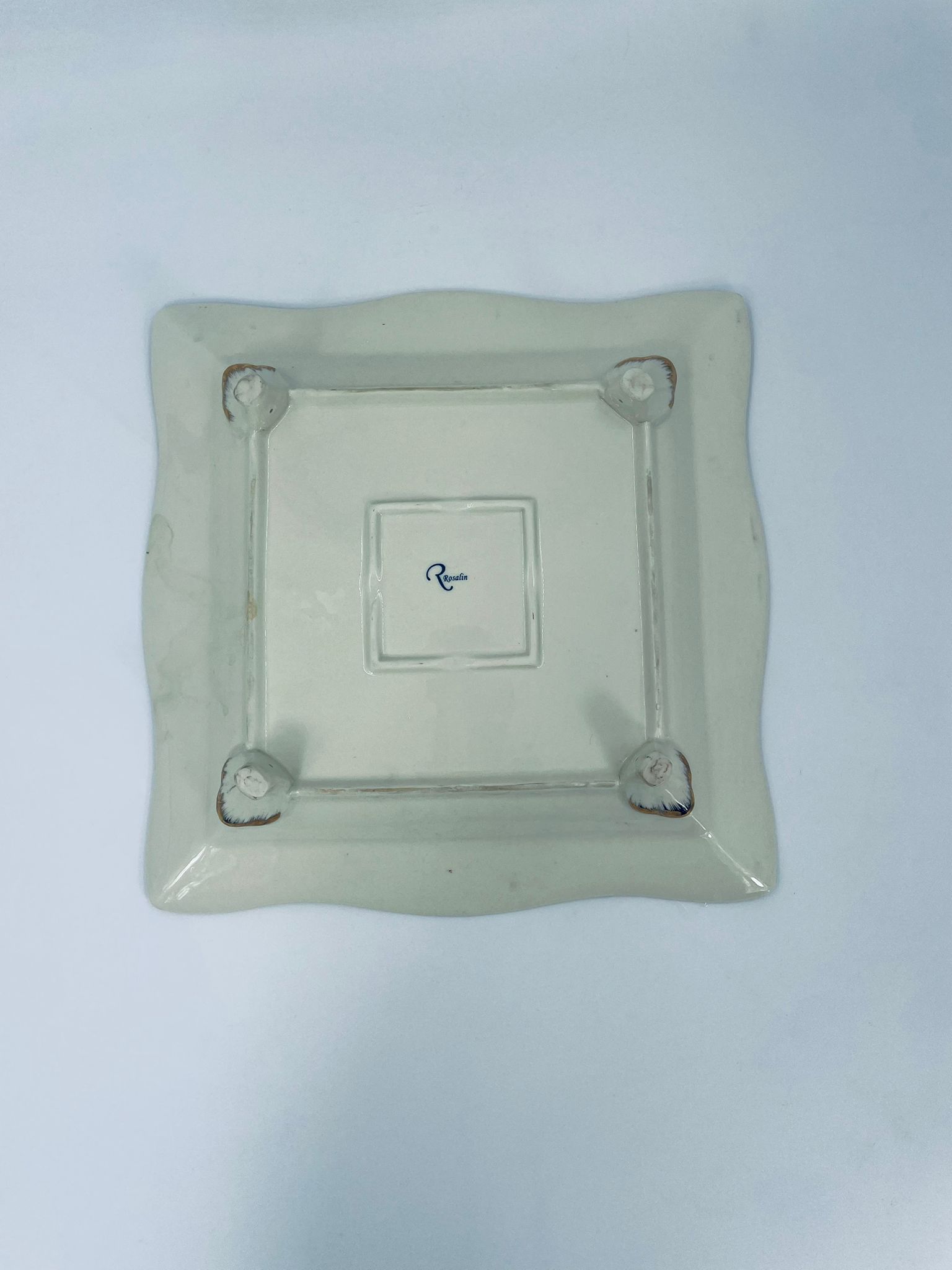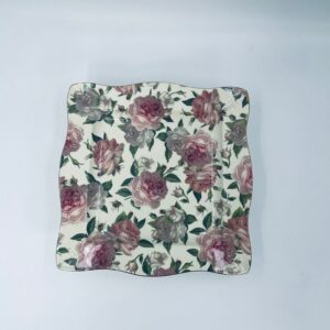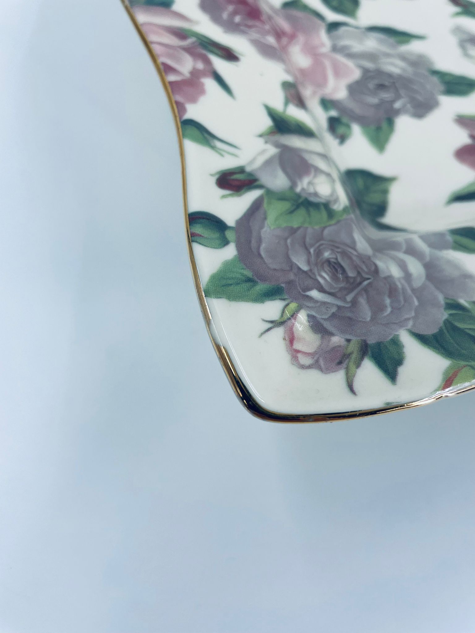 Dekoracyjna patera wytwórni Rosalin z lat 90tych., wykonana z porcelany w kolorze ecru, z dominującym wzorem purpurowych róż z zielonymi liśćmi. Patera z nieregularnym i falistym brzegiem na czterech ozdobnych nóżkach, wykończonych złoceniem. Może służyć jako patera na przekąski, owoce lub jako element dekoracyjny. Delikatne przetarcie na złoceniu.